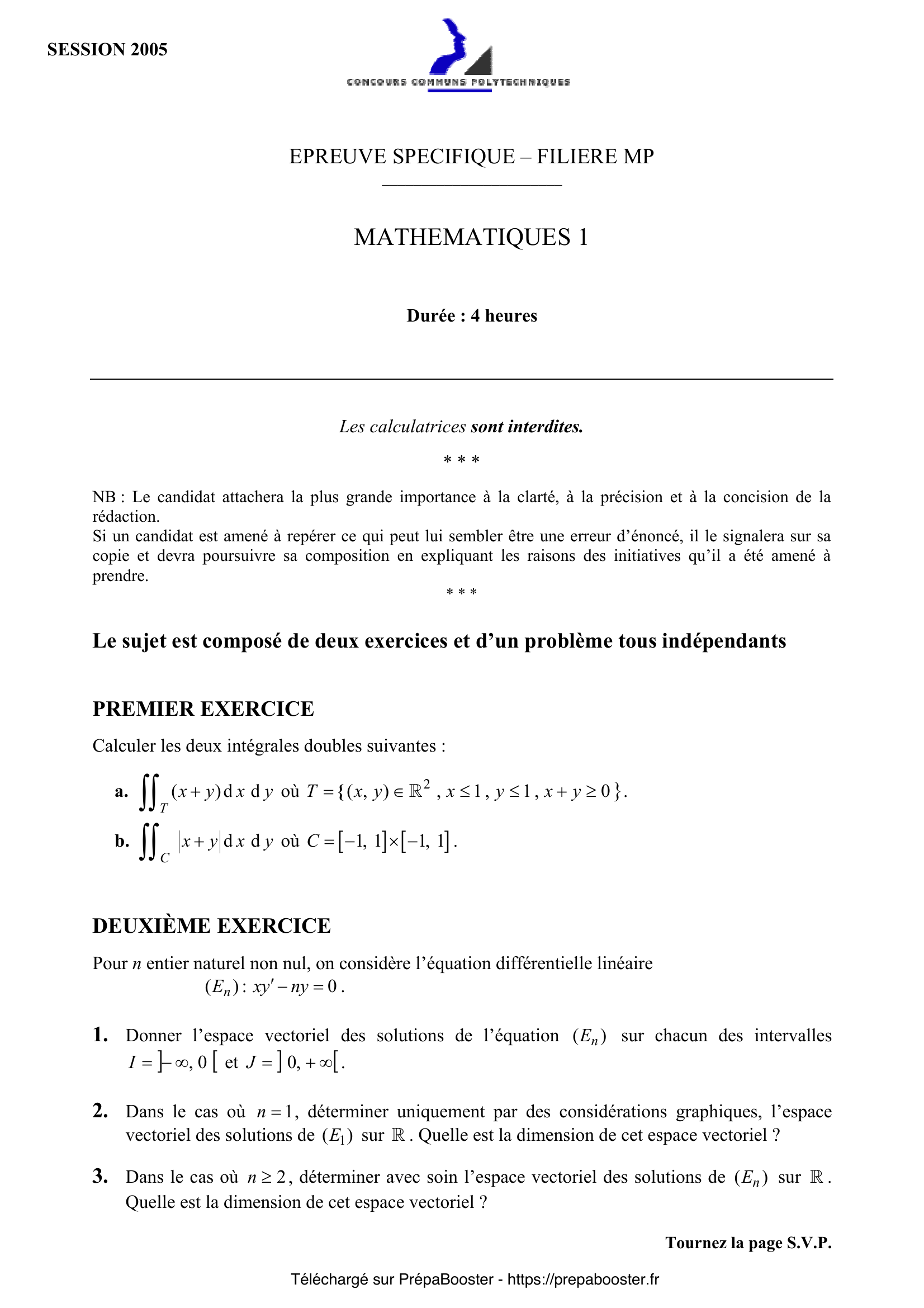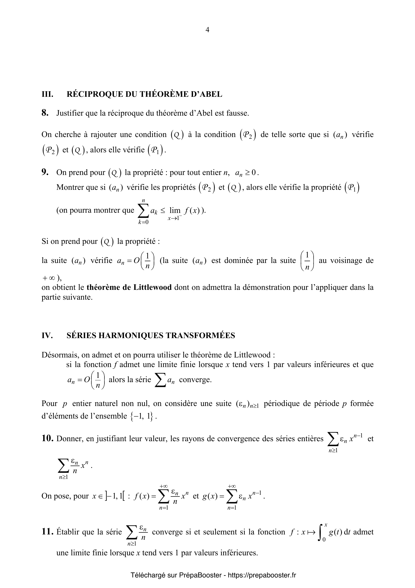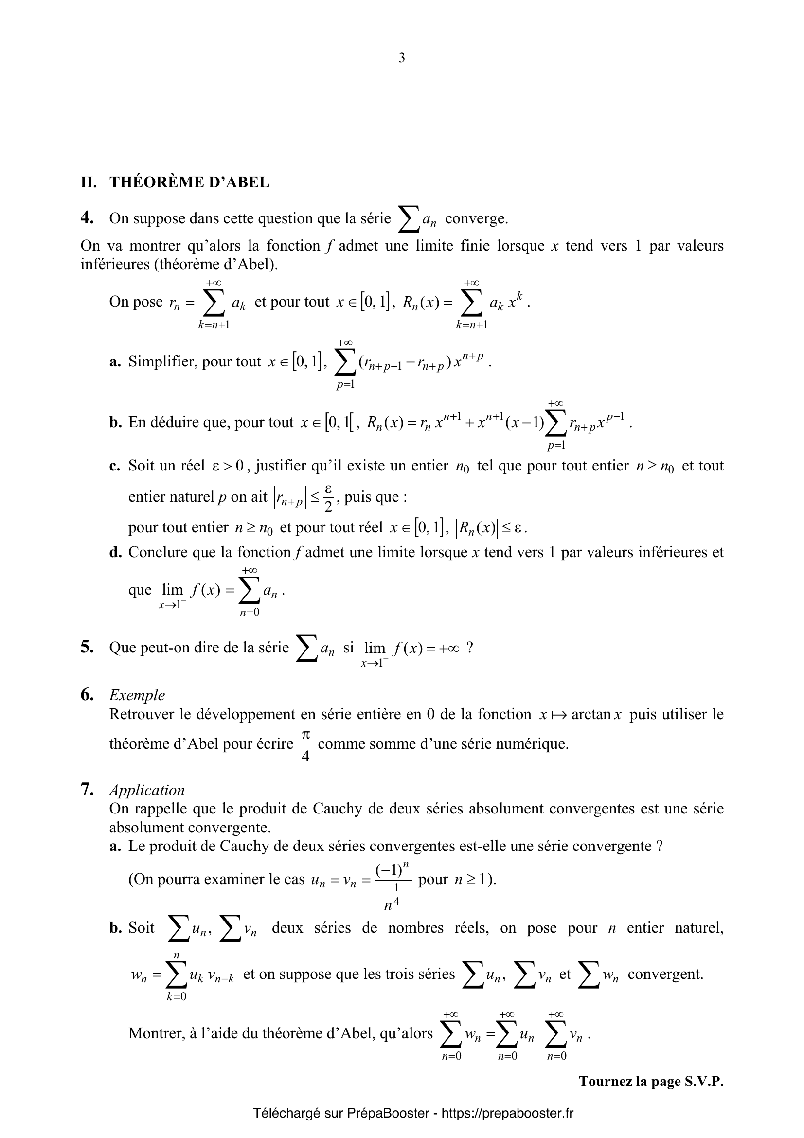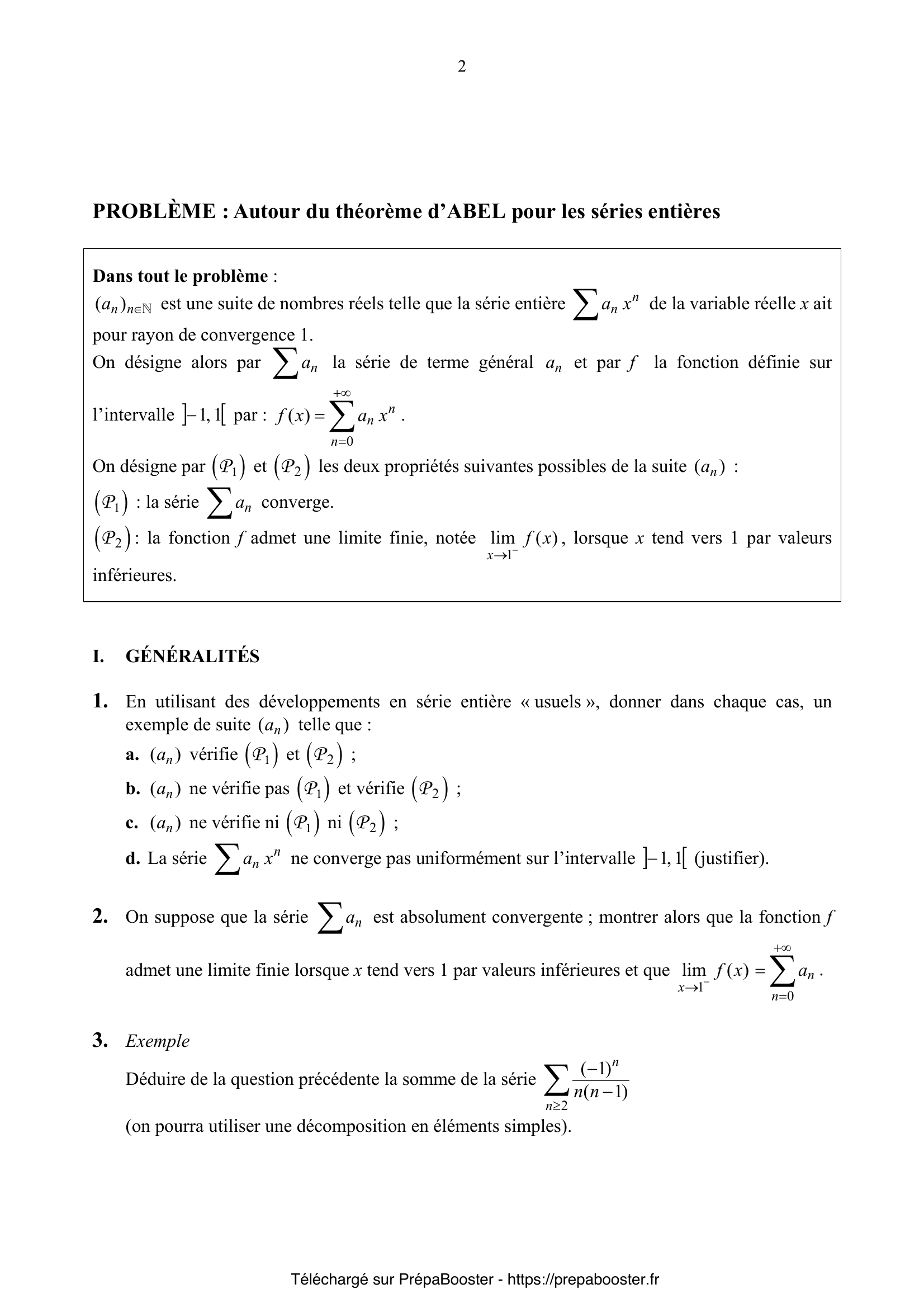 1. Calculer les deux intégrales doubles suivantes : a. $\iint_{T} (x + y) \, dx \, dy$ où $T = \{(x, y) \in \mathbb{R}^2,\, x \leq 1 ,\, y \leq 1 ,\, x + y \geq 0 \}$. b. $\iint_{C} (x+y)\, dx\, dy$ où $C = [-1,1] \times [-1,1]$. 2. Pour $n$ entier naturel non nul, on considère l’équation différentielle linéaire $(E_n): xy’ – ny = 0$.\\ 1. Donner l’espace vectoriel des solutions de l’équation $(E_n)$ sur chacun des intervalles $I = ]-\infty, 0[$ et $J = ]0,+\infty[$. 3. Dans le cas où $n = 1$, déterminer uniquement par des considérations graphiques, l’espace vectoriel des solutions de $E_1$ sur $\mathbb{R}\setminus\{0\}$. Quelle est la dimension de cet espace vectoriel ? 4. Dans le cas où $n \geq 2$, déterminer avec soin l’espace vectoriel des solutions de $(E_n)$ sur $\mathbb{R}\setminus\{0\}$. Quelle est la dimension de cet espace vectoriel ? 5. En utilisant des développements en série entière « usuels », donner dans chaque cas, un exemple de suite $(a_n)$ telle que :\\ a. $(a_n)$ vérifie (P1) et (P2) ;\\ b. $(a_n)$ ne vérifie pas (P1) et vérifie (P2) ;\\ c. $(a_n)$ ne vérifie ni (P1) ni (P2) ;\\ d. La série $\sum a_n x^n$ ne converge pas uniformément sur l’intervalle $]-1,1[$ (justifier).} 6. On suppose que la série $\sum a_n$ est absolument convergente ; montrer alors que la fonction $f$ admet une limite finie lorsque $x$ tend vers $1$ par valeurs inférieures et que $$ \lim_{x \to 1^-} f(x) = \sum_{n=0}^{+\infty} a_n. $$ 7. Déduire de la question précédente la somme de la série $$ \sum_{n \geq 1} \frac{(-1)^n}{n^2-n}. $$ 8. On suppose dans cette question que la série $\sum a_n$ converge.\\ a. Simplifier, pour tout $x \in [0,1]$, $\sum_{p=n+1}^{+\infty} r_p x^p – r_{n+1} x^{n+1}$.\\ b. En déduire que, pour tout $x \in [0,1[$, $$ R_n(x) = \sum_{p=n+1}^{+\infty} r_p (x^p – x^{n+1}) = (1-x) \sum_{p=n+1}^{+\infty} r_p x^{p} + r_{n+1} x^{n+1}. $$ c. Soit un réel $\varepsilon > 0$, justifier qu’il existe un entier $n_0$ tel que pour tout entier $n \geq n_0$ et tout entier naturel $p$ on ait $|r_{n+p}| \leq \varepsilon$, puis que :\\ pour tout entier $n \geq n_0$ et pour tout réel $x \in [0,1]$, $|R_n(x)| \leq \varepsilon$.\\ d. Conclure que la fonction $f$ admet une limite lorsque $x$ tend vers $1$ par valeurs inférieures et que $$ \lim_{x \to 1^-} f(x) = \sum_{n=0}^{+\infty} a_n. $$ 9. Que peut-on dire de la série $\sum a_n$ si $\lim_{x \to 1^-} f(x) = +\infty$ ? 10. Retrouver le développement en série entière en 0 de la fonction $x \mapsto \arctan x$ puis utiliser le théorème d’Abel pour écrire $\frac{\pi}{4}$ comme somme d’une série numérique.} 11. On rappelle que le produit de Cauchy de deux séries absolument convergentes est une série absolument convergente.\\ a. Le produit de Cauchy de deux séries convergentes est-elle une série convergente ? (On pourra examiner le cas $u_n = v_n = \frac{1}{n}$ pour $n \geq 1$).\\ b. Soit $\sum u_n$, $\sum v_n$ deux séries de nombres réels, on pose pour $n$ entier naturel, $$ w_n = \sum_{k=0}^n u_k v_{n-k} $$ et on suppose que les trois séries $\sum u_n$, $\sum v_n$ et $\sum w_n$ convergent. Montrer, à l’aide du théorème d’Abel, qu’alors $$ \sum_{n=0}^{+\infty} w_n = \left(\sum_{n=0}^{+\infty} u_n \right) \left(\sum_{n=0}^{+\infty} v_n \right). $$ 12. Justifier que la réciproque du théorème d’Abel est fausse.\\ On cherche à rajouter une condition (Q) à la condition (P2) de telle sorte que si $(a_n)$ vérifie (P2) et (Q), alors elle vérifie (P1). 13. On prend pour (Q) la propriété : pour tout entier $n$, $a_n \geq 0$.\\ Montrer que si $(a_n)$ vérifie les propriétés (P2) et (Q), alors elle vérifie la propriété (P1).\\ (On pourra montrer que $$ \sum_{k=0}^{n} a_k \leq \lim_{x \to 1^-} f(x). $$\\ Si on prend pour (Q) la propriété : la suite $(a_n)$ vérifie $a_n = \mathcal{O}(1/n)$ au voisinage de $+\infty$, on obtient le théorème de Littlewood dont on admettra la démonstration pour l’appliquer dans la partie suivante.) 14. Pour $p$ entier naturel non nul, on considère une suite $(\varepsilon_n)_{n\geq 1}$ périodique de période $p$ formée d’éléments de l’ensemble $\{-1,1\}$.\\ Donner, en justifiant leur valeur, les rayons de convergence des séries entières $\sum_{n\geq 1} \varepsilon_n x^n$ et $\sum_{n\geq 1} \frac{\varepsilon_n}{n} x^n$.\\ On pose, pour $x \in ]-1,1[$ : $$ f(x) = \sum_{n=1}^{+\infty} \frac{\varepsilon_n}{n} x^n \quad \text{et} \quad g(x) = \sum_{n=1}^{+\infty} \varepsilon_n x^n $$ 15. Établir que la série $\sum_{n \geq 1} \frac{\varepsilon_n}{n}$ converge si et seulement si la fonction $F$ définie par : $$ F(x) = \int_0^x g(t) dt $$ admet une limite finie lorsque $x$ tend vers $1$ par valeurs inférieures.} 16. Montrer que $g$ est une fraction rationnelle à déterminer. 17. Retrouver, uniquement par les deux questions précédentes, que la série harmonique $\sum_{n\geq 1} \frac{1}{n}$ diverge et que la série alternée $\sum_{n\geq 1} \frac{(-1)^n}{n}$ converge en précisant sa somme. 18. Déterminer une condition nécessaire et suffisante portant sur la somme $\sum_{i=1}^p \varepsilon_i$ pour que la série $\sum_{n\geq 1} \frac{\varepsilon_n}{n}$ converge.\\ Que peut-on en conclure dans les cas où la période $p$ est un entier impair ? 19. Dans le cas où la suite $(\varepsilon_n)_{n\geq 1}$ est périodique de période $6$ avec $\varepsilon_1 = \varepsilon_2 = \varepsilon_3 = \varepsilon_4 = 1$, $\varepsilon_5 = \varepsilon_6 = -1$, déterminer $\sum_{n=1}^{+\infty} \frac{\varepsilon_n}{n}$ (il est demandé de détailler les calculs).}FAQ