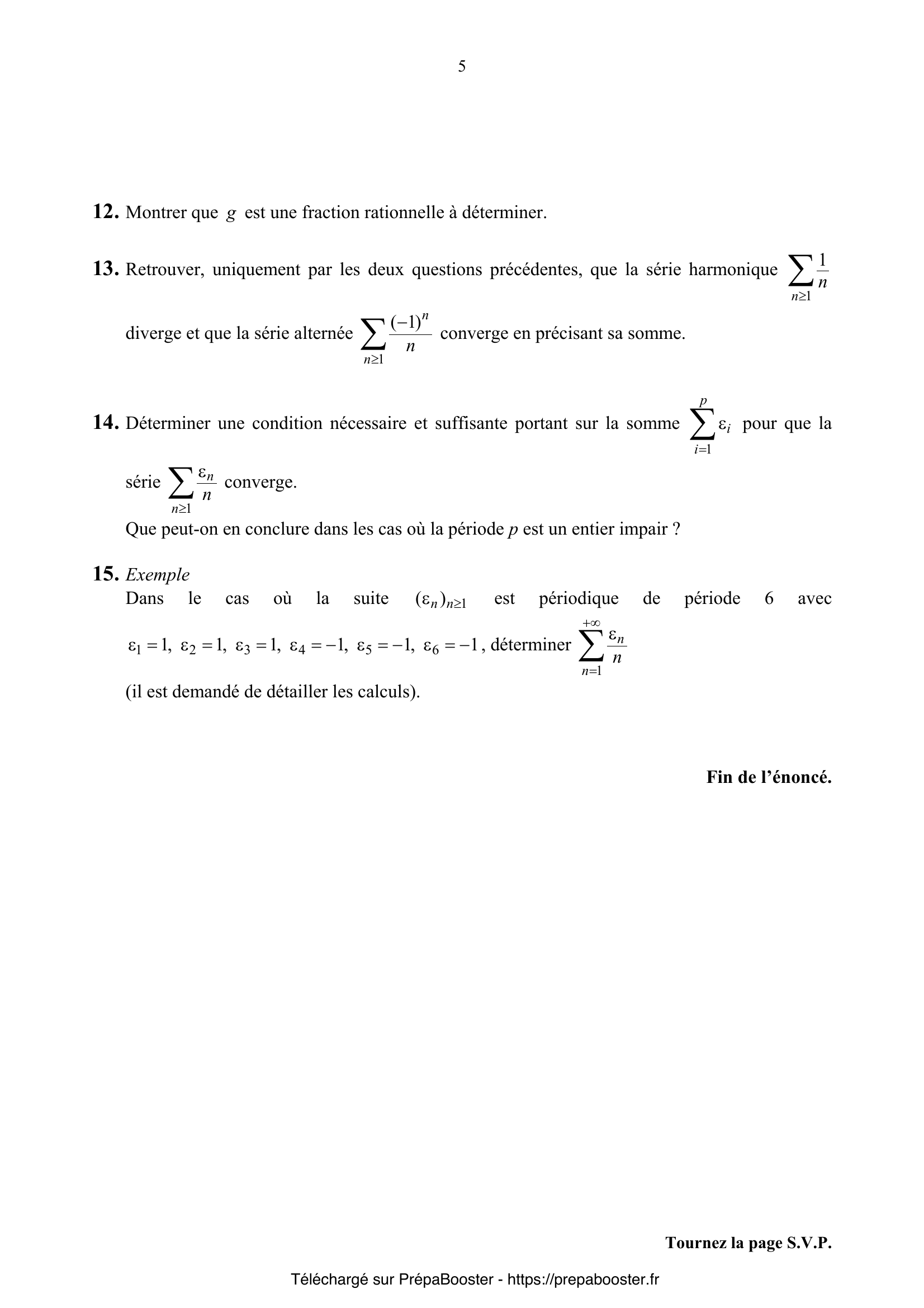 Les séries à termes périodiques, comme celles impliquant des $\varepsilon_n$ de période donnée, servent à explorer la frontière entre convergence et divergence, et permettent d’illustrer l’interaction entre structure de la suite et comportement de la série. Elles offrent des cas élégants pour appliquer la théorie des fractions rationnelles, la recherche de rayons de convergence, et même des critères nécessaires et suffisants de sommabilité. Travailler ces exemples apporte une vraie valeur ajoutée pour le jour J.