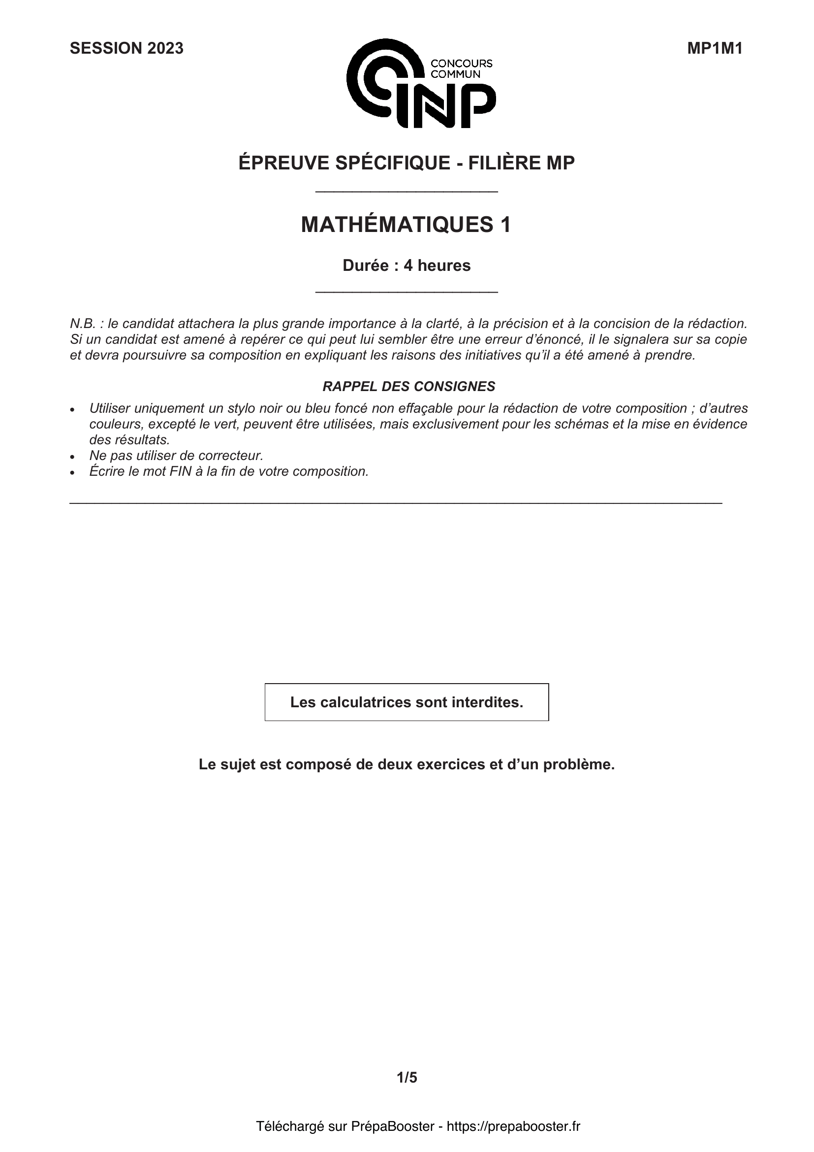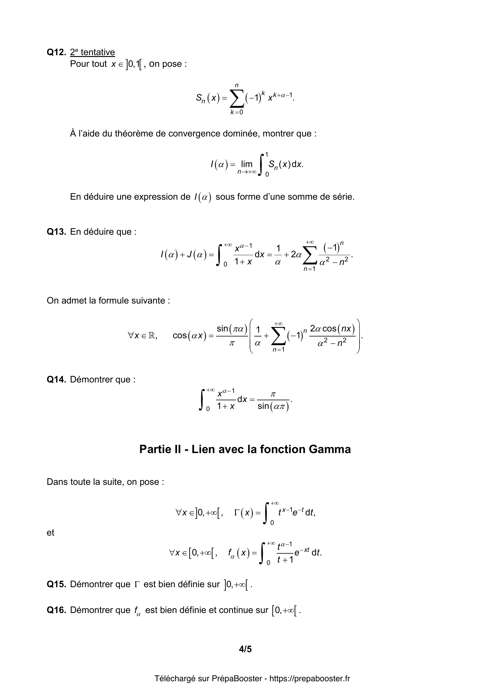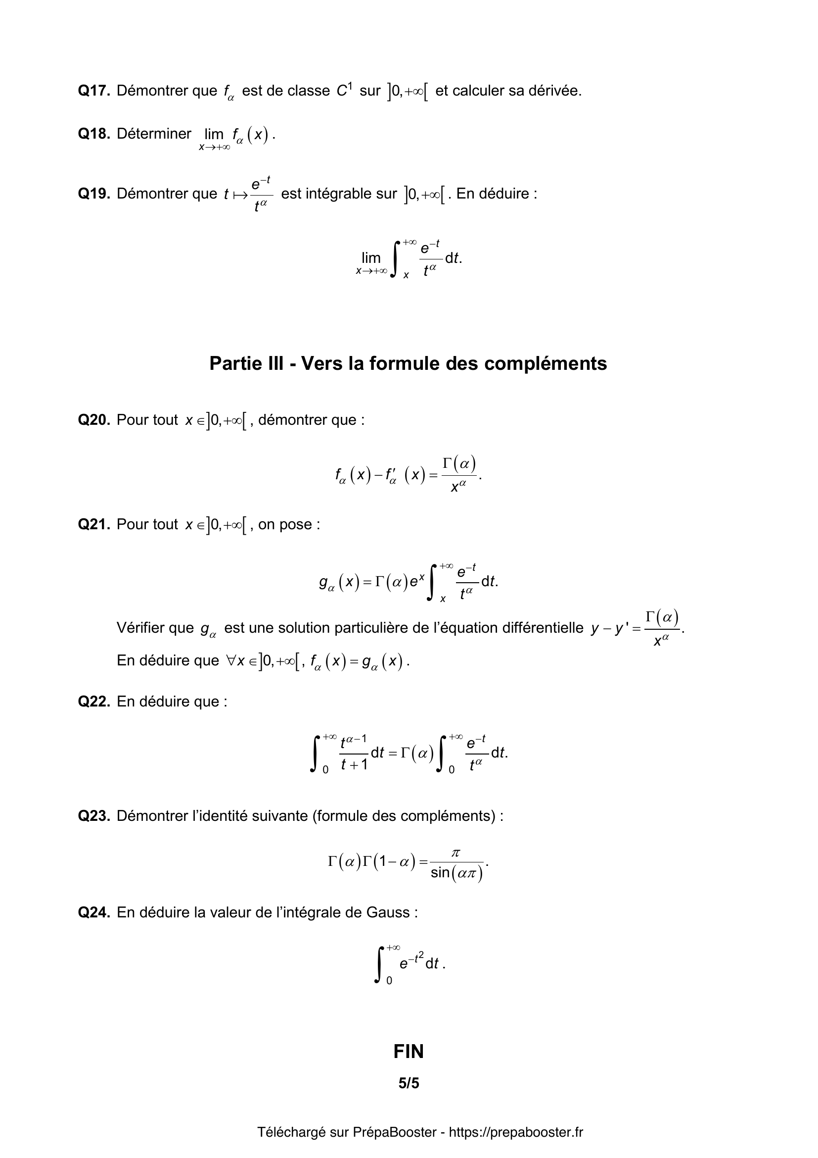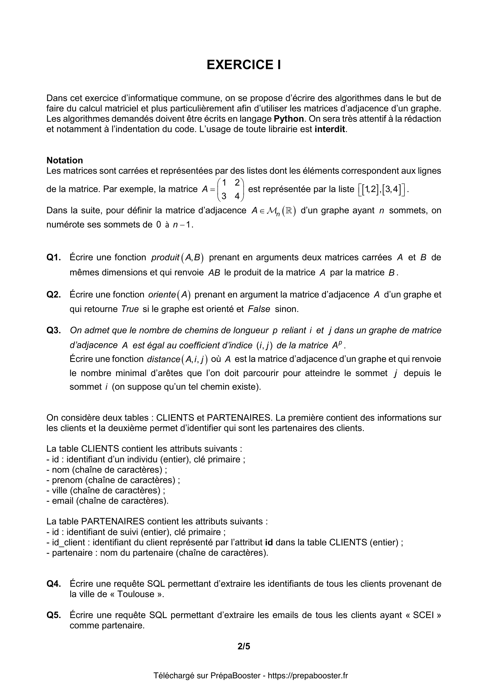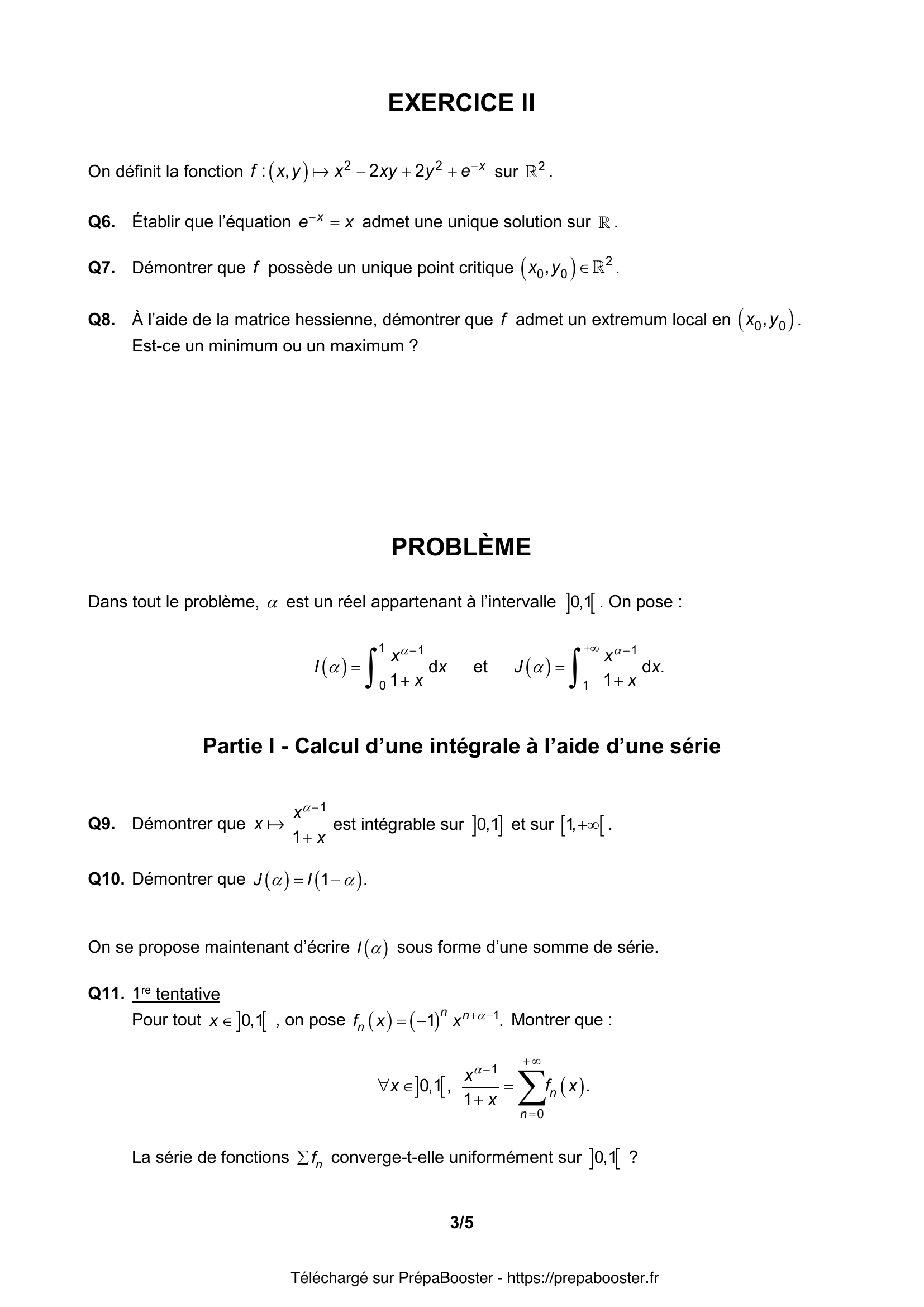 1. Écrire une fonction produit A B ( , ) prenant en arguments deux matrices carrées A et B de mêmes dimensions et qui renvoie AB le produit de la matrice A par la matrice B . 2. Écrire une fonction oriente A( ) prenant en argument la matrice d’adjacence A d’un graphe et qui retourne True si le graphe est orienté et False sinon. 3. On admet que le nombre de chemins de longueur p reliant i et j dans un graphe de matrice d’adjacence A est égal au coefficient d’indice (\(i,j\)) de la matrice \(A^p\).\\ Écrire une fonction distance A i j ( , , ) où A est la matrice d’adjacence d’un graphe et qui renvoie le nombre minimal d’arêtes que l’on doit parcourir pour atteindre le sommet j depuis le sommet i (on suppose qu’un tel chemin existe). 4. Écrire une requête SQL permettant d’extraire les identifiants de tous les clients provenant de la ville de « Toulouse ». 5. Écrire une requête SQL permettant d’extraire les emails de tous les clients ayant « SCEI » comme partenaire.} 6. Établir que l’équation \( x e^{-x} = \) admet une unique solution sur \( \mathbb{R} \). 7. Démontrer que \( f \) possède un unique point critique \( (x_0, y_0) \in \mathbb{R}^2 \). 8. À l’aide de la matrice hessienne, démontrer que \( f \) admet un extremum local en \( (x_0, y_0) \).\\ Est-ce un minimum ou un maximum ? 9. Démontrer que \(\frac{x^{\alpha-1}}{x+1}\) est intégrable sur \(]0,1]\) et sur \([1,+\infty[\). 10. Démontrer que \(J(\alpha)=I(1-\alpha)\).} 11. Pour tout \( x \in ]0,1[ \), on pose \(f_n(x) = x^{n+\alpha-1} – x^{n}\). Montrer que :\\ Pour tout \(x \in ]0,1[\), \(\sum_{n=0}^{+\infty} f_n(x) = \frac{x^{\alpha-1}}{x+1}\).\\ La série de fonctions \(\sum f_n\) converge-t-elle uniformément sur \(]0,1[\) ? 12. Pour tout \( x \in ]0,1[ \), on pose : \( S_n(x) = \sum_{k=0}^n (x^{k+\alpha-1} – x^{k+\alpha}) \).\\ À l’aide du théorème de convergence dominée, montrer que : \(\lim_{n\to+\infty} \int_0^1 S_n(x) dx = I(\alpha)\).\\ En déduire une expression de \(I(\alpha)\) sous forme d’une somme de série. 13. En déduire que :\\ \(I(\alpha) – J(\alpha) = \int_0^{+\infty} \frac{x^{\alpha-1}}{x+1}\, dx = \sum_{n=0}^{+\infty} \frac{1}{n+\alpha} – \frac{1}{n+1}\). 14. On admet la formule suivante :\\ Pour tout \(x \in \mathbb{R}\), \(0 < \alpha < 1\), \( \sum_{n=0}^{+\infty} \frac{\sin((n+1)\pi\alpha)}{n+1} = \frac{\pi}{\sin(\pi\alpha)}\).\\ Démontrer que :\\ \( \int_0^{+\infty} \frac{x^{\alpha-1}}{x+1}dx = \frac{\pi}{\sin(\pi\alpha)} \). 15. Dans toute la suite, on pose :\\ \( \Gamma(x) = \int_0^{+\infty} t^{x-1} e^{-t} dt \) sur \(]0,+\infty[\),\\ et\\ \(f_\alpha(x) = \int_0^{+\infty} \frac{t^{x-1} e^{-t}}{t+\alpha} dt \) sur \([0,+\infty[\).\\ Démontrer que \( \Gamma \) est bien définie sur \(]0, +\infty[\).} 16. Démontrer que \(f_\alpha\) est bien définie et continue sur \([0, +\infty[\). 17. Démontrer que \(f_\alpha\) est de classe \(C^1\) sur \(]0, +\infty[\) et calculer sa dérivée. 18. Déterminer \( \lim_{x \to +\infty} f_\alpha(x) \). 19. Démontrer que \( \frac{e^{-t}}{t+\alpha} \) est intégrable sur \(]0, +\infty[\). En déduire :\\ \( \lim_{x \to +\infty} \int_0^{+\infty} \frac{t^{x-1} e^{-t}}{t+\alpha} dt \). 20. Pour tout \(x \in ]0, +\infty[\), démontrer que :\\ \( \Gamma(x) f_\alpha(x) - f_\alpha'(x) = 0 \).} 21. Pour tout \(x \in ]0, +\infty[\), on pose :\\ \(g_\alpha(x) = \Gamma(x) \int_0^{+\infty} e^{-t} t^{x-1} \frac{dt}{t+\alpha}\).\\ Vérifier que \(g_\alpha\) est une solution particulière de l’équation différentielle \( y' = \Gamma(x) - y \).\\ En déduire que \( \forall x \in ]0, +\infty[ ~,~ f_\alpha(x) = g_\alpha(x) \). 22. En déduire que :\\ \(\int_0^{+\infty} t^{\alpha-1} e^{-t} dt \cdot \int_0^{+\infty} \frac{e^{-t}}{t+\alpha}dt = \Gamma(\alpha) \int_0^{+\infty} \frac{e^{-t}}{t+\alpha} dt\). 23. Démontrer l’identité suivante (formule des compléments) :\\ \( \Gamma(\alpha) \Gamma(1-\alpha) = \frac{\pi}{\sin(\pi\alpha)} \). 24. En déduire la valeur de l’intégrale de Gauss :\\ \(\int_0^{+\infty} e^{-t^2} dt\).}FAQ