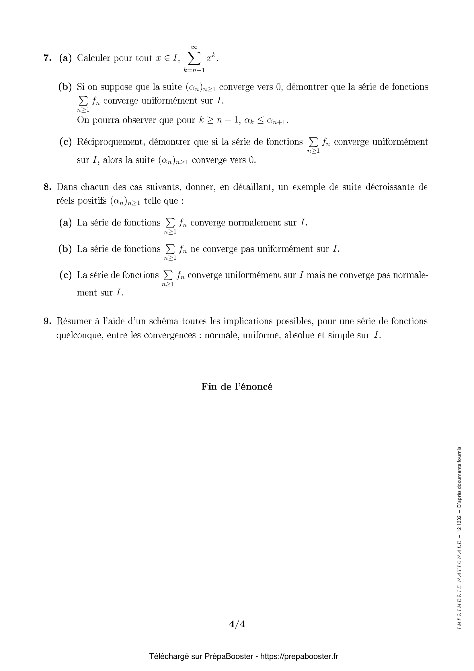 18. (c) Réciproquement, démontrer que si la série de fonctions $\sum_{n \geq 1} f_n$ converge uniformément sur $I$, alors la suite $(\alpha_n)_{n\geq 1}$ converge vers $0$.