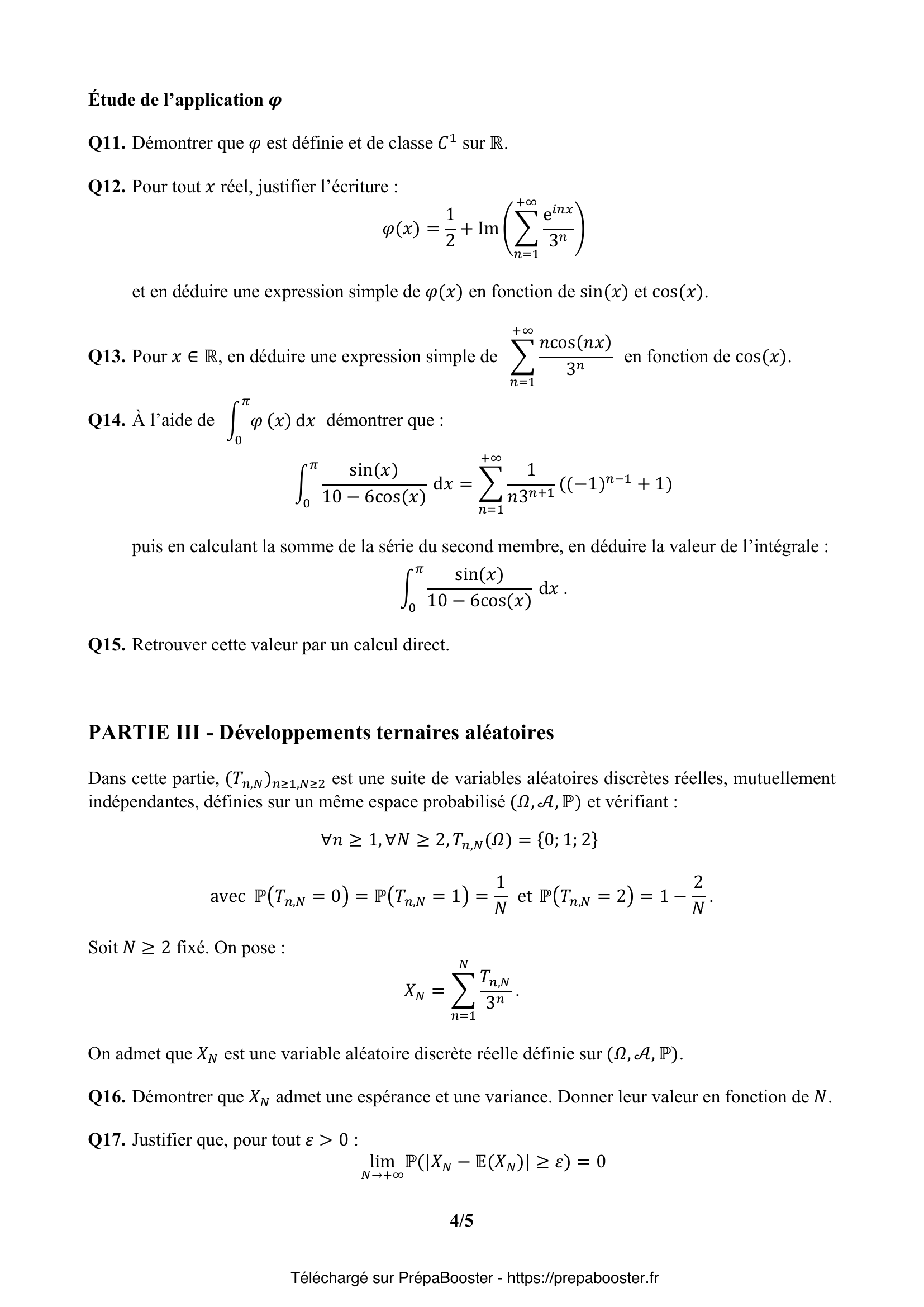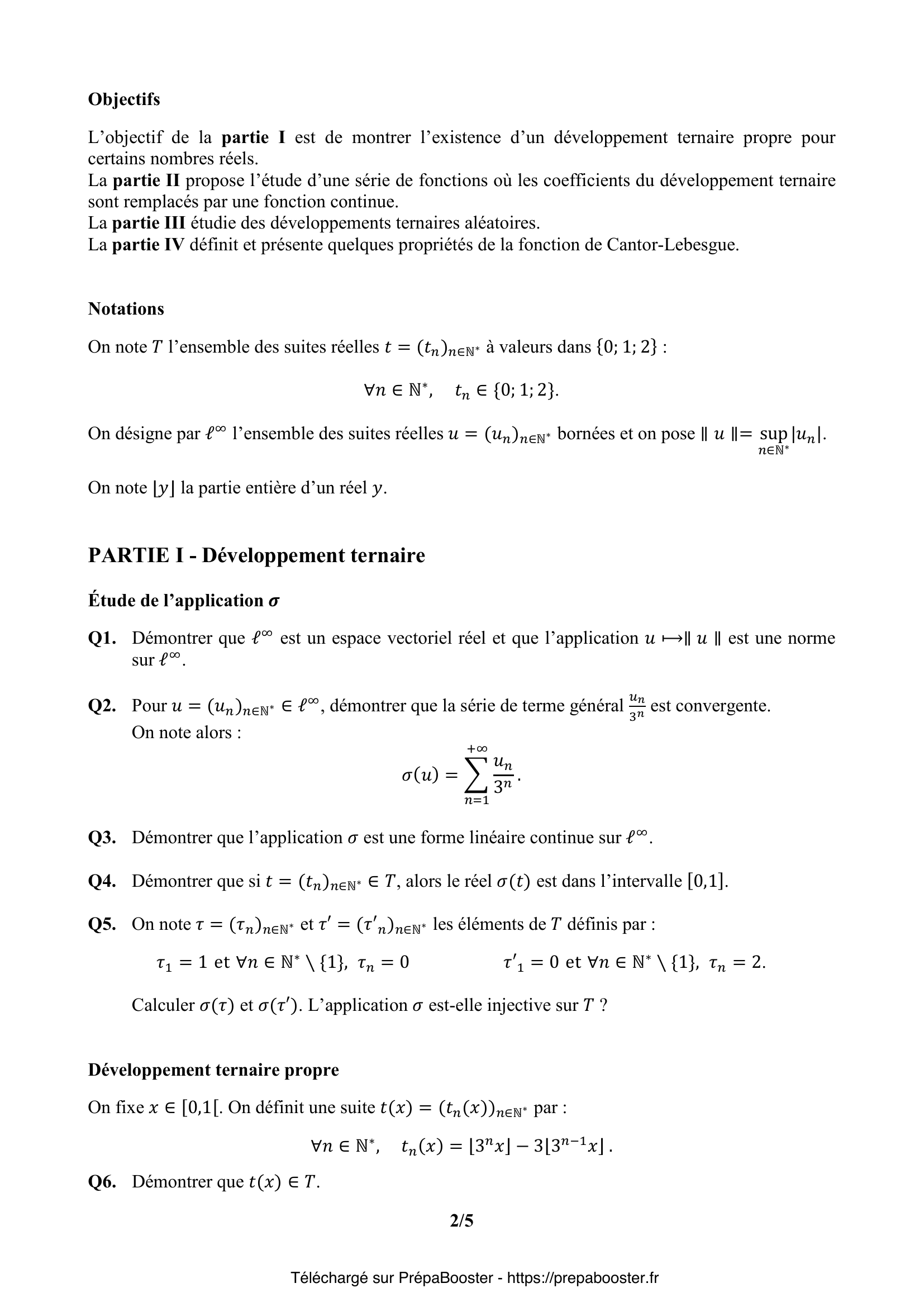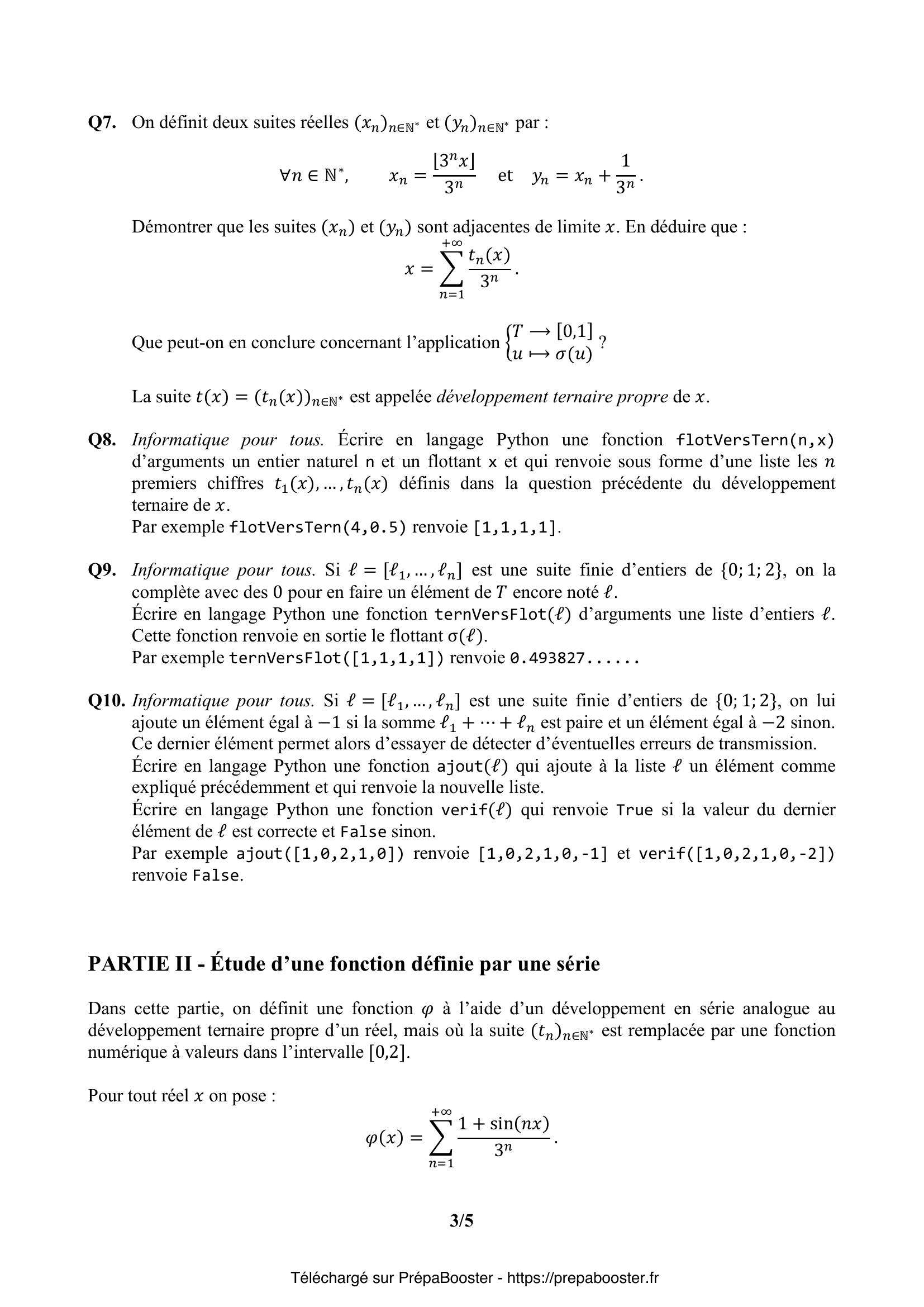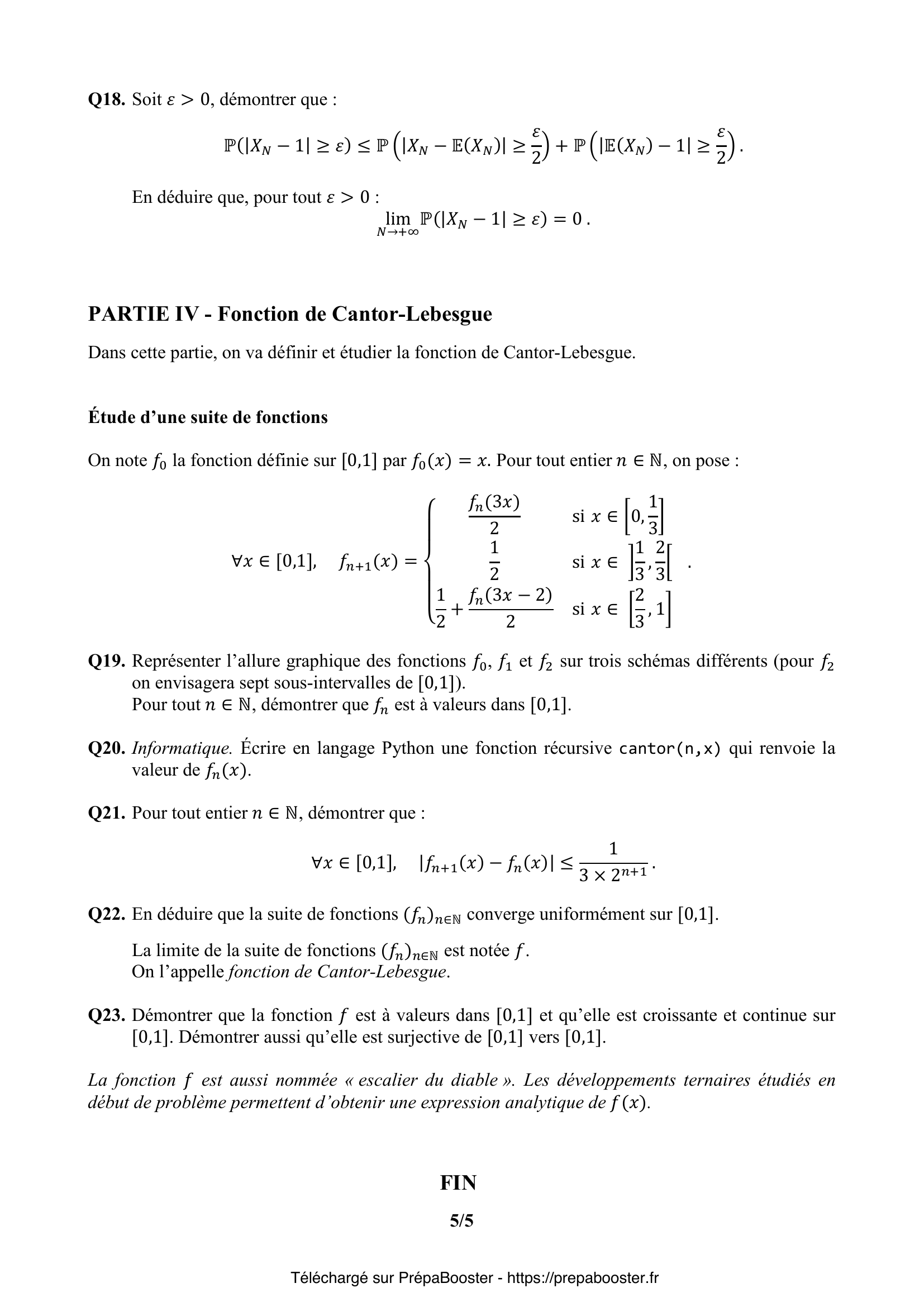 1. Q1. Démontrer que $\ell^\infty$ est un espace vectoriel réel et que l’application $u = (u_n)_{n\in\mathbb{N}^*} \longmapsto \|u\|$ est une norme sur $\ell^\infty$. 2. Q2. Pour $u = (u_n)_{n\in\mathbb{N}^*} \in \ell^\infty$, démontrer que la série de terme général $\frac{u_n}{3^n}$ est convergente.\\ On note alors :\\ $\sigma(u) = \sum_{n=1}^{+\infty}\frac{u_n}{3^n}$. 3. Q3. Démontrer que l’application $\sigma$ est une forme linéaire continue sur $\ell^\infty$. 4. Q4. Démontrer que si $t = (t_n)_{n\in\mathbb{N}^*} \in \mathcal{T}$, alors le réel $\sigma(t)$ est dans l’intervalle $[0,1]$. 5. Q5. On note $\tau = (\tau_n)_{n\in\mathbb{N}^*}$ et $\tau’ = (\tau’_n)_{n\in\mathbb{N}^*}$ les éléments de $\mathcal{T}$ définis par :\\ $\tau_1 = 1$ et $\forall n \in \mathbb{N}^* \setminus\{1\},\; \tau_n = 0$\\ $\tau’_1 = 0$ et $\forall n \in \mathbb{N}^* \setminus\{1\},\; \tau’_n = 2$.\\ Calculer $\sigma(\tau)$ et $\sigma(\tau’)$. L’application $\sigma$ est-elle injective sur $\mathcal{T}$ ?} 6. Q6. Démontrer que $t(x) \in \mathcal{T}$, où $x \in [0,1[$ et $t(x)=(t_n(x))_{n\in\mathbb{N}^*}$ est défini par $t_n(x)=\lfloor 3^n x \rfloor – 3\lfloor 3^{n-1} x \rfloor$. 7. Q7. On définit deux suites réelles $(x_n)_{n\in\mathbb{N}^*}$ et $(y_n)_{n\in\mathbb{N}^*}$ par :\\ $\forall n \in \mathbb{N}^*,\; x_n = \frac{\lfloor 3^n x \rfloor}{3^n}$ et $y_n = x_n+\frac{1}{3^n}$.\\ Démontrer que les suites $(x_n)$ et $(y_n)$ sont adjacentes de limite $x$. En déduire que : $x = \sum_{n=1}^{+\infty} \frac{t_n(x)}{3^n}$.\\ Que peut-on en conclure concernant l’application $ \begin{array}{cccc} & \mathcal{T} & \to & [0,1] \\ & u & \mapsto & \sigma(u) \end{array}$ ? 8. Q8. Informatique pour tous. Écrire en langage Python une fonction \verb+flotVersTern(n,x)+ d’arguments un entier naturel $n$ et un flottant $x$ et qui renvoie sous forme d’une liste les $n$ premiers chiffres $t_1(x),\dots,t_n(x)$ définis dans la question précédente du développement ternaire de $x$.\\ Par exemple \verb+flotVersTern(4,0.5)+ renvoie \verb+[1,1,1,1]+. 9. Q9. Informatique pour tous. Si $\ell = [\ell_1, \ldots, \ell_n]$ est une suite finie d’entiers de $\{0;1;2\}$, on la complète avec des 0 pour en faire un élément de $\mathcal{T}$ encore noté $\ell$.\\ Écrire en langage Python une fonction \verb+ternVersFlot(ℓ)+ d’arguments une liste d’entiers $\ell$.\\ Cette fonction renvoie en sortie le flottant $\sigma(\ell)$.\\ Par exemple \verb+ternVersFlot([1,1,1,1])+ renvoie $0.493827\ldots$ 10. Q10. Informatique pour tous. Si $\ell = [\ell_1, \ldots, \ell_n]$ est une suite finie d’entiers de $\{0;1;2\}$, on lui ajoute un élément égal à $-1$ si la somme $\ell_1 + \cdots + \ell_n$ est paire et un élément égal à $-2$ sinon. Ce dernier élément permet alors d’essayer de détecter d’éventuelles erreurs de transmission.\\ Écrire en langage Python une fonction \verb+ajout(ℓ)+ qui ajoute à la liste $\ell$ un élément comme expliqué précédemment et qui renvoie la nouvelle liste.\\ Écrire en langage Python une fonction \verb+verif(ℓ)+ qui renvoie True si la valeur du dernier élément de $\ell$ est correcte et False sinon.\\ Par exemple \verb+ajout([1,0,2,1,0])+ renvoie \verb+[1,0,2,1,0,-1]+ et \verb+verif([1,0,2,1,0,-2])+ renvoie False.} 11. Q11. Démontrer que $\varphi$ est définie et de classe $C^\infty$ sur $\mathbb{R}$. 12. Q12. Pour tout $x$ réel, justifier l’écriture : $\varphi(x)=\dfrac{1}{2} + \Re\left(\dfrac{e^{ix}}{3-e^{ix}}\right)$\\ et en déduire une expression simple de $\varphi(x)$ en fonction de $\sin(x)$ et $\cos(x)$. 13. Q13. Pour $x\in \mathbb{R}$, en déduire une expression simple de $\varphi(x)$ en fonction de $\cos(x)$. 14. Q14. À l’aide de l’expression précédente, démontrer que :\\ $\int_{0}^{2\pi} \frac{\sin(x)}{10-6\cos(x)}\,dx = \displaystyle\sum_{n=1}^{+\infty}\frac{1}{n3^n}$\\ puis, en calculant la somme de la série du second membre, en déduire la valeur de l’intégrale\\ $\int_{0}^{2\pi} \frac{\sin(x)}{10-6\cos(x)}\,dx$. 15. Q15. Retrouver cette valeur par un calcul direct.} 16. Q16. Démontrer que $X_N$ admet une espérance et une variance. Donner leur valeur en fonction de $N$. 17. Q17. Justifier que, pour tout $\epsilon > 0$ :\\ $\displaystyle\lim_{N\to+\infty} \mathbb{P}(|X_N – \mathbb{E}(X_N)| \geq \epsilon) = 0$ 18. Q18. Soit $\varepsilon > 0$, démontrer que :\\ \[ \mathbb{P}(|X_N -1| \geq \varepsilon) \leq \mathbb{P}\left(|X_N – \mathbb{E}(X_N)| \geq \frac{\varepsilon}{2}\right) + \mathbb{P}\left(|\mathbb{E}(X_N) -1 | \geq \frac{\varepsilon}{2}\right) \] En déduire que, pour tout $\varepsilon > 0$ :\\ $\displaystyle\lim_{N\to+\infty} \mathbb{P}(|X_N-1|\geq \varepsilon)=0$.} 19. Q19. Représenter l’allure graphique des fonctions $f_0, f_1$ et $f_2$ sur trois schémas différents (pour $f_2$ on envisagera sept sous-intervalles de $[0,1]$).\\ Pour tout $n \in \mathbb{N}$, démontrer que $f_n$ est à valeurs dans $[0,1]$. 20. Q20. Informatique. Écrire en langage Python une fonction récursive \verb+cantor(n,x)+ qui renvoie la valeur de $f_n(x)$. 21. Q21. Pour tout entier $n \in \mathbb{N}$, démontrer que :\\ $\forall x\in [0,1]$, $|f_{n+1}(x)-f_n(x)| \leq \dfrac{1}{3\times 2^{n+1}}$. 22. Q22. En déduire que la suite de fonctions $(f_n)_{n\in\mathbb{N}}$ converge uniformément sur $[0,1]$.\\ La limite de la suite de fonctions $(f_n)_{n\in\mathbb{N}}$ est notée $f$.\\ On l’appelle fonction de Cantor-Lebesgue. 23. Q23. Démontrer que la fonction $f$ est à valeurs dans $[0,1]$ et qu’elle est croissante et continue sur $[0,1]$. Démontrer aussi qu’elle est surjective de $[0,1]$ vers $[0,1]$.\\ La fonction $f$ est aussi nommée « escalier du diable ». Les développements ternaires étudiés en début de problème permettent d’obtenir une expression analytique de $f(x)$.}FAQ