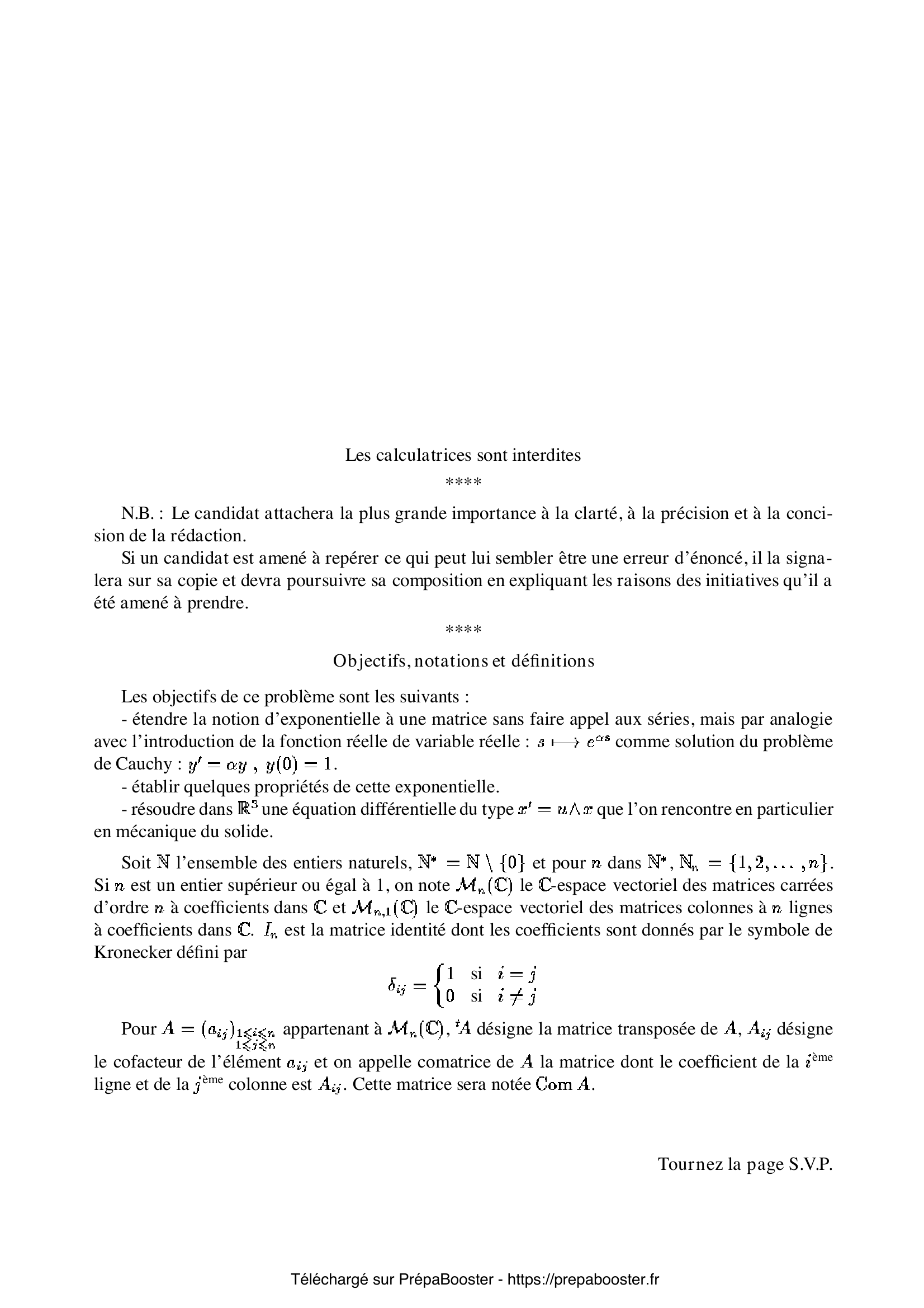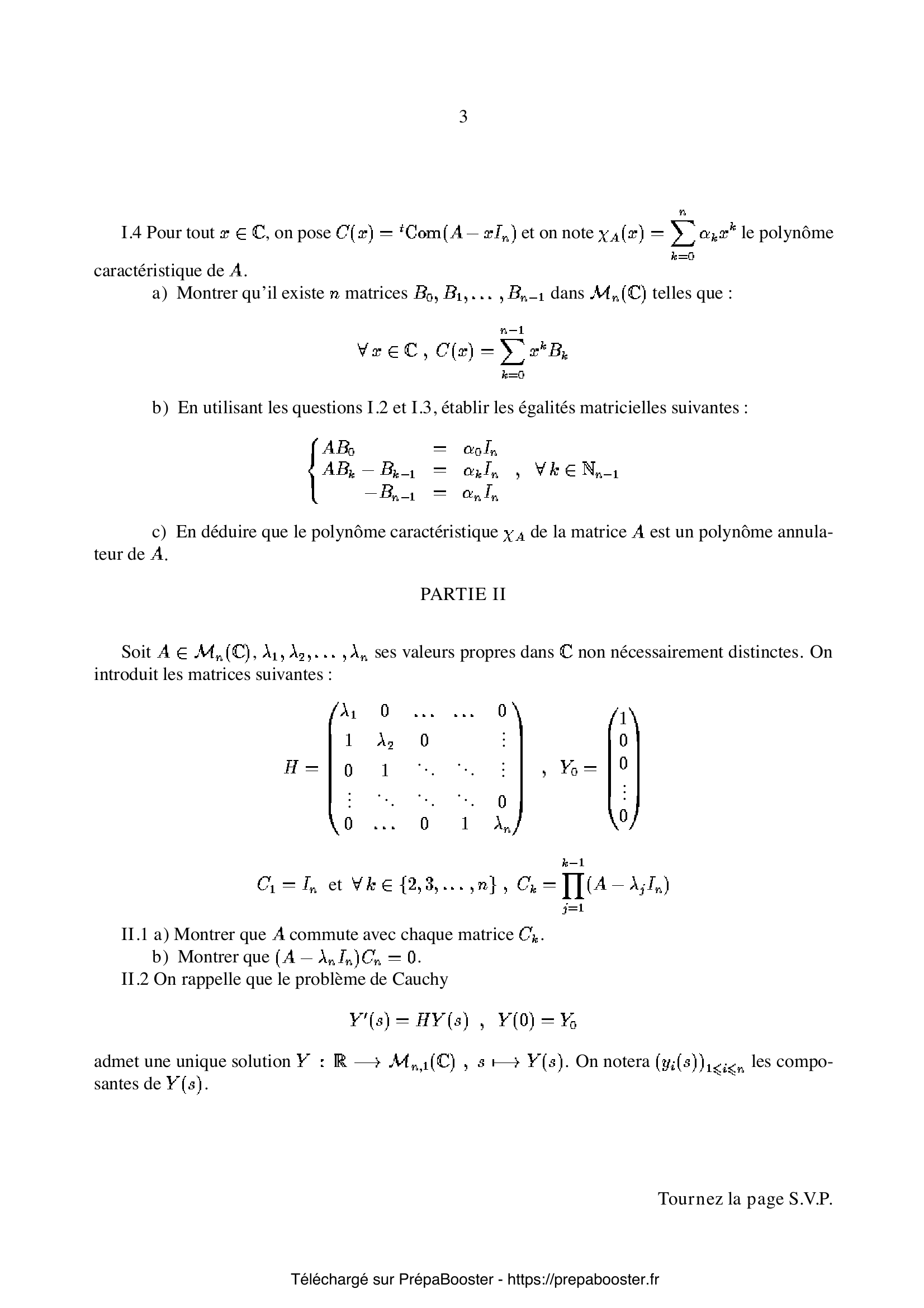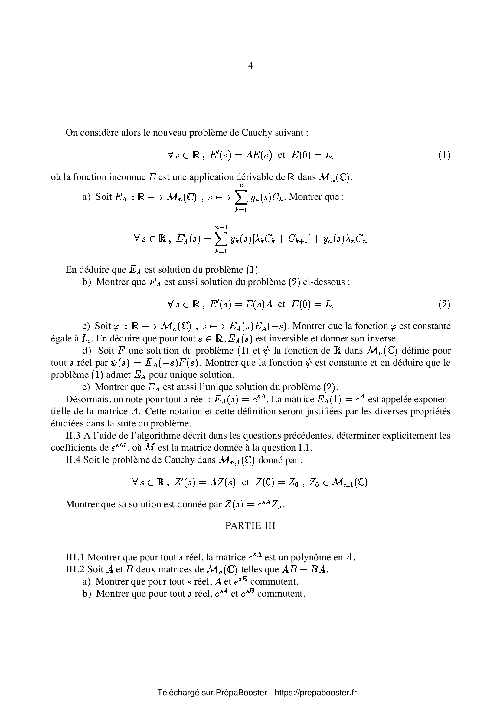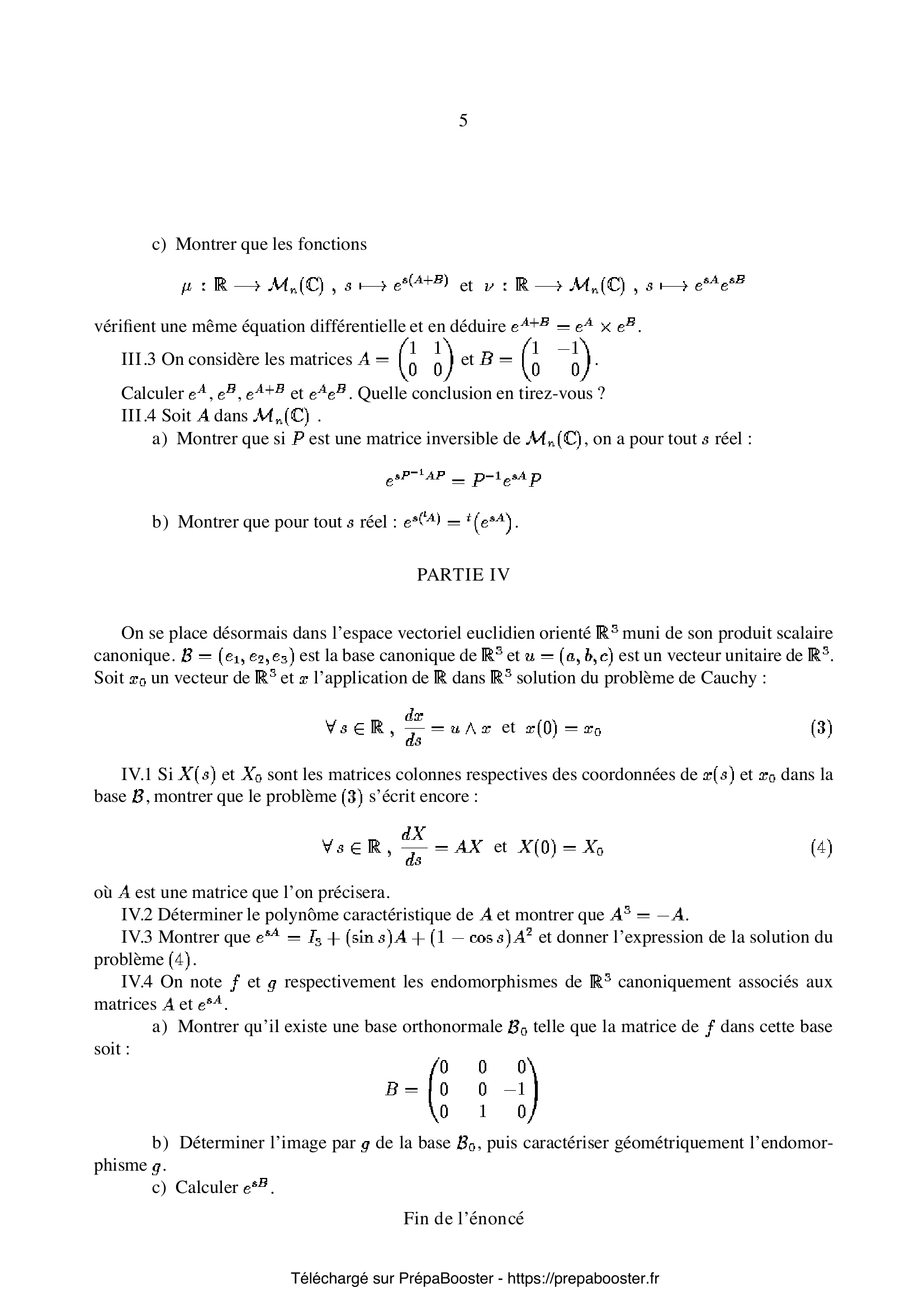 1. I.1 Soit la matrice $P$ donnée par : $P = \begin{pmatrix} 1 & 2 \\ 0 & 2 \end{pmatrix}$.\\ a) Calculer $\det(P)$.\\ b) Calculer la matrice produit $P \begin{pmatrix} 1 \\ 1 \end{pmatrix}$.\\ c) Déterminer le polynôme caractéristique $f$ de $P$.\\ d) Calculer $f'(t) = \frac{d}{dt} f(t)$, puis la matrice $f'(P)$. 2. I.2 Soit $A: t \mapsto (a_{ij}(t))$ une matrice à coefficients fonctions dérivables sur un intervalle $I$.\\ a) Montrer que $\det(M) = \sum_{j=1}^n a_{1j} \cof_{1j}(A)$ si $M$ est la matrice obtenue en remplaçant la première ligne de $A$ par $(1,0,\ldots,0)$.\\ b) En déduire les égalités :\\ $\sum_{k=1}^n a_{ik} \cof_{jk}(A) = \delta_{ij} \det(A)$.\\ c) Montrer de même les égalités :\\ $\sum_{k=1}^n a_{ki} \cof_{kj}(A) = \delta_{ij} \det(A)$.\\ d) En déduire les formules :\\ $A \adj(A) = (\det A) I_n$ et $\adj(A) A = (\det A) I_n$. 3. I.3 a) Soit $(P_{ij})_{1 \leq i, j \leq n}$ une famille de polynômes complexes de degré $\leq d$. Pour $x \in \mathbb{C}$, on note $\mathcal{P}(x)$ la matrice de coefficients $P_{ij}(x)$. Montrer par récurrence sur l’ordre de la matrice qu’il existe un polynôme $q$ de degré $\leq n$ tel que pour tout $x \in \mathbb{C}$, $\det(\mathcal{P}(x)) = q(x)$.\\ b) Soient $A,B$ deux matrices telles que pour tout $x$, $A(x)B(x) = I$. Montrer que pour tout $i$, $A_i(x)$ est inversible. 4. I.4 Pour tout $n \geq 1$, on pose $A_n = (a_{ij})$ et on note $f_n$ le polynôme caractéristique de $A_n$.\\ a) Montrer qu’il existe $n$ matrices $B_1, …, B_n$ dans $\mathbb{M}_n(\mathbb{C})$ telles que :\\ $A_n^k = \sum_{m=1}^n \lambda_m^k B_m$\\ où les $\lambda_m$ sont les racines de $f_n$.\\ b) En utilisant les questions I.2 et I.3, établir les égalités matricielles suivantes :\\ $\sum_{m=1}^n B_m = I_n$.\\ c) En déduire que le polynôme caractéristique de la matrice $A_n$ est un polynôme annulateur de $A_n$. 5. II.1 a) Montrer que $A$ commute avec chacune des matrices $B_j$.\\ b) Montrer que $\exp(A) = \sum_{j=1}^k e^{\lambda_j t} B_j$.} 6. II.2 On rappelle que le problème de Cauchy\\ $\begin{cases} X'(t) = AX(t) \\ X(0) = X_0 \end{cases}$\\ admet une unique solution $X(t) = \exp(tA)X_0$. 7. II.3 À l’aide de l’algorithme décrit dans les questions précédentes, déterminer explicitement les coefficients de $\exp(tA)$, où $A$ est la matrice donnée en I.1. 8. II.4 Soit le problème de Cauchy dans $\mathbb{C}^n$ donné par :\\ $\begin{cases} Y'(t) = AY(t) \\ Y(0) = Y_0 \end{cases}$\\ Montrer que sa solution est donnée par $Y(t) = \exp(tA) Y_0$. 9. III.1 Montrer que pour tout $t \in \mathbb{R}$, la matrice $\exp(tA)$ est un polynôme en $A$. 10. III.2 Soient $A$ et $B$ deux matrices de $\mathbb{C}^n$ telles que $AB = BA$.\\ a) Montrer que pour tout $t \in \mathbb{R}$, $A$ et $\exp(tB)$ commutent.\\ b) Montrer que pour tout $t \in \mathbb{R}$, $\exp(tA)$ et $\exp(tB)$ commutent.} 11. III.3 On considère les matrices $A = \begin{pmatrix} 0 & 1 \\ 0 & 0 \end{pmatrix}$ et $B = \begin{pmatrix} 0 & 0 \\ 0 & 1 \end{pmatrix}$.\\ Calculer $\exp(0)$, $\exp(B)$, $\exp(A+B)$ et $\exp(A)\exp(B)$. Quelle conclusion en tirez-vous ? 12. III.4 Soit $A$ dans $\mathbb{C}^n$.\\ a) Montrer que si $P$ est une matrice inversible de $\mathbb{C}^n$, on a pour tout $t$ réel : $\exp(t P A P^{-1}) = P \exp(tA) P^{-1}$.\\ b) Montrer que pour tout $t$ réel : $\exp(-tA) = [\exp(tA)]^{-1}$. 13. IV.1 Si $X(t)$ et $X_0$ sont les matrices colonnes des coordonnées de $x(t)$ et $x_0$ dans la base canonique, montrer que le problème s’écrit encore :\\ $\begin{cases} X'(t) = AX(t) \\ X(0) = X_0 \end{cases}$\\ où $A$ est une matrice à préciser. 14. IV.2 Déterminer le polynôme caractéristique de $A$ et montrer que $A^3 = -A$. 15. IV.3 Montrer que $\exp(tA) = I + \sin t\, A + (1- \cos t)A^2$ et donner l’expression de la solution du problème.} 16. IV.4 On note $f$ et $g$ respectivement les endomorphismes de $\mathbb{R}^3$ canoniquement associés aux matrices $A$ et $\exp(A)$. a) Montrer qu’il existe une base orthonormale $\mathcal{B}$ telle que la matrice de $f$ dans cette base soit $\begin{pmatrix} 0 & -1 & 0 \\ 1 & 0 & 0 \\ 0 & 0 & 0 \end{pmatrix}$. b) Déterminer l’image par $g$ de la base $\mathcal{B}$, puis caractériser géométriquement l’endomorphisme $g$. c) Calculer $\exp(2\pi A)$.}FAQ