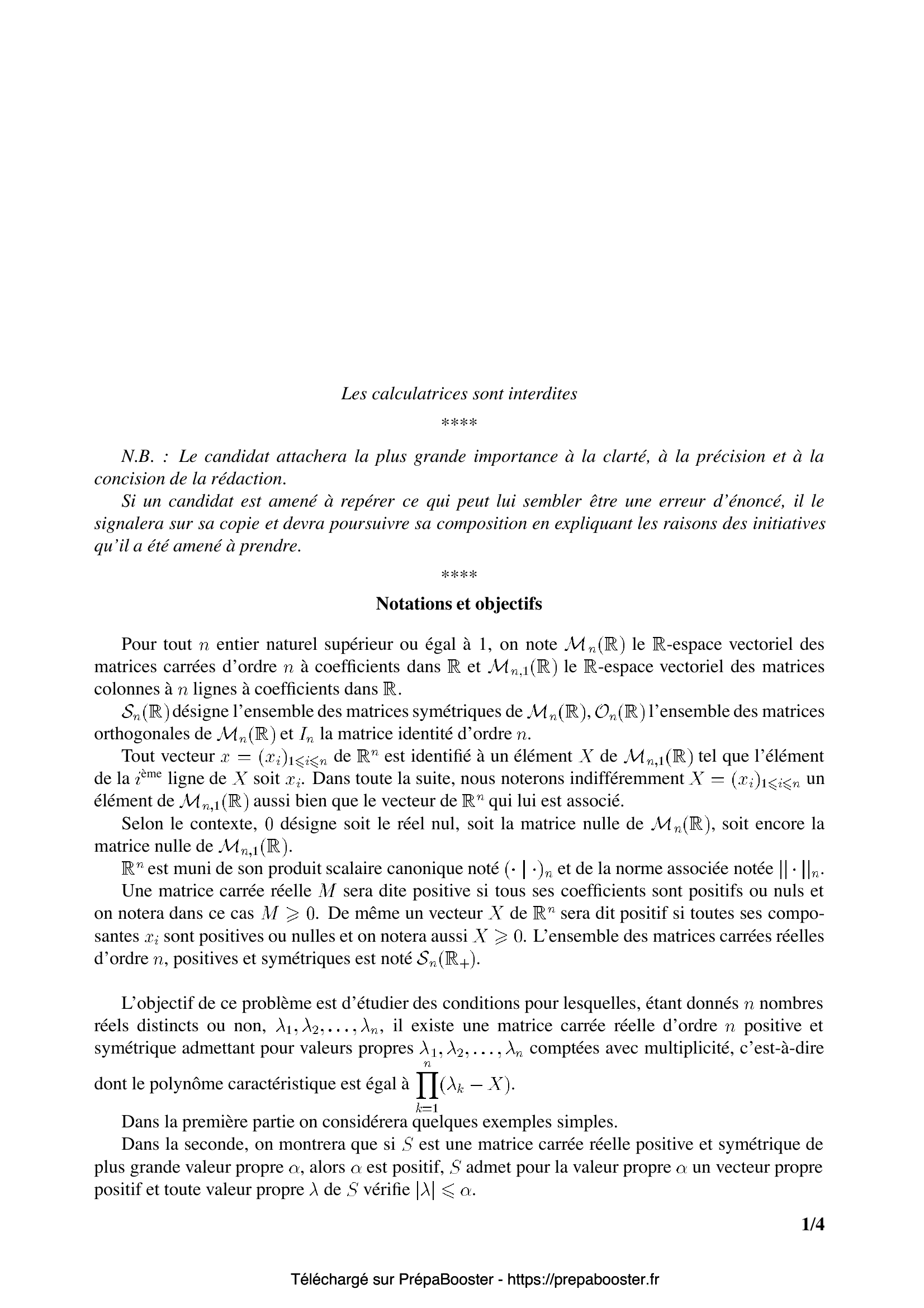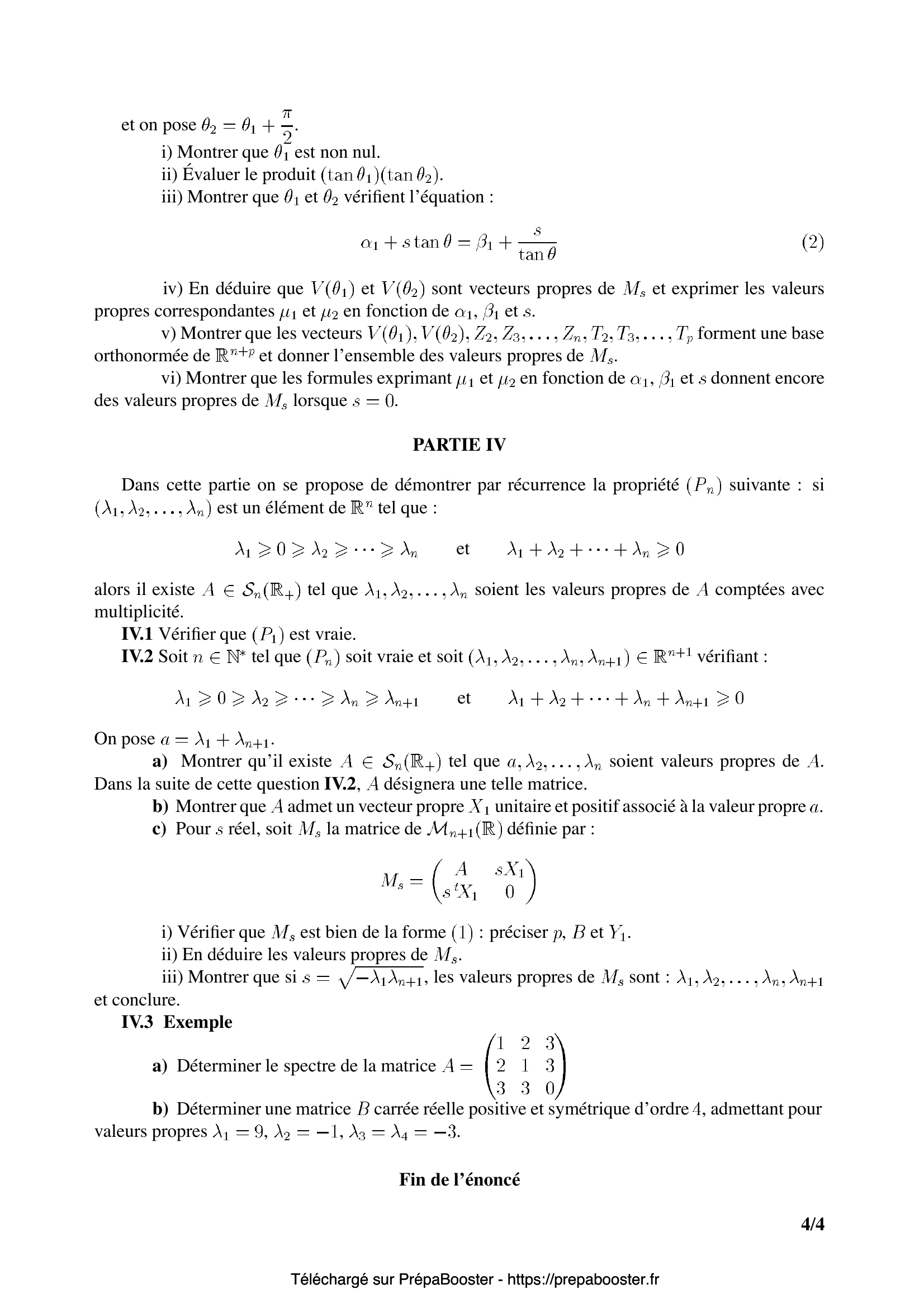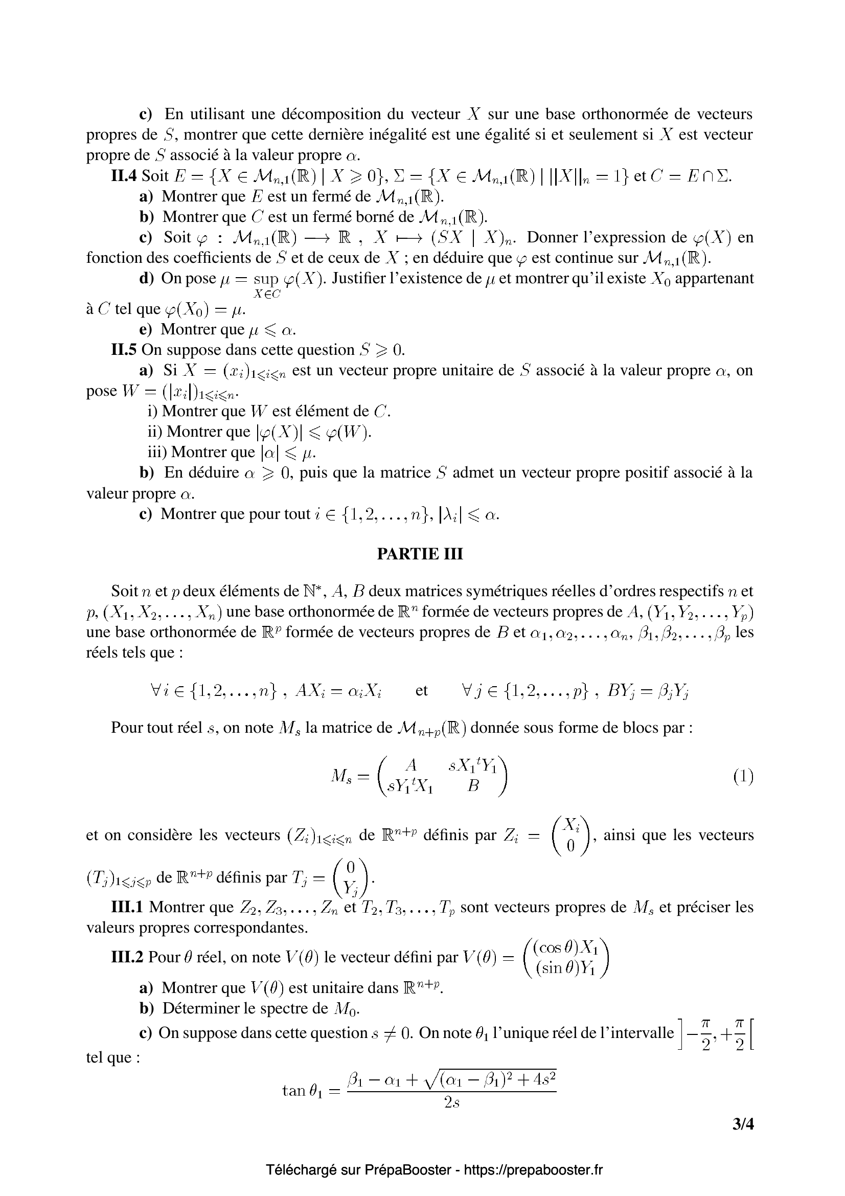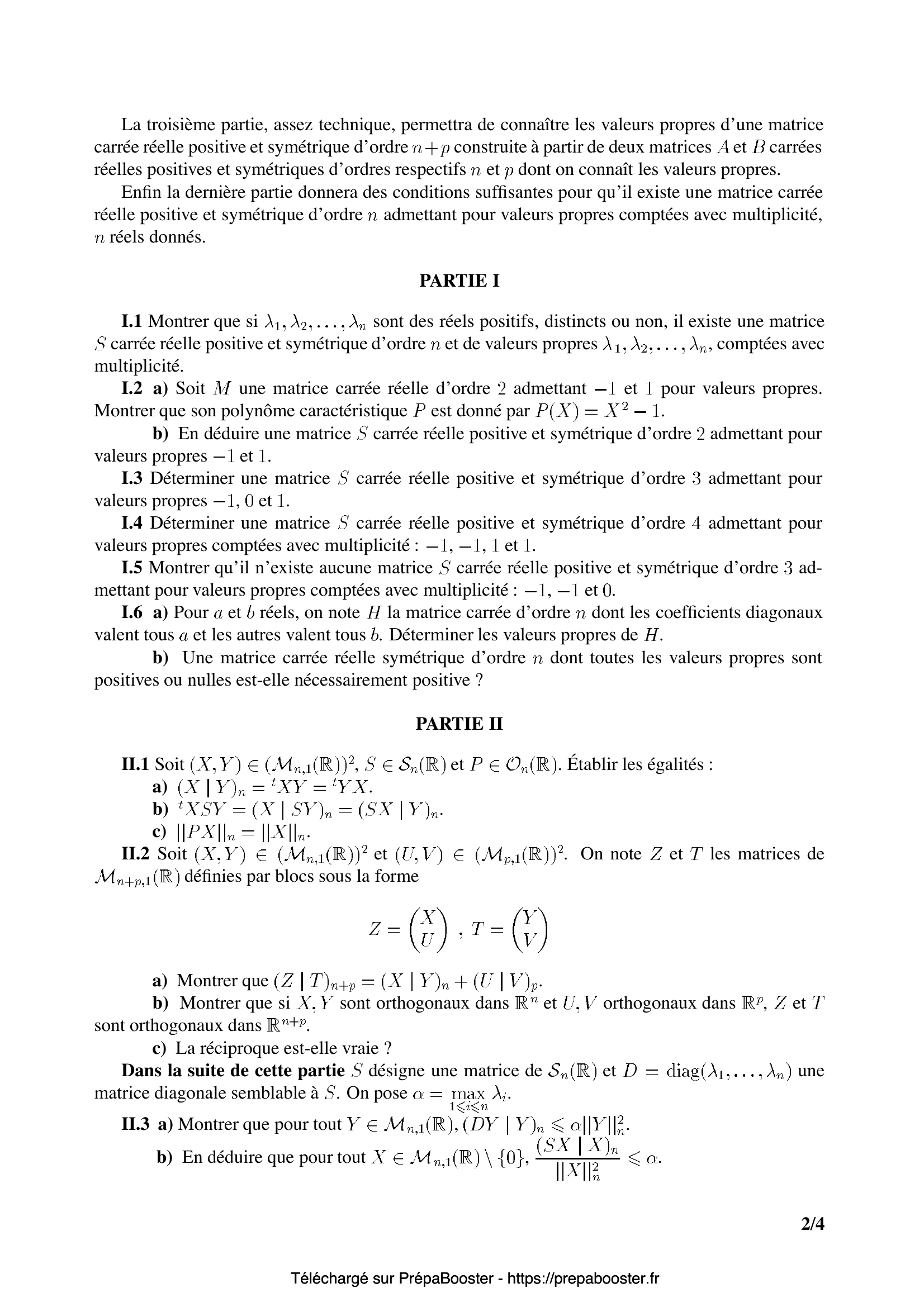 1. I.1 Montrer que si $\lambda_1, \ldots, \lambda_n$ sont des réels positifs, distincts ou non, il existe une matrice carrée réelle positive et symétrique d’ordre $n$ et de valeurs propres $\lambda_1, \ldots, \lambda_n$, comptées avec multiplicité. 2. I.2 a) Soit $A$ une matrice carrée réelle d’ordre $2$ admettant $\lambda_1$ et $\lambda_2$ pour valeurs propres. Montrer que son polynôme caractéristique est donné par $P(X) = X^2 – (\lambda_1+\lambda_2)X + \lambda_1\lambda_2$.\\ b) En déduire une matrice carrée réelle positive et symétrique d’ordre $2$ admettant pour valeurs propres $\lambda_1$ et $\lambda_2$. 3. I.3 Déterminer une matrice carrée réelle positive et symétrique d’ordre $3$ admettant pour valeurs propres $\lambda_1, \lambda_2, \lambda_3$. 4. I.4 Déterminer une matrice carrée réelle positive et symétrique d’ordre $4$ admettant pour valeurs propres comptées avec multiplicité : $1, 1, 2$ et $3$. 5. I.5 Montrer qu’il n’existe aucune matrice carrée réelle positive et symétrique d’ordre $3$ admettant pour valeurs propres comptées avec multiplicité : $1$, $-1$ et $2$.} 6. I.6 a) Pour $a$ et $b$ réels, on note $M$ la matrice carrée d’ordre $n$ dont les coefficients diagonaux valent tous $a$ et les autres valent tous $b$. Déterminer les valeurs propres de $M$.\\ b) Une matrice carrée réelle symétrique d’ordre $n$ dont toutes les valeurs propres sont positives ou nulles est-elle nécessairement positive ? 7. II.1 Soit $A \in \mathcal{S}_n(\mathbb{R})$, $X \in \mathbb{R}^n$ et $\mu\in\mathbb{R}$. Établir les égalités :\\ a) $A(X) = (X | AX)$.\\ b) $(AX|AY) = (X|A^2Y)$.\\ c) $\| AX \| \leq \|A\| \, \| X \|$. 8. II.2 Soient $M_1 \in \mathcal{M}_{n_1, 1}(\mathbb{R})$ et $M_2 \in \mathcal{M}_{n_2, 1}(\mathbb{R})$. On note $S_1$ et $S_2$ les matrices de $\mathcal{M}_{n_1, 1}(\mathbb{R})$ et $\mathcal{M}_{n_2, 1}(\mathbb{R})$ définies par blocs sous la forme \[ S = \begin{pmatrix} S_1 & 0 \\ 0 & S_2 \end{pmatrix} \] a) Montrer que $S$ est symétrique $\Leftrightarrow$ $S_1$ et $S_2$ sont symétriques.\\ b) Montrer que si $M_1$ et $M_2$ sont orthogonaux dans $\mathbb{R}^{n_1}$ et $\mathbb{R}^{n_2}$, $M_1$ et $M_2$ sont orthogonaux dans $\mathbb{R}^{n_1+n_2}$.\\ c) La réciproque est-elle vraie ? 9. II.3 a) Montrer que pour tout $X \in \mathbb{R}^n$, $(AX|X) \leq \|A\|\|X\|^2$.\\ b) En déduire que pour tout $X \in \mathbb{R}^n$, $(AX|X)\leq \lambda_{\max}(A)\|X\|^2$.\\ c) En utilisant une décomposition du vecteur $X$ sur une base orthonormée de vecteurs propres de $A$, montrer que cette dernière inégalité est une égalité si et seulement si $X$ est vecteur propre de $A$ associé à la valeur propre $\lambda_{\max}(A)$. 10. II.4 Soit $S$, $\mathcal{S}_n^+(\mathbb{R})$ et $B(0,1)$.\\ a) Montrer que $S$ est un fermé de $\mathcal{S}_n^+(\mathbb{R})$.\\ b) Montrer que $S$ est un fermé borné de $\mathcal{S}_n^+(\mathbb{R})$.\\ c) Soit $A \in S$. Donner l’expression de $(AX|X)$ en fonction des coefficients de $A$ et de ceux de $X$ ; en déduire que $f(A) = \sup_{\|X\| = 1}(AX|X)$ est continue sur $S$.\\ d) On pose $\lambda_0 = \sup_{A\in S}f(A)$. Justifier l’existence de $\lambda_0$ et montrer qu’il existe $A_0$ appartenant à $S$ tel que $f(A_0) = \lambda_0$.\\ e) Montrer que $\lambda_0 \geq 0$.} 11. II.5 On suppose dans cette question $A\in\mathcal{S}_n^+(\mathbb{R})$.\\ a) Si $X_0$ est un vecteur propre unitaire de $A$ associé à la valeur propre $\lambda_0$, on pose $Y_0 = AX_0$.\\ i) Montrer que $Y_0$ est élément de $\mathbb{R}^n_+$.\\ ii) Montrer que $(Y_0|X_0) = \lambda_0$.\\ iii) Montrer que $(A Y_0|Y_0) = \lambda_0 (Y_0|X_0)$.\\ b) En déduire $A Y_0 = \lambda_0 Y_0$, puis que la matrice $A$ admet un vecteur propre positif associé à la valeur propre $\lambda_0$.\\ c) Montrer que pour tout $X \in \mathbb{R}^n_+$, $(AX|X) \leq \lambda_0 \|X\|^2$. 12. III.1 Montrer que $V_1 \otimes u_1$ et $V_2 \otimes u_2$ sont vecteurs propres de $M_t$ et préciser les valeurs propres correspondantes. 13. III.2 Pour $t \in \mathbb{R}$, on note $u_t$ le vecteur défini par \[ u_t = \cos(\theta) u_1 + \sin(\theta) u_2 \] a) Montrer que $u_t$ est unitaire dans $\mathbb{R}^{n_1 + n_2}$.\\ b) Déterminer le spectre de $M_t$.\\ c) On suppose dans cette question $t \neq 0$. On note l’unique réel $\theta$ de l’intervalle $[0, \pi]$ tel que \[ \cos(\theta) = \frac{\alpha_1-\alpha_2}{\sqrt{(\alpha_1-\alpha_2)^2 + 4 t^2}},\;\; \sin(\theta) = \frac{2t}{\sqrt{(\alpha_1-\alpha_2)^2 + 4 t^2}} \] et on pose $\beta_1 = \alpha_1 + t \tan(\theta/2)$, $\beta_2 = \alpha_2 – t \tan(\theta/2)$. i) Montrer que $u_t$ est non nul.\\ ii) Évaluer le produit $(\tan(\theta), \tan(\theta))$.\\ iii) Montrer que $\beta_1$ et $\beta_2$ vérifient l’équation : \[ X^2 – (\alpha_1 + \alpha_2) X + (\alpha_1 \alpha_2 – t^2) = 0 \] iv) En déduire que $u_t$ et $v_t$ sont vecteurs propres de $M_t$ et exprimer les valeurs propres correspondantes $\beta_1$ et $\beta_2$ en fonction de $t$, $\alpha_1$ et $\alpha_2$.\\ v) Montrer que les vecteurs $u_t$ et $v_t$ forment une base orthonormée de $\mathbb{R}^{n_1 + n_2}$ et donner l’ensemble des valeurs propres de $M_t$.\\ vi) Montrer que les formules exprimant $\beta_1$ et $\beta_2$ en fonction de $t$, $\alpha_1$ et $\alpha_2$ donnent encore des valeurs propres de $M_t$ lorsque $t = 0$. 14. IV.1 Vérifier que $P_1$ est vraie. 15. IV.2 Soit $n$ tel que $P_n$ soit vraie et soit $(\lambda_1, \ldots, \lambda_{n+1})$ vérifiant : \[ \lambda_1 \geq \dots \geq \lambda_{n+1} \] et \[ \lambda_1 > 0 \] On pose $\mu = \lambda_1 + \cdots + \lambda_n – \lambda_{n+1}$.\\ a) Montrer qu’il existe $A_n$ tel que $\lambda_1, \ldots, \lambda_n$ soient valeurs propres de $A_n$.\\ Dans la suite de cette question IV.2, $A_n$ désignera une telle matrice.\\ b) Montrer que $A_n$ admet un vecteur propre unitaire et positif associé à la valeur propre $\lambda_1$.\\ c) Pour $t \in \mathbb{R}$, soit $M_t$ la matrice de $\mathcal{S}