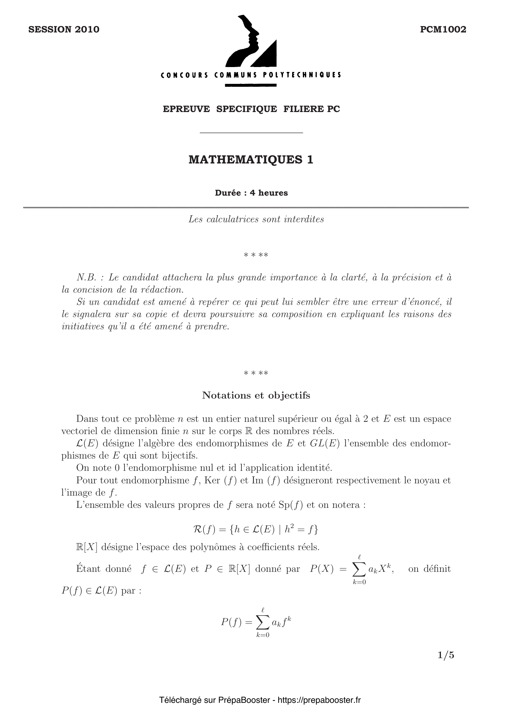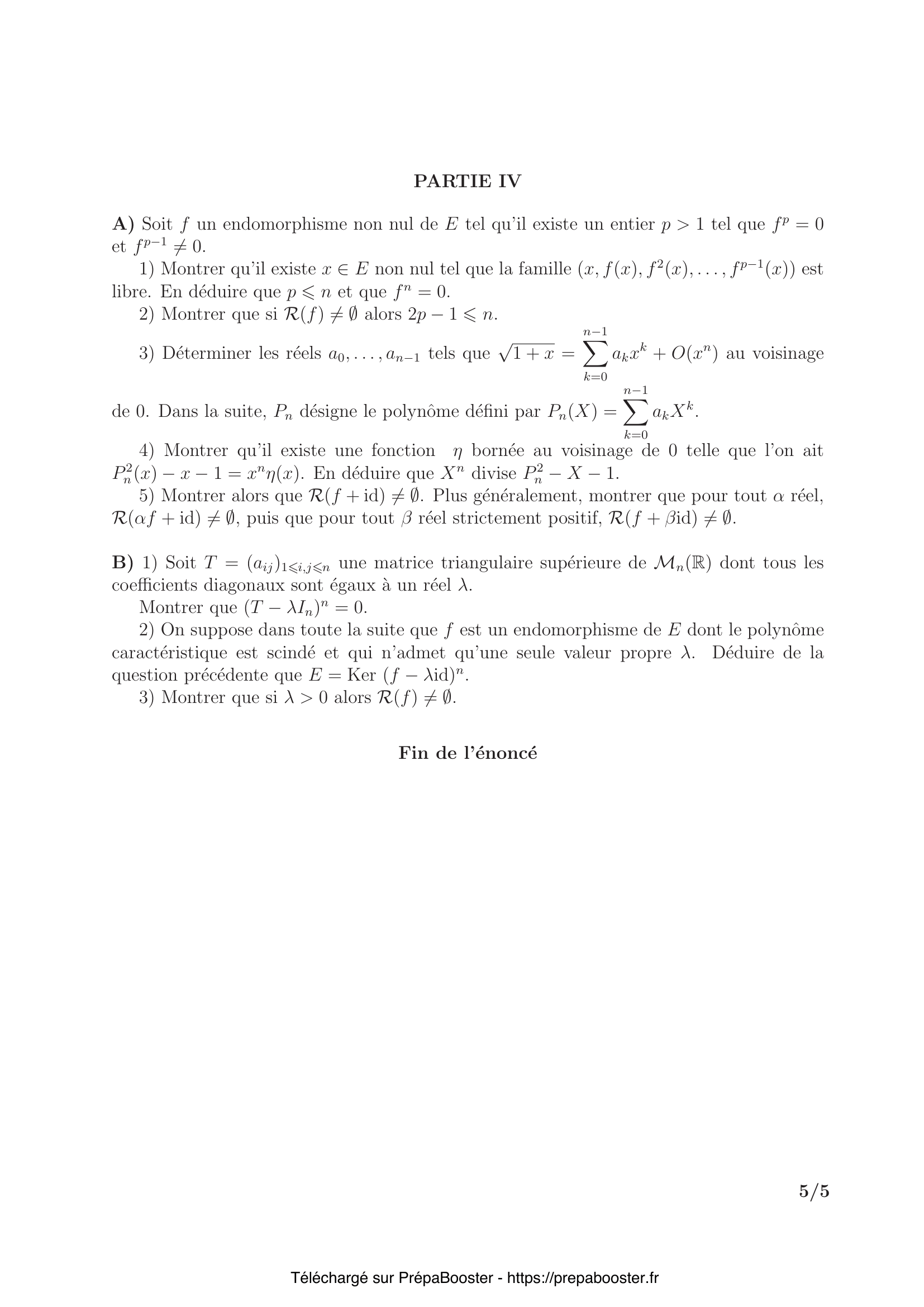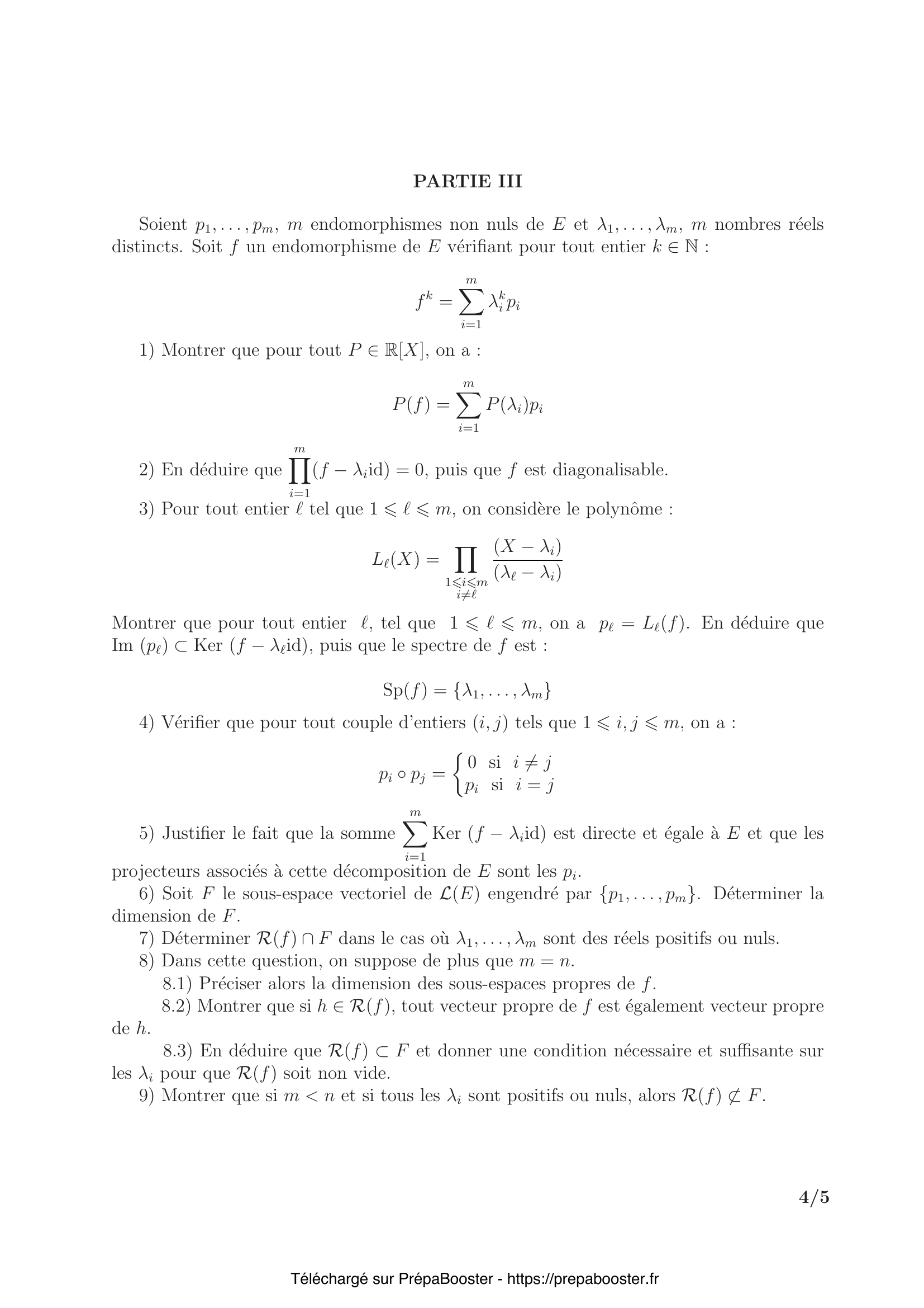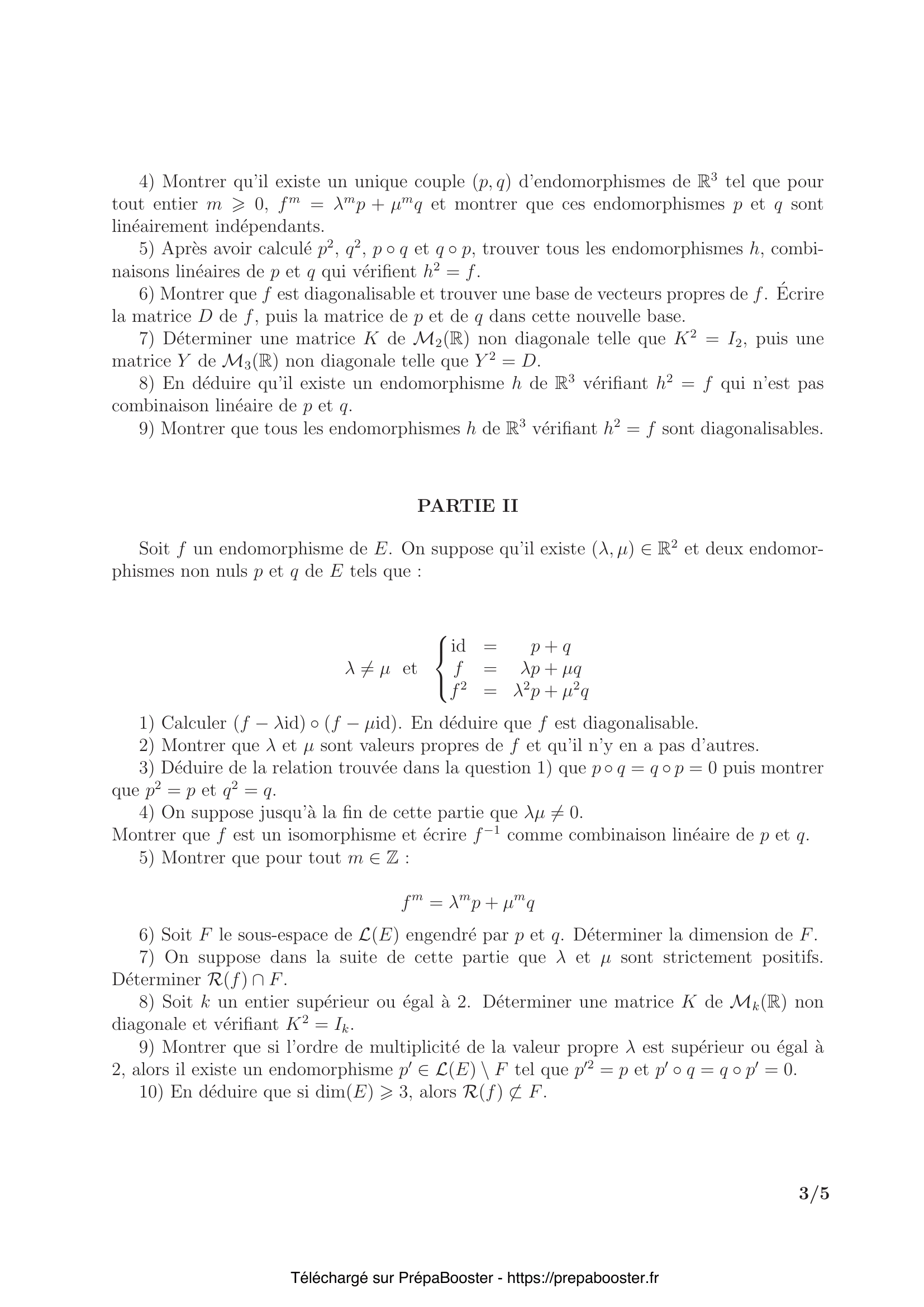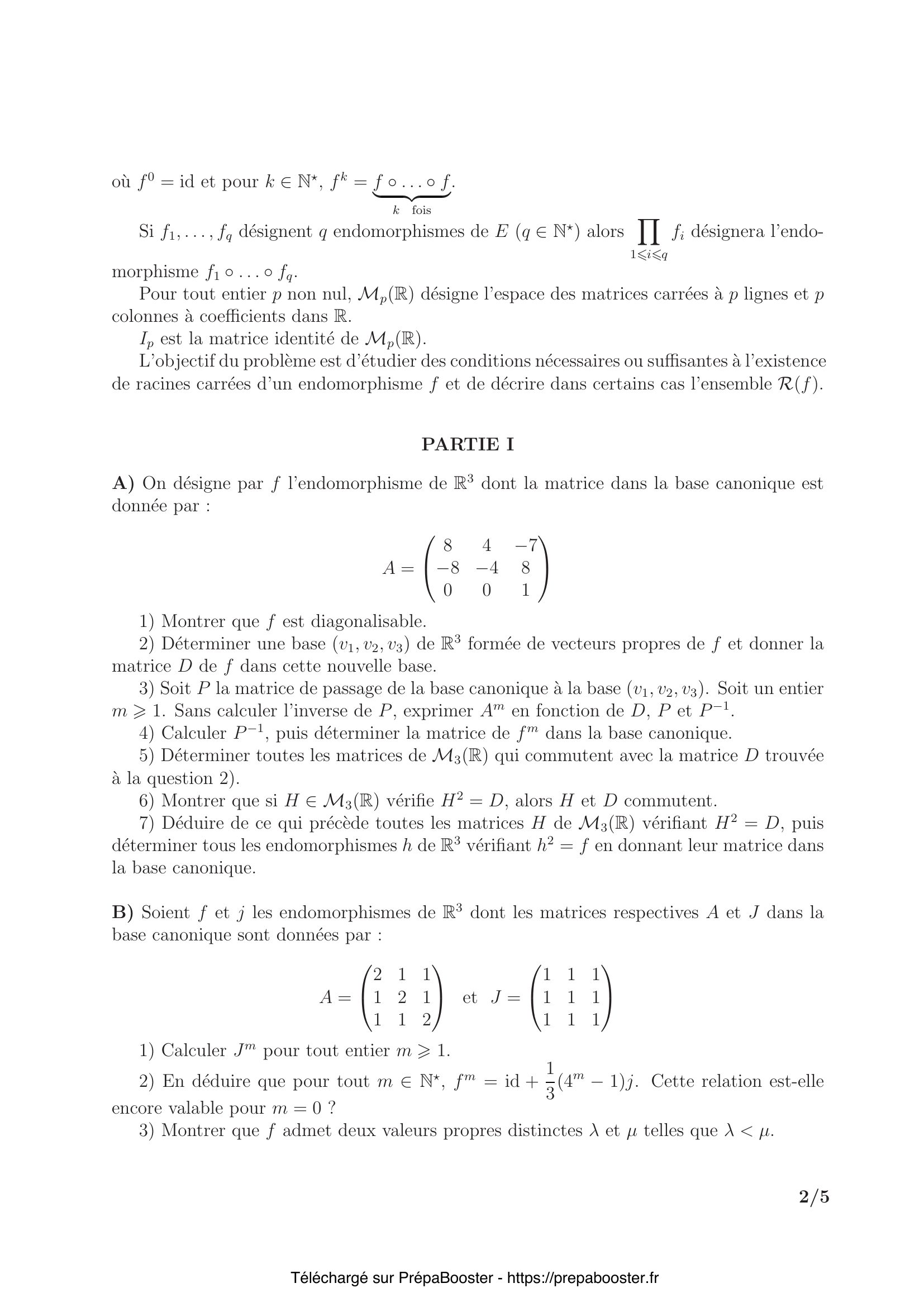 1. Montrer que f est diagonalisable. 2. Déterminer une base $(v_1, v_2, v_3)$ de $\mathbb{R}^3$ formée de vecteurs propres de $f$ et donner la matrice $D$ de $f$ dans cette nouvelle base. 3. Soit $P$ la matrice de passage de la base canonique à la base $(v_1, v_2, v_3)$. Soit un entier $m>1$. Sans calculer l’inverse de $P$, exprimer $A^m$ en fonction de $D$, $P$ et $P^{-1}$. 4. Calculer $P^{-1}$, puis déterminer la matrice de $f^m$ dans la base canonique. 5. Déterminer toutes les matrices de $M_3(\mathbb{R})$ qui commutent avec la matrice $D$ trouvée à la question 2).} 6. Montrer que si $H\in M_3(\mathbb{R})$ vérifie $H^2 = D$ alors $H$ et $D$ commutent. 7. Déduire de ce qui précède toutes les matrices $H$ de $M_3(\mathbb{R})$ vérifiant $H^2 = D$, puis déterminer tous les endomorphismes $h$ de $\mathbb{R}^3$ vérifiant $h^2 = f$ en donnant leur matrice dans la base canonique. 8. Calculer $J^m$ pour tout entier $m>1$. 9. En déduire que pour tout $m\in\mathbb{N}^*$, $f^m = \text{id} + \frac{1}{3}(4^m – 1)j$. Cette relation est-elle encore valable pour $m = 0$ ? 10. Montrer que $f$ admet deux valeurs propres distinctes $\lambda$ et $\mu$ telles que $\lambda < \mu$.} 11. Montrer qu’il existe un unique couple $(p, q)$ d’endomorphismes de $\mathbb{R}^3$ tel que pour tout entier $m > 0$, $f^m = \lambda^m p + \mu^m q$ et montrer que ces endomorphismes $p$ et $q$ sont linéairement indépendants. 12. Après avoir calculé $p^2$, $q^2$, $p\circ q$ et $q\circ p$, trouver tous les endomorphismes $h$, combinaisons linéaires de $p$ et $q$ qui vérifient $h^2 = f$. 13. Montrer que $f$ est diagonalisable et trouver une base de vecteurs propres de $f$. Écrire la matrice $D$ de $f$, puis la matrice de $p$ et de $q$ dans cette nouvelle base. 14. Déterminer une matrice $K$ de $M_2(\mathbb{R})$ non diagonale telle que $K^2=I_2$, puis une matrice $Y$ de $M_3(\mathbb{R})$ non diagonale telle que $Y^2=D$. 15. En déduire qu’il existe un endomorphisme $h$ de $\mathbb{R}^3$ vérifiant $h^2 = f$ qui n’est pas combinaison linéaire de $p$ et $q$.} 16. Montrer que tous les endomorphismes $h$ de $\mathbb{R}^3$ vérifiant $h^2=f$ sont diagonalisables. 17. Calculer $(f – \lambda\text{id})\circ(f – \mu\text{id})$. En déduire que $f$ est diagonalisable. 18. Montrer que $\lambda$ et $\mu$ sont valeurs propres de $f$ et qu’il n’y en a pas d’autres. 19. Déduire de la relation trouvée dans la question 1) que $p\circ q = q\circ p = 0$ puis montrer que $p^2 = p$ et $q^2 = q$. 20. On suppose jusqu’à la fin de cette partie que $\lambda\mu \ne 0$. Montrer que $f$ est un isomorphisme et écrire $f^{-1}$ comme combinaison linéaire de $p$ et $q$.} 21. Montrer que pour tout $m\in\mathbb{Z}$: $f^m = \lambda^m p + \mu^m q$. 22. Soit $F$ le sous-espace de $L(E)$ engendré par $p$ et $q$. Déterminer la dimension de $F$. 23. On suppose dans la suite de cette partie que $\lambda$ et $\mu$ sont strictement positifs. Déterminer $R(f)\cap F$. 24. Soit $k$ un entier supérieur ou égal à $2$. Déterminer une matrice $K$ de $M_k(\mathbb{R})$ non diagonale et vérifiant $K^2 = I_k$. 25. Montrer que si l’ordre de multiplicité de la valeur propre $\lambda$ est supérieur ou égal à $2$, alors il existe un endomorphisme $p’ \in L(E)\setminus F$ tel que ${p’}^2=p$ et $p’\circ q = q\circ p’ = 0$.} 26. En déduire que si $\dim(E) > 3$, alors $R(f)\not\subset F$. 27. Montrer que pour tout $P \in \mathbb{R}[X]$, on a: $P(f) = \sum_{i=1}^m P(\lambda_i)p_i$. 28. En déduire que $\prod_{i=1}^m (f-\lambda_i\text{id}) = 0$, puis que $f$ est diagonalisable. 29. Pour tout entier $\ell$ tel que $1 \leq \ell \leq m$, on considère le polynôme $L_\ell(X) = \prod_{\substack{1\leq i \leq m \\ i\neq\ell}} \frac{X-\lambda_i}{\lambda_\ell-\lambda_i}$. Montrer que pour tout entier $\ell$ tel que $1\leq \ell \leq m$, on a $p_\ell = L_\ell(f)$. En déduire que $\mathrm{Im}(p_\ell)\subset\ker(f-\lambda_\ell\text{id})$, puis que le spectre de $f$ est $Sp(f) = \{\lambda_1, \dots, \lambda_m\}$. 30. Vérifier que pour tout couple d’entiers $(i,j)$ tels que $1\leq i,j\leq m$, on a $p_i\circ p_j = \left\{ \begin{array}{ll} 0 & \mbox{si } i \neq j \\ p_i & \mbox{si } i = j \end{array} \right.$} 31. Justifier le fait que la somme $\sum_{i=1}^m \ker(f-\lambda_i\text{id})$ est directe et égale à $E$ et que les projecteurs associés à cette décomposition de $E$ sont les $p_i$. 32. Soit $F$ le sous-espace vectoriel de $L(E)$ engendré par $\{p_1,\dots,p_m\}$. Déterminer la dimension de $F$. 33. Déterminer $R(f)\cap F$ dans le cas où $\lambda_1,\dots,\lambda_m$ sont des réels positifs ou nuls. 34. Dans cette question, on suppose de plus que $m=n$. 35. Préciser alors la dimension des sous-espaces propres de $f$.} 36. Montrer que si $h \in R(f)$, tout vecteur propre de $f$ est également vecteur propre de $h$. 37. En déduire que $R(f) \subset F$ et donner une condition nécessaire et suffisante sur les $\lambda_i$ pour que $R(f)$ soit non vide. 38. Montrer que si $m < n$ et si tous les $\lambda_i$ sont positifs ou nuls, alors $R(f)\not\subset F$. 39. Montrer qu’il existe $x \in E$ non nul tel que la famille $(x, f(x), f^2(x), \ldots, f^{p-1}(x))$ est libre. En déduire que $p \leq n$ et que $f^n = 0$. 40. Montrer que si $R(f) \neq \emptyset$ alors $2p - 1 \leq n$.} 41. Déterminer les réels $a_0, \dots, a_{n-1}$ tels que $\sqrt{1+x} = \sum_{k=0}^{n-1} a_k x^k + O(x^n)$ au voisinage de 0. Dans la suite, $P_n$ désigne le polynôme défini par $P_n(X) = \sum_{k=0}^{n-1} a_k X^k$. 42. Montrer qu’il existe une fonction $\eta$ bornée au voisinage de 0 telle que l’on ait $P_n^2(x) - x - 1 = x^n \eta(x)$. En déduire que $X^n$ divise $P_n^2 - X - 1$. 43. Montrer alors que $R(f + \text{id}) \neq \emptyset$. Plus généralement, montrer que pour tout $\alpha$ réel, $R(\alpha f + \text{id}) \neq \emptyset$, puis que pour tout $\beta$ réel strictement positif, $R(f + \beta \text{id}) \neq \emptyset$. 44. Soit $T = 