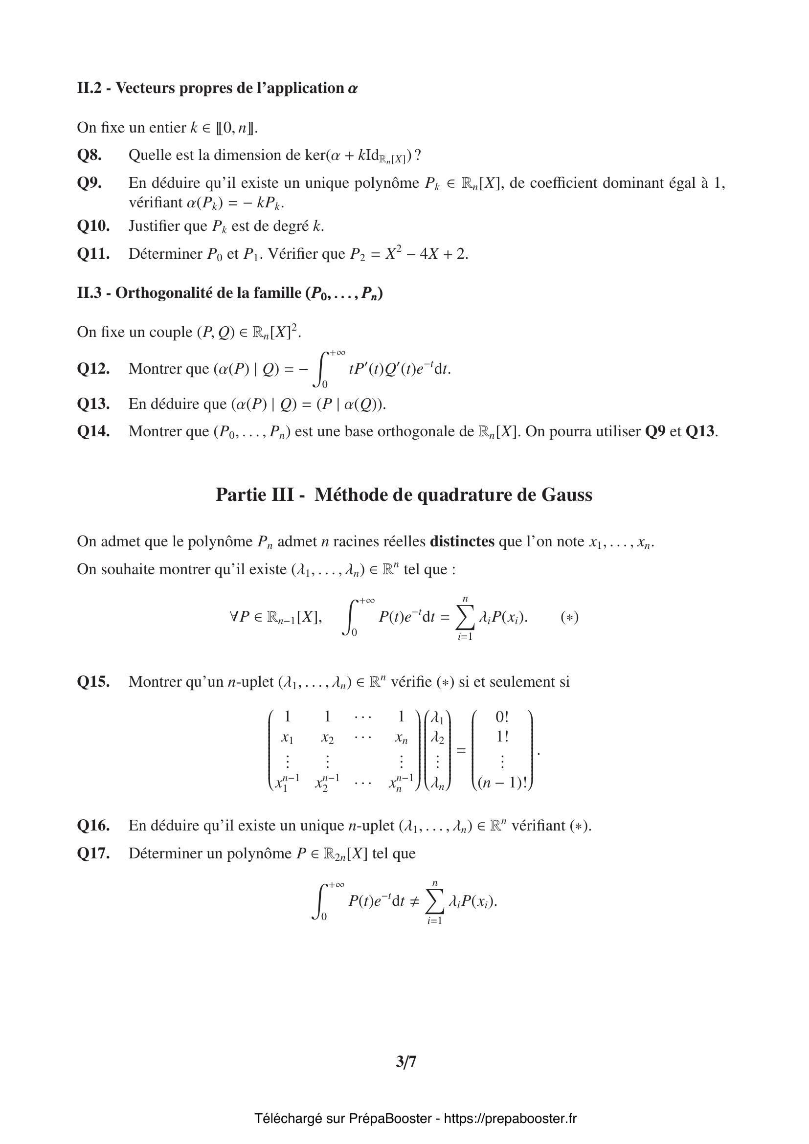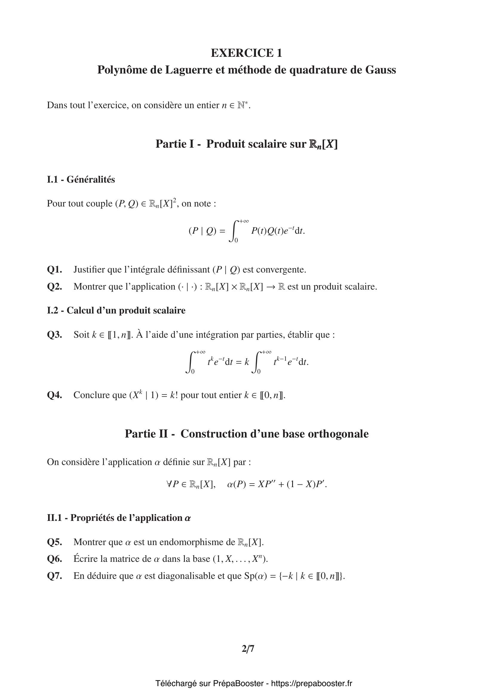 Pour aborder ce type de question, il est crucial de vérifier en détail les trois propriétés du produit scalaire : bilinéarité, symétrie, et positivité. Sur R_n[X], cela demande de bien manier les intégrales, notamment en présence de fonctions poids comme l’exponentielle décroissante. Pour gagner des points, pense à donner les détails du calcul et à justifier la convergence des intégrales, car c’est souvent attendu au concours.