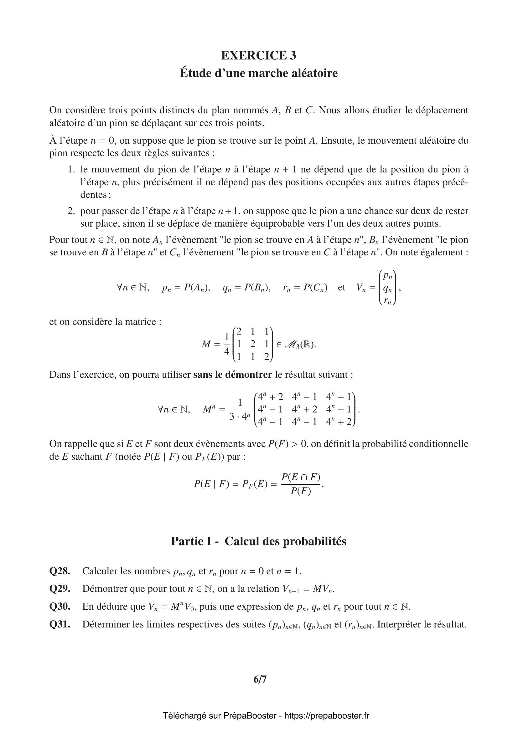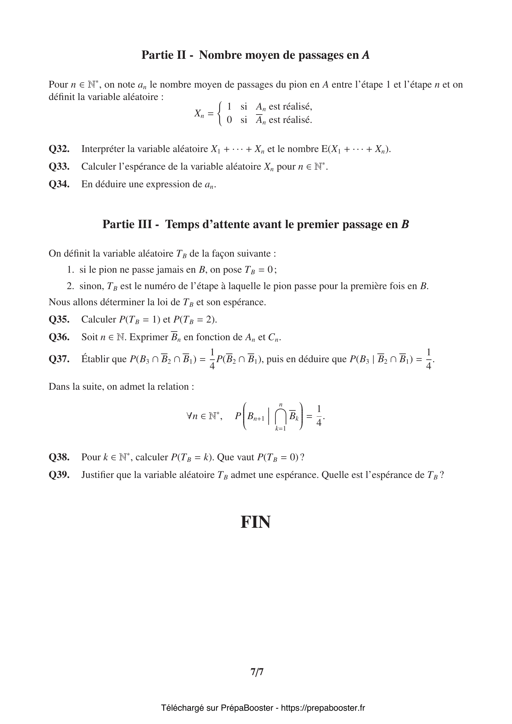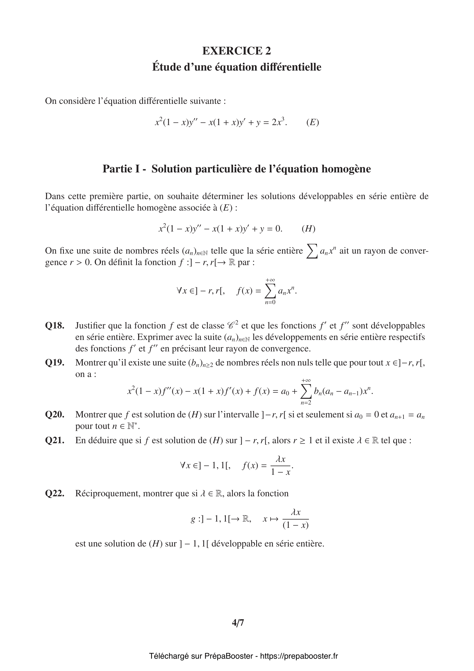 1. Justifier que l’intégrale définissant (P | Q) est convergente. 2. Montrer que l’application (·|·) : R_n[X] \times R_n[X] \to \mathbb{R} est un produit scalaire. 3. Soit k \in \llbracket 1, n \rrbracket. À l’aide d’une intégration par parties, établir que : \[\int_{0}^{+\infty} t^{k} e^{-t} dt = k \int_{0}^{+\infty} t^{k-1} e^{-t} dt.\] 4. Conclure que (X^k | 1) = k! pour tout entier \(k \in \llbracket 0, n \rrbracket\). 5. Montrer que \(\alpha\) est un endomorphisme de \(\mathbb{R}_n[X]\).} 6. Écrire la matrice de \(\alpha\) dans la base \((1, X, \ldots, X^n)\). 7. En déduire que \(\alpha\) est diagonalisable et que \(Sp(\alpha) = \{-k \mid k \in \llbracket 0, n \rrbracket\}\). 8. Quelle est la dimension de \(\ker(\alpha + k \, Id_{\mathbb{R}_n[X]})\) ? 9. En déduire qu’il existe un unique polynôme \(P_k \in \mathbb{R}_n[X]\), de coefficient dominant égal à 1, vérifiant \(\alpha(P_k) = -kP_k\). 10. Justifier que \(P_k\) est de degré \(k\).} 11. Déterminer \(P_0\) et \(P_1\). Vérifier que \(P_2 = X^2 – 4X + 2\). 12. Montrer que \((\alpha(P) | Q) = – \int_{0}^{+\infty} t P'(t) Q'(t) e^{-t} dt\). 13. En déduire que \((\alpha(P) | Q) = (P | \alpha(Q))\). 14. Montrer que \((P_0, \ldots, P_n)\) est une base orthogonale de \(\mathbb{R}_n[X]\). On pourra utiliser Q9 et Q13. 15. Montrer qu’un n-uplet \((\lambda_1, \ldots, \lambda_n) \in \mathbb{R}^n\) vérifie (*) si et seulement si \[ \begin{pmatrix} 1 & 1 & \cdots & 1 \\ x_1 & x_2 & \cdots & x_n \\ \vdots & \vdots & & \vdots \\ x_1^{n-1} & x_2^{n-1} & \cdots & x_n^{n-1} \end{pmatrix} \begin{pmatrix} \lambda_1 \\ \lambda_2 \\ \vdots \\ \lambda_n \end{pmatrix} = \begin{pmatrix} 0! \\ 1! \\ \vdots \\ (n-1)! \end{pmatrix} \] } 16. En déduire qu’il existe un unique n-uplet \((\lambda_1, \ldots, \lambda_n) \in \mathbb{R}^n\) vérifiant (*). 17. Déterminer un polynôme \(P \in \mathbb{R}_{2n}[X]\) tel que \[ \int_{0}^{+\infty} P(t) e^{-t} dt \neq \sum_{i=1}^{n} \lambda_i P(x_i). \] 18. Justifier que la fonction \(f\) est de classe \(C^2\) et que les fonctions \(f’\) et \(f”\) sont développables en série entière. Exprimer avec la suite \((a_n)_{n\in\mathbb{N}}\) les développements en série entière respectifs des fonctions \(f’\) et \(f”\) en précisant leur rayon de convergence. 19. Montrer qu’il existe une suite \((b_n)_{n\geq 2}\) de nombres réels non nuls telle que pour tout \(x \in ]-r, r[\), on a : \[ x^2(1-x) f”(x) – x(1+x) f'(x) + f(x) = a_0 + \sum_{n=2}^{+\infty} b_n (a_n – a_{n-1}) x^n. \] 20. Montrer que \(f\) est solution de (H) sur l’intervalle \(]-r, r[\) si et seulement si \(a_0 = 0\) et \(a_{n+1} = a_n\) pour tout \(n \in \mathbb{N}^*\).} 21. En déduire que si \(f\) est solution de (H) sur \(]-r, r[\), alors \(r \geq 1\) et il existe \(\lambda \in \mathbb{R}\) tel que : \[ \forall x \in ]-1, 1[, \quad f(x) = \frac{\lambda x}{1-x}. \] 22. Réciproquement, montrer que si \(\lambda \in \mathbb{R}\), alors la fonction \[ g : ]-1, 1[ \to \mathbb{R}, \quad x \mapsto \frac{\lambda x}{1-x} \] est une solution de (H) sur \(]-1, 1[\) développable en série entière. 23. Justifier que \(z\) est de classe \(C^2\) sur l’intervalle \(I\), puis exprimer \(z’\) et \(z”\) avec \(y\), \(y’\) et \(y”\). 24. Montrer que \(y\) est solution de (E) sur \(I\) si et seulement si \(z\) est solution sur \(I\) de l’équation différentielle : \[ x z” + z’ = 2x. \quad (E_1) \] 25. Montrer que si \(z\) est solution de \((E_1)\) sur \(I\), alors il existe \(\lambda \in \mathbb{R}\) tel que : \[ \forall x \in I,\quad z'(x) = \frac{\lambda}{x} + x. \]} 26. En déduire l’ensemble des solutions de l’équation différentielle (E) sur \(I\). 27. Déterminer l’ensemble des solutions de l’équation différentielle (E) sur \(]0, +\infty[\). 28. Calculer les nombres \(p_n\), \(q_n\) et \(r_n\) pour \(n = 0\) et \(n = 1\). 29. Démontrer que pour tout \(n \in \mathbb{N}\), on a la relation \(V_{n+1} = MV_n\). 30. En déduire que \(V_n = M^n V_0\), puis une expression de \(p_n\), \(q_n\) et \(r_n\) pour tout \(n \in \mathbb{N}\).} 31. Déterminer les limites respectives des suites \((p_n)_{n\in\mathbb{N}}, (q_n)_{n\in\mathbb{N}}\) et \((r_n)_{n\in\mathbb{N}}\). Interpréter le résultat. 32. Interpréter la variable aléatoire \(X_1 + \cdots + X_n\) et le nombre \(\mathbb{E}(X_1 + \cdots + X_n)\). 33. Calculer l’espérance de la variable aléatoire \(X_n\) pour \(n \in \mathbb{N}^*\). 34. En déduire une expression de \(a_n\). 35. Calculer \(P(T_B = 1)\) et \(P(T_B = 2)\).} 36. Soit \(n \in \mathbb{N}\). Exprimer \(B_n\) en fonction de \(A_n\) et \(C_n\). 37. Établir que \(P(B_3 \cap B_2 \cap B_1) = \frac{1}{4} P(B_2 \cap B_1)\), puis en déduire que \(P(B_3 \mid B_2 \cap B_1) = \frac{1}{4}\). 38. Pour \(k \in \mathbb{N}^*\), calculer \(P(T_B = k)\). Que vaut \(P(T_B = 0)\) ? 39. Justifier que la variable aléatoire \(T_B\) admet une espérance. Quelle est l’espérance de \(T_B\) ?}FAQ