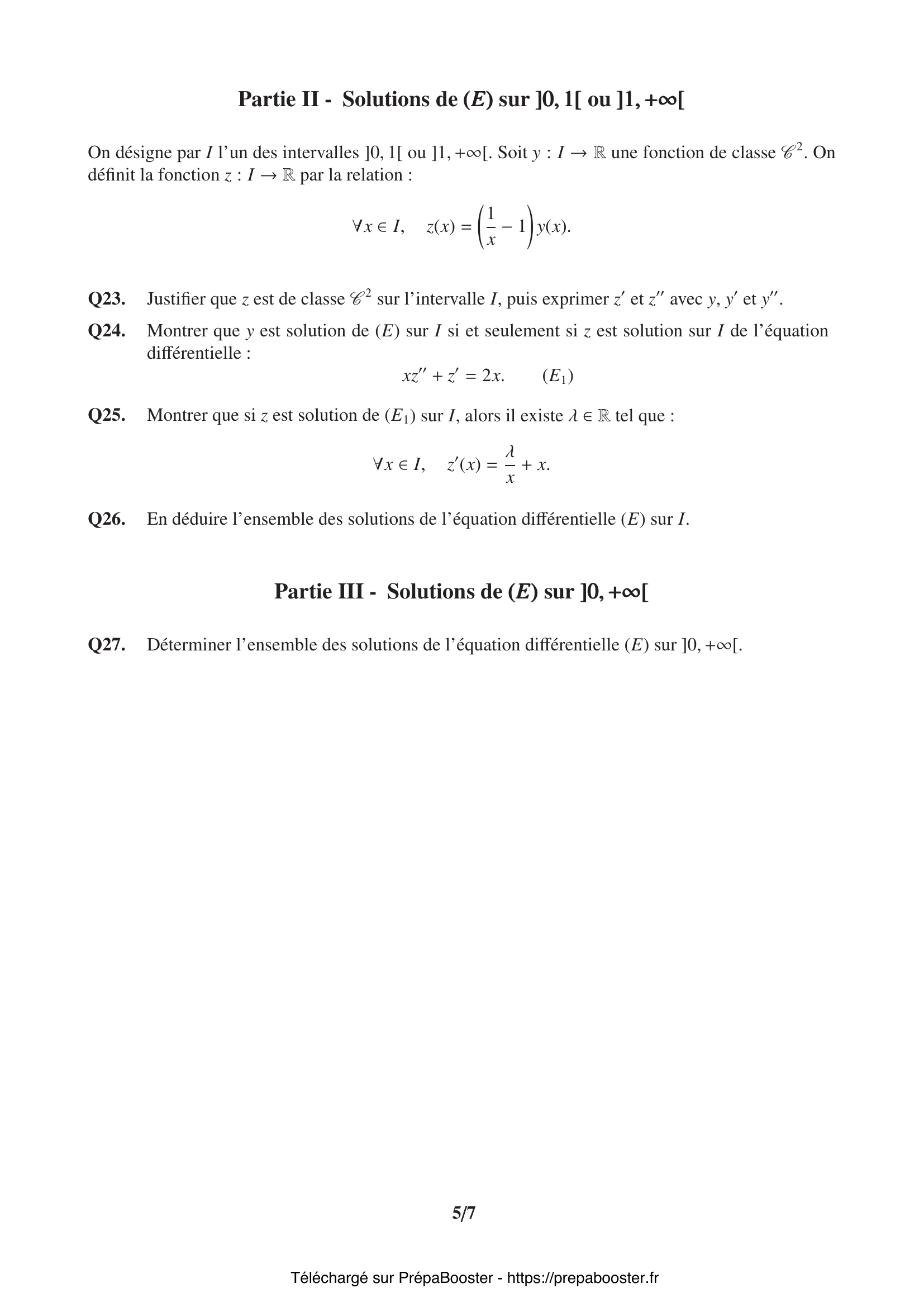 Au concours, quand tu vois une équation différentielle linéaire, commence toujours par vérifier le type (à coefficients constants ou non, homogène ou non). Applique la méthode classique en cherchant d’abord la solution générale de l’équation homogène, puis une solution particulière si besoin. Pense à regarder les changements de variable judicieux qu’on peut te proposer, comme ceux du sujet, qui simplifient souvent drastiquement le problème. Enfin, sois rigoureux sur les domaines de définition et la régularité des solutions.