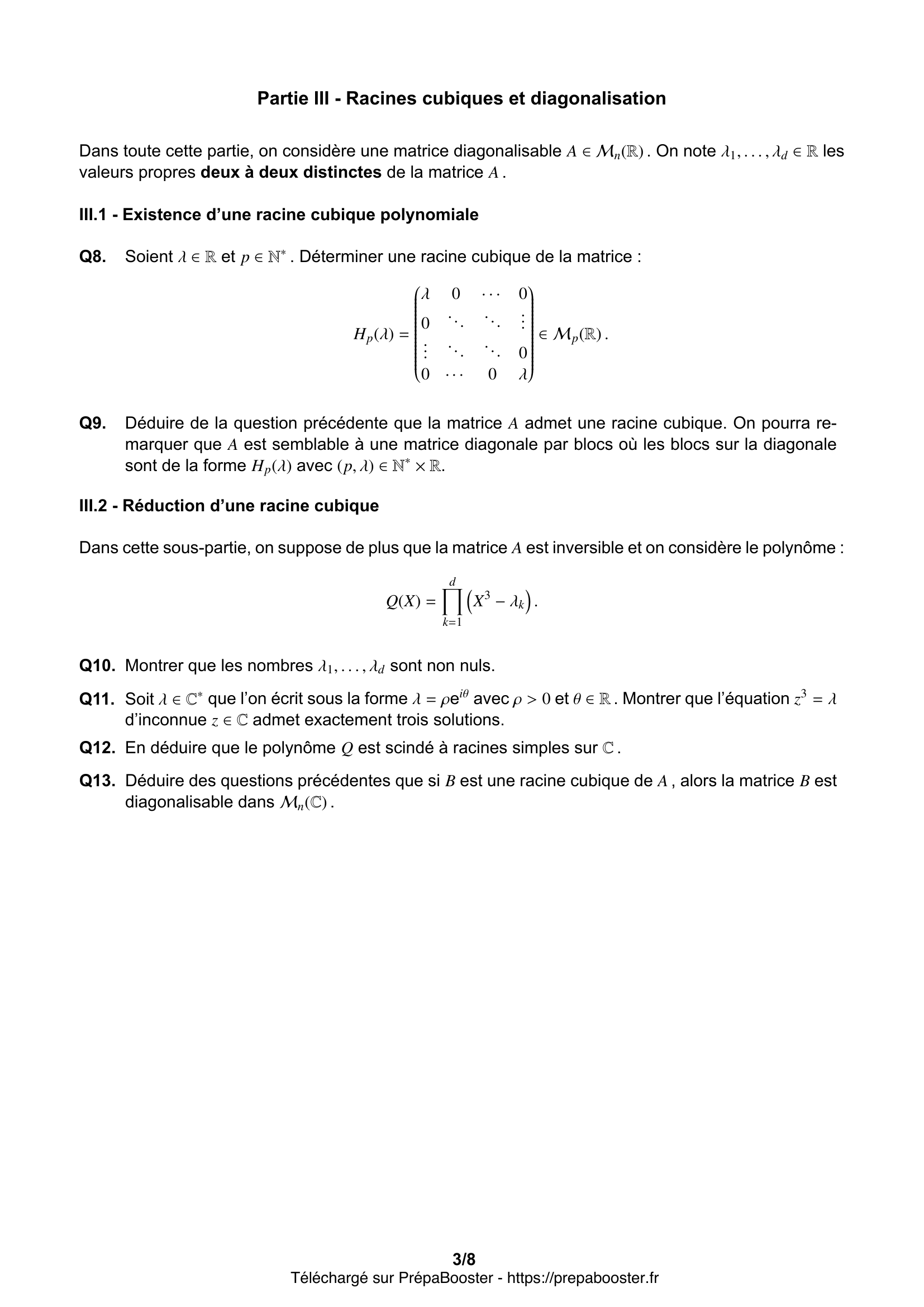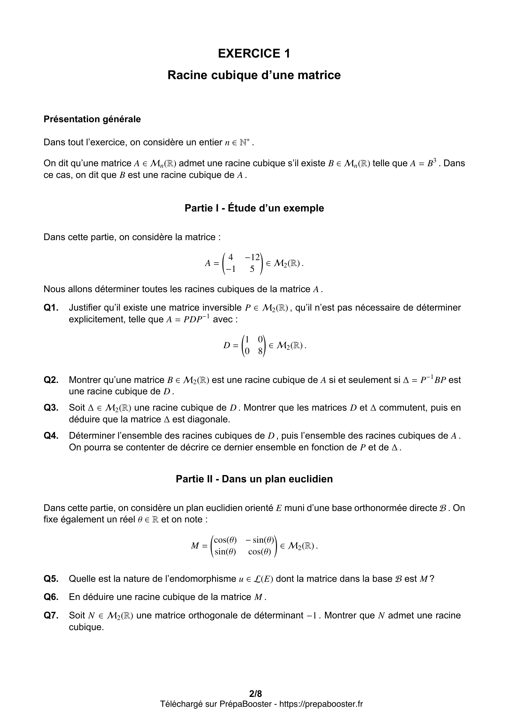 Le sujet aborde fortement la diagonalisation de matrices, la recherche de racines d’endomorphismes, et la notion de matrices semblables. Il est fondamental de connaître le lien entre formes diagonales et calculs de puissances ou racines de matrices, ainsi que la manipulation de la base de passage (changements de base, calculs liés à la matrice de passage P, etc.). Attention : la compréhension profonde de la commutativité, du spectre, et des propriétés de matrices diagonales est attendue par le jury à ce niveau. Pour maîtriser ces points et t’entraîner sur des exercices, pense à débloquer les corrigés complets sur Prépa Booster !
