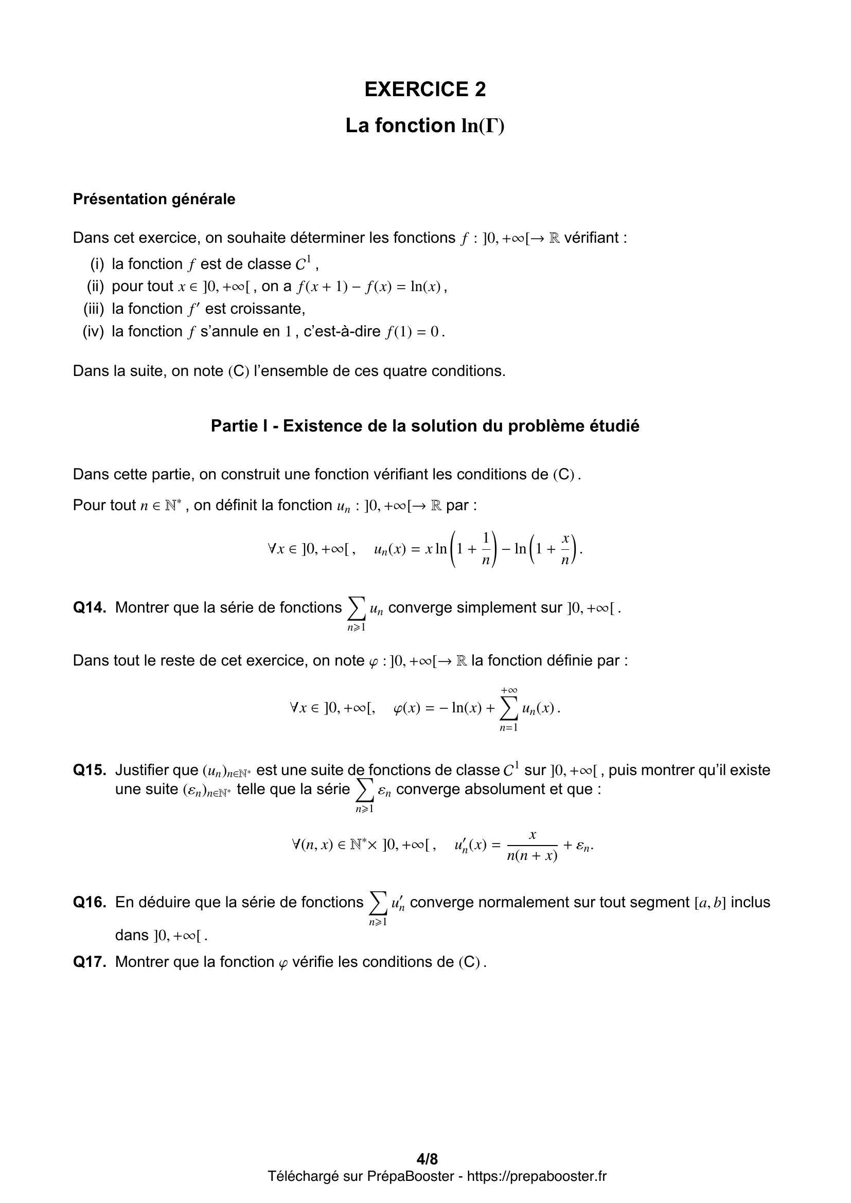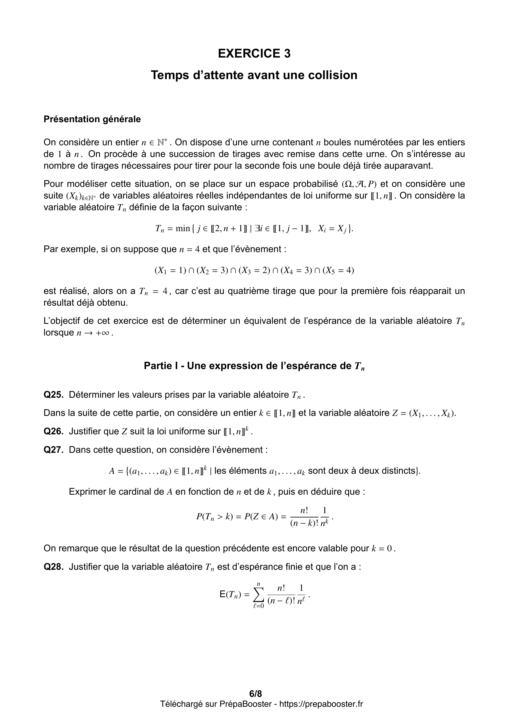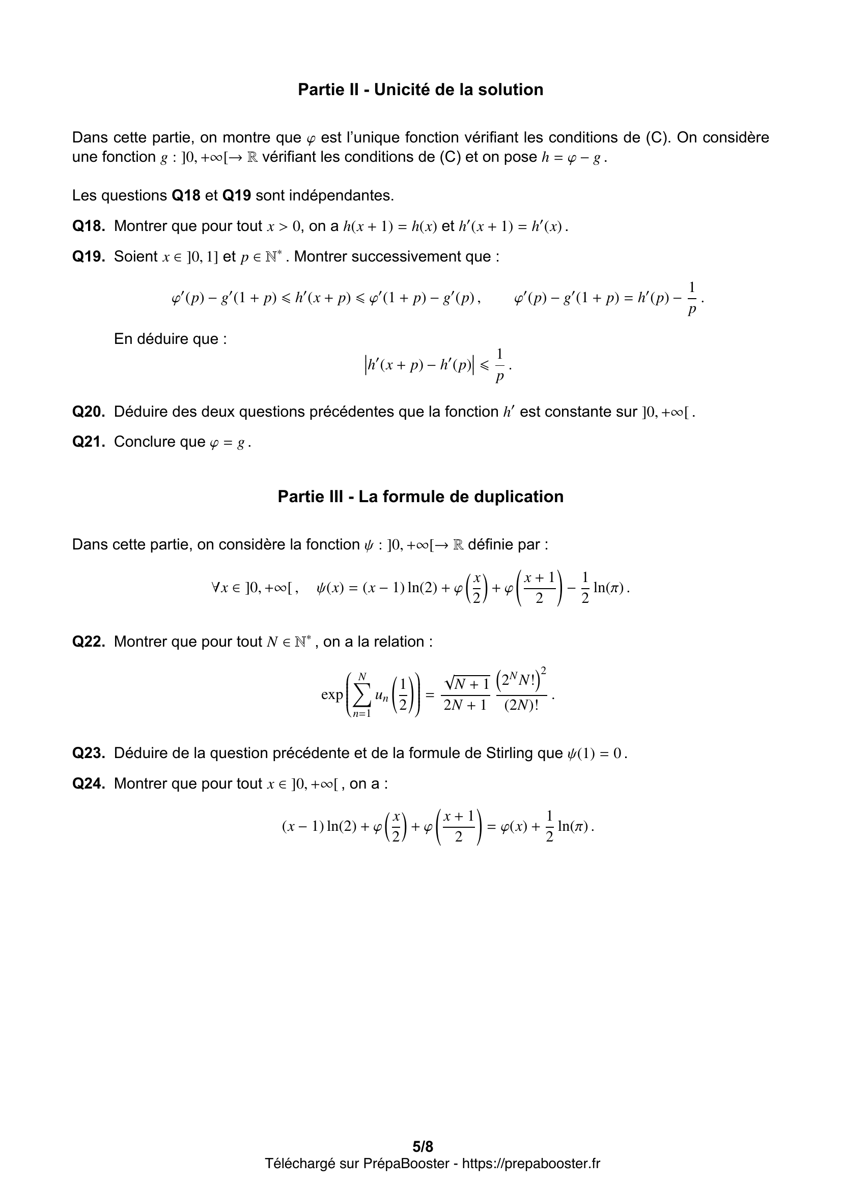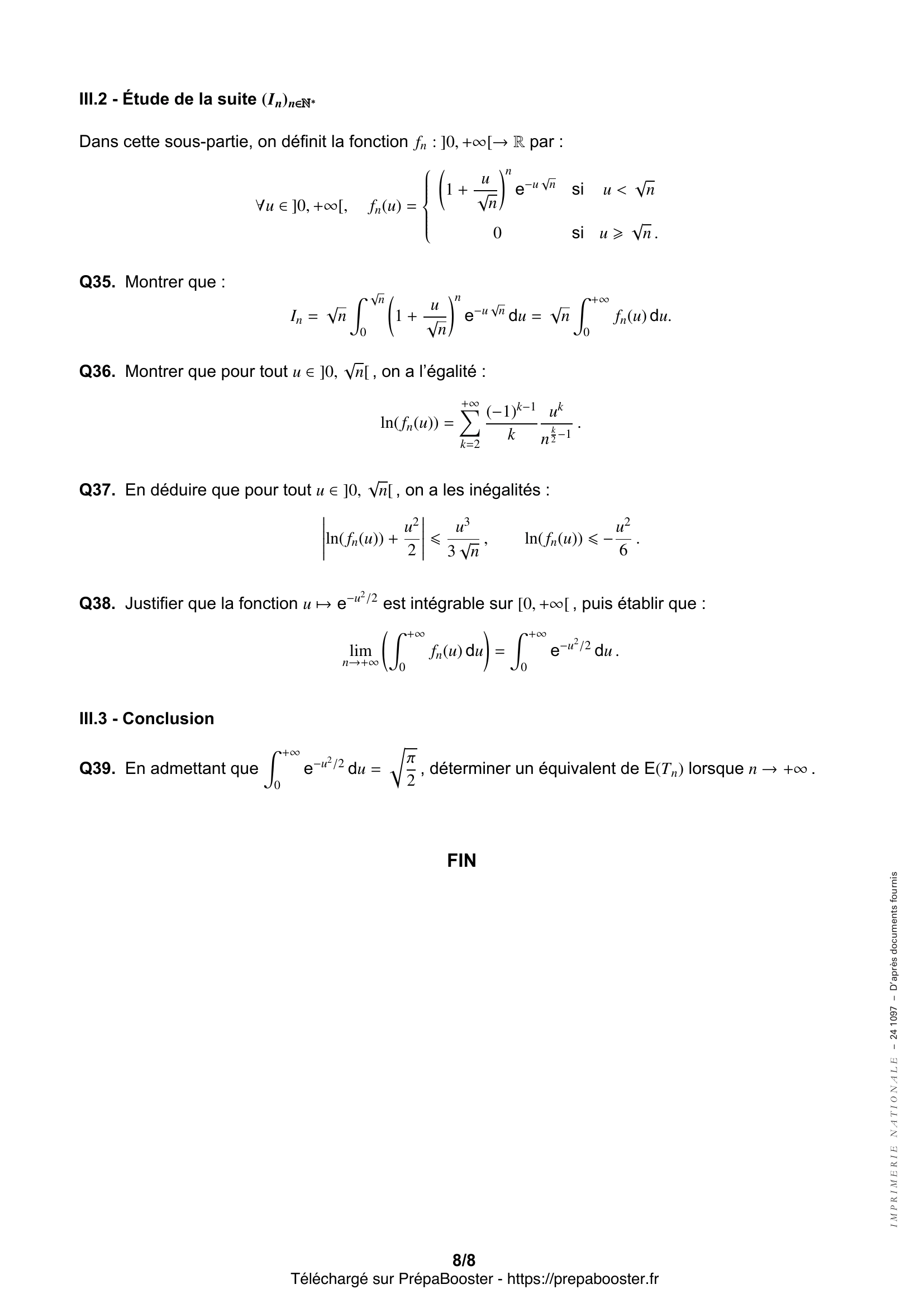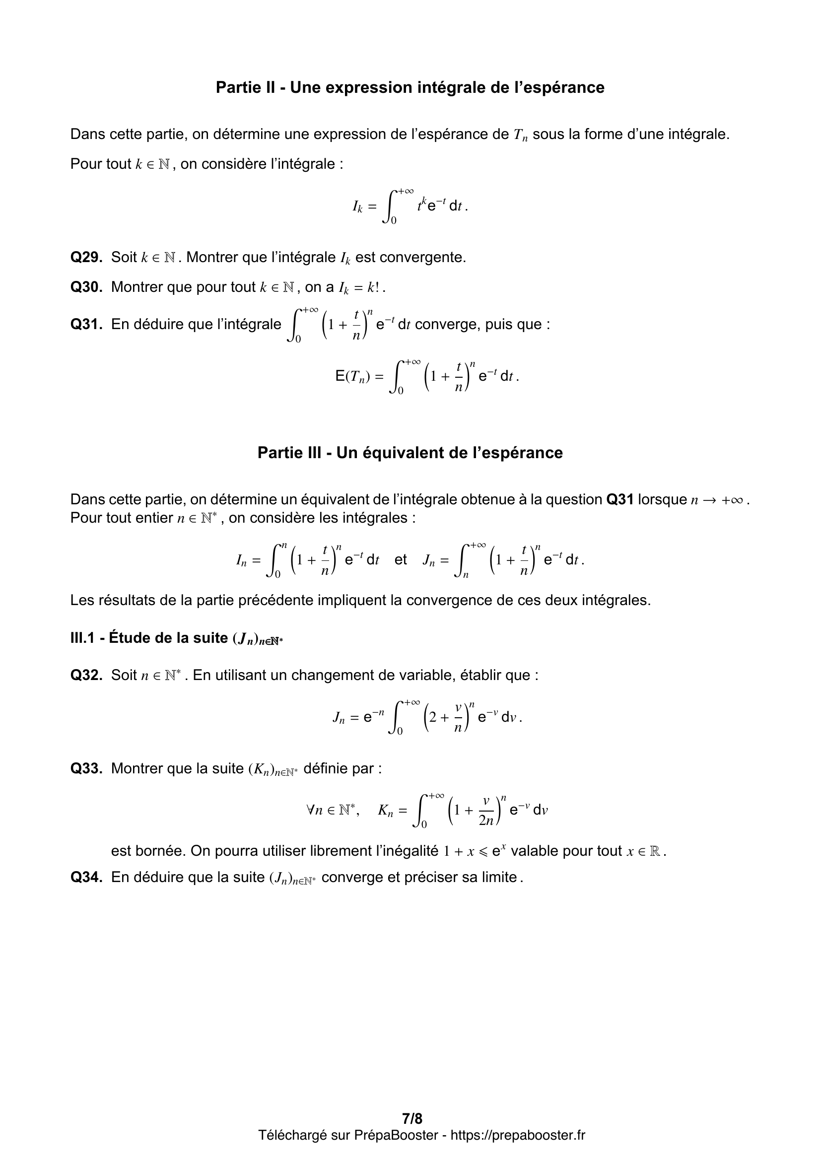 1. Justifier qu’il existe une matrice inversible $P \in M_2(\mathbb{R})$, qu’il n’est pas nécessaire de déterminer explicitement, telle que $A = PDP^{-1}$ avec : $$ D = \begin{pmatrix} 1 & 0 \\ 0 & 8 \end{pmatrix} \in M_2(\mathbb{R}). $$ 2. Montrer qu’une matrice $B \in M_2(\mathbb{R})$ est une racine cubique de $A$ si et seulement si $\Delta = P^{-1}BP$ est une racine cubique de $D$. 3. Soit $\Delta \in M_2(\mathbb{R})$ une racine cubique de $D$. Montrer que les matrices $D$ et $\Delta$ commutent, puis en déduire que la matrice $\Delta$ est diagonale. 4. Déterminer l’ensemble des racines cubiques de $D$, puis l’ensemble des racines cubiques de $A$. On pourra se contenter de décrire ce dernier ensemble en fonction de $P$ et de $\Delta$. 5. Quelle est la nature de l’endomorphisme $u \in \mathcal{L}(E)$ dont la matrice dans la base $\mathcal{B}$ est $M$ ?} 6. En déduire une racine cubique de la matrice $M$. 7. Soit $N \in M_2(\mathbb{R})$ une matrice orthogonale de déterminant $-1$. Montrer que $N$ admet une racine cubique. 8. Soient $\lambda \in \mathbb{R}$ et $p \in \mathbb{N}^*$. Déterminer une racine cubique de la matrice : $$ H_p(\lambda) = \begin{pmatrix} \lambda & 0 & \cdots & 0\\ 0 & \ddots & & \vdots\\ \vdots & & \ddots & 0 \\ 0 & \cdots & 0 & \lambda \end{pmatrix} \in M_p(\mathbb{R}). $$ 9. Déduire de la question précédente que la matrice $A$ admet une racine cubique. On pourra remarquer que $A$ est semblable à une matrice diagonale par blocs où les blocs sur la diagonale sont de la forme $H_p(\lambda)$ avec $(p, \lambda) \in \mathbb{N}^* \times \mathbb{R}$. 10. Montrer que les nombres $\lambda_1,…,\lambda_d$ sont non nuls.} 11. Soit $\lambda \in \mathbb{C}^*$ que l’on écrit sous la forme $\lambda = \rho e^{i\theta}$ avec $\rho > 0$ et $\theta \in \mathbb{R}$. Montrer que l’équation $z^3 = \lambda$ d’inconnue $z \in \mathbb{C}$ admet exactement trois solutions. 12. En déduire que le polynôme $Q$ est scindé à racines simples sur $\mathbb{C}$. 13. Déduire des questions précédentes que si $B$ est une racine cubique de $A$, alors la matrice $B$ est diagonalisable dans $M_n(\mathbb{C})$. 14. Montrer que la série de fonctions $\sum_{n\geq1} u_n$ converge simplement sur $]0, +\infty[$. 15. Justifier que $(u_n)_{n\in\mathbb{N}^*}$ est une suite de fonctions de classe $C^1$ sur $]0, +\infty[$, puis montrer qu’il existe une suite $(\varepsilon_n)_{n\in\mathbb{N}^*}$ telle que la série $\sum_{n\geq1}\varepsilon_n$ converge absolument et que : $$ \forall (n, x) \in \mathbb{N}^* \times ]0, +\infty[, \; u_n'(x) = \frac{x}{n(n + x)} + \varepsilon_n. $$} 16. En déduire que la série de fonctions $\sum_{n\geq1} u_n’$ converge normalement sur tout segment $[a, b]$ inclus dans $]0, +\infty[$. 17. Montrer que la fonction $\varphi$ vérifie les conditions de $(\mathcal{C})$. 18. Montrer que pour tout $x > 0$, on a $h(x + 1) = h(x)$ et $h'(x + 1) = h'(x)$. 19. Soient $x \in ]0, 1]$ et $p \in \mathbb{N}^*$. Montrer successivement que : \\ $\varphi'(p) – g'(1 + p) \leq h'(x + p) \leq \varphi'(1 + p) – g'(p)$, $\varphi'(p) – g'(1 + p) = h'(p) – \frac{1}{p}$. \\ En déduire que : \\ $\left| h'(x + p) – h'(p) \right| \leq \frac{1}{p}$. 20. Déduire des deux questions précédentes que la fonction $h’$ est constante sur $]0, +\infty[$.} 21. Conclure que $\varphi = g$. 22. Montrer que pour tout $N \in \mathbb{N}^*$, on a la relation : $$ \exp\left( \sum_{n=1}^N u_n\left( \frac{1}{2}\right) \right) = \sqrt{\frac{N+1}{2N+1}} \frac{2^{2N} N!^2}{(2N)! }. $$ 23. Déduire de la question précédente et de la formule de Stirling que $\psi(1) = 0$. 24. Montrer que pour tout $x \in ]0, +\infty[$, on a : $$ (x – 1) \ln(2) + \varphi\left(\frac{x}{2}\right) + \varphi\left(\frac{x + 1}{2}\right) = \varphi(x) + \frac{1}{2} \ln(\pi). $$ 25. Déterminer les valeurs prises par la variable aléatoire $T_n$.} 26. Justifier que $Z$ suit la loi uniforme sur $\llbracket 1, n\rrbracket^k$. 27. Dans cette question, on considère l’évènement : $$ A = \{(a_1,…, a_k) \in \llbracket 1, n\rrbracket^k \; | \; \text{les éléments } a_1,…, a_k \text{ sont deux à deux distincts} \}. $$ Exprimer le cardinal de $A$ en fonction de $n$ et de $k$, puis en déduire que : $$ P(T_n > k) = P(Z \in A) = \frac{n!}{(n-k)!} \frac{1}{n^k}. $$ On remarque que le résultat de la question précédente est encore valable pour $k = 0$. 28. Justifier que la variable aléatoire $T_n$ est d’espérance finie et que l’on a : $$ \mathbb{E}(T_n) = \sum_{\ell=0}^n \frac{n!}{(n-\ell)!} \frac{1}{n^\ell}. $$ 29. Soit $k \in \mathbb{N}$. Montrer que l’intégrale $I_k$ est convergente. 30. Montrer que pour tout $k \in \mathbb{N}$, on a $I_k = k!$.} 31. En déduire que l’intégrale $$ \int_0^{+\infty} \left(1 + \frac{t}{n}\right)^n e^{-t} dt $$ converge, puis que : $$ \mathbb{E}(T_n) = \int_0^{+\infty} \left(1 + \frac{t}{n}\right)^n e^{-t} dt. $$ 32. En utilisant un changement de variable, établir que : $$ J_n = e^{-n} \int_0^{+\infty} \left(2 + \frac{v}{n}\right)^n e^{-v} dv. $$ 33. Montrer que la suite $(K_n)_{n\in\mathbb{N}^*}$ définie par : $$ \forall n \in \mathbb{N}^*, \quad K_n = \int_0^{+\infty} \left( 1 + \frac{v}{2n} \right)^n e^{-v} dv $$ est bornée. On pourra utiliser librement l’inégalité $1 + x \leq e^x$ valable pour tout $x \in \mathbb{R}$. 34. En déduire que la suite $(J_n)_{n\in\mathbb{N}^*}$ converge et préciser sa limite. 35. Montrer que : $$ I_n = \sqrt{n} \int_0^{\sqrt{n}} \left( 1 + \frac{u}{\sqrt{n}} \right)^n e^{-u\sqrt{n}} du = \sqrt{n} \int_0^{+\infty} f_n(u) du. $$ } 36. Montrer que pour tout $u \in ]0, \sqrt{n}[$, on a l’égalité : $$ \ln(f_n(u)) = \sum_{k=2}^{+\infty} \frac{(-1)^{k-1}}{k} \frac{u^k}{n^{k/2-1}}. $$ 37. En déduire que pour tout $u \in ]0, \sqrt{n}[$, on a les inégalités : $$ \left| \ln(f_n(u)) + \frac{u^2}{2} \right| \leq \frac{u^3}{3\sqrt{n}}, \quad \ln(f_n(u)) \leq -\frac{u^2}{6}. $$ 38. Justifier que la fonction $u \mapsto e^{-u^2