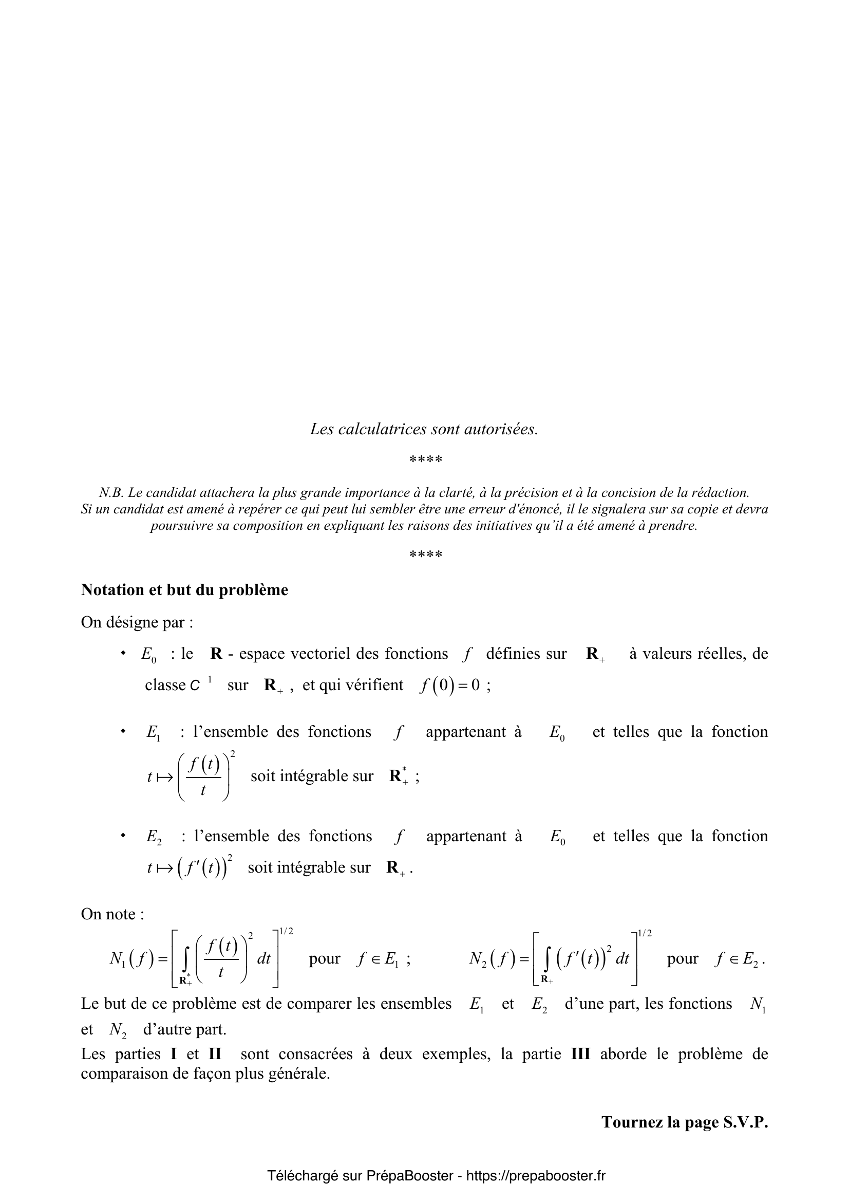 Les espaces fonctionnels E₁ et E₂ sont des ensembles de fonctions définies sur ℝ₊ ou ℝ₊*, munis de conditions d’intégrabilité spécifiques qui jouent un rôle central dans l’étude des intégrales et des normes (N₁, N₂). Savoir caractériser l’appartenance d’une fonction à ces espaces est fondamental pour la résolution du sujet, et représente une compétence transverse du programme de prépa PSI.