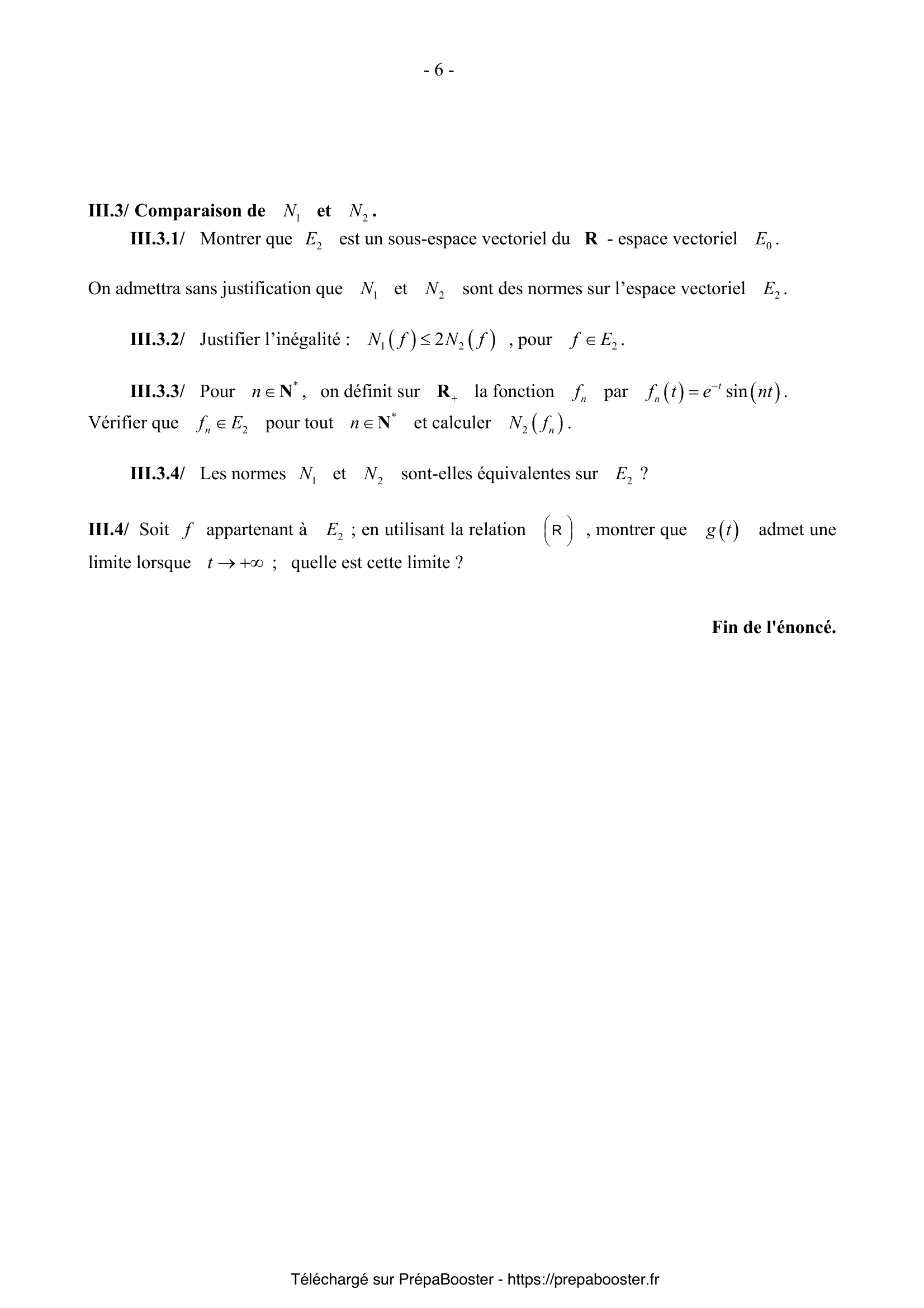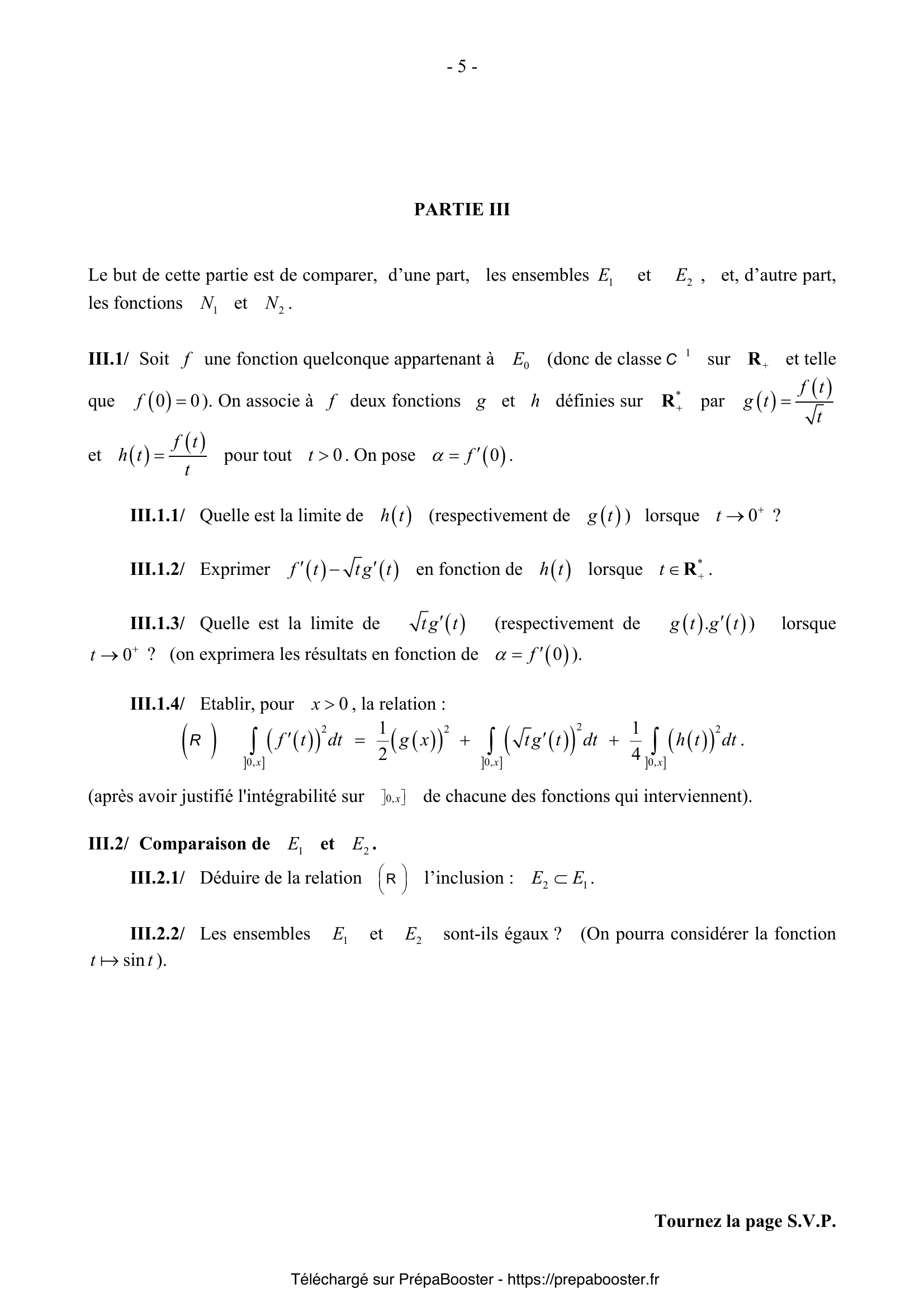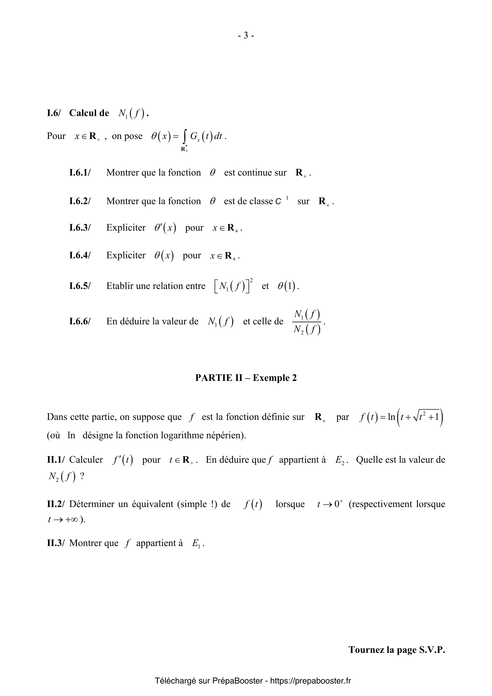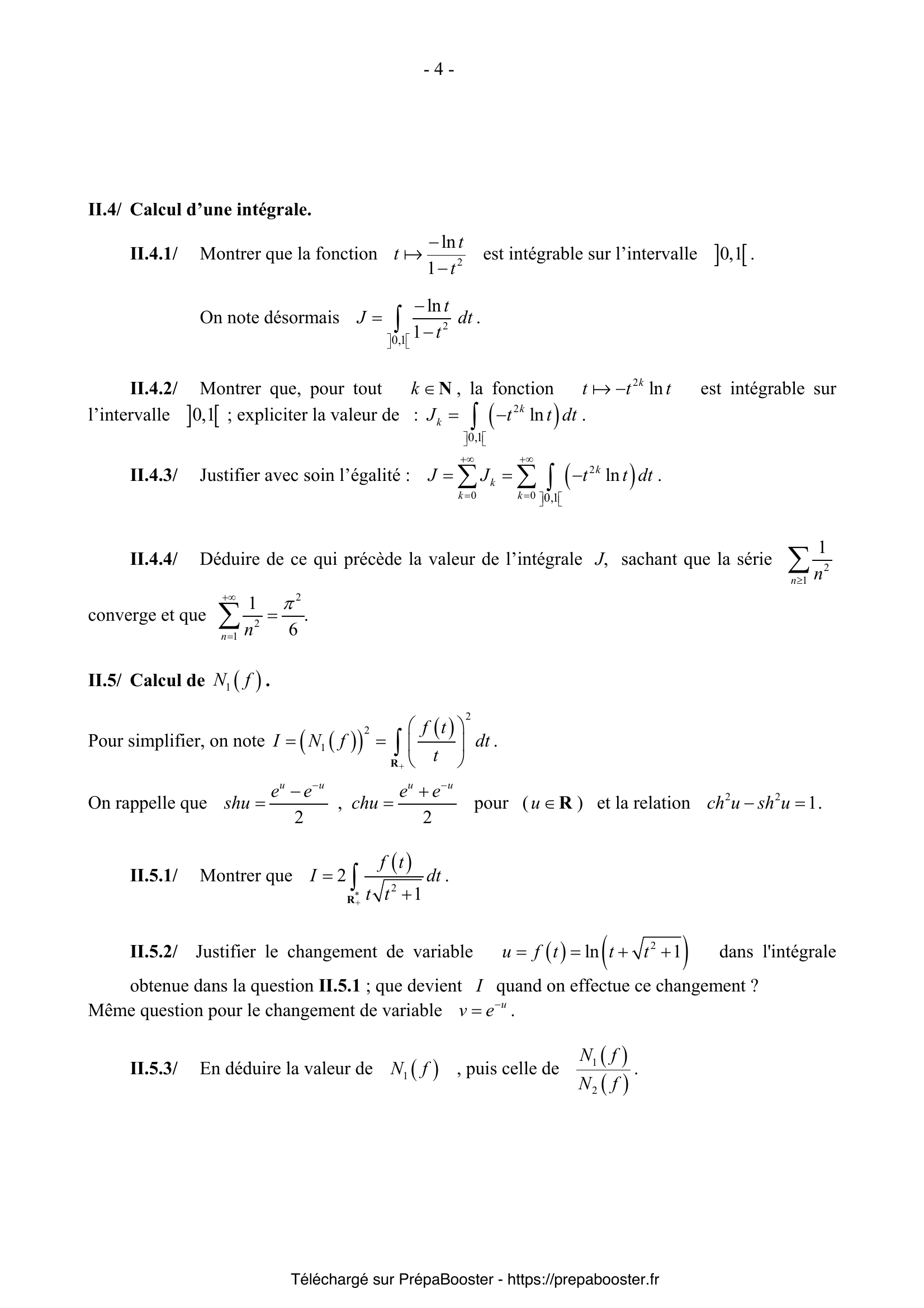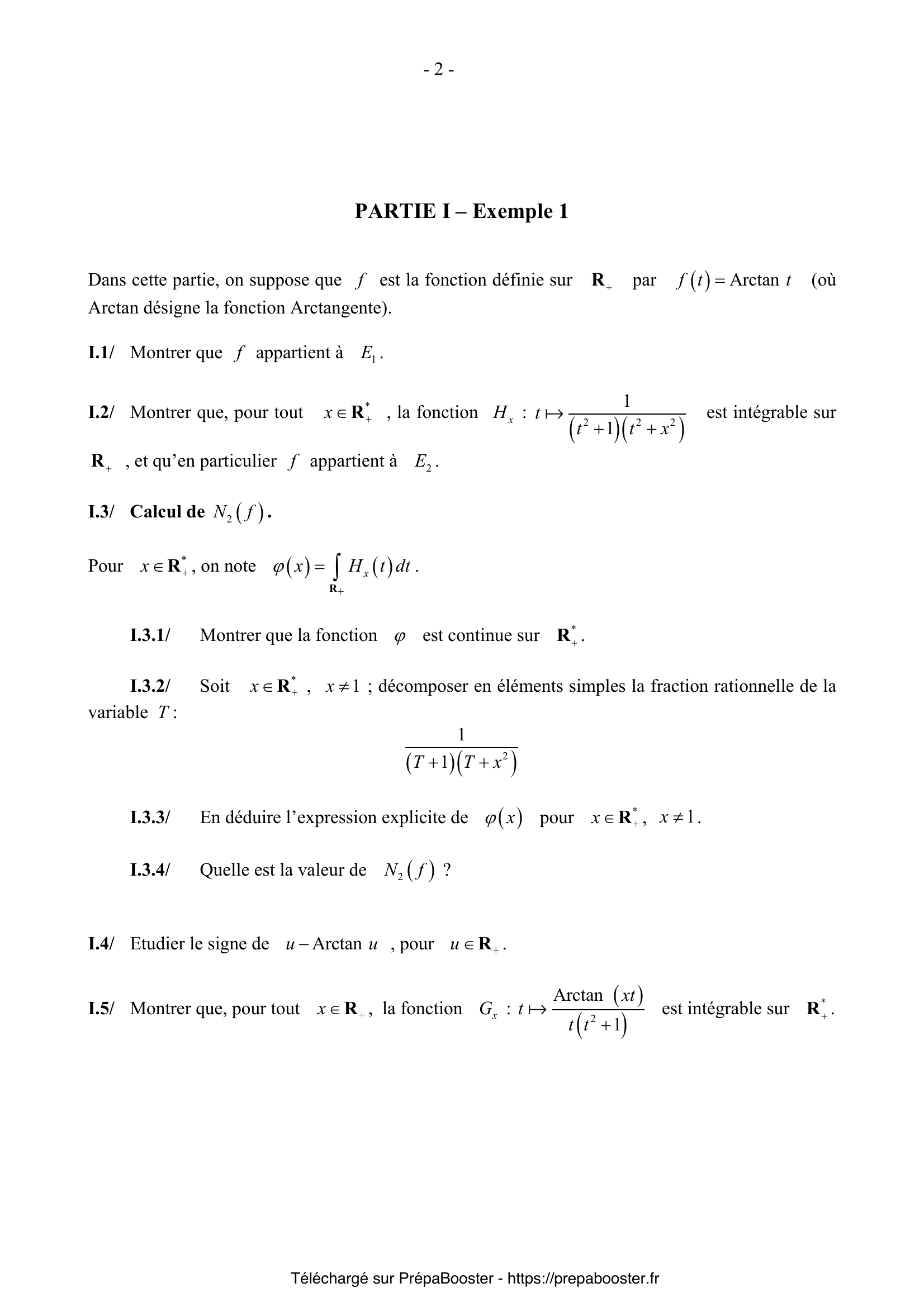 1. I.1/ Montrer que $f$ appartient à $E_1$. 2. I.2/ Montrer que, pour tout $x\in\mathbb{R}_+^*$, la fonction $H_x : t \mapsto \frac{1}{(1+t^2)(1+x^2)}$ est intégrable sur $\mathbb{R}_+$, et qu’en particulier $f$ appartient à $E_2$. 3. I.3/ Calcul de $N_2(f)$.\\ Pour $x \in \mathbb{R}^*_+$, on note $\varphi(x) = \int_{\mathbb{R}_+} H_x(t) dt$. 4. I.3.1/ Montrer que la fonction $\varphi$ est continue sur $\mathbb{R}_+^*$. 5. I.3.2/ Soit $x \in \mathbb{R}_+^*$, $x \neq 1$ ; décomposer en éléments simples la fraction rationnelle de la variable $T$ : $\frac{1}{(1+T^2)(1+x^2)}$.} 6. I.3.3/ En déduire l’expression explicite de $\varphi(x)$ pour $x\in\mathbb{R}_+^*$, $x \neq 1$. 7. I.3.4/ Quelle est la valeur de $N_2(f)$ ? 8. I.4/ Étudier le signe de $u – \arctan u$, pour $u \in \mathbb{R}_+$. 9. I.5/ Montrer que, pour tout $x\in \mathbb{R}_+^*$, la fonction $G_x : t \mapsto \frac{\arctan(xt)}{1+t^2}$ est intégrable sur $\mathbb{R}_+^*$. 10. I.6/ Calcul de $N_1(f)$.\\ Pour $x \in \mathbb{R}_+$, on pose $\theta(x) = \int_{\mathbb{R}_+^*} G_x(t) dt$.} 11. I.6.1/ Montrer que la fonction $\theta$ est continue sur $\mathbb{R}_+$. 12. I.6.2/ Montrer que la fonction $\theta$ est de classe $\mathcal{C}^1$ sur $\mathbb{R}_+$. 13. I.6.3/ Expliciter $\theta'(x)$ pour $x \in \mathbb{R}_+$. 14. I.6.4/ Expliciter $\theta(x)$ pour $x \in \mathbb{R}_+$. 15. I.6.5/ Établir une relation entre $N_1^2(f)$ et $\theta(1)$.} 16. I.6.6/ En déduire la valeur de $N_1(f)$ et celle de $\frac{N_1(f)}{N_2(f)}$. 17. II.1/ Calculer $f'(t)$ pour $t \in \mathbb{R}_+$. En déduire que $f$ appartient à $E_2$. Quelle est la valeur de $N_2(f)$ ? 18. II.2/ Déterminer un équivalent (simple !) de $f(t)$ lorsque $t \to 0^+$ (respectivement lorsque $t \to +\infty$). 19. II.3/ Montrer que $f$ appartient à $E_1$. 20. II.4.1/ Montrer que la fonction $\frac{\ln t}{t^2-1}$ est intégrable sur l’intervalle $]0,1[$.\\ On note désormais $J = \int_{]0,1[} \frac{\ln t}{t^2-1} dt$.} 21. II.4.2/ Montrer que, pour tout $k \in \mathbb{N}$, la fonction $\frac{\ln t}{t^2-k^2}$ est intégrable sur l’intervalle $]0,1[$ ; expliciter la valeur de~: $J_k = \int_{]0,1[} \frac{\ln t}{t^2-k^2} dt$. 22. II.4.3/ Justifier avec soin l’égalité~: $J = \sum_{k=0}^{+\infty} J_k = \sum_{k=0}^{+\infty} \int_{]0,1[} \frac{\ln t}{t^2-k^2} dt$. 23. II.4.4/ Déduire de ce qui précède la valeur de l’intégrale $J$, sachant que la série $\sum_{n\geq 1} \frac{1}{n^2}$ converge et que $\sum_{n=1}^{+\infty} \frac{1}{n^2} = \frac{\pi^2}{6}$. 24. II.5.1/ Montrer que $I = N_1^2(f) = \int_{\mathbb{R}_+^*} \frac{f(t)^2}{t^2} dt$. 25. II.5.2/ Justifier le changement de variable $u = f(t) = t + \ln(1+t)$ dans l’intégrale obtenue dans la question II.5.1 ; que devient $I$ quand on effectue ce changement ? Même question pour le changement de variable $u = e^{-v}$.} 26. II.5.3/ En déduire la valeur de $N_1(f)$, puis celle de $\frac{N_1(f)}{N_2(f)}$. 27. III.1.1/ Quelle est la limite de $h(t)$ (respectivement de $g(t)$) lorsque $t \to 0^+$ ? 28. III.1.2/ Exprimer $f”(t)t – f'(t)$ en fonction de $h(t)$ lorsque $t \in \mathbb{R}_+^*$. 29. III.1.3/ Quelle est la limite de $tg'(t)$ (respectivement de $g'(t)g(t)$) lorsque $t \to 0^+$ ? (on exprimera les résultats en fonction de $\alpha = f'(0)$). 30. III.1.4/ Établir, pour $x > 0$, la relation :} 31. $\int_{0}^{x} f”(t) dt = g(x) + 2 \int_{0}^{x} t g'(t) dt + \int_{0}^{x} h(t) dt$.\\ (après avoir justifié l’intégrabilité sur $[0,x]$ de chacune des fonctions qui interviennent). 32. III.2.1/ Déduire de la relation précédente l’inclusion~: $E_2 \subset E_1$. 33. III.2.2/ Les ensembles $E_1$ et $E_2$ sont-ils égaux ? (On pourra considérer la fonction $t \mapsto \sin t$). 34. III.3.1/ Montrer que $E_2$ est un sous-espace vectoriel du $\mathbb{R}$-espace vectoriel $E_0$.\\ On admettra sans justification que $N_1$ et $N_2$ sont des normes sur l’espace vectoriel $E_2$. 35. III.3.2/ Justifier l’inégalité~: $N_1(f) \leq N_2(f)$, pour $f \in E_2$.} 36. III.3.3/ Pour $n\in \mathbb{N}^*$, on définit sur $\mathbb{R}_+$ la fonction $f_n$ par $f_n(t) = e^{-t}\sin(nt)$. Vérifier que $f_n \in E_2$ pour tout $n\in\mathbb{N}^*$ et calculer $N_2(f_n)$. 37. III.3.4/ Les normes $N_1$ et $N_2$ sont-elles équivalentes sur $E_2$ ? 38. III.4/ Soit $f$ appartenant à $E_2$ ; en utilisant la relation précédente, montrer que $g(t)$ admet une limite lorsque $t \to +\infty$ ; quelle est cette limite ?}FAQ