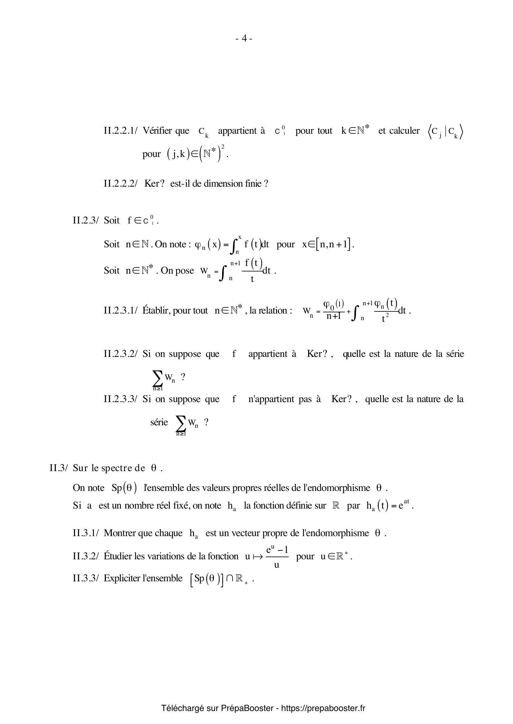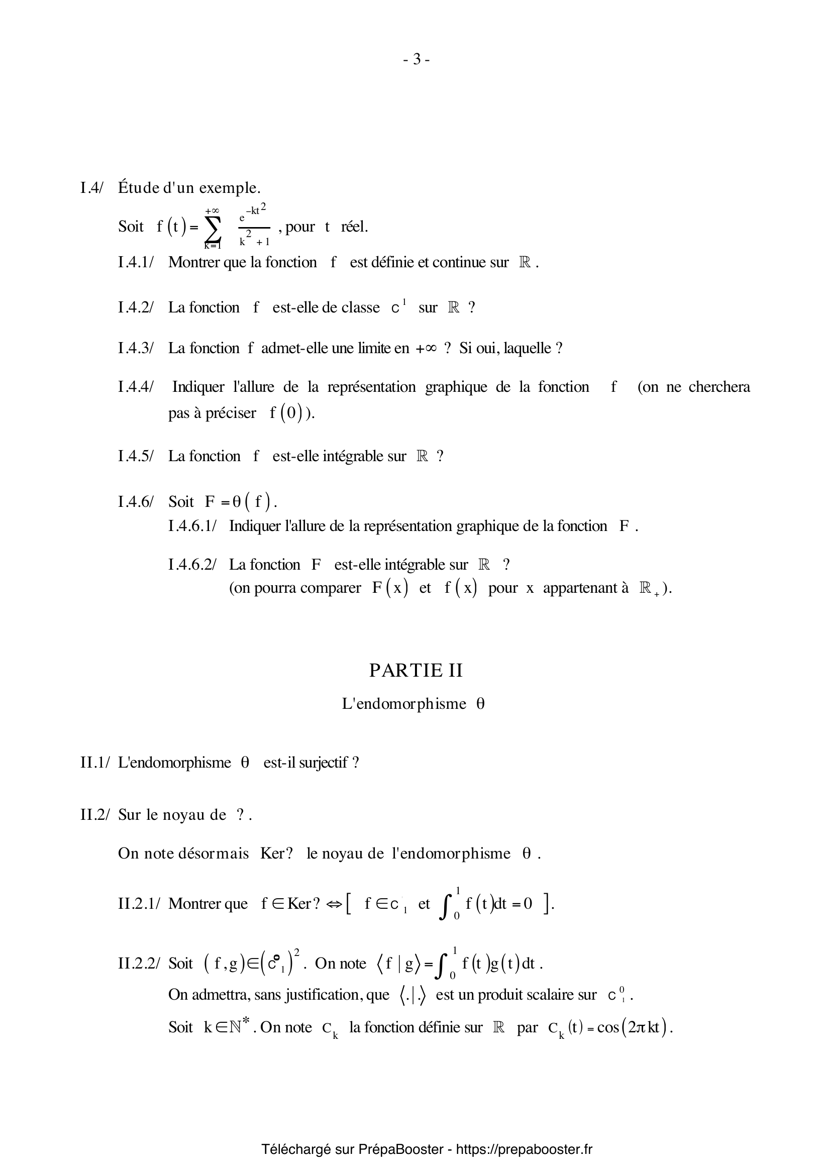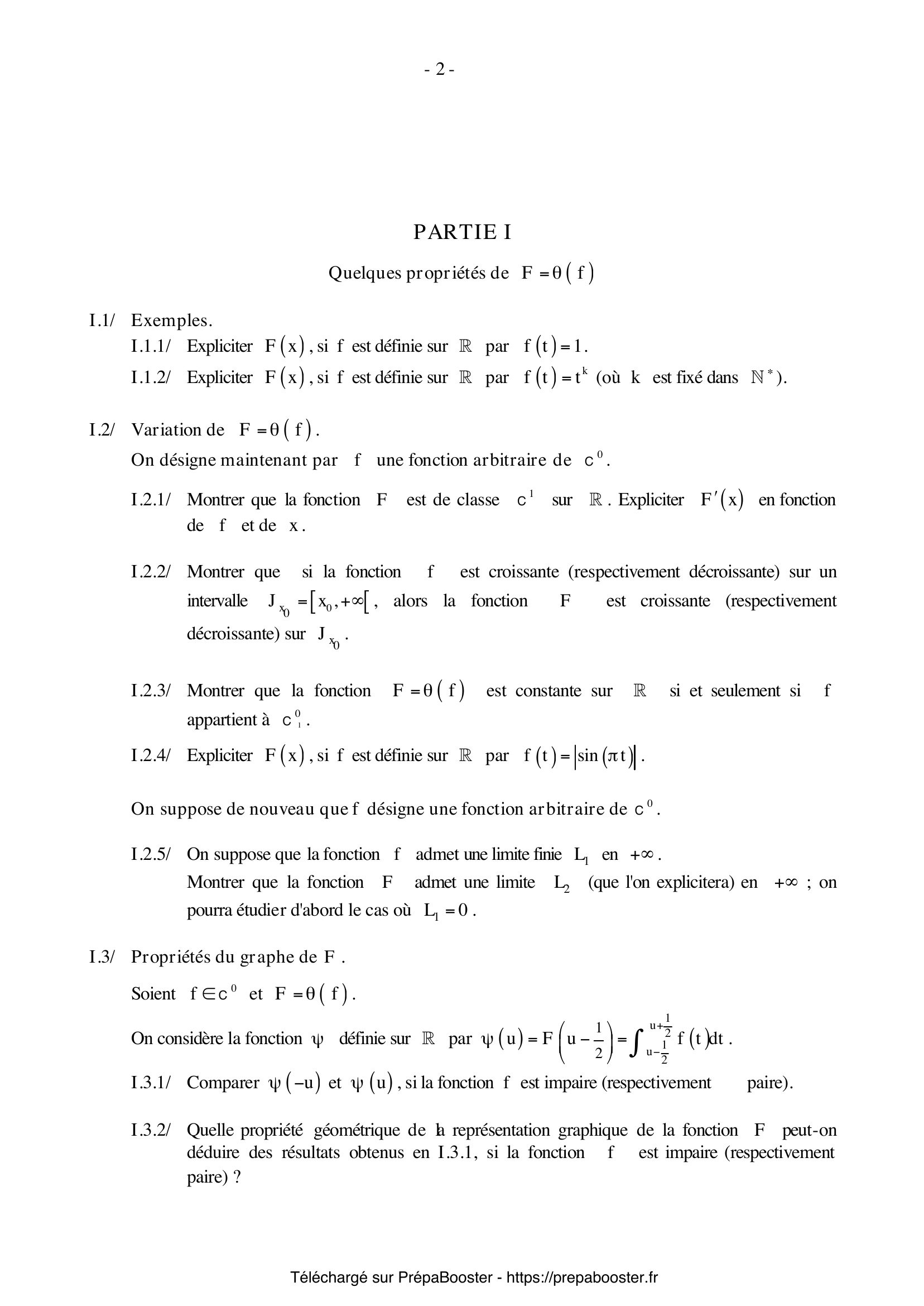 1. I.1.1/ Expliciter $F(x)$, si $f$ est définie sur $\mathbb{R}$ par $f(t)=1$. 2. I.1.2/ Expliciter $F(x)$, si $f$ est définie sur $\mathbb{R}$ par $f(t)=t^k$ (où $k$ est fixé dans $\mathbb{N}^*$). 3. I.2.1/ Montrer que la fonction $F$ est de classe $C^1$ sur $\mathbb{R}$. Expliciter $F'(x)$ en fonction de $f$ et de $x$. 4. I.2.2/ Montrer que si la fonction $f$ est croissante (respectivement décroissante) sur un intervalle $J_x = [0,x[$, alors la fonction $F$ est croissante (respectivement décroissante) sur $J_x$. 5. I.2.3/ Montrer que la fonction $F = q(f)$ est constante sur $\mathbb{R}$ si et seulement si $f$ appartient à $C^1_0$.} 6. I.2.4/ Expliciter $F(x)$, si $f$ est définie sur $\mathbb{R}$ par $f(t)=\sin(\pi t)$. 7. I.2.5/ On suppose que la fonction $f$ admet une limite finie $L_1$ en $+\infty$. Montrer que la fonction $F$ admet une limite $L_2$ (que l’on explicitera) en $+\infty$ ; on pourra étudier d’abord le cas où $L_1 = 0$. 8. I.3.1/ Comparer $y(-u)$ et $y(u)$, si la fonction $f$ est impaire (respectivement paire). 9. I.3.2/ Quelle propriété géométrique de la représentation graphique de la fonction $F$ peut-on déduire des résultats obtenus en I.3.1, si la fonction $f$ est impaire (respectivement paire) ? 10. I.4.1/ Montrer que la fonction $f$ est définie et continue sur $\mathbb{R}$. ($f(t)=\sum_{k=1}^{+\infty}\frac{1}{k^2} e^{-kt^2}$, pour $t$ réel)} 11. I.4.2/ La fonction $f$ est-elle de classe $C^1$ sur $\mathbb{R}$ ? 12. I.4.3/ La fonction $f$ admet-elle une limite en $+\infty$ ? Si oui, laquelle ? 13. I.4.4/ Indiquer l’allure de la représentation graphique de la fonction $f$ (on ne cherchera pas à préciser $f(0)$). 14. I.4.5/ La fonction $f$ est-elle intégrable sur $\mathbb{R}$ ? 15. I.4.6.1/ Indiquer l’allure de la représentation graphique de la fonction $F$.} 16. I.4.6.2/ La fonction $F$ est-elle intégrable sur $\mathbb{R}$ ? (on pourra comparer $F(x)$ et $f(x)$ pour $x$ appartenant à $\mathbb{R}_+$). 17. II.1/ L’endomorphisme $q$ est-il surjectif ? 18. II.2.1/ Montrer que $f \in \Ker q \Leftrightarrow f \in C^1_0$ et $\int_0^1 f(t)dt=0$. 19. II.2.2.1/ Vérifier que $C_k$ appartient à $C^1_0$ pour tout $k \in \mathbb{N}^*$ et calculer $FAQ