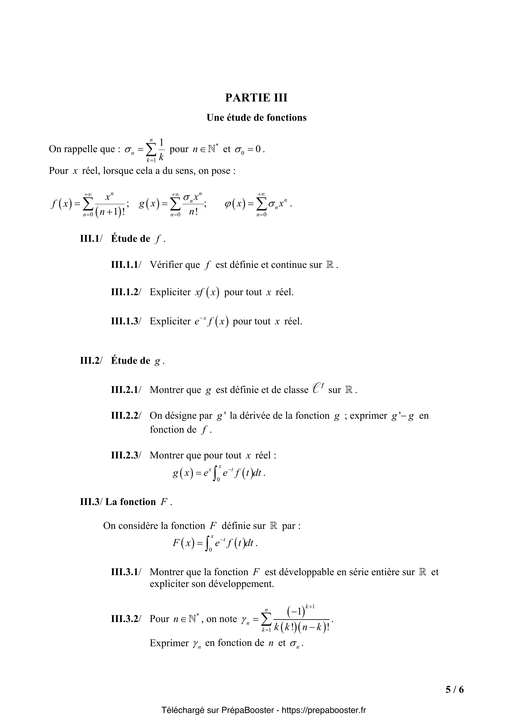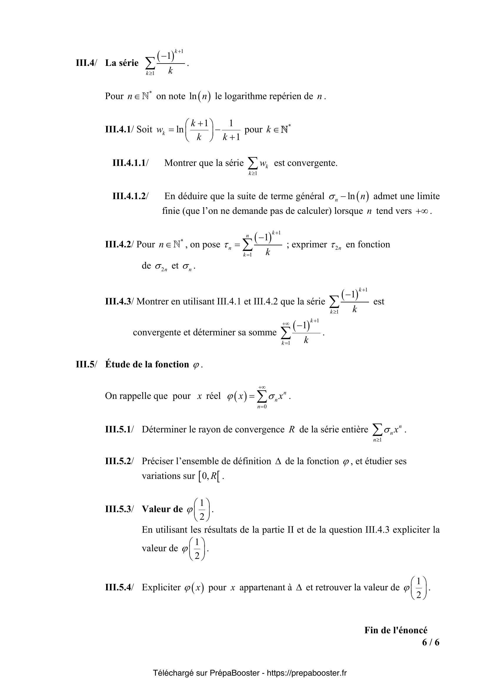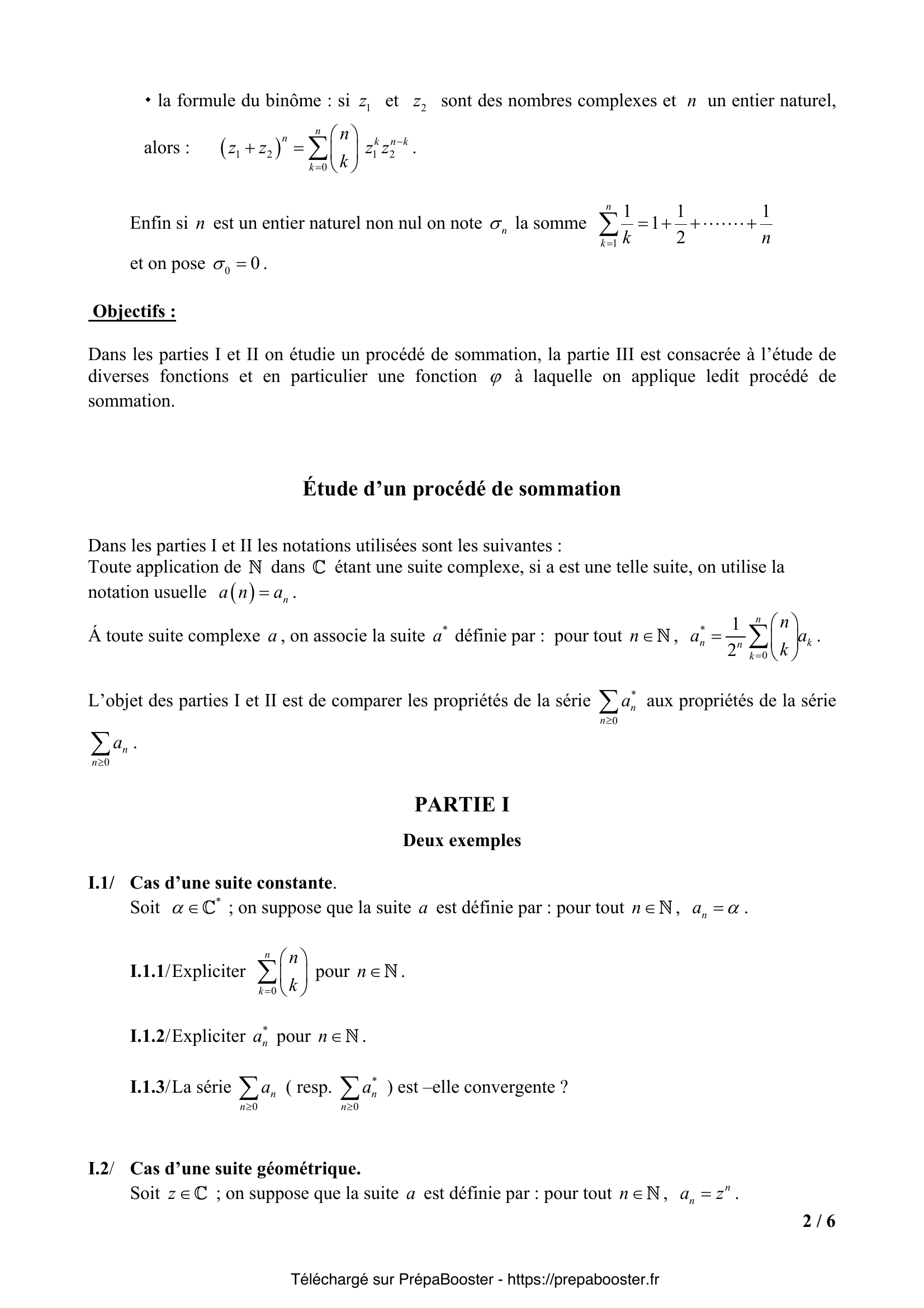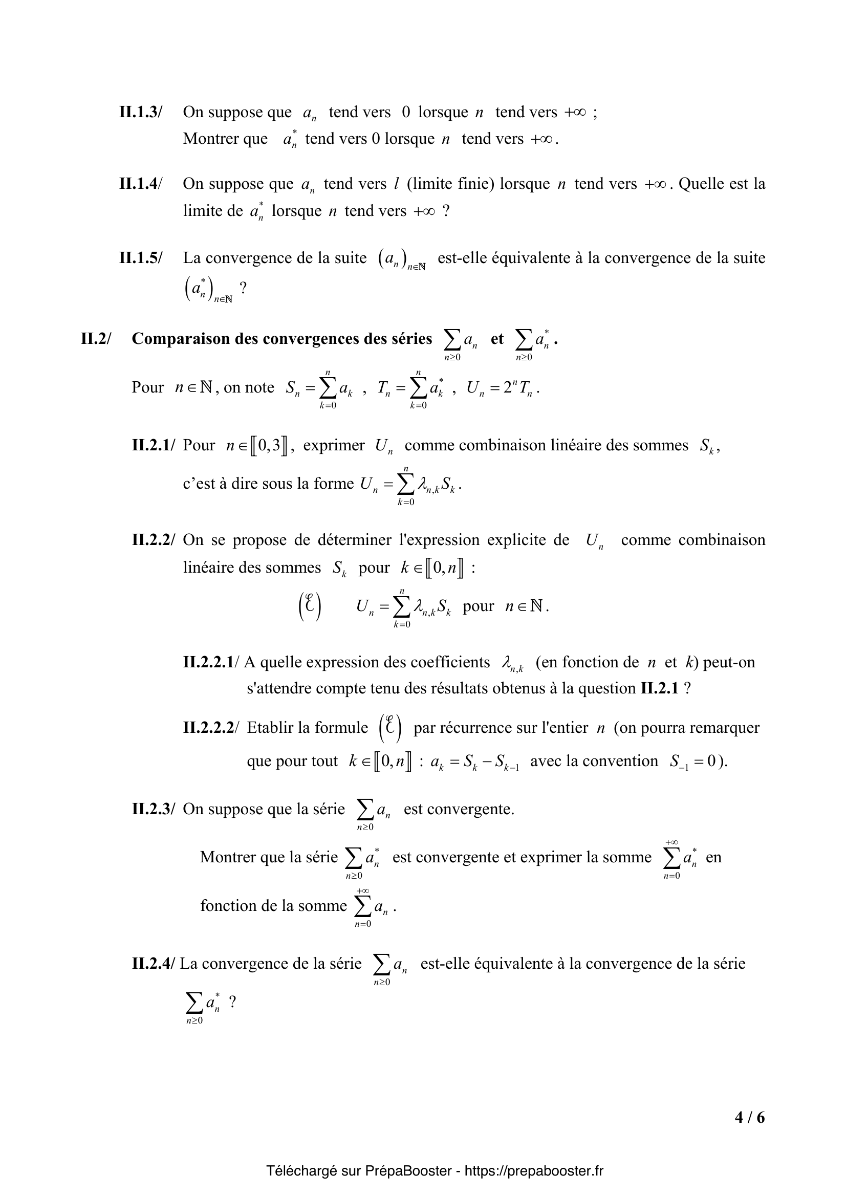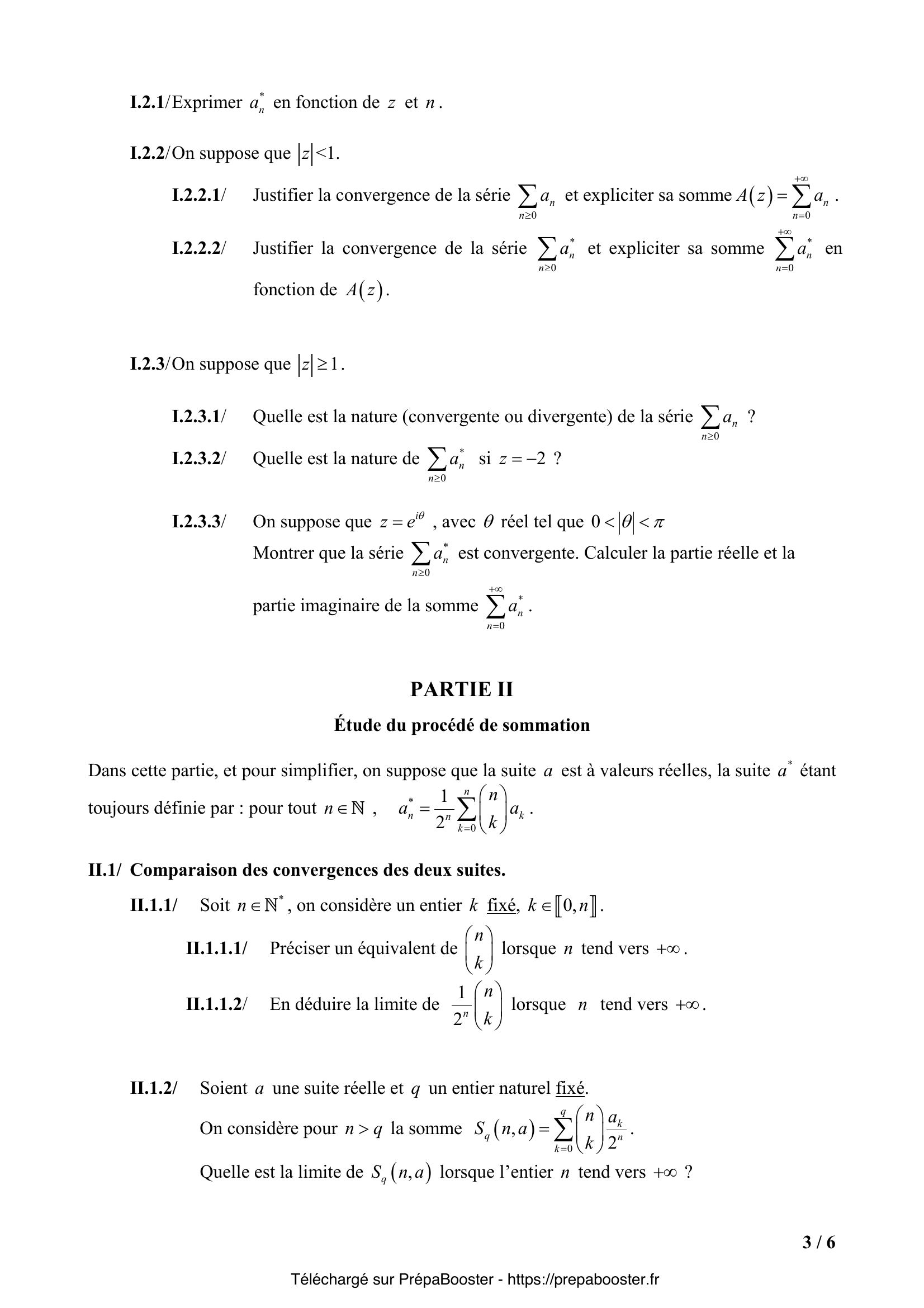 1. I.1.1/ Expliciter $\sum_{k=0}^{n} \binom{n}{k}$ pour $n\in\mathbb{N}$. 2. I.1.2/ Expliciter $a_n^*$ pour $n\in\mathbb{N}$. 3. I.1.3/ La série $\sum_{n\geq 0} a_n$ (resp. $\sum_{n\geq 0} a_n^*$) est –elle convergente ? 4. I.2.1/ Exprimer $a_n^*$ en fonction de $z$ et $n$. 5. I.2.2.1/ On suppose que $|z|<1$. Justifier la convergence de la série $\sum_{n\geq 0} a_n$ et expliciter sa somme $A(z)=\sum_{n=0}^{+\infty} a_n$.} 6. I.2.2.2/ Justifier la convergence de la série $\sum_{n\geq 0} a_n^*$ et expliciter sa somme $\sum_{n=0}^{+\infty} a_n^*$ en fonction de $A(z)$. 7. I.2.3.1/ On suppose que $|z|\geq1$. Quelle est la nature (convergente ou divergente) de la série $\sum_{n\geq 0} a_n$ ? 8. I.2.3.2/ Quelle est la nature de $\sum_{n\geq 0} a_n^*$ si $z = -2$ ? 9. I.2.3.3/ On suppose que $z=e^{i\theta}$, avec $\theta$ réel tel que $0 < \theta < \pi$. Montrer que la série $\sum_{n\geq 0} a_n^*$ est convergente. Calculer la partie réelle et la partie imaginaire de la somme $\sum_{n=0}^{+\infty} a_n^*$. 10. II.1.1.1/ Soit $k$ fixé, $k\in\overline{0,n}$. Préciser un équivalent de $\binom{n}{k}$ lorsque $n$ tend vers $+\infty$.} 11. II.1.1.2/ En déduire la limite de $\frac{1}{2^n}\binom{n}{k}$ lorsque $n$ tend vers $+\infty$. 12. II.1.2/ Soient $a$ une suite réelle et $q$ un entier naturel fixé. On considère pour $n>q$ la somme $S_n(a,q)=\sum_{k=0}^q \binom{n}{k} a_k$. Quelle est la limite de $S_n(a,q)$ lorsque $n$ tend vers $+\infty$ ? 13. II.1.3/ On suppose que $a_n$ tend vers $0$ lorsque $n$ tend vers $+\infty$ ; Montrer que $a_n^*$ tend vers $0$ lorsque $n$ tend vers $+\infty$. 14. II.1.4/ On suppose que $a_n$ tend vers $\ell$ (limite finie) lorsque $n$ tend vers $+\infty$. Quelle est la limite de $a_n^*$ lorsque $n$ tend vers $+\infty$ ? 15. II.1.5/ La convergence de la suite $(a_n)_{n\in\mathbb{N}}$ est-elle équivalente à la convergence de la suite $(a_n^*)_{n\in\mathbb{N}}$ ?} 16. II.2.1/ Pour $n\in\overline{0,3}$, exprimer $U_n$ comme combinaison linéaire des sommes $S_k$, c’est à dire sous la forme $U_n = \sum_{k=0}^{n} \lambda_{n,k} S_k$. 17. II.2.2.1/ On se propose de déterminer l’expression explicite de $U_n$ comme combinaison linéaire des sommes $S_k$ pour $k\in\overline{0,n}$ : $U_n = \sum_{k=0}^n \lambda_{n,k} S_k$ pour $n\in\mathbb{N}$. À quelle expression des coefficients $\lambda_{n,k}$ (en fonction de $n$ et $k$) peut-on s’attendre compte tenu des résultats obtenus à la question II.2.1 ? 18. II.2.2.2/ Établir la formule $(E)$ par récurrence sur l’entier $n$ (on pourra remarquer que pour tout $k\in\overline{0,n}$ : $S_k = S_{k-1} + a_k$ avec la convention $S_{-1}=0$). 19. II.2.3/ On suppose que la série $\sum_{n\geq0} a_n$ est convergente. Montrer que la série $\sum_{n\geq0} a_n^*$ est convergente et exprimer la somme $\sum_{n=0}^{+\infty} a_n^*$ en fonction de la somme $\sum_{n=0}^{+\infty} a_n$. 20. II.2.4/ La convergence de la série $\sum_{n\geq0} a_n$ est-elle équivalente à la convergence de la série $\sum_{n\geq0} a_n^*$ ?} 21. III.1.1/ Vérifier que $f$ est définie et continue sur $\mathbb{R}$. 22. III.1.2/ Expliciter $x f(x)$ pour tout $x$ réel. 23. III.1.3/ Expliciter $e^{-x} f(x)$ pour tout $x$ réel. 24. III.2.1/ Montrer que $g$ est définie et de classe $C^1$ sur $\mathbb{R}$. 25. III.2.2/ On désigne par $g’$ la dérivée de la fonction $g$ ; exprimer $g – g’$ en fonction de $f$.} 26. III.2.3/ Montrer que pour tout $x$ réel : $g(x) = \int_{0}^{x} e^{x-t} f(t) dt$. 27. III.3.1/ Montrer que la fonction $F$ définie sur $\mathbb{R}$ par $F(x) = \int_{0}^{x} e^{x-t} f(t) dt$ est développable en série entière sur $\mathbb{R}$ et expliciter son développement. 28. III.3.2/ Pour $n\in\mathbb{N}^*$, on note $\gamma_n = \sum_{k=1}^{n} \frac{1}{k!} (\frac{1}{k} – \frac{1}{n+1})$. Exprimer $\gamma_n$ en fonction de $n$ et $\sigma_n$. 29. III.4.1.1/ Soit $w_k = \frac{1}{k} – \frac{\ln(k+1)}{k+1}$ pour $k\in\mathbb{N}^*$. Montrer que la série $\sum_{k\geq1} w_k$ est convergente. 30. III.4.1.2/ En déduire que la suite de terme général $\sigma_n – \ln(n)$ admet une limite finie (que l’on ne demande pas de calculer) lorsque $n$ tend vers $+\infty$.} 31. III.4.2/ Pour $n\in\mathbb{N}^*$, on pose $\tau_n = \sum_{k=1}^{n} \frac{1}{k} – \sum_{k=1}^{n} \frac{1}{k+1}$ ; exprimer $\tau_{2n}$ en fonction de $\sigma_{2n}$ et $\sigma_{n}$. 32. III.4.3/ Montrer en utilisant III.4.1 et III.4.2 que la série $\sum_{k\geq1} \frac{1}{k(k+1)}$ est convergente et déterminer sa somme $\sum_{k=1}^{+\infty} \frac{1}{k(k+1)}$. 33. III.5.1/ Déterminer le rayon de convergence $R$ de la série entière $\sum_{n\geq1} \sigma_n x^n$. 34. III.5.2/ Préciser l’ensemble de définition $\Delta$ de la fonction $\varphi$, et étudier ses variations sur $[0, R[$. 35. III.5.3/ Valeur de $\varphi\left(\frac{1}{2}\right)$. En utilisant les résultats de la partie II et de la question III.4.3 expliciter la valeur de $\varphi\left(\frac{1}{2}\right)$.} 36. III.5.4/ Expliciter $\varphi(x)$ pour $x$ appartenant à $\Delta$ et retrouver la valeur de $\varphi\left( \frac{1}{2}\right)$.}FAQ