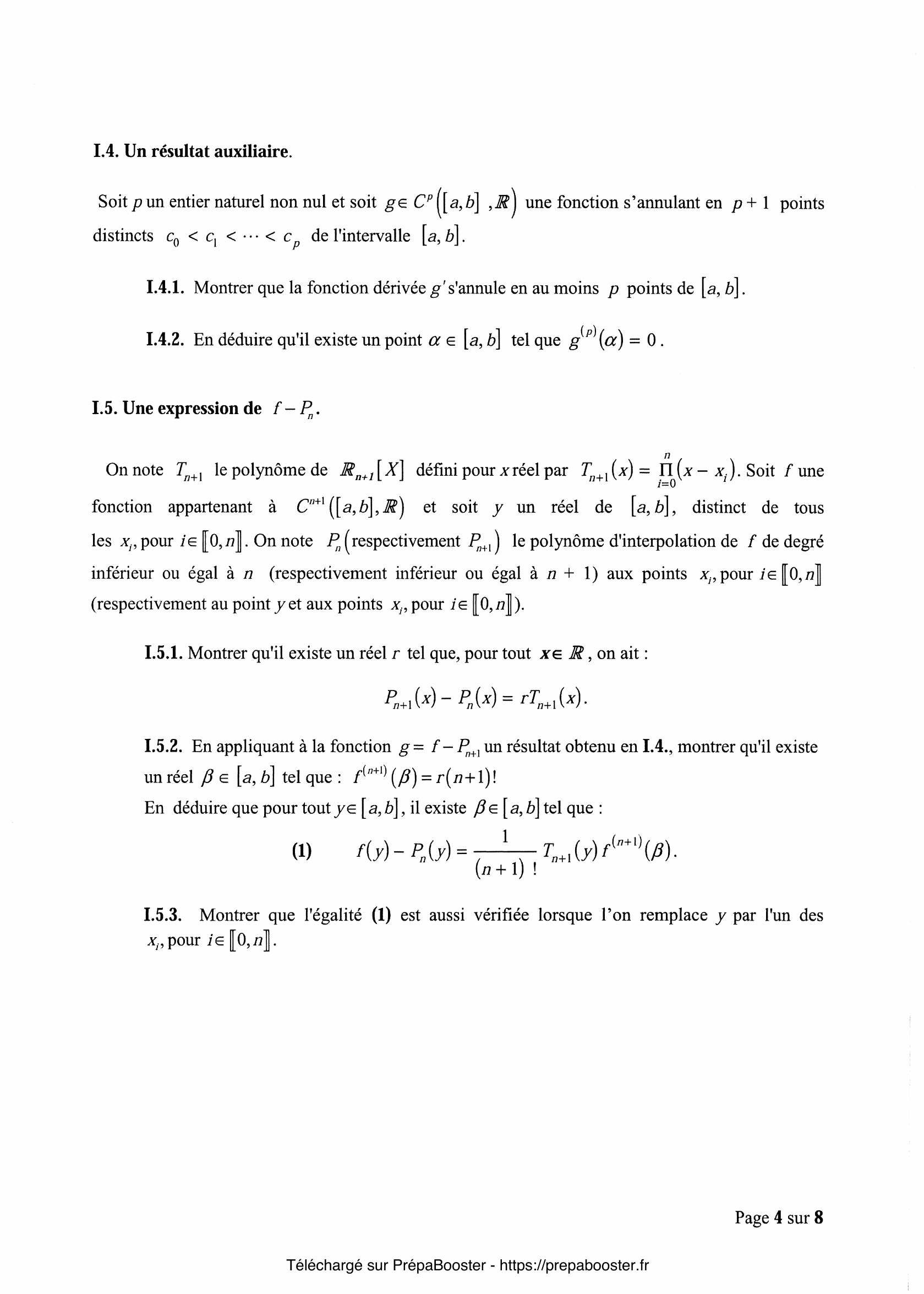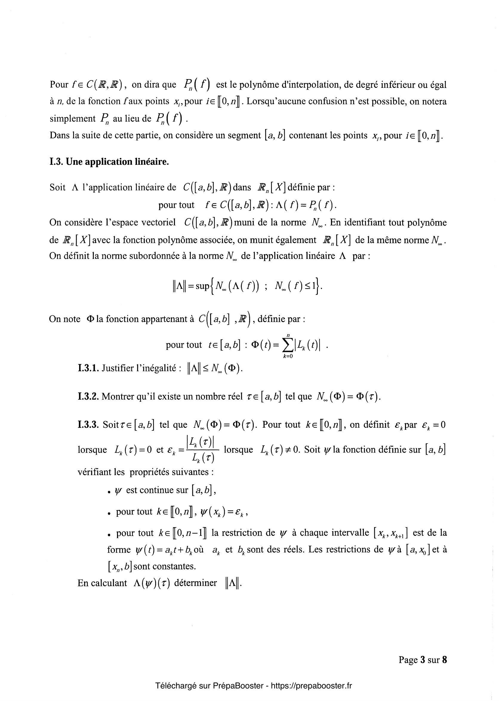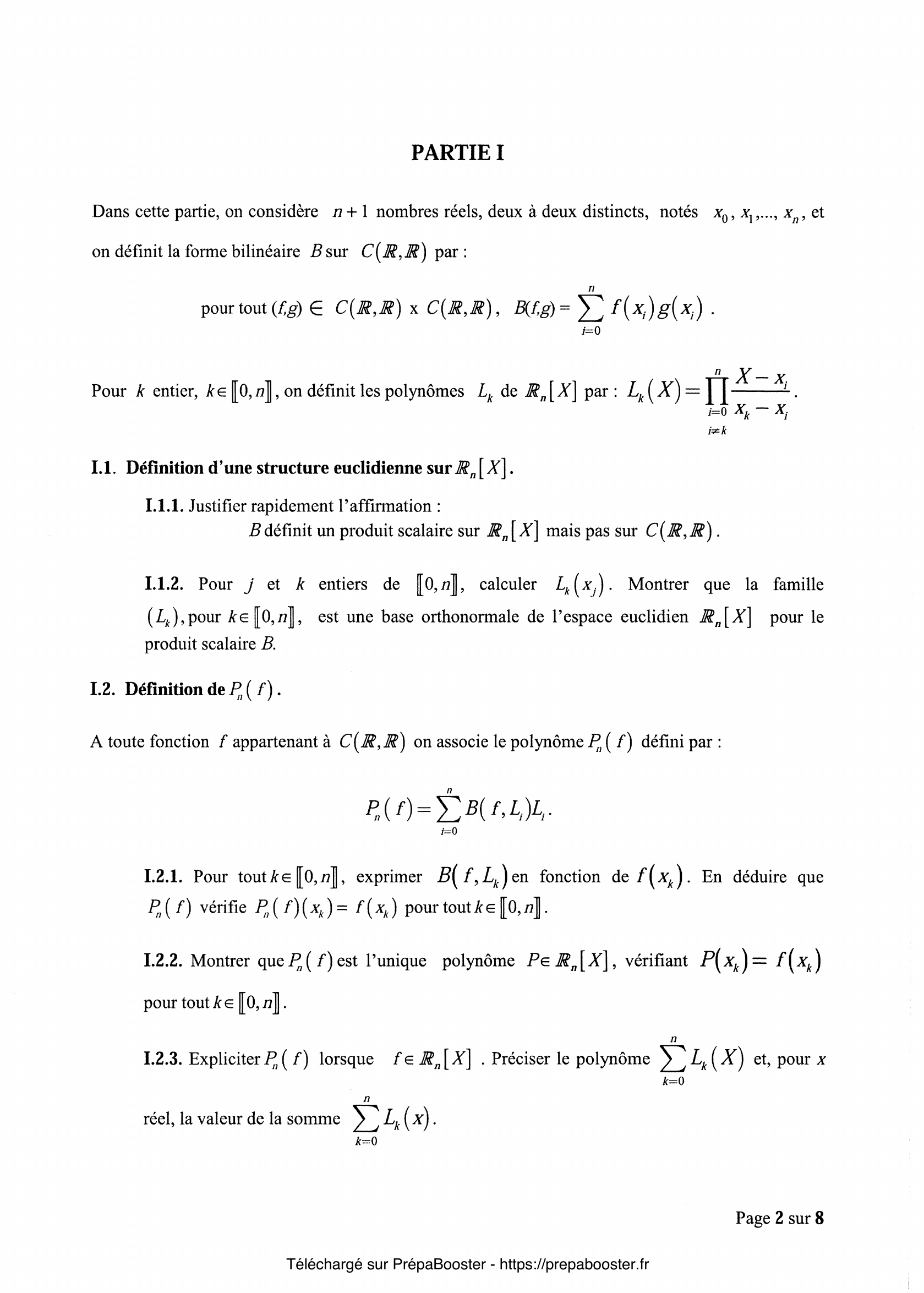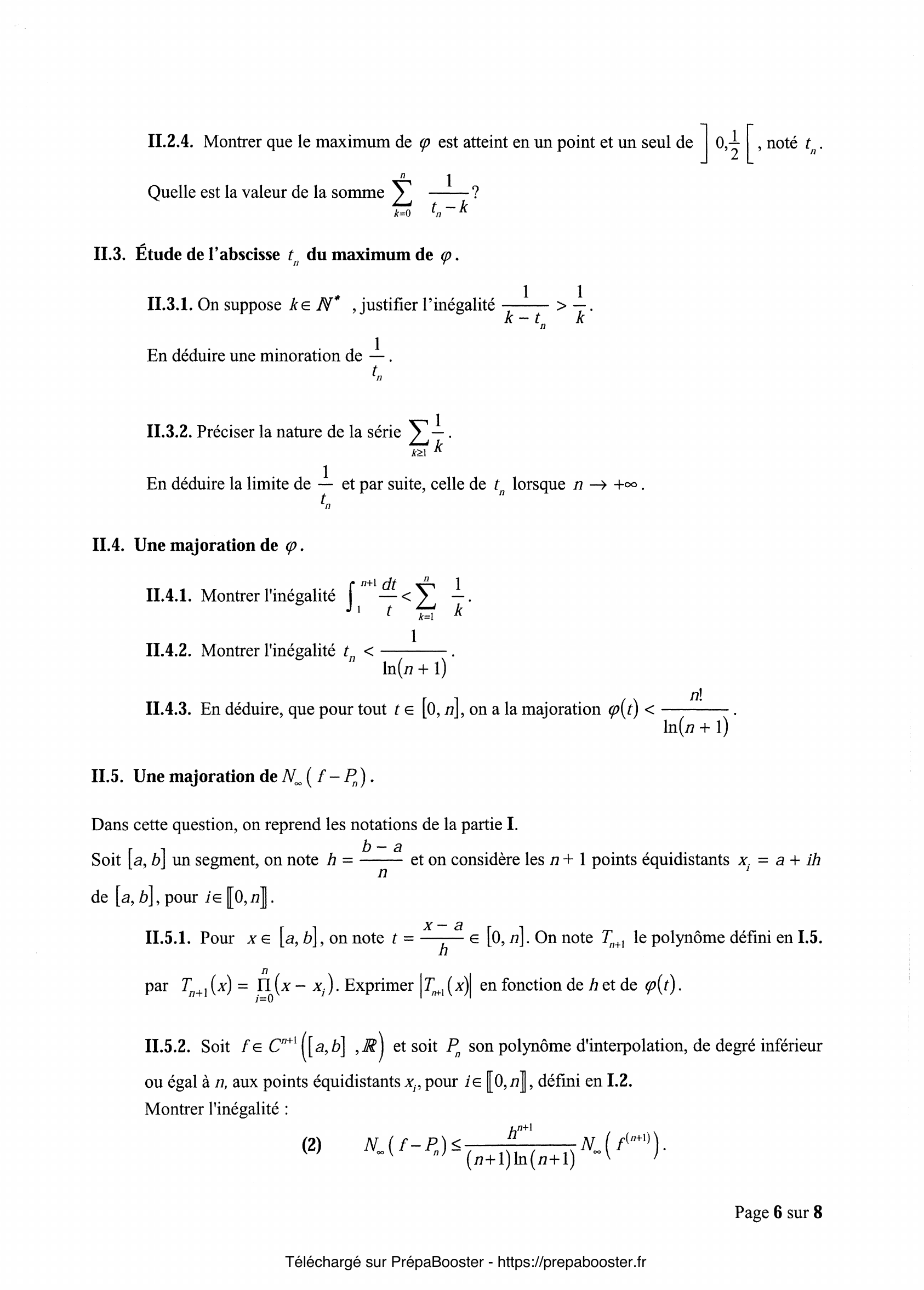 1. I.1.1. Justifier rapidement l’affirmation : $B$ définit un produit scalaire sur $\mathbb{R}_n[X]$ mais pas sur $C(\mathbb{R}, \mathbb{R})$. 2. I.1.2. Pour $j$ et $k$ entiers de $[0,n]$, calculer $L_k(x_j)$. Montrer que la famille $(L_k)_{k \in [0,n]}$ est une base orthonormale de l’espace euclidien $\mathbb{R}_n[X]$ pour le produit scalaire $B$. 3. I.2.1. Pour tout $k \in [0,n]$, exprimer $B(f, L_k)$ en fonction de $f(x_k)$. En déduire que $P_n(f)$ vérifie $P_n(f)(x_k) = f(x_k)$ pour tout $k \in [0,n]$. 4. I.2.2. Montrer que $P_n(f)$ est l’unique polynôme $P \in \mathbb{R}_n[X]$, vérifiant $P(x_k) = f(x_k)$ pour tout $k \in [0,n]$. 5. I.2.3. Expliciter $P_n(f)$ lorsque $f \in \mathbb{R}_n[X]$. Préciser le polynôme $\sum\limits_{k=0}^n L_k(X)$ et, pour $x$ réel, la valeur de la somme $\sum\limits_{k=0}^n L_k(x)$.} 6. I.3.1. Justifier l’inégalité : $\|\Lambda\| \leq N_{\infty}(\Phi)$. 7. I.3.2. Montrer qu’il existe un nombre réel $\tau \in [a, b]$ tel que $N_{\infty}(\Phi) = \Phi(\tau)$. 8. I.3.3. Soit $\tau \in [a, b]$ tel que $N_{\infty}(\Phi) = \Phi(\tau)$. Pour tout $k \in [0, n]$, on définit $\varepsilon_k$ par $\varepsilon_k = 0$ lorsque $L_k(\tau)=0$ et $\varepsilon_k = \frac{L_k(x)}{L_k(\tau)}$ lorsque $L_k(\tau) \neq 0$. Soit $\psi$ la fonction définie sur $[a, b]$ vérifiant les propriétés suivantes : \begin{itemize} \item $\psi$ est continue sur $[a, b]$, \item pour tout $k \in [0, n]$, $\psi(x_k)=\varepsilon_k$, \item pour tout $k \in [0, n-1]$ la restriction de $\psi$ à chaque intervalle $[x_k, x_{k+1}]$ est de la forme $\psi(t) = a_k t + b_k$ où $a_k$ et $b_k$ sont des réels. Les restrictions de $\psi$ à $[a, x_0]$ et à $[x_n, b]$ sont constantes. \end{itemize} En calculant $\Lambda(\psi)(\tau)$ déterminer $\|\Lambda\|$. 9. I.4.1. Montrer que la fonction dérivée $g’$ s’annule en au moins $p$ points de $[a, b]$. 10. I.4.2. En déduire qu’il existe un point $\alpha\in[a, b]$ tel que $g^{(p)}(\alpha)=0$.} 11. I.5.1. Montrer qu’il existe un réel $r$ tel que, pour tout $x \in \mathbb{R}$, on ait : \[ P_{n+1}(x) – P_n(x) = r T_{n+1}(x). \] 12. I.5.2. En appliquant à la fonction $g = f – P_{n+1}$ un résultat obtenu en I.4., montrer qu’il existe un réel $\beta \in [a, b]$ tel que : $f^{(n+1)}(\beta) = r(n+1)!$\\ En déduire que pour tout $y \in [a, b]$, il existe $\beta \in [a, b]$ tel que : \[ f(y) – P_n(f)(y) = \frac{1}{(n+1)!} T_{n+1}(y) f^{(n+1)}(\beta). \] 13. I.5.3. Montrer que l’égalité (1) est aussi vérifiée lorsque l’on remplace $y$ par l’un des $x_i$, pour $i \in [0, n]$. 14. II.1.1. Montrer que la fonction $\varphi$ admet un maximum sur l’intervalle $[0, n]$. 15. II.1.2. Soit $t \in [0, n]$ : comparer $\varphi(n-t)$ et $\varphi(t)$.} 16. II.1.3. On suppose $t > 1$ et $t \in \mathbb{N}$. Calculer $\dfrac{\varphi(t-1)}{\varphi(t)}$.\\ En déduire que pour $t \in [1, \frac{n}{2}]$, on a $\varphi(t-1) \geq \varphi(t)$. 17. II.1.4. On suppose $n$ pair et on note $n = 2p$. Montrer que $\varphi$ atteint son maximum en un point de l’intervalle $[0, 1]$ en supposant d’abord que $p = 1$ puis $p \geq 2$.\\ On admettra que pour $n$ impair, $\varphi$ atteint son maximum en un point de $[0, 1]$. 18. II.2.1. Soit $t \in \mathbb{N}$, expliciter $\ln(\varphi(t))$, où $\ln$ désigne la fonction logarithme népérien ; en déduire $\frac{\varphi'(t)}{\varphi(t)}$ en fonction de $\sum\limits_{k=0}^n \frac{1}{t-k}$. 19. II.2.2. Pour $t \in [\frac{1}{2}, 1[$, déterminer le signe de la somme $\sum\limits_{k=2}^n \frac{1}{t-k}$. En déduire que $\varphi'(t)$ est strictement négatif sur l’intervalle $[\frac{1}{2}, 1[$. 20. II.2.3. Calculer la dérivée de la fonction définie sur $]0,1[$ par : $g(t) = \sum\limits_{k=0}^{n} \frac{1}{t-k}$.\\ Déterminer le sens de variation de la fonction $g$. En déduire que la fonction $\varphi’$ s’annule en au plus un point de $]0,1[$.} 21. II.2.4. Montrer que le maximum de $\varphi$ est atteint en un point et un seul de $]0, \frac{1}{2}[$, noté $t_n$.\\ Quelle est la valeur de la somme $\sum\limits_{k=0}^{n} \frac{1}{t_n – k}$ ? 22. II.3.1. On suppose $k \in \mathbb{N}^*$, justifier l’inégalité $\frac{1}{k-t_n} > \frac{1}{k}$\\ En déduire une minoration de $\frac{1}{t_n}$. 23. II.3.2. Préciser la nature de la série $\sum\limits_{k=1}^{+\infty} \frac{1}{k}$.\\ En déduire la limite de $\frac{1}{t_n}$ et par suite, celle de $t_n$ lorsque $n \to +\infty$. 24. II.4.1. Montrer l’inégalité $\int_1^{n+1} \frac{dt}{t} < \sum\limits_{k=1}^n \frac{1}{k}$. 25. II.4.2. En déduire, que pour tout $t \in [0, n]$, on a la majoration $\varphi(t) < \frac{n!}{\ln(n+1)}$.} 26. II.5.1. Pour $x \in [a, b]$, on note $t = \frac{x-a}{h} \in [0, n]$. On note $T_{n+1}$ le polynôme défini en I.5 par $T_{n+1}(x) = \prod\limits_{j=0}^n (x-x_j)$. Exprimer $T_{n+1}(x)$ en fonction de $h$ et de $\varphi(t)$. 27. II.5.2. Soit $f \in C^{n+1}([a, b], \mathbb{R})$ et soit $P_n$ son polynôme d’interpolation, de degré inférieur ou égal à $n$, aux points équirépartis $x_i$, pour $i \in [0, n]$, défini en I.2. Montrer l’inégalité : \[ N_{\infty}(f - P_n) \leq \frac{N_{\infty}(f^{(n+1)})}{(n+1)! \ln(n+1)} N_{\infty}(\varphi). \] 28. III.1. Soit $x$ un réel et soit $k$ un entier de $[0, n]$.\\ Exprimer $T_{n+1}(x)$ en fonction de $L_k(x)$, $x-x_k$ et $w_k$. 29. III.2. Soit $f \in C(\mathbb{R}, \mathbb{R})$ et soit $P_n$ son polynôme d’interpolation, de degré inférieur ou égal à $n$, aux points $x_p$, pour $i \in [0,n]$. On suppose $x$ différent de tous les $x_p$, pour $i \in [0, n]$.\\ Montrer l’égalité : \[ P_n(x) = T_{n+1}(x) \left( \sum_{k=0}^n \frac{w_k f(x_k)}{x - x_k} \right) \] Calculer $T_{n+1}(x) \sum\limits_{k=0}^n \frac{w_k}{x-x_k}$.\\ En déduire la formule barycentrique : \[ P_n(x) = \frac{\sum\limits_{k=0}^n \frac{w_k f(x_k)}{x-x_k}}{\sum\limits_{k=0}^n \frac{w_k}{x-x_k}} \] 30. III.3.1. Exprimer $w_k$ en fonction de $h$, de $n$ et de $k$.\\ Soit $w_k^* = (-1)^k h^n!
