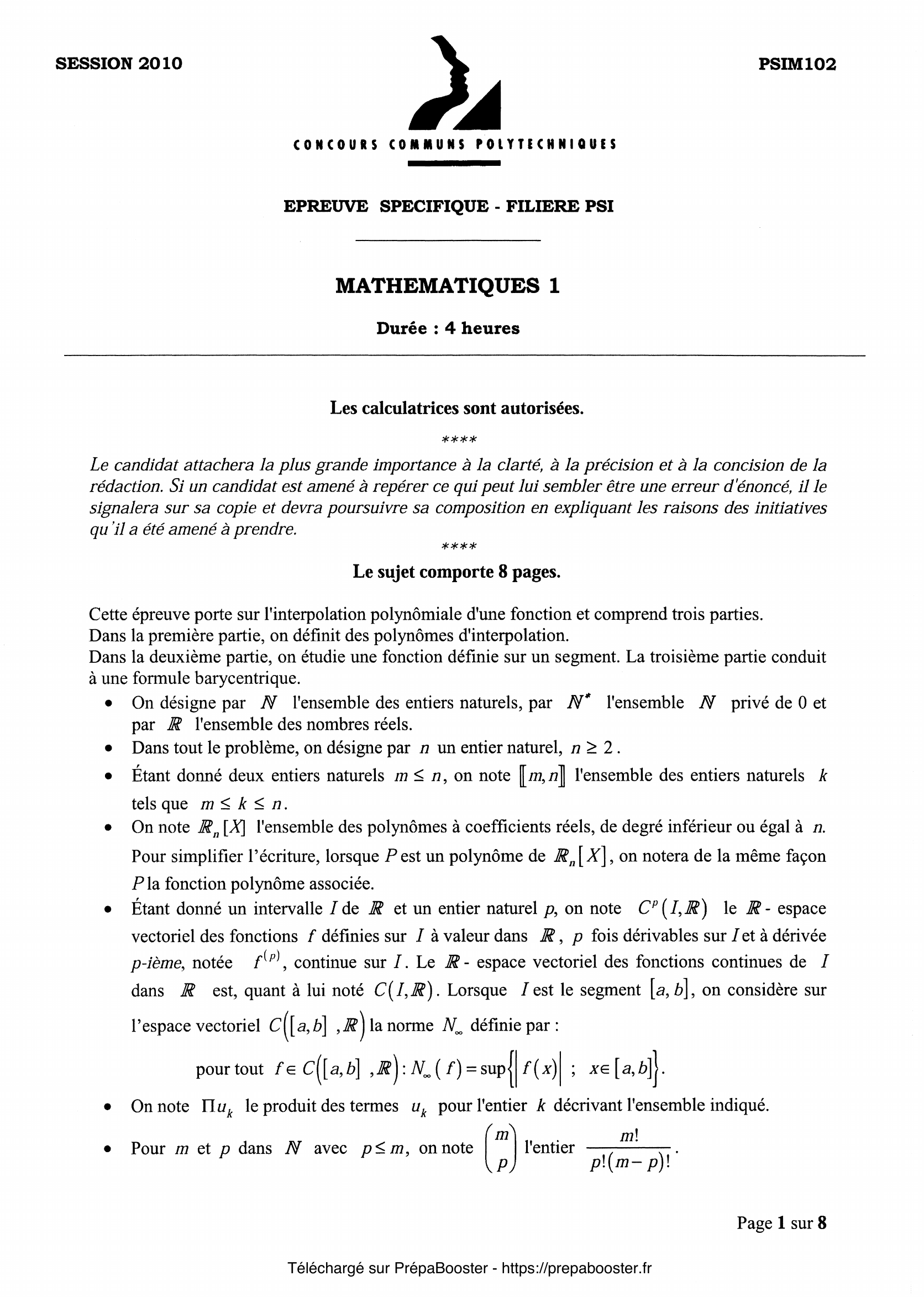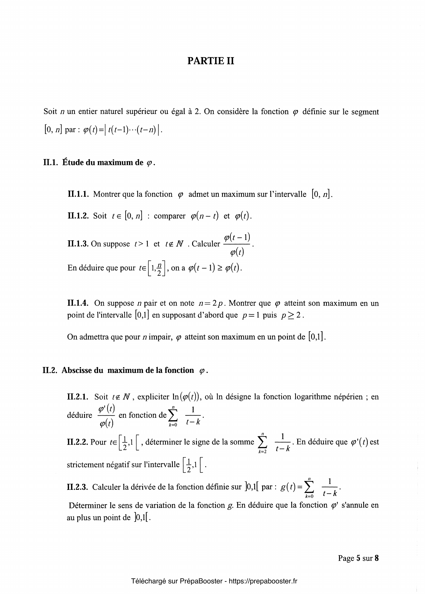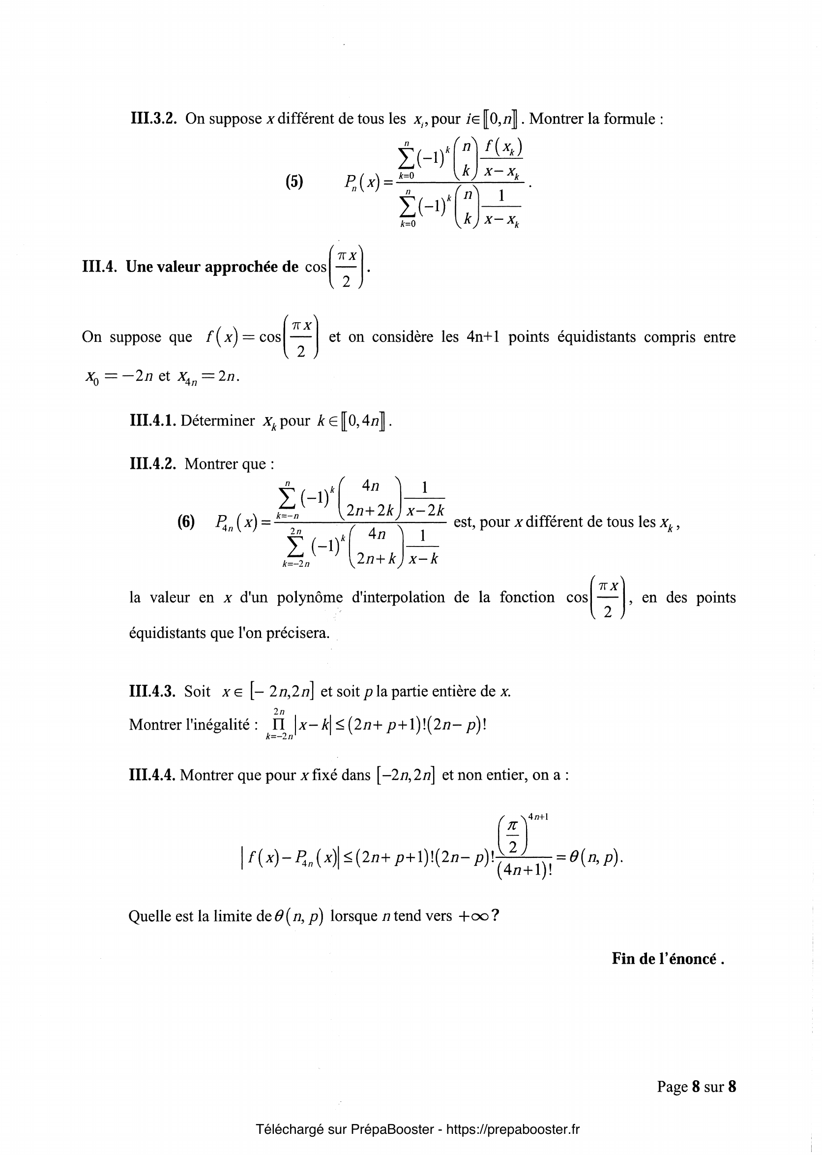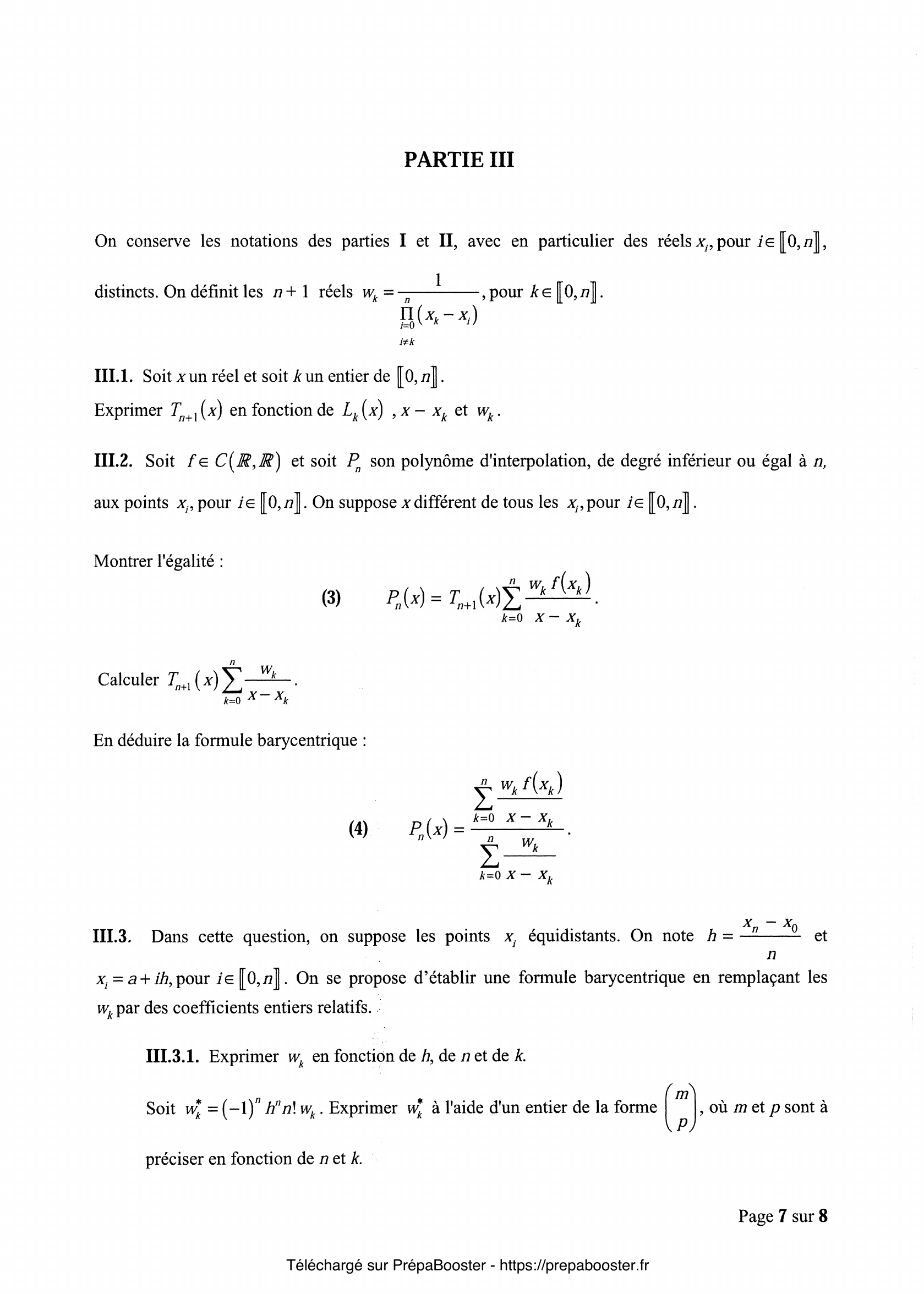 1. I.1.1. Justifier rapidement l’affirmation : $B$ définit un produit scalaire sur $\mathbb{R}_n[X]$ mais pas sur $C(\mathbb{R}, \mathbb{R})$. 2. I.1.2. Pour $j$ et $k$ entiers de $[0,n]$, calculer $L_k(x_j)$. Montrer que la famille $(L_k)_{k \in [0,n]}$ est une base orthonormale de l’espace euclidien $\mathbb{R}_n[X]$ pour le produit scalaire $B$. 3. I.2.1. Pour tout $k \in [0,n]$, exprimer $B(f, L_k)$ en fonction de $f(x_k)$. En déduire que $P_n(f)$ vérifie $P_n(f)(x_k) = f(x_k)$ pour tout $k \in [0,n]$. 4. I.2.2. Montrer que $P_n(f)$ est l’unique polynôme $P \in \mathbb{R}_n[X]$, vérifiant $P(x_k) = f(x_k)$ pour tout $k \in [0,n]$. 5. I.2.3. Expliciter $P_n(f)$ lorsque $f \in \mathbb{R}_n[X]$. Préciser le polynôme $\sum\limits_{k=0}^n L_k(X)$ et, pour $x$ réel, la valeur de la somme $\sum\limits_{k=0}^n L_k(x)$.} 6. I.3.1. Justifier l’inégalité : $\|\Lambda\| \leq N_{\infty}(\Phi)$. 7. I.3.2. Montrer qu’il existe un nombre réel $\tau \in [a, b]$ tel que $N_{\infty}(\Phi) = \Phi(\tau)$. 8. I.3.3. Soit $\tau \in [a, b]$ tel que $N_{\infty}(\Phi) = \Phi(\tau)$. Pour tout $k \in [0, n]$, on définit $\varepsilon_k$ par $\varepsilon_k = 0$ lorsque $L_k(\tau)=0$ et $\varepsilon_k = \frac{L_k(x)}{L_k(\tau)}$ lorsque $L_k(\tau) \neq 0$. Soit $\psi$ la fonction définie sur $[a, b]$ vérifiant les propriétés suivantes : \begin{itemize} \item $\psi$ est continue sur $[a, b]$, \item pour tout $k \in [0, n]$, $\psi(x_k)=\varepsilon_k$, \item pour tout $k \in [0, n-1]$ la restriction de $\psi$ à chaque intervalle $[x_k, x_{k+1}]$ est de la forme $\psi(t) = a_k t + b_k$ où $a_k$ et $b_k$ sont des réels. Les restrictions de $\psi$ à $[a, x_0]$ et à $[x_n, b]$ sont constantes. \end{itemize} En calculant $\Lambda(\psi)(\tau)$ déterminer $\|\Lambda\|$. 9. I.4.1. Montrer que la fonction dérivée $g’$ s’annule en au moins $p$ points de $[a, b]$. 10. I.4.2. En déduire qu’il existe un point $\alpha\in[a, b]$ tel que $g^{(p)}(\alpha)=0$.} 11. I.5.1. Montrer qu’il existe un réel $r$ tel que, pour tout $x \in \mathbb{R}$, on ait : \[ P_{n+1}(x) – P_n(x) = r T_{n+1}(x). \] 12. I.5.2. En appliquant à la fonction $g = f – P_{n+1}$ un résultat obtenu en I.4., montrer qu’il existe un réel $\beta \in [a, b]$ tel que : $f^{(n+1)}(\beta) = r(n+1)!$\\ En déduire que pour tout $y \in [a, b]$, il existe $\beta \in [a, b]$ tel que : \[ f(y) – P_n(f)(y) = \frac{1}{(n+1)!} T_{n+1}(y) f^{(n+1)}(\beta). \] 13. I.5.3. Montrer que l’égalité (1) est aussi vérifiée lorsque l’on remplace $y$ par l’un des $x_i$, pour $i \in [0, n]$. 14. II.1.1. Montrer que la fonction $\varphi$ admet un maximum sur l’intervalle $[0, n]$. 15. II.1.2. Soit $t \in [0, n]$ : comparer $\varphi(n-t)$ et $\varphi(t)$.} 16. II.1.3. On suppose $t > 1$ et $t \in \mathbb{N}$. Calculer $\dfrac{\varphi(t-1)}{\varphi(t)}$.\\ En déduire que pour $t \in [1, \frac{n}{2}]$, on a $\varphi(t-1) \geq \varphi(t)$. 17. II.1.4. On suppose $n$ pair et on note $n = 2p$. Montrer que $\varphi$ atteint son maximum en un point de l’intervalle $[0, 1]$ en supposant d’abord que $p = 1$ puis $p \geq 2$.\\ On admettra que pour $n$ impair, $\varphi$ atteint son maximum en un point de $[0, 1]$. 18. II.2.1. Soit $t \in \mathbb{N}$, expliciter $\ln(\varphi(t))$, où $\ln$ désigne la fonction logarithme népérien ; en déduire $\frac{\varphi'(t)}{\varphi(t)}$ en fonction de $\sum\limits_{k=0}^n \frac{1}{t-k}$. 19. II.2.2. Pour $t \in [\frac{1}{2}, 1[$, déterminer le signe de la somme $\sum\limits_{k=2}^n \frac{1}{t-k}$. En déduire que $\varphi'(t)$ est strictement négatif sur l’intervalle $[\frac{1}{2}, 1[$. 20. II.2.3. Calculer la dérivée de la fonction définie sur $]0,1[$ par : $g(t) = \sum\limits_{k=0}^{n} \frac{1}{t-k}$.\\ Déterminer le sens de variation de la fonction $g$. En déduire que la fonction $\varphi’$ s’annule en au plus un point de $]0,1[$.} 21. II.2.4. Montrer que le maximum de $\varphi$ est atteint en un point et un seul de $]0, \frac{1}{2}[$, noté $t_n$.\\ Quelle est la valeur de la somme $\sum\limits_{k=0}^{n} \frac{1}{t_n – k}$ ? 22. II.3.1. On suppose $k \in \mathbb{N}^*$, justifier l’inégalité $\frac{1}{k-t_n} > \frac{1}{k}$\\ En déduire une minoration de $\frac{1}{t_n}$. 23. II.3.2. Préciser la nature de la série $\sum\limits_{k=1}^{+\infty} \frac{1}{k}$.\\ En déduire la limite de $\frac{1}{t_n}$ et par suite, celle de $t_n$ lorsque $n \to +\infty$. 24. II.4.1. Montrer l’inégalité $\int_1^{n+1} \frac{dt}{t} < \sum\limits_{k=1}^n \frac{1}{k}$. 25. II.4.2. En déduire, que pour tout $t \in [0, n]$, on a la majoration $\varphi(t) < \frac{n!}{\ln(n+1)}$.} 26. II.5.1. Pour $x \in [a, b]$, on note $t = \frac{x-a}{h} \in [0, n]$. On note $T_{n+1}$ le polynôme défini en I.5 par $T_{n+1}(x) = \prod\limits_{j=0}^n (x-x_j)$. Exprimer $T_{n+1}(x)$ en fonction de $h$ et de $\varphi(t)$. 27. II.5.2. Soit $f \in C^{n+1}([a, b], \mathbb{R})$ et soit $P_n$ son polynôme d’interpolation, de degré inférieur ou égal à $n$, aux points équirépartis $x_i$, pour $i \in [0, n]$, défini en I.2. Montrer l’inégalité : \[ N_{\infty}(f - P_n) \leq \frac{N_{\infty}(f^{(n+1)})}{(n+1)! \ln(n+1)} N_{\infty}(\varphi). \] 28. III.1. Soit $x$ un réel et soit $k$ un entier de $[0, n]$.\\ Exprimer $T_{n+1}(x)$ en fonction de $L_k(x)$, $x-x_k$ et $w_k$. 29. III.2. Soit $f \in C(\mathbb{R}, \mathbb{R})$ et soit $P_n$ son polynôme d’interpolation, de degré inférieur ou égal à $n$, aux points $x_p$, pour $i \in [0,n]$. On suppose $x$ différent de tous les $x_p$, pour $i \in [0, n]$.\\ Montrer l’égalité : \[ P_n(x) = T_{n+1}(x) \left( \sum_{k=0}^n \frac{w_k f(x_k)}{x - x_k} \right) \] Calculer $T_{n+1}(x) \sum\limits_{k=0}^n \frac{w_k}{x-x_k}$.\\ En déduire la formule barycentrique : \[ P_n(x) = \frac{\sum\limits_{k=0}^n \frac{w_k f(x_k)}{x-x_k}}{\sum\limits_{k=0}^n \frac{w_k}{x-x_k}} \] 30. III.3.1. Exprimer $w_k$ en fonction de $h$, de $n$ et de $k$.\\ Soit $w_k^* = (-1)^k h^n!