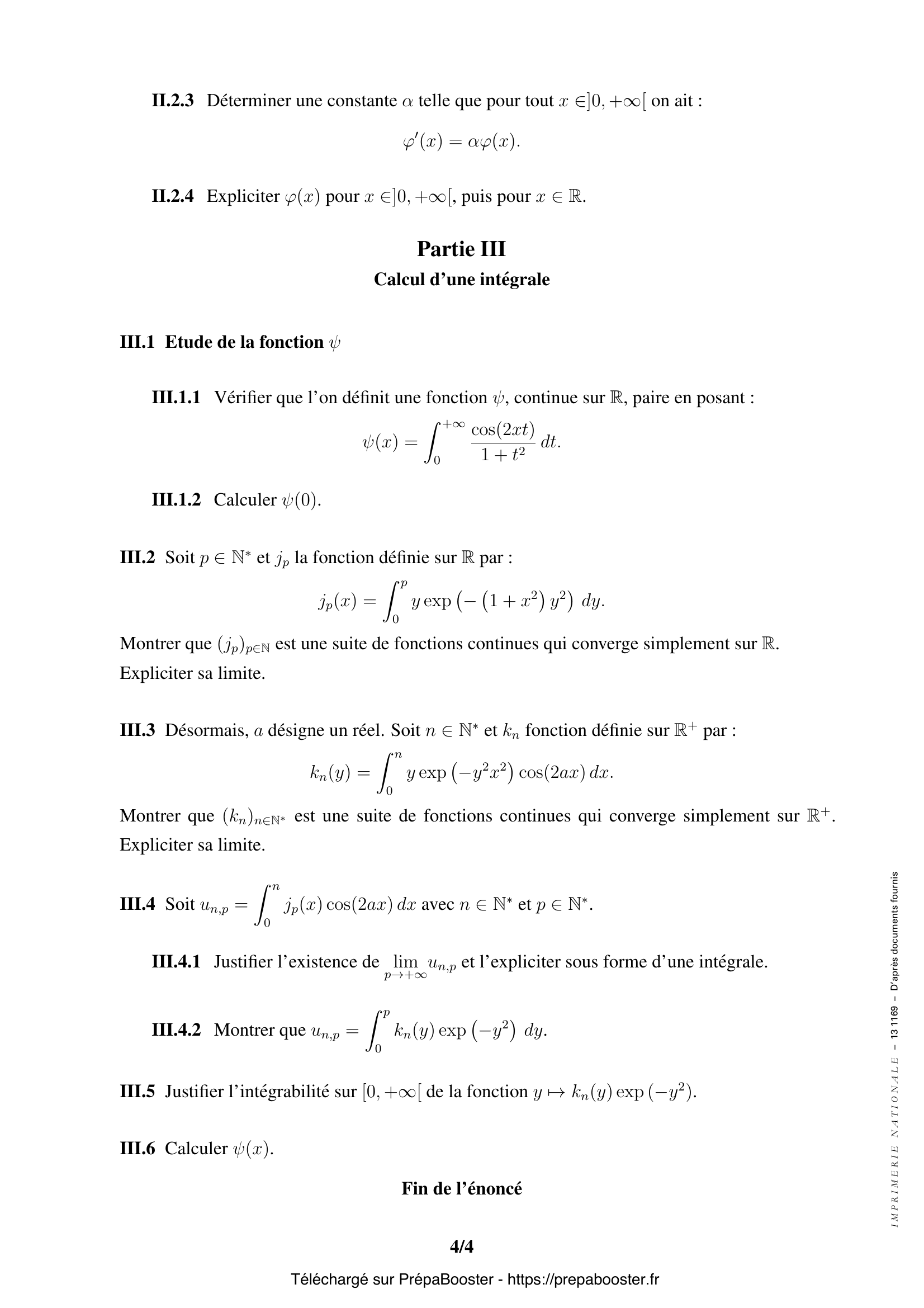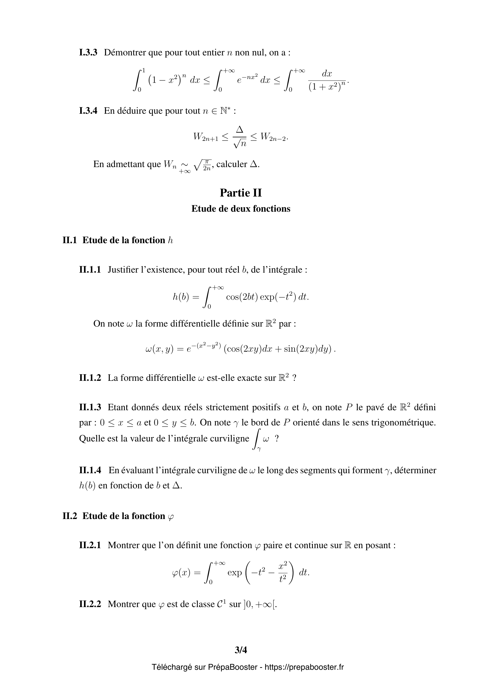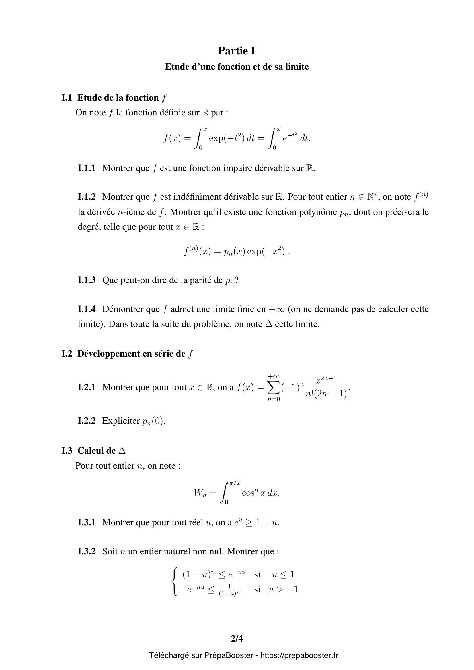1. I.1.1 Montrer que $f$ est une fonction impaire dérivable sur $\mathbb{R}$. 2. I.1.2 Montrer que $f$ est indéfiniment dérivable sur $\mathbb{R}$. Pour tout entier $n \in \mathbb{N}^*$, on note $f^{(n)}$ la dérivée $n$-ième de $f$. Montrer qu’il existe une fonction polynôme $p_n$, dont on précisera le degré, telle que pour tout $x \in \mathbb{R}$ :\\ $f^{(n)}(x) = p_n(x) \exp(-x^2)$. 3. I.1.3 Que peut-on dire de la parité de $p_n$ ? 4. I.1.4 Démontrer que $f$ admet une limite finie en $+\infty$ (on ne demande pas de calculer cette limite). Dans toute la suite du problème, on note $\Delta$ cette limite. 5. I.2.1 Montrer que pour tout $x \in \mathbb{R}$, on a $f(x) = \sum\limits_{n=0}^{+\infty} \frac{(-1)^n x^{2n+1}}{n!(2n+1)}$.} 6. I.2.2 Expliciter $p_n(0)$. 7. I.3.1 Montrer que pour tout réel $u$, on a $e^u \geq 1 + u$. 8. I.3.2 Soit $n$ un entier naturel non nul. Montrer que :\\ \( \left\{ \begin{array}{ll} (1-u)^n \leq e^{-nu} & \text{si } u \leq 1 \\ e^{-nu} \leq \frac{1}{(1+u)^n} & \text{si } u > -1 \end{array} \right. \) 9. I.3.3 Démontrer que pour tout entier $n$ non nul, on a :\\ \( \int_{0}^{1} (1-x^2)^n dx \leq \int_{0}^{+\infty} e^{-nx^2} dx \leq \int_{0}^{+\infty} \frac{dx}{(1+x^2)^n}. \) 10. I.3.4 En déduire que pour tout $n \in \mathbb{N}^*$ :\\ $W_{2n+1} \leq \frac{\Delta}{\sqrt{n}} \leq W_{2n-2}$.\\ En admettant que $W_n \sim_{+\infty} \frac{\pi}{2n}$, calculer $\Delta$.} 11. II.1.1 Justifier l’existence, pour tout réel $b$, de l’intégrale :\\ $ h(b) = \int_{0}^{+\infty} \cos(2bt)\exp(-t^2) dt. $ 12. II.1.2 La forme différentielle $\omega$ est-elle exacte sur $\mathbb{R}^2$ ? 13. II.1.3 Étant donnés deux réels strictement positifs $a$ et $b$, on note $P$ le pavé de $\mathbb{R}^2$ défini par : $0 \leq x \leq a$ et $0 \leq y \leq b$. On note $\gamma$ le bord de $P$ orienté dans le sens trigonométrique. Quelle est la valeur de l’intégrale curviligne $\int_{\gamma} \omega$ ? 14. II.1.4 En évaluant l’intégrale curviligne de $\omega$ le long des segments qui forment $\gamma$, déterminer $h(b)$ en fonction de $b$ et $\Delta$. 15. II.2.1 Montrer que l’on définit une fonction $\varphi$ paire et continue sur $\mathbb{R}$ en posant :\\ $ \varphi(x) = \int_{0}^{+\infty} \exp\left(-t^2 – \frac{x^2}{t^2}\right) dt. $ } 16. II.2.2 Montrer que $\varphi$ est de classe $\mathcal{C}^1$ sur $]0, +\infty[$. 17. II.2.3 Déterminer une constante $\alpha$ telle que pour tout $x \in ]0, +\infty[$ on ait :\\ $\varphi'(x) = \alpha \varphi(x)$. 18. II.2.4 Expliciter $\varphi(x)$ pour $x \in ]0, +\infty[$, puis pour $x \in \mathbb{R}$. 19. III.1.1 Vérifier que l’on définit une fonction $\psi$, continue sur $\mathbb{R}$, paire en posant :\\ $ \psi(x) = \int_{0}^{+\infty} \frac{\cos(2xt)}{1+t^2} dt. $ 20. III.1.2 Calculer $\psi(0)$.} 21. III.2 Soit $p \in \mathbb{N}^{*}$ et $j_p$ la fonction définie sur $\mathbb{R}$ par :\\ $j_p(x) = \int_{0}^{p} y \exp\left(- (1 + x^2) y^2\right) dy.$\\ Montrer que $(j_p)_{p \in \mathbb{N}}$ est une suite de fonctions continues qui converge simplement sur $\mathbb{R}$. Expliciter sa limite. 22. III.3 Désormais, $a$ désigne un réel. Soit $n \in \mathbb{N}^*$ et $k_n$ fonction définie sur $\mathbb{R}_+$ par :\\ $k_n(y) = \int_{0}^{n} y\exp(-y^2 x^2)\cos(2ax) dx.$\\ Montrer que $(k_n)_{n \in \mathbb{N}^*}$ est une suite de fonctions continues qui converge simplement sur $\mathbb{R}_+$. Expliciter sa limite. 23. III.4 Soit $u_{n,p} = \int_{0}^{n} j_p(x) \cos(2ax) dx$ avec $n \in \mathbb{N}^*$ et $p \in \mathbb{N}^*$. 24. III.4.1 Justifier l’existence de $\lim\limits_{p\to+\infty} u_{n,p}$ et l’expliciter sous forme d’une intégrale. 25. III.4.2 Montrer que $u_{n,p} = \int_{0}^p k_n(y)\exp(-y^2)dy$.} 26. III.5 Justifier l’intégrabilité sur $[0,+\infty[$ de la fonction $y \mapsto k_n(y)\exp(-y^2)$. 27. III.6 Calculer $\psi(x)$.}FAQ