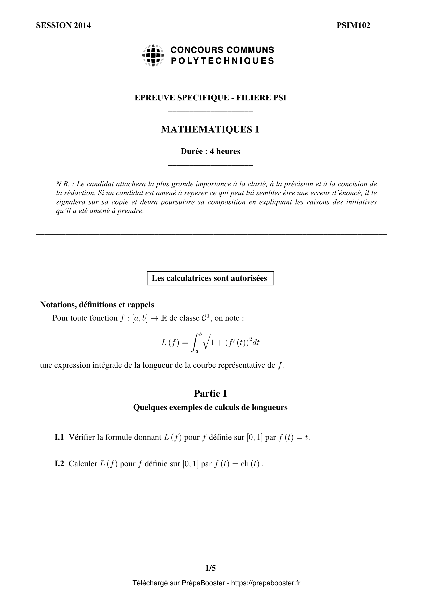 Pour l’épreuve de mathématiques PSI CCINP 2014, tu dois être à l’aise avec le calcul intégral (intégrales généralisées, intégration par parties), les développements en séries entières, la longueur d’arc d’une courbe, l’étude de suites, la convergence de séries et d’intégrales, ainsi que les normes sur les espaces de fonctions. Ces notions sont transversales et incontournables non seulement pour le sujet 2014, mais pour l’ensemble du programme de PSI.
