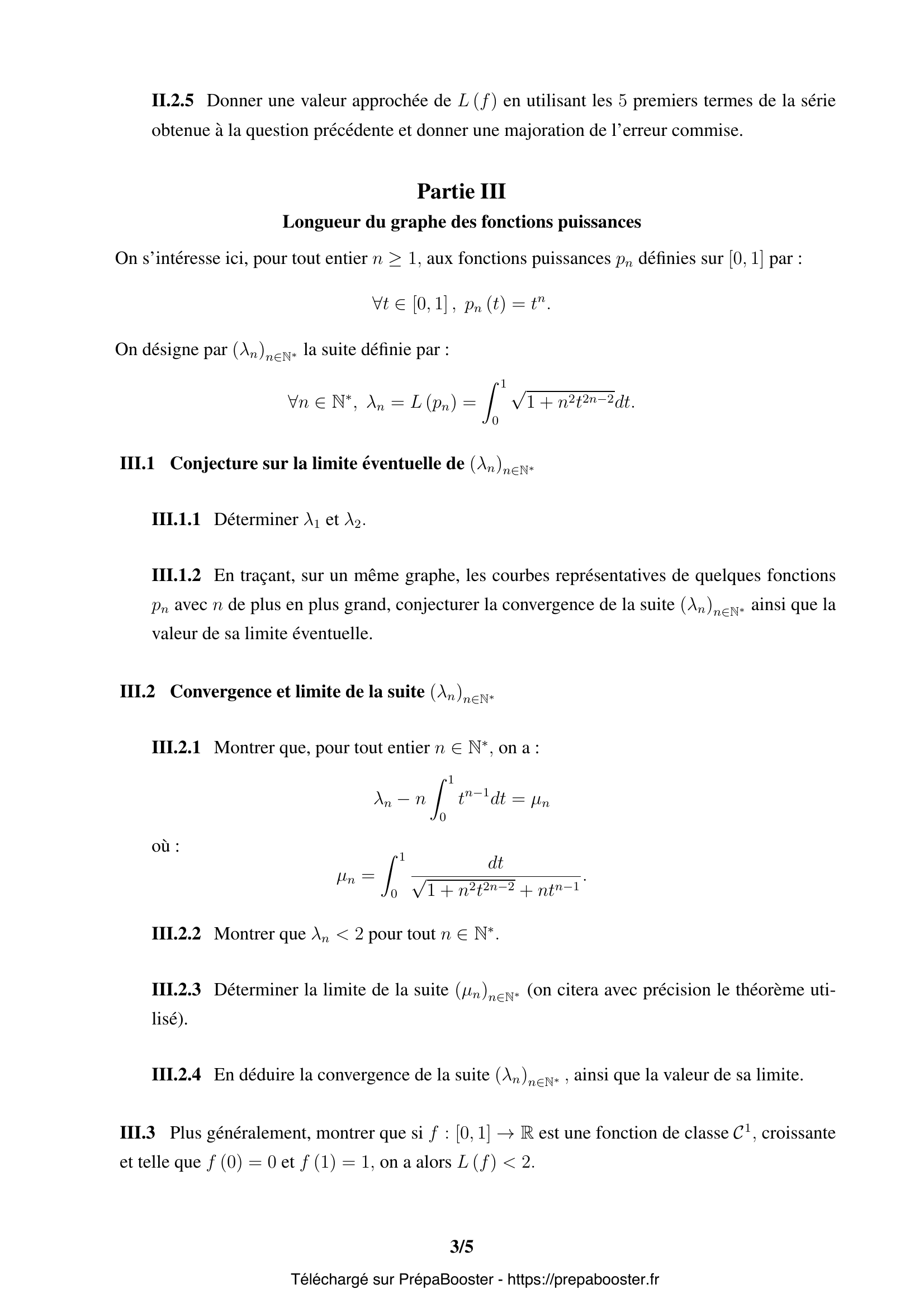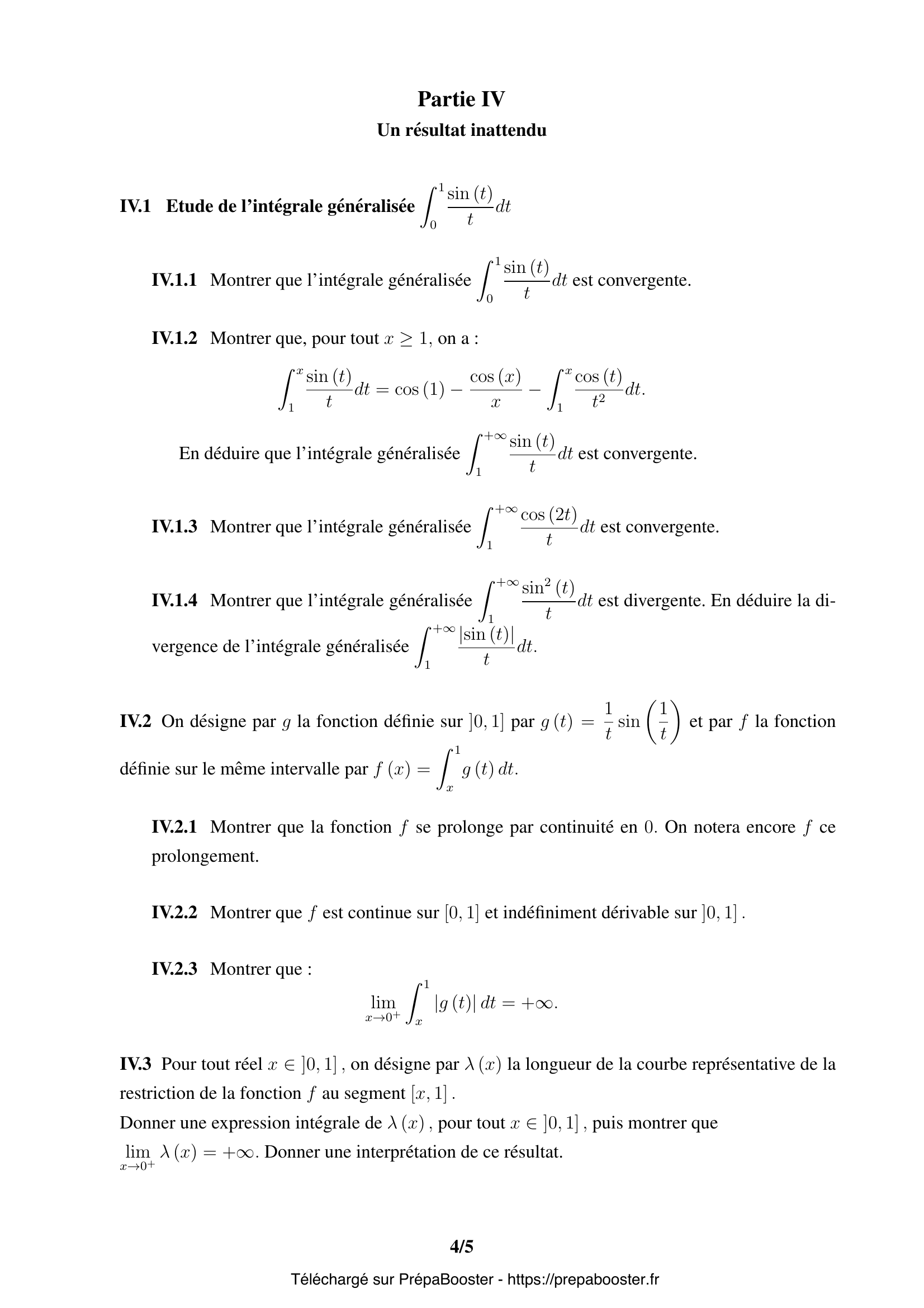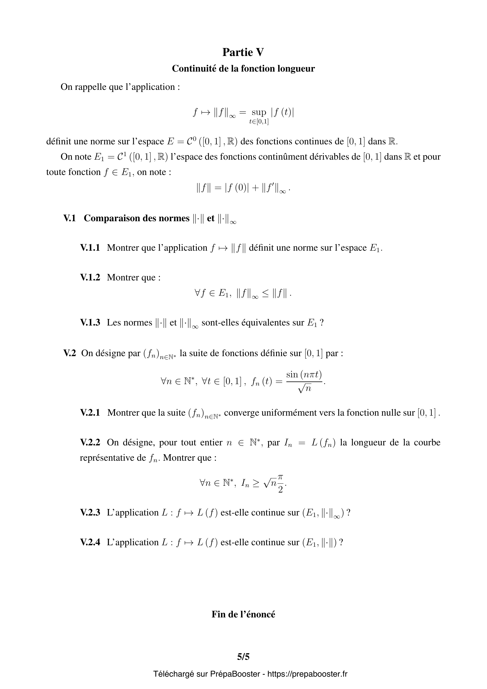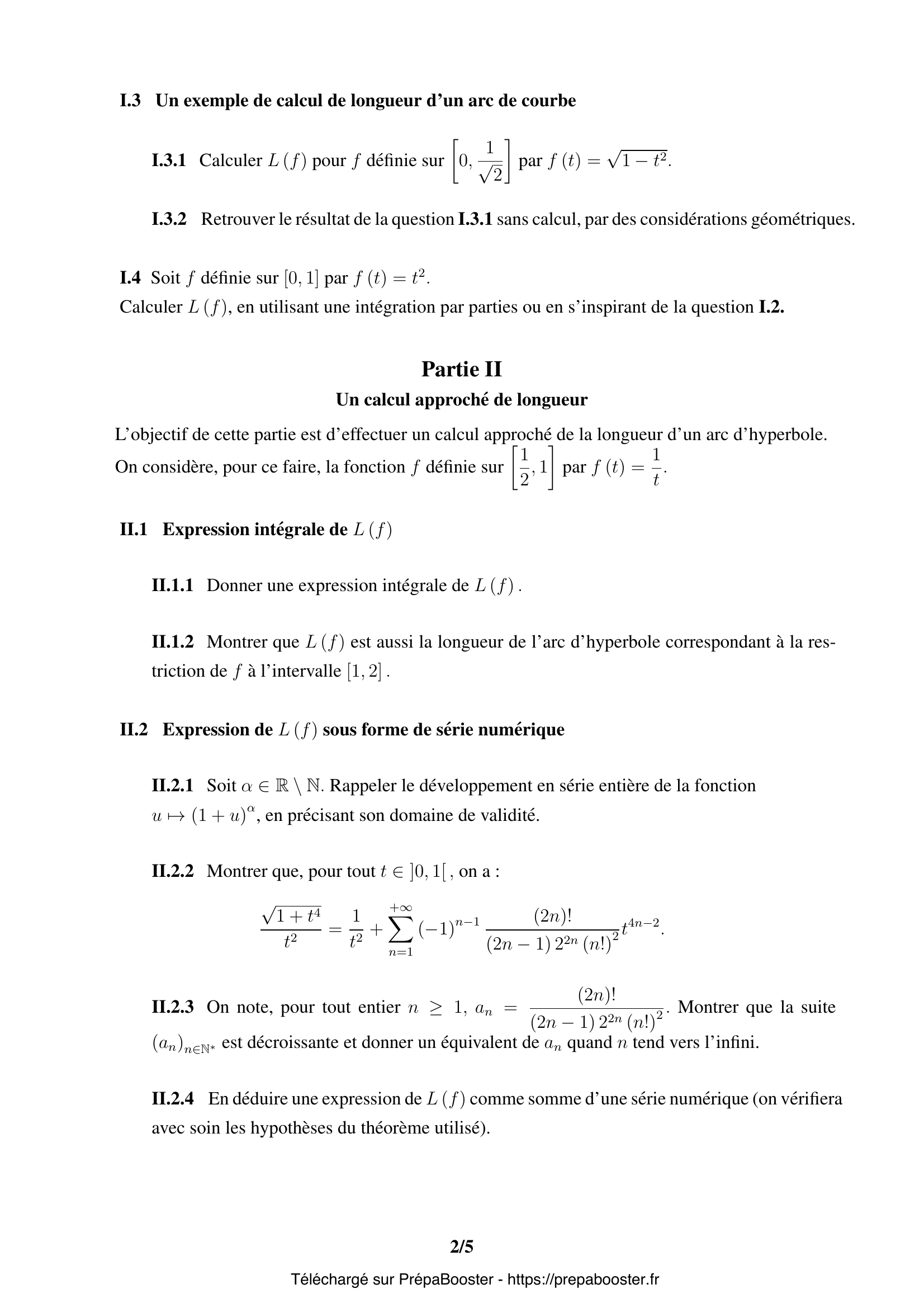 1. I.1 Vérifier la formule donnant $L(f)$ pour $f$ définie sur $[0, 1]$ par $f (t) = t$. 2. I.2 Calculer $L (f)$ pour $f$ définie sur $[0, 1]$ par $f (t) = \ch (t)$. 3. I.3.1 Calculer $L(f)$ pour $f$ définie sur $\left[0, \frac{1}{\sqrt{2}}\right]$ par $f (t) = \sqrt{1 – t^2}$. 4. I.3.2 Retrouver le résultat de la question I.3.1 sans calcul, par des considérations géométriques. 5. I.4 Soit $f$ définie sur $[0, 1]$ par $f (t) = t^2$. Calculer $L (f)$, en utilisant une intégration par parties ou en s’inspirant de la question I.2.} 6. II.1.1 Donner une expression intégrale de $L (f)$. 7. II.1.2 Montrer que $L (f)$ est aussi la longueur de l’arc d’hyperbole correspondant à la restriction de $f$ à l’intervalle $[1, 2]$. 8. II.2.1 Soit $\alpha \in \mathbb{R} \setminus \mathbb{N}$. Rappeler le développement en série entière de la fonction $u \mapsto (1 + u)^{\alpha}$, en précisant son domaine de validité. 9. II.2.2 Montrer que, pour tout $t \in~]0, 1[$, on a : $$\frac{\sqrt{1 + t^{4}}}{t^2} = \frac{1}{t^2} + \sum_{n=1}^{+\infty} \frac{(-1)^{n-1} (2n)!}{(2n – 1)\ 2^{2n}\ (n!)^2}\ t^{4n-2}.$$ 10. II.2.3 On note, pour tout entier $n \geq 1$, $a_n = \frac{(2n)!}{(2n-1) 2^{2n} (n!)^2}$. Montrer que la suite $(a_n)_{n \in \mathbb{N}^*}$ est décroissante et donner un équivalent de $a_n$ quand $n$ tend vers l’infini.} 11. II.2.4 En déduire une expression de $L(f)$ comme somme d’une série numérique (on vérifiera avec soin les hypothèses du théorème utilisé). 12. II.2.5 Donner une valeur approchée de $L (f)$ en utilisant les 5 premiers termes de la série obtenue à la question précédente et donner une majoration de l’erreur commise. 13. III.1.1 Déterminer $\lambda_1$ et $\lambda_2$. 14. III.1.2 En traçant, sur un même graphe, les courbes représentatives de quelques fonctions $p_n$ avec $n$ de plus en plus grand, conjecturer la convergence de la suite $(\lambda_n)_{n \in \mathbb{N}^*}$ ainsi que la valeur de sa limite éventuelle. 15. III.2.1 Montrer que, pour tout entier $n \in \mathbb{N}^*$, on a : $$\lambda_n – n \int_0^1 t^{n-1} dt = \mu_n,$$ où $$\mu_n = \int_0^1 \left(\frac{dt}{\sqrt{1 + n^2 t^{2n-2}}} + n t^{n-1}\right) dt.$$ } 16. III.2.2 Montrer que $\lambda_n < 2$ pour tout $n \in \mathbb{N}^*$. 17. III.2.3 Déterminer la limite de la suite $(\mu_n)_{n \in \mathbb{N}^*}$ (on citera avec précision le théorème utilisé). 18. III.2.4 En déduire la convergence de la suite $(\lambda_n)_{n \in \mathbb{N}^*}$, ainsi que la valeur de sa limite. 19. III.3 Plus généralement, montrer que si $f : [0, 1] \to \mathbb{R}$ est une fonction de classe $\mathcal{C}^1$, croissante et telle que $f (0) = 0$ et $f (1) = 1$, on a alors $L (f) < 2$. 20. IV.1.1 Montrer que l’intégrale généralisée $\int_0^1 \frac{\sin (t)}{t} dt$ est convergente.} 21. IV.1.2 Montrer que, pour tout $x \geq 1$, on a : $$\int_1^x \frac{\sin (t)}{t} dt = \frac{\cos(1) - \cos(x)}{x} - \int_1^x \frac{\cos(t)}{t^2} dt.$$ En déduire que l’intégrale généralisée $\int_1^{+\infty} \frac{\sin (t)}{t} dt$ est convergente. 22. IV.1.3 Montrer que l’intégrale généralisée $\int_1^{+\infty} \frac{\cos (2t)}{t} dt$ est convergente. 23. IV.1.4 Montrer que l’intégrale généralisée $\int_1^{+\infty} \frac{\sin^2(t)}{t} dt$ est divergente. En déduire la divergence de l’intégrale généralisée $\int_1^{+\infty} \frac{|\sin (t)|}{t} dt$. 24. IV.2.1 Montrer que la fonction $f$ se prolonge par continuité en $0$. On notera encore $f$ ce prolongement. 25. IV.2.2 Montrer que $f$ est continue sur $[0, 1]$ et indéfiniment dérivable sur $]0, 1]$.} 26. IV.2.3 Montrer que : $$ \lim_{x \to 0^+} \int_x^1 |g (t)| dt = +\infty. $$ 27. IV.3 Pour tout réel $x \in ]0, 1]$, on désigne par $\lambda (x)$ la longueur de la courbe représentative de la restriction de la fonction $f$ au segment $[x, 1]$. Donner une expression intégrale de $\lambda (x)$, pour tout $x \in ]0, 1]$, puis montrer que $$ \lim_{x \to 0^+} \lambda(x) = +\infty. $$ Donner une interprétation de ce résultat. 28. V.1.1 Montrer que l’application $f \mapsto \|f\|$ définit une norme sur l’espace $E_1$. 29. V.1.2 Montrer que : $\forall f \in E_1, \|f\|_\infty \leq \|f\|$. 30. V.1.3 Les normes $\|\cdot\|$ et $\|\cdot\|_\infty$ sont-elles équivalentes sur $E_1$ ?} 31. V.2.1 Montrer que la suite $(f_n)_{n\in \mathbb{N}^*}$ converge uniformément vers la fonction nulle sur $[0, 1]$. 32. V.2.2 On désigne, pour tout entier $n \in \mathbb{N}^*$, par $I_n = L(f_n)$ la longueur de la courbe représentative de $f_n$. Montrer que : $$ \forall n \in \mathbb{N}^*, \quad I_n \geq \frac{\sqrt{n}}{\pi^2}. $$ 33. V.2.3 L’application $L : f \mapsto L(f)$ est-elle continue sur $(E_1, \|\cdot\|_\infty)$ ? 34. V.2.4 L’application $L : f \mapsto L(f)$ est-elle continue sur $(E_1, \|\cdot\|)$ ?}FAQ