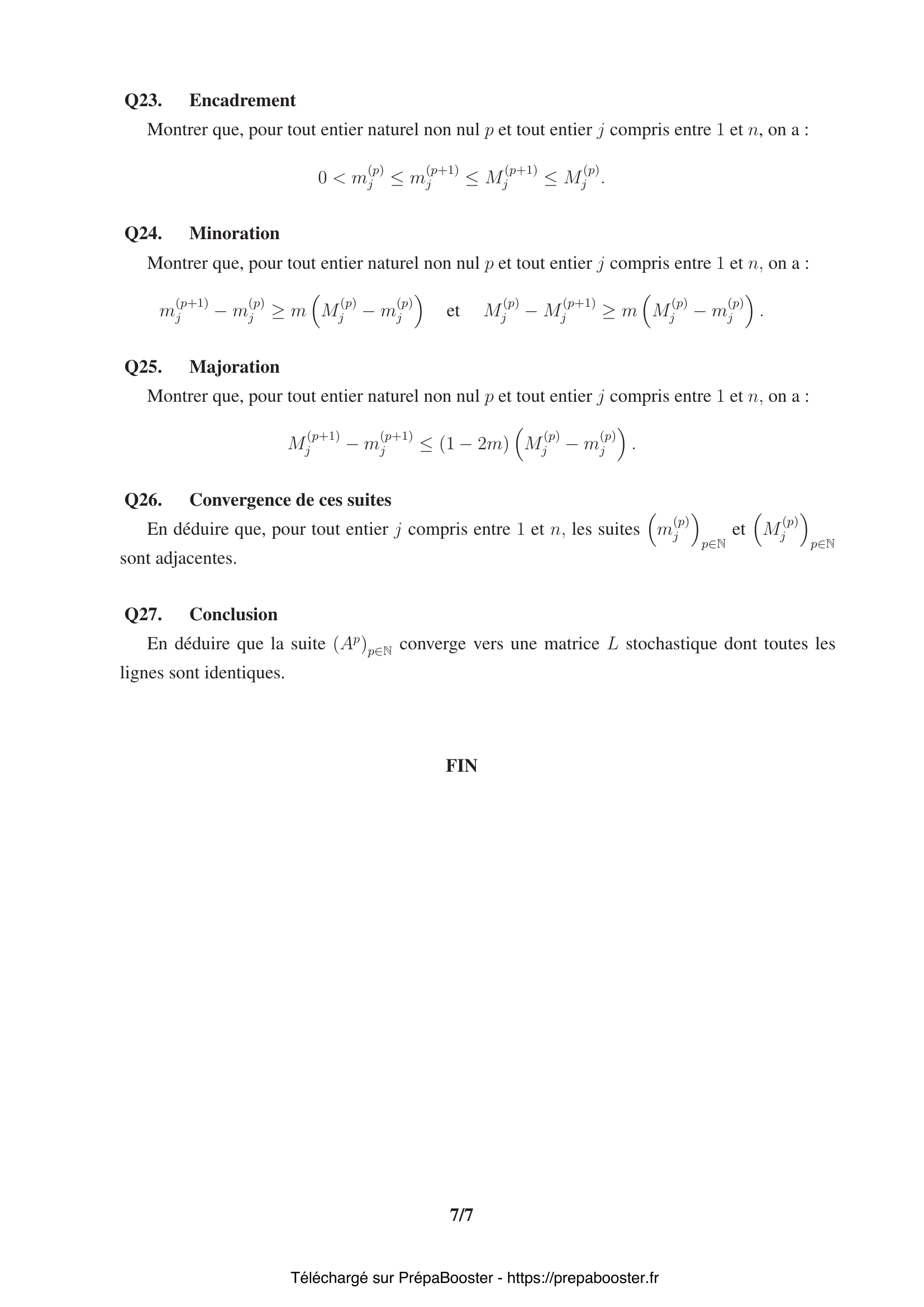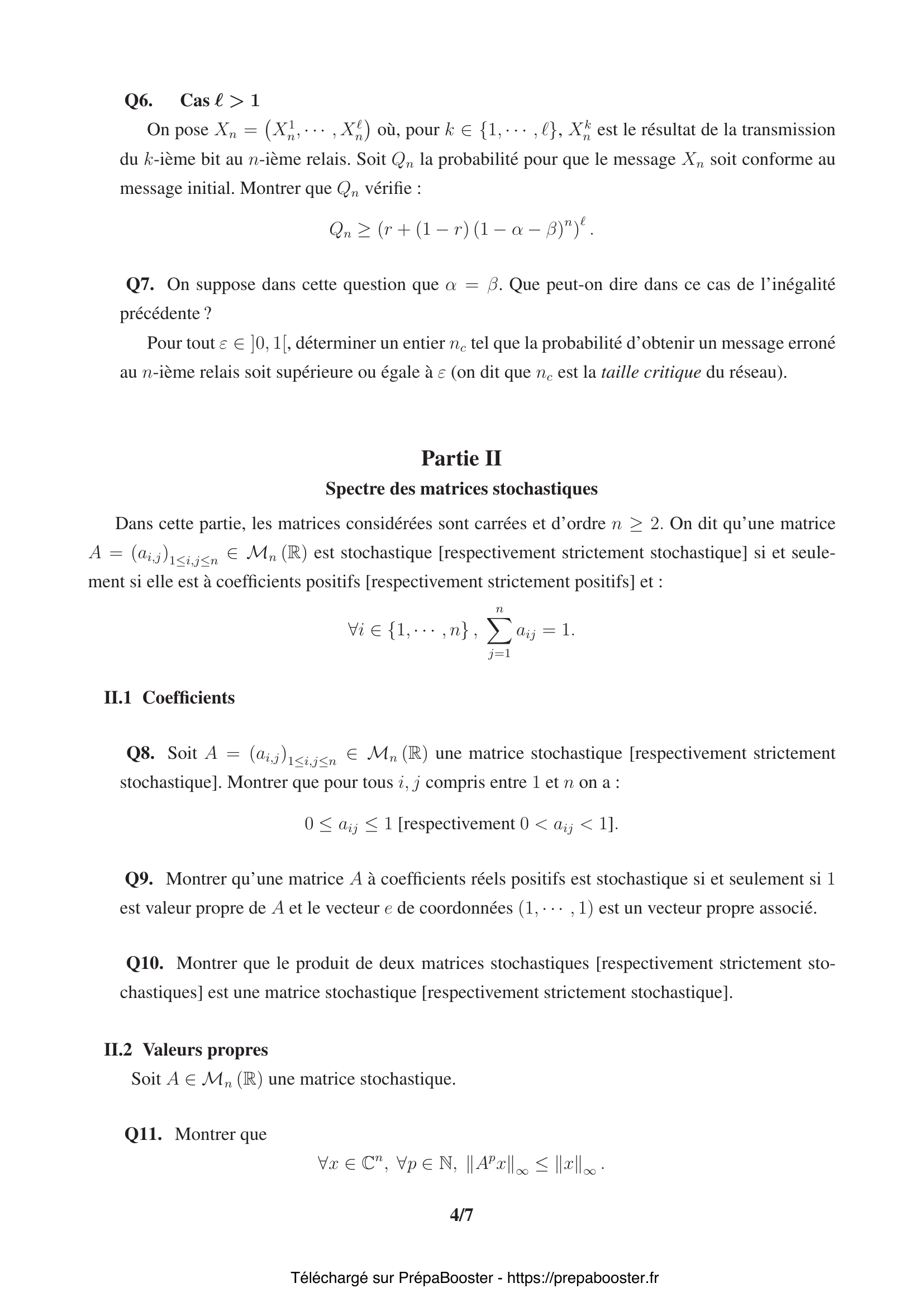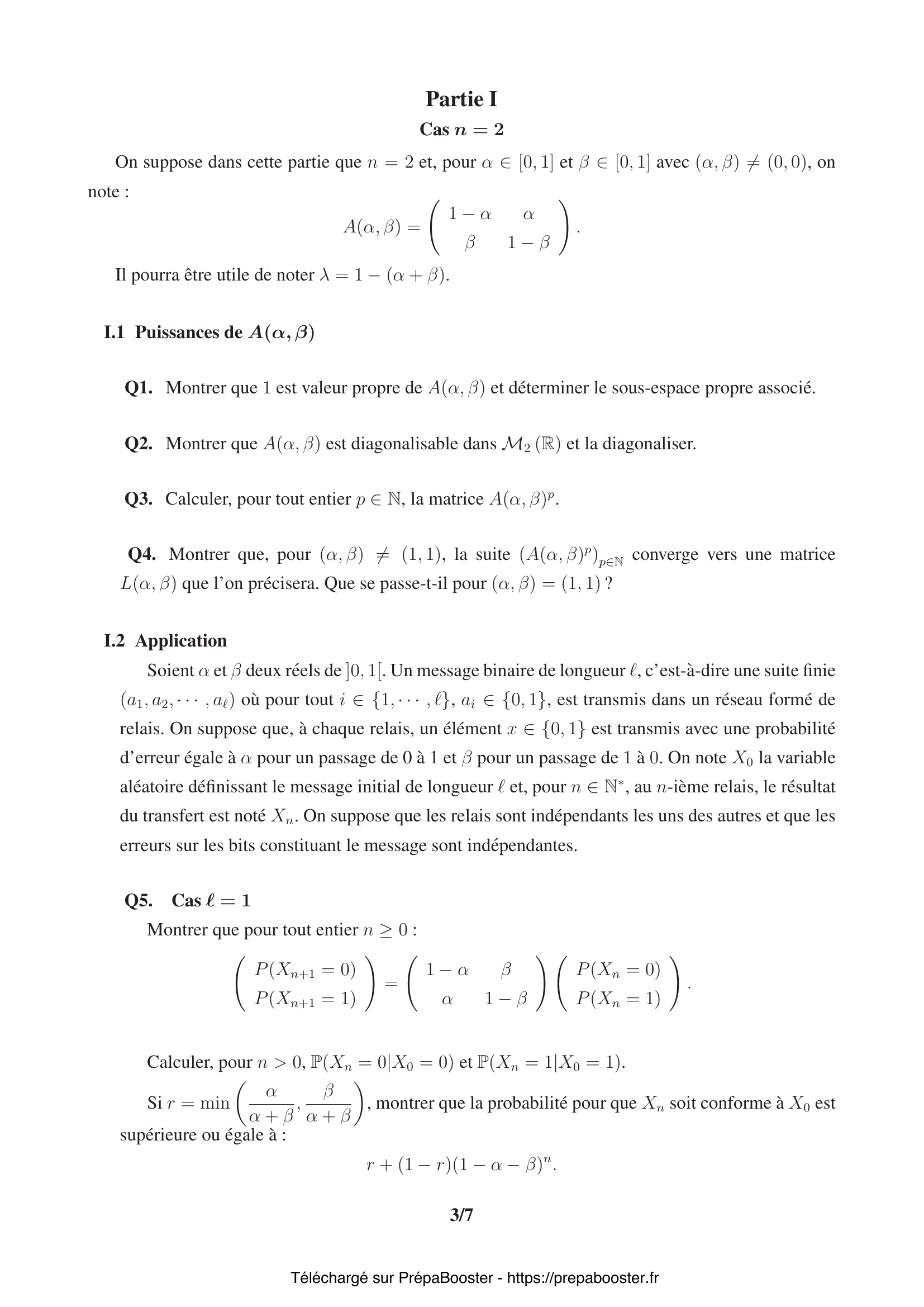 1. Q1. Montrer que 1 est valeur propre de $A(\alpha, \beta)$ et determiner le sous-espace propre associé. 2. Q2. Montrer que $A(\alpha, \beta)$ est diagonalisable dans $M_2(\mathbb{R})$ et la diagonaliser. 3. Q3. Calculer, pour tout entier $p \in \mathbb{N}$, la matrice $A(\alpha, \beta)^p$. 4. Q4. Montrer que, pour $(\alpha, \beta) \neq (1, 1)$, la suite $(A(\alpha, \beta)^p)_{p \in \mathbb{N}}$ converge vers une matrice $L(\alpha, \beta)$ que l’on précisera. Que se passe-t-il pour $(\alpha, \beta) = (1, 1)$ ? 5. Q5. Cas $\ell = 1$\\ Montrer que pour tout entier $n \geq 0$ : \[ \begin{pmatrix} P(X_{n+1} = 0) \\ P(X_{n+1} = 1) \end{pmatrix} = \begin{pmatrix} 1-\alpha & \beta \\ \alpha & 1-\beta \end{pmatrix} \begin{pmatrix} P(X_n = 0) \\ P(X_n = 1) \end{pmatrix} \] Calculer, pour $n > 0$, $P(X_n = 0 \mid X_0 = 0)$ et $P(X_n = 1 \mid X_0 = 1)$.\\ Si $r = \min\left[\frac{\alpha}{\alpha+\beta}, \frac{\beta}{\alpha + \beta}\right]$, montrer que la probabilité pour que $X_n$ soit conforme à $X_0$ est supérieure ou égale à : \[ r + (1 – r)(1 – \alpha – \beta)^n. \]} 6. Q6. Cas $\ell > 1$\\ On pose $X_n = (X_n^1, \dots, X_n^\ell)$ où, pour $k \in \{1, \dots, \ell\}$, $X_n^k$ est le résultat de la transmission du $k$-ième bit au $n$-ième relais. Soit $Q_n$ la probabilité pour que le message $X_n$ soit conforme au message initial. Montrer que $Q_n$ vérifie : \[ Q_n \geq \left[r + (1 – r) (1 – \alpha – \beta)^n\right]^\ell. \] 7. Q7. On suppose dans cette question que $\alpha = \beta$. Que peut-on dire dans ce cas de l’inégalité précédente ?\\ Pour tout $\varepsilon \in ]0,1[$, déterminer un entier $n_c$ tel que la probabilité d’obtenir un message erroné au $n$-ième relais soit supérieure ou égale à $\varepsilon$ (on dit que $n_c$ est la taille critique du réseau). 8. Q8. Soit $A = (a_{i,j})_{1 \leq i,j \leq n} \in M_n(\mathbb{R})$ une matrice stochastique [respectivement strictement stochastique]. Montrer que pour tous $i, j$ compris entre $1$ et $n$ on a : \[ 0 \leq a_{ij} \leq 1 \quad [\text{respectivement } 0 < a_{ij} < 1]. \] 9. Q9. Montrer qu’une matrice $A$ à coefficients réels positifs est stochastique si et seulement si $1$ est valeur propre de $A$ et le vecteur $e$ de coordonnées $(1, \dots, 1)$ est un vecteur propre associé. 10. Q10. Montrer que le produit de deux matrices stochastiques [respectivement strictement stochastiques] est une matrice stochastique [respectivement strictement stochastique].} 11. Q11. Montrer que \[ \forall x \in \mathbb{C}^n, \forall p \in \mathbb{N}, \ \|A^p x\|_\infty \leq \|x\|_\infty. \] 12. Q12. Montrer que $\rho(A) = 1$. 13. Q13. Soit $A$ une matrice quelconque dans $M_n(\mathbb{C})$ et soit $\lambda \in \mathbb{C}$ une valeur propre de $A$. Montrer qu’il existe un indice $i \in \{1, 2, \dots, n\}$ tel que : \[ |\lambda - a_{ii}| \leq \sum_{\substack{j=1 \\ j \neq i}}^n |a_{ij}|. \] 14. Q14. Montrer qu’une matrice $A \in M_n(\mathbb{C})$ à diagonale strictement dominante est inversible. 15. Q15. On désigne par $A_1 = (a_{i,j})_{1 \leq i,j \leq n-1} \in M_{n-1}(\mathbb{R})$ la matrice extraite de $A$ en supprimant sa dernière ligne et sa dernière colonne. Montrer que la matrice $A_1 - I_{n-1}$ est à diagonale strictement dominante. Que peut-on en déduire quant au rang de $A-I$ ?} 16. Q16. Montrer que $\ker(A - I_n)$ est de dimension $1$. 17. Q17. Soit $\lambda \in Sp(A) \setminus \{1\}$. Montrer que $|\lambda| < 1$. 18. Q18. Montrer qu’il existe une matrice $Q$, que l’on déterminera, telle que : \[ P_1 = QP_0. \] Calculer $P_n$ en fonction de $Q$ et de $P_0$. 19. Q19. Montrer qu’il existe un unique vecteur \[ \Pi = \begin{pmatrix} p_1 \\ p_2 \\ p_3 \\ p_4 \end{pmatrix} \] que l’on déterminera, tel que : \[ \forall i \in \{1, \dots, 4\},\; p_i \geq 0, \quad \sum_{i=1}^4 p_i = 1 \text{ et } \Pi = Q\Pi. \] 20. Q20. Montrer sans calcul que $Q$ est diagonalisable sur $\mathbb{R}$.} 21. Q21. Déterminer les valeurs propres et les sous-espaces propres de $Q$. 22. Q22. En déduire que $(Q^p)_{p \in \mathbb{N}}$ converge vers une matrice $R$ que l'on précisera en fonction de $\Pi$ et qu’il existe $r \in ]0, 1[$ tel que : \[ \|Q^p - R\| = O(r^p). \] En déduire que $(P_n)_{n \in \mathbb{N}}$ admet une limite indépendante de la loi de $X_0$ et interpréter le résultat obtenu. 23. Q23. Montrer que, pour tout entier naturel non nul $p$ et tout entier $j$ compris entre $1$ et $n$, on a : \[ 0 < m^{(p)}_j \leq m^{(p+1)}_j \leq M^{(p+1)}_j \leq M^{(p)}_j. \] 24. Q24. Montrer que, pour tout entier naturel non nul $p$ et tout entier $j$ compris entre $1$ et $n$, on a : \[ m^{(p+1)}_j - m^{(p)}_j \geq m \left( M^{(p)}_j - m^{(p)}_j \right) \] et \[ M^{(p)}_j - M^{(p+1)}_j \geq m \left( M^{(p)}_j - m^{(p)}_j \right). \] 25. Q25. Montrer que, pour tout entier naturel non nul $p$ et tout entier $j$ compris entre $1$ et $n$, on a : \[ M^{(p+1)}_j - m^{(p+1)}_j \leq (1 - 2m)(M^{(p)}_j - m^{(p)}_j). \]} 26. Q26. En déduire que, pour tout entier $j$ compris entre $1$ et $n$, les suites $\left(m^{(p)}_j\right)_{p\in\mathbb{N}}$ et $\left(M^{(p)}_j\right)_{p \in \mathbb{N}}$ sont adjacentes. 27. Q27. En déduire que la suite $(A^p)_{p \in \mathbb{N}}$ converge vers une matrice $L$ stochastique dont toutes les lignes sont identiques.}FAQ