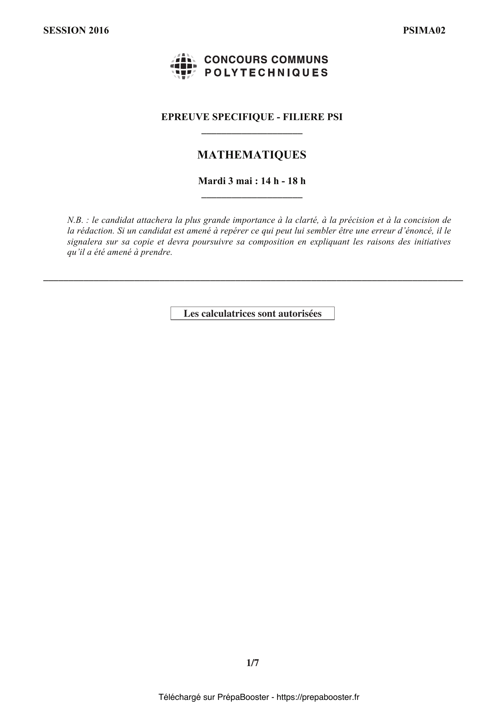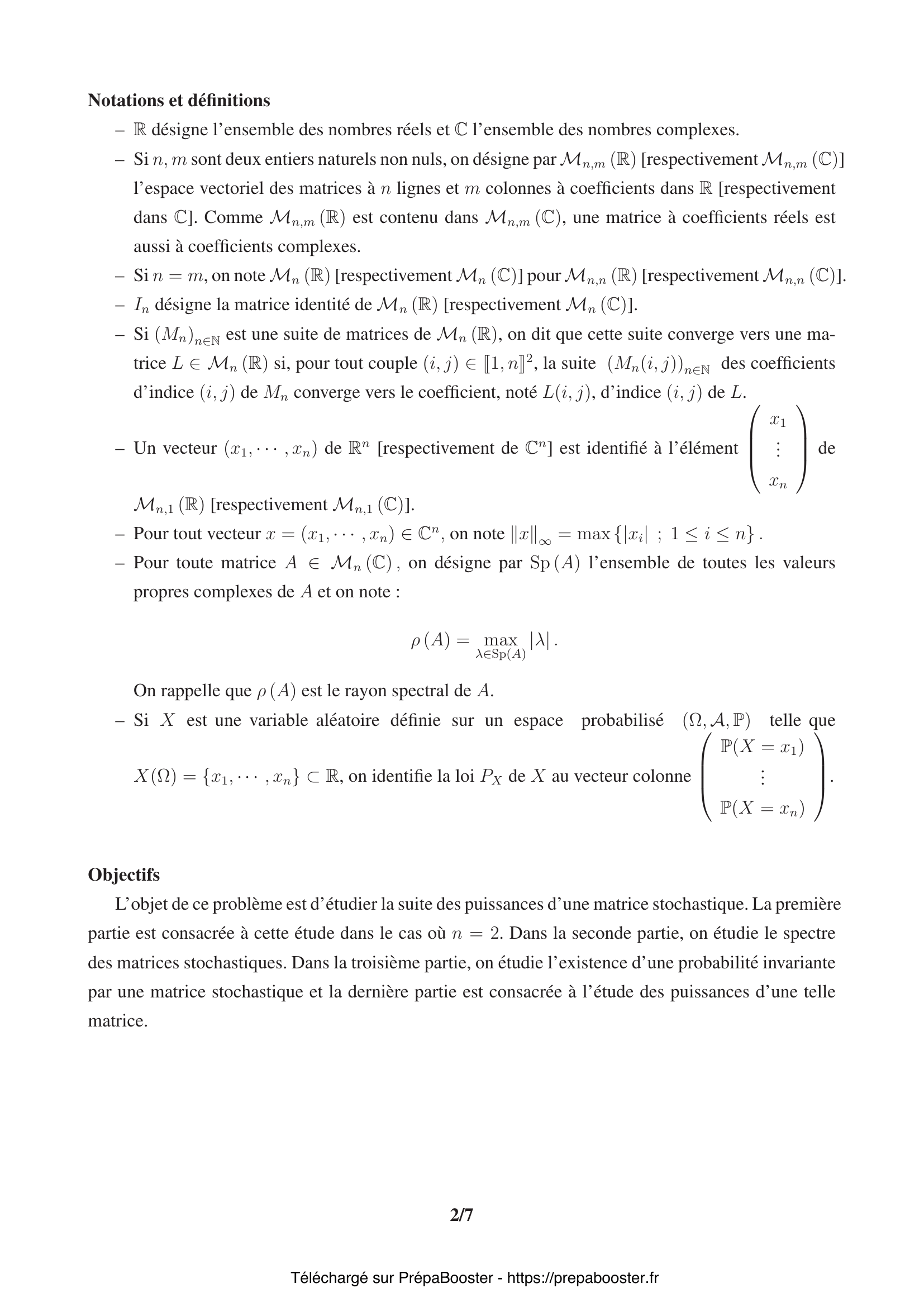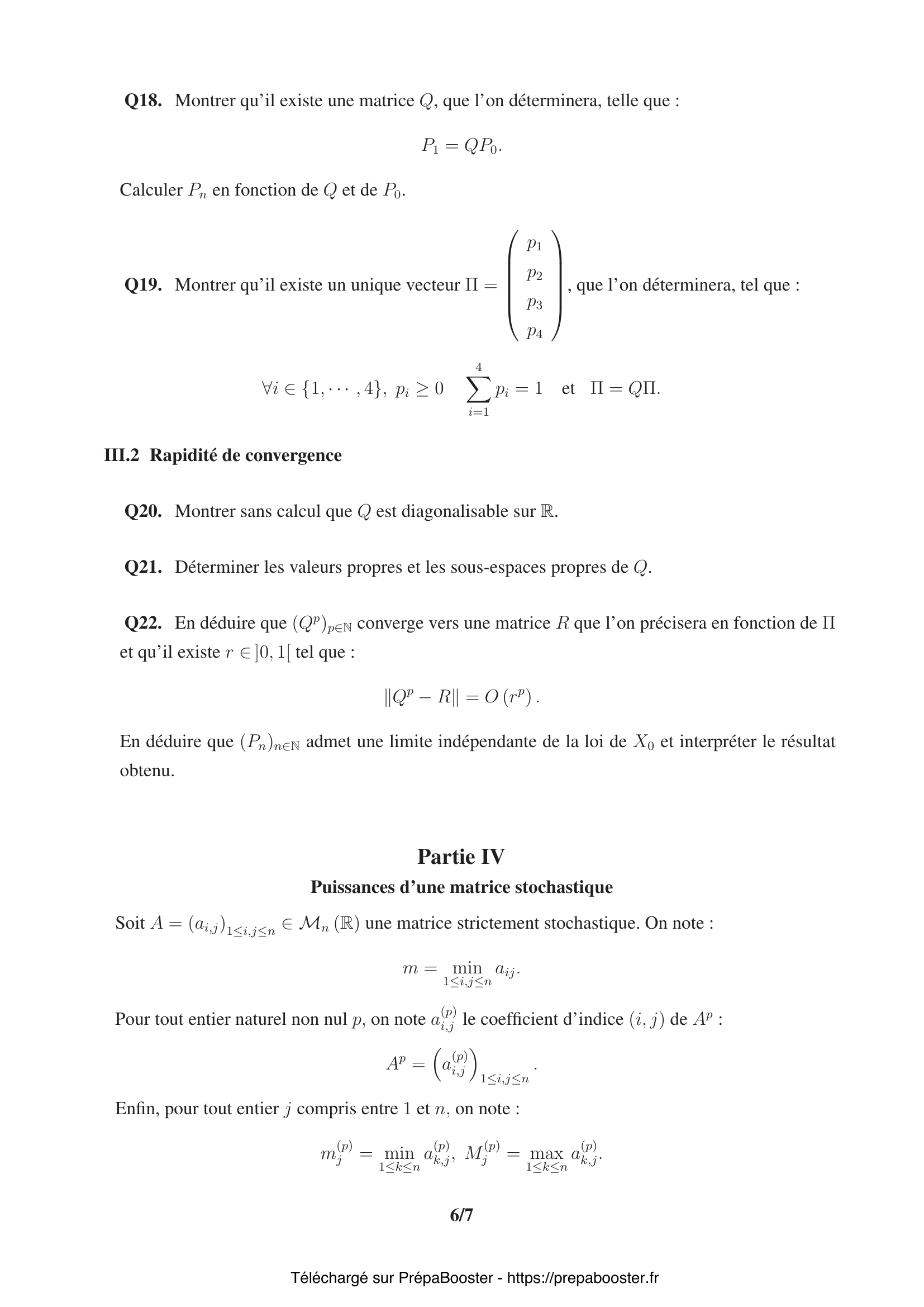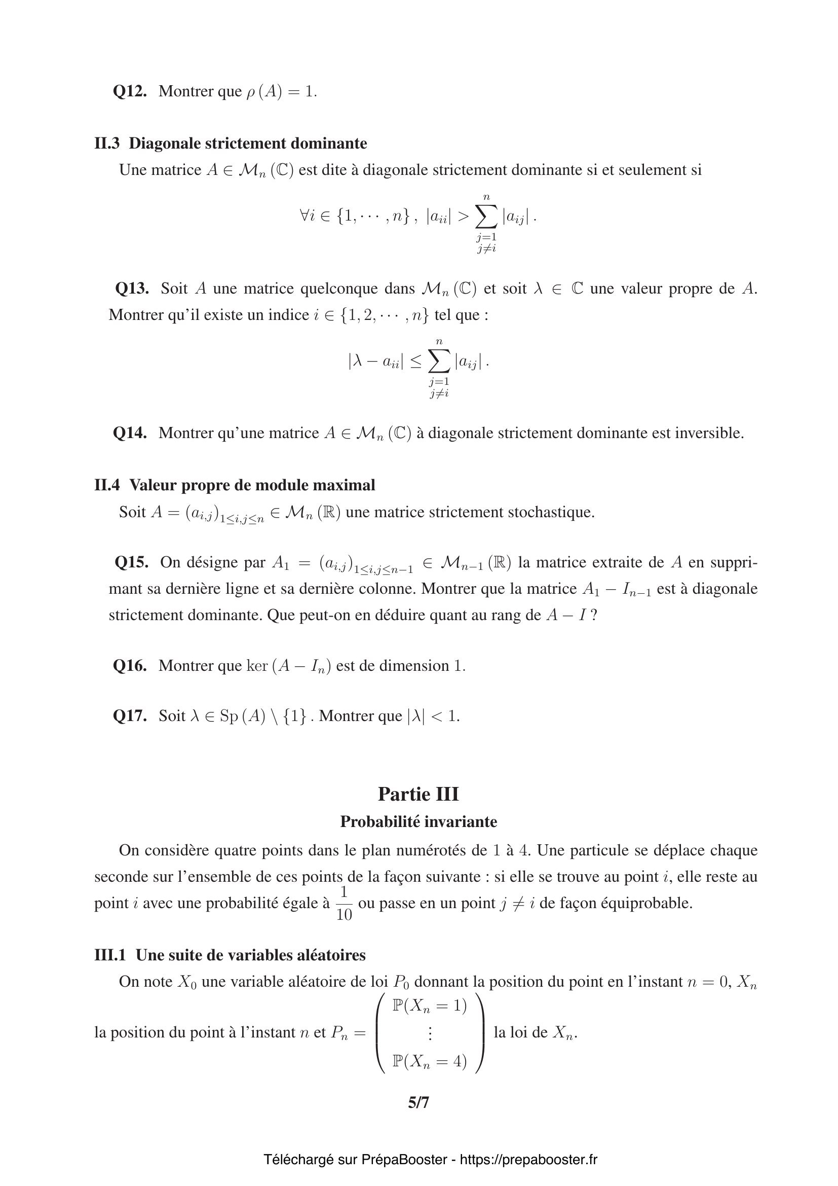 1. Q1. Montrer que 1 est valeur propre de $A(\alpha, \beta)$ et determiner le sous-espace propre associé. 2. Q2. Montrer que $A(\alpha, \beta)$ est diagonalisable dans $M_2(\mathbb{R})$ et la diagonaliser. 3. Q3. Calculer, pour tout entier $p \in \mathbb{N}$, la matrice $A(\alpha, \beta)^p$. 4. Q4. Montrer que, pour $(\alpha, \beta) \neq (1, 1)$, la suite $(A(\alpha, \beta)^p)_{p \in \mathbb{N}}$ converge vers une matrice $L(\alpha, \beta)$ que l’on précisera. Que se passe-t-il pour $(\alpha, \beta) = (1, 1)$ ? 5. Q5. Cas $\ell = 1$\\ Montrer que pour tout entier $n \geq 0$ : \[ \begin{pmatrix} P(X_{n+1} = 0) \\ P(X_{n+1} = 1) \end{pmatrix} = \begin{pmatrix} 1-\alpha & \beta \\ \alpha & 1-\beta \end{pmatrix} \begin{pmatrix} P(X_n = 0) \\ P(X_n = 1) \end{pmatrix} \] Calculer, pour $n > 0$, $P(X_n = 0 \mid X_0 = 0)$ et $P(X_n = 1 \mid X_0 = 1)$.\\ Si $r = \min\left[\frac{\alpha}{\alpha+\beta}, \frac{\beta}{\alpha + \beta}\right]$, montrer que la probabilité pour que $X_n$ soit conforme à $X_0$ est supérieure ou égale à : \[ r + (1 – r)(1 – \alpha – \beta)^n. \]} 6. Q6. Cas $\ell > 1$\\ On pose $X_n = (X_n^1, \dots, X_n^\ell)$ où, pour $k \in \{1, \dots, \ell\}$, $X_n^k$ est le résultat de la transmission du $k$-ième bit au $n$-ième relais. Soit $Q_n$ la probabilité pour que le message $X_n$ soit conforme au message initial. Montrer que $Q_n$ vérifie : \[ Q_n \geq \left[r + (1 – r) (1 – \alpha – \beta)^n\right]^\ell. \] 7. Q7. On suppose dans cette question que $\alpha = \beta$. Que peut-on dire dans ce cas de l’inégalité précédente ?\\ Pour tout $\varepsilon \in ]0,1[$, déterminer un entier $n_c$ tel que la probabilité d’obtenir un message erroné au $n$-ième relais soit supérieure ou égale à $\varepsilon$ (on dit que $n_c$ est la taille critique du réseau). 8. Q8. Soit $A = (a_{i,j})_{1 \leq i,j \leq n} \in M_n(\mathbb{R})$ une matrice stochastique [respectivement strictement stochastique]. Montrer que pour tous $i, j$ compris entre $1$ et $n$ on a : \[ 0 \leq a_{ij} \leq 1 \quad [\text{respectivement } 0 < a_{ij} < 1]. \] 9. Q9. Montrer qu’une matrice $A$ à coefficients réels positifs est stochastique si et seulement si $1$ est valeur propre de $A$ et le vecteur $e$ de coordonnées $(1, \dots, 1)$ est un vecteur propre associé. 10. Q10. Montrer que le produit de deux matrices stochastiques [respectivement strictement stochastiques] est une matrice stochastique [respectivement strictement stochastique].} 11. Q11. Montrer que \[ \forall x \in \mathbb{C}^n, \forall p \in \mathbb{N}, \ \|A^p x\|_\infty \leq \|x\|_\infty. \] 12. Q12. Montrer que $\rho(A) = 1$. 13. Q13. Soit $A$ une matrice quelconque dans $M_n(\mathbb{C})$ et soit $\lambda \in \mathbb{C}$ une valeur propre de $A$. Montrer qu’il existe un indice $i \in \{1, 2, \dots, n\}$ tel que : \[ |\lambda - a_{ii}| \leq \sum_{\substack{j=1 \\ j \neq i}}^n |a_{ij}|. \] 14. Q14. Montrer qu’une matrice $A \in M_n(\mathbb{C})$ à diagonale strictement dominante est inversible. 15. Q15. On désigne par $A_1 = (a_{i,j})_{1 \leq i,j \leq n-1} \in M_{n-1}(\mathbb{R})$ la matrice extraite de $A$ en supprimant sa dernière ligne et sa dernière colonne. Montrer que la matrice $A_1 - I_{n-1}$ est à diagonale strictement dominante. Que peut-on en déduire quant au rang de $A-I$ ?} 16. Q16. Montrer que $\ker(A - I_n)$ est de dimension $1$. 17. Q17. Soit $\lambda \in Sp(A) \setminus \{1\}$. Montrer que $|\lambda| < 1$. 18. Q18. Montrer qu’il existe une matrice $Q$, que l’on déterminera, telle que : \[ P_1 = QP_0. \] Calculer $P_n$ en fonction de $Q$ et de $P_0$. 19. Q19. Montrer qu’il existe un unique vecteur \[ \Pi = \begin{pmatrix} p_1 \\ p_2 \\ p_3 \\ p_4 \end{pmatrix} \] que l’on déterminera, tel que : \[ \forall i \in \{1, \dots, 4\},\; p_i \geq 0, \quad \sum_{i=1}^4 p_i = 1 \text{ et } \Pi = Q\Pi. \] 20. Q20. Montrer sans calcul que $Q$ est diagonalisable sur $\mathbb{R}$.} 21. Q21. Déterminer les valeurs propres et les sous-espaces propres de $Q$. 22. Q22. En déduire que $(Q^p)_{p \in \mathbb{N}}$ converge vers une matrice $R$ que l'on précisera en fonction de $\Pi$ et qu’il existe $r \in ]0, 1[$ tel que : \[ \|Q^p - R\| = O(r^p). \] En déduire que $(P_n)_{n \in \mathbb{N}}$ admet une limite indépendante de la loi de $X_0$ et interpréter le résultat obtenu. 23. Q23. Montrer que, pour tout entier naturel non nul $p$ et tout entier $j$ compris entre $1$ et $n$, on a : \[ 0 < m^{(p)}_j \leq m^{(p+1)}_j \leq M^{(p+1)}_j \leq M^{(p)}_j. \] 24. Q24. Montrer que, pour tout entier naturel non nul $p$ et tout entier $j$ compris entre $1$ et $n$, on a : \[ m^{(p+1)}_j - m^{(p)}_j \geq m \left( M^{(p)}_j - m^{(p)}_j \right) \] et \[ M^{(p)}_j - M^{(p+1)}_j \geq m \left( M^{(p)}_j - m^{(p)}_j \right). \] 25. Q25. Montrer que, pour tout entier naturel non nul $p$ et tout entier $j$ compris entre $1$ et $n$, on a : \[ M^{(p+1)}_j - m^{(p+1)}_j \leq (1 - 2m)(M^{(p)}_j - m^{(p)}_j). \]} 26. Q26. En déduire que, pour tout entier $j$ compris entre $1$ et $n$, les suites $\left(m^{(p)}_j\right)_{p\in\mathbb{N}}$ et $\left(M^{(p)}_j\right)_{p \in \mathbb{N}}$ sont adjacentes. 27. Q27. En déduire que la suite $(A^p)_{p \in \mathbb{N}}$ converge vers une matrice $L$ stochastique dont toutes les lignes sont identiques.}FAQ