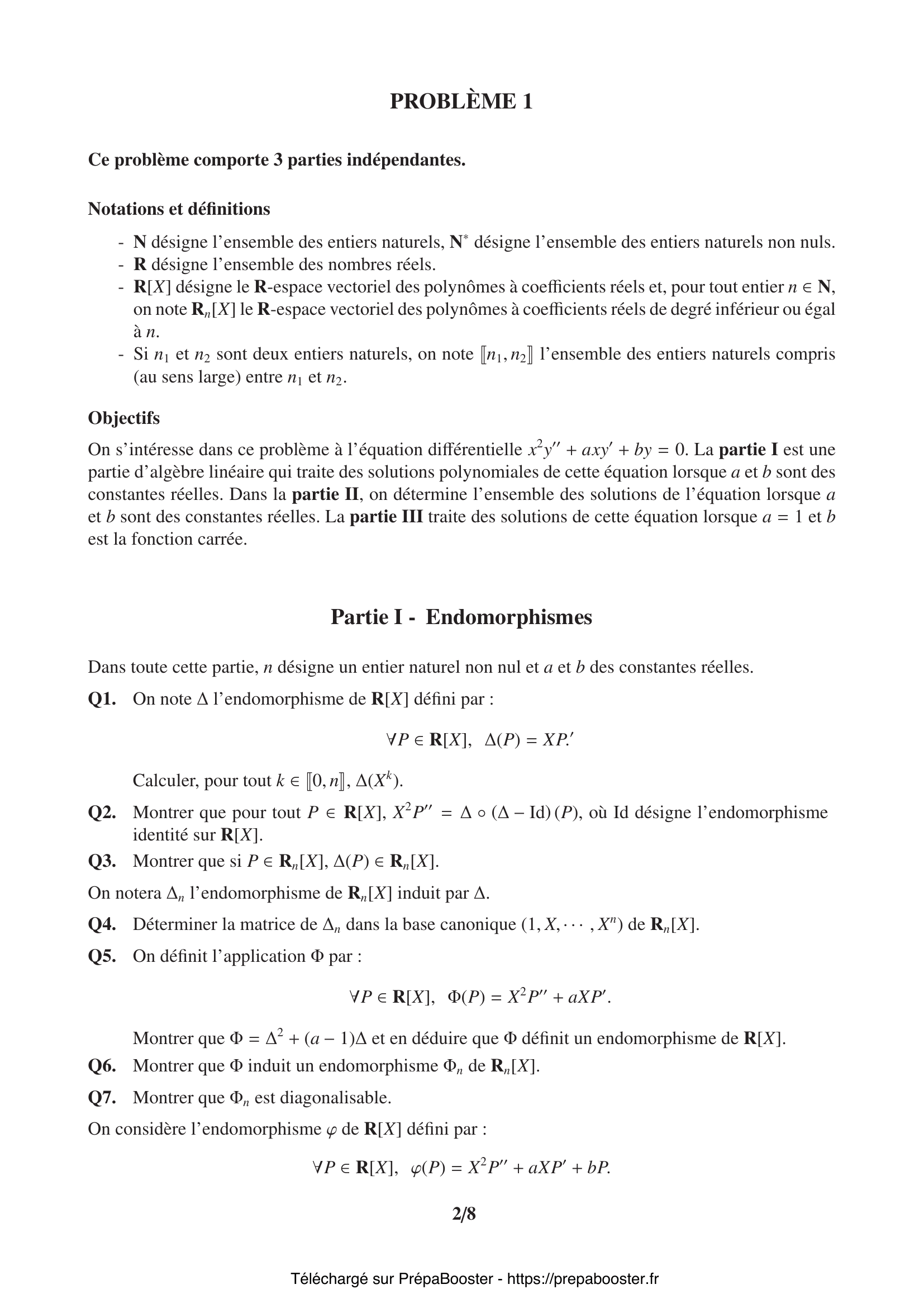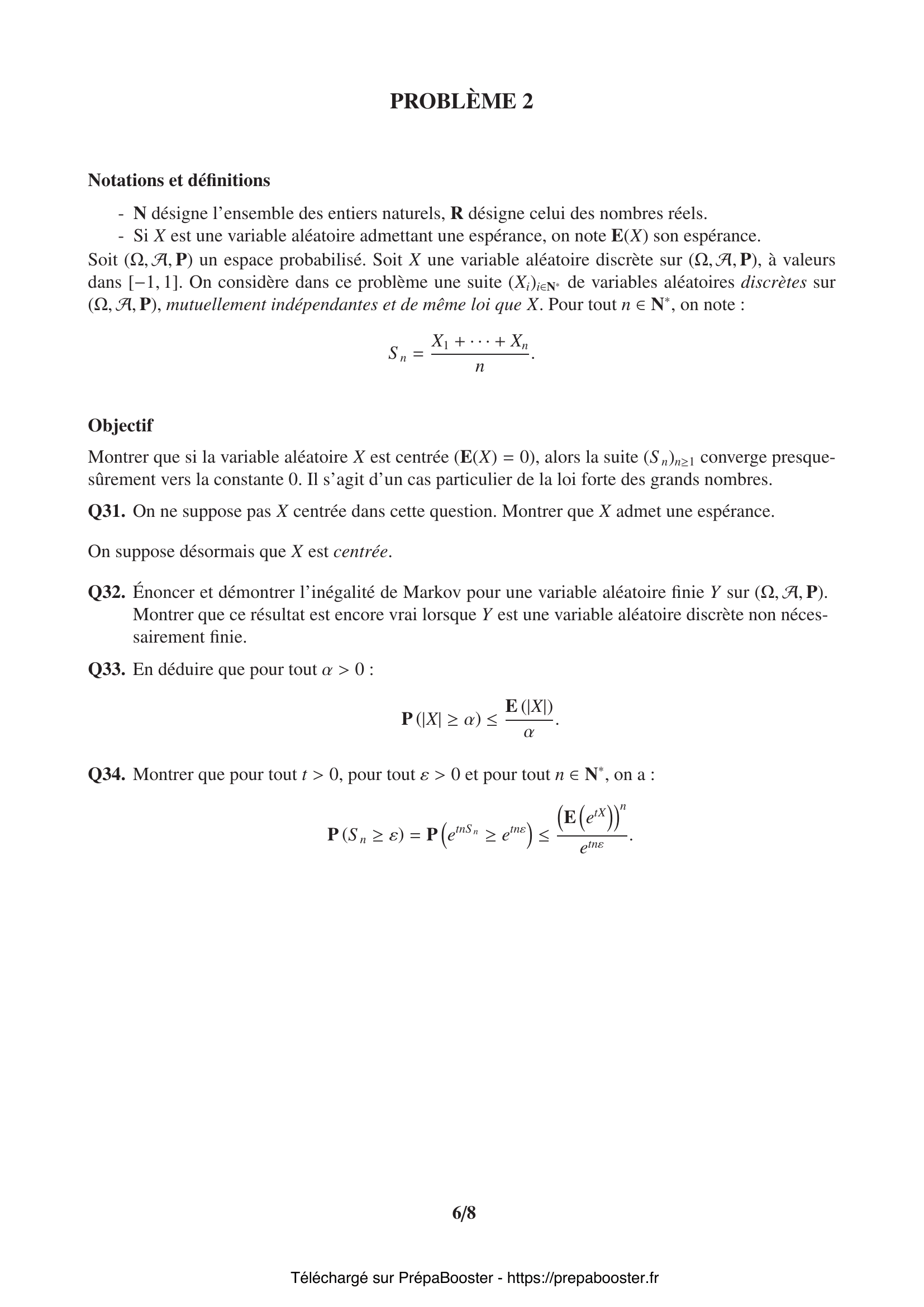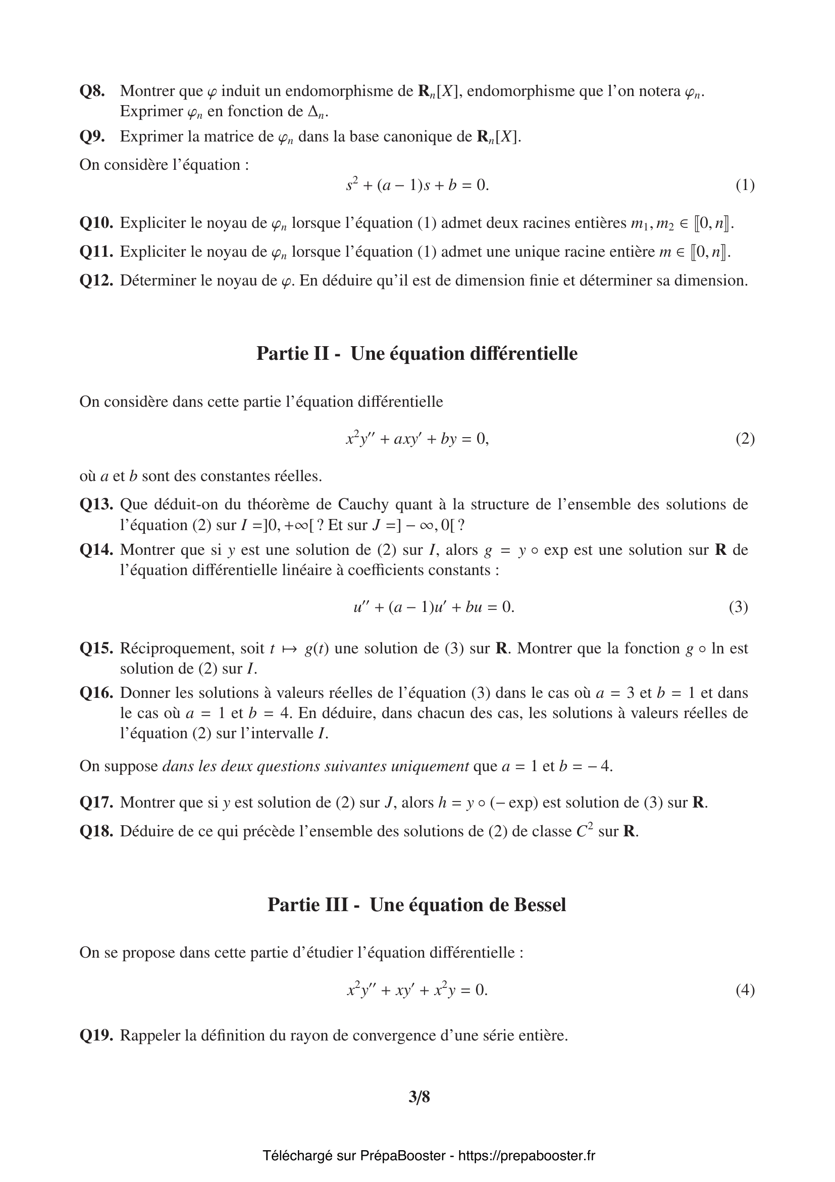 1. Q1. On note $\Delta$ l’endomorphisme de $\mathbb{R}[X]$ défini par :\\ $\forall P \in \mathbb{R}[X], \Delta(P) = XP”$.\\ Calculer, pour tout $k \in \llbracket 0, n\rrbracket$, $\Delta(X^k)$. 2. Q2. Montrer que pour tout $P \in \mathbb{R}[X]$, $X^2P” = \Delta \circ (\Delta – \mathrm{Id}) (P)$, où $\mathrm{Id}$ désigne l’endomorphisme identité sur $\mathbb{R}[X]$. 3. Q3. Montrer que si $P \in \mathbb{R}_n[X]$, $\Delta(P) \in \mathbb{R}_n[X]$.\\ On notera $\Delta_n$ l’endomorphisme de $\mathbb{R}_n[X]$ induit par $\Delta$. 4. Q4. Déterminer la matrice de $\Delta_n$ dans la base canonique $(1, X, \cdots, X^n)$ de $\mathbb{R}_n[X]$. 5. Q5. On définit l’application $\Phi$ par :\\ $\forall P \in \mathbb{R}[X], \Phi(P) = X^2P” + aXP’$.\\ Montrer que $\Phi=\Delta^2 + (a – 1)\Delta$ et en déduire que $\Phi$ définit un endomorphisme de $\mathbb{R}[X]$.} 6. Q6. Montrer que $\Phi$ induit un endomorphisme $\Phi_n$ de $\mathbb{R}_n[X]$. 7. Q7. Montrer que $\Phi_n$ est diagonalisable.\\ On considère l’endomorphisme $\varphi$ de $\mathbb{R}[X]$ défini par :\\ $\forall P \in \mathbb{R}[X], \varphi(P) = X^2P” + aXP’ + bP$. 8. Q8. Montrer que $\varphi$ induit un endomorphisme de $\mathbb{R}_n[X]$, endomorphisme que l’on notera $\varphi_n$.\\ Exprimer $\varphi_n$ en fonction de $\Delta_n$. 9. Q9. Exprimer la matrice de $\varphi_n$ dans la base canonique de $\mathbb{R}_n[X]$.\\ On considère l’équation :\\ $s^2 + (a – 1)s + b = 0.$ 10. Q10. Expliciter le noyau de $\varphi_n$ lorsque l’équation admet deux racines entières $m_1, m_2 \in \llbracket 0, n\rrbracket$.} 11. Q11. Expliciter le noyau de $\varphi_n$ lorsque l’équation admet une unique racine entière $m \in \llbracket 0, n\rrbracket$. 12. Q12. Déterminer le noyau de $\varphi$. En déduire qu’il est de dimension finie et déterminer sa dimension. 13. Q13. Que déduit-on du théorème de Cauchy quant à la structure de l’ensemble des solutions de l’équation (2) sur $I =]0, +\infty[$ ? Et sur $J =] -\infty, 0[$ ? 14. Q14. Montrer que si $y$ est une solution de (2) sur $I$, alors $g = y \circ \exp$ est une solution sur $\mathbb{R}$ de l’équation différentielle linéaire à coefficients constants :\\ $u” + (a – 1)u’ + bu = 0$. 15. Q15. Réciproquement, soit $t \mapsto g(t)$ une solution de (3) sur $\mathbb{R}$. Montrer que la fonction $g \circ \ln$ est solution de (2) sur $I$.} 16. Q16. Donner les solutions à valeurs réelles de l’équation (3) dans le cas où $a = 3$ et $b = 1$ et dans le cas où $a = 1$ et $b = 4$. En déduire, dans chacun des cas, les solutions à valeurs réelles de l’équation (2) sur l’intervalle $I$. 17. Q17. Montrer que si $y$ est solution de (2) sur $J$, alors $h = y \circ (-\exp)$ est solution de (3) sur $\mathbb{R}$. 18. Q18. Déduire de ce qui précède l’ensemble des solutions de (2) de classe $\mathcal{C}^2$ sur $\mathbb{R}$. 19. Q19. Rappeler la définition du rayon de convergence d’une série entière. 20. Q20. Montrer que, pour tout $k \in \mathbb{N}$, on a :\\ $\begin{cases} c_{2k+1} = 0 \\ c_{2k} = \dfrac{(-1)^k}{4^k (k!)^2} \end{cases}$} 21. Q21. Déterminer le rayon de convergence $R$ de la série entière obtenue : $\sum\limits_{k \geq 0} c_k x^k$. 22. Q22. Soit $r > 0$ et soit $f$ une autre solution de (4) sur $]0,r[$. Montrer que si $(J_0, f)$ est liée dans l’espace vectoriel des fonctions de classe $\mathcal{C}^2$ sur $]0,r[$, alors $f$ est bornée au voisinage de 0. 23. Q23. Montrer que si $\sum\limits_{k \geq 0} \beta_k x^k$ est solution, alors la suite $(\beta_k)_{k \in \mathbb{N}}$ satisfait aux relations suivantes :\\ $\begin{cases} \beta_0 = 1 \\ \forall n \in \mathbb{N}^*, \sum\limits_{k=0}^n \alpha_k \beta_{n-k} = 0 \end{cases}$ 24. Q24. Montrer qu’il existe un réel $M > 0$ tel que pour tout $k \in \mathbb{N}$ :\\ $|\alpha_k| \leq \dfrac{M}{r^k}$. 25. Q25. Montrer que (5) admet une unique solution $(\beta_k)_{k \in \mathbb{N}}$ et que, pour tout $k \in \mathbb{N}^*$ :\\ $|\beta_k| \leq \dfrac{M(M+1)^{k-1}}{r^k}$.\\ On pourra raisonner par récurrence.} 26. Q26. Que peut-on dire du rayon de convergence $R_\beta$ de la série entière $\sum\limits_{k \geq 0} \beta_k x^k$ ? 27. Q27. Soit $r > 0$ et soit $\lambda$ une fonction de classe $\mathcal{C}^2$ sur $]0, r[$.\\ Montrer que la fonction $y: x \mapsto \lambda(x)J_0(x)$ est solution de (4) sur $]0, r[$ si et seulement si la fonction $x \mapsto x J_0^2(x) \lambda'(x)$ est de dérivée nulle sur $]0, r[$. 28. Q28. Montrer que $J_0^2$ est somme d’une série entière dont on donnera le rayon de convergence. Que vaut $J_0^2(0)$ ? 29. Q29. En déduire l’existence d’une fonction $\eta$ somme d’une série entière de rayon de convergence $R_\eta > 0$ telle que\\ $x \mapsto \eta(x) + J_0(x) \ln(x)$\\ soit solution de (4) sur un intervalle $]0, R_\eta[$. 30. Q30. En déduire l’ensemble des solutions de (4) sur $]0, R_\eta[$.} 31. Q31. On ne suppose pas $X$ centrée dans cette question. Montrer que $X$ admet une espérance. 32. Q32. Énoncer et démontrer l’inégalité de Markov pour une variable aléatoire finie $Y$ sur $(\Omega, \mathcal{A}, \mathbb{P})$.\\ Montrer que ce résultat est encore vrai lorsque $Y$ est une variable aléatoire discrète non nécessairement finie. 33. Q33. En déduire que pour tout $\alpha > 0$ :\\ $\mathbb{P}(|X| \geq \alpha) \leq \dfrac{\mathbb{E}(|X|)}{\alpha}$. 34. Q34. Montrer que pour tout $t > 0$, pour tout $\varepsilon > 0$ et pour tout $n \in \mathbb{N}^*$, on a :\\ $\mathbb{P}(S_n \geq \varepsilon) = \mathbb{P}\left(e^{t n S_n} \geq e^{t n \varepsilon}\right) \leq \dfrac{\mathbb{E}(e^{t X})^n}{e^{t n \varepsilon}}$. 35. Q35. Soit $a > 1$. On considère la fonction $g_a$ définie par :\\ $\forall x \in \mathbb{R},\quad g_a(x) = \frac{1 – x}{2}a^{-1} + \frac{1 + x}{2}a – a x$.\\ Montrer que la fonction $g_a$ est dérivable sur $\mathbb{R}$ et que la fonction $g’_a$ est décroissante sur $\mathbb{R}$.\\ En déduire, en remarquant q