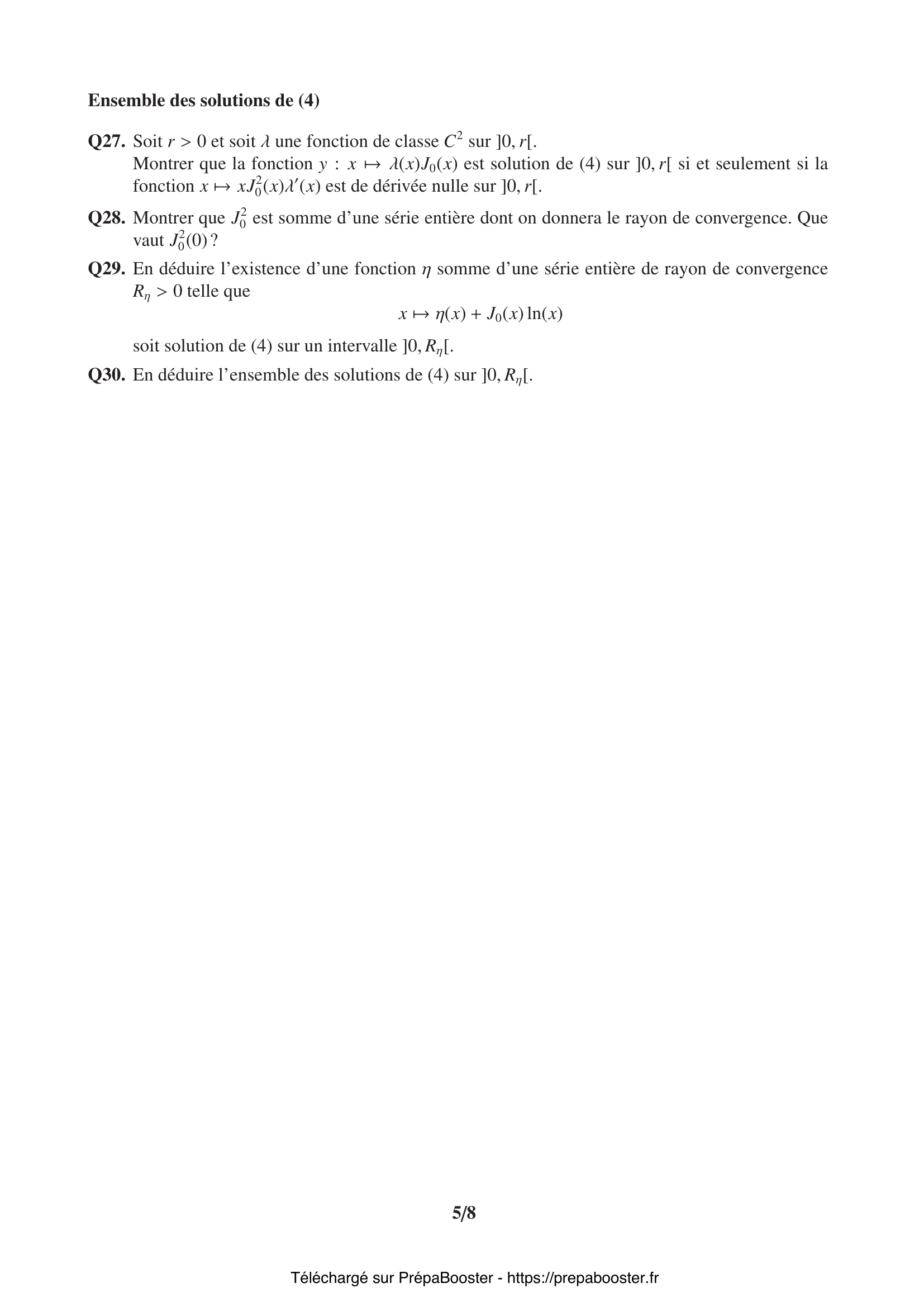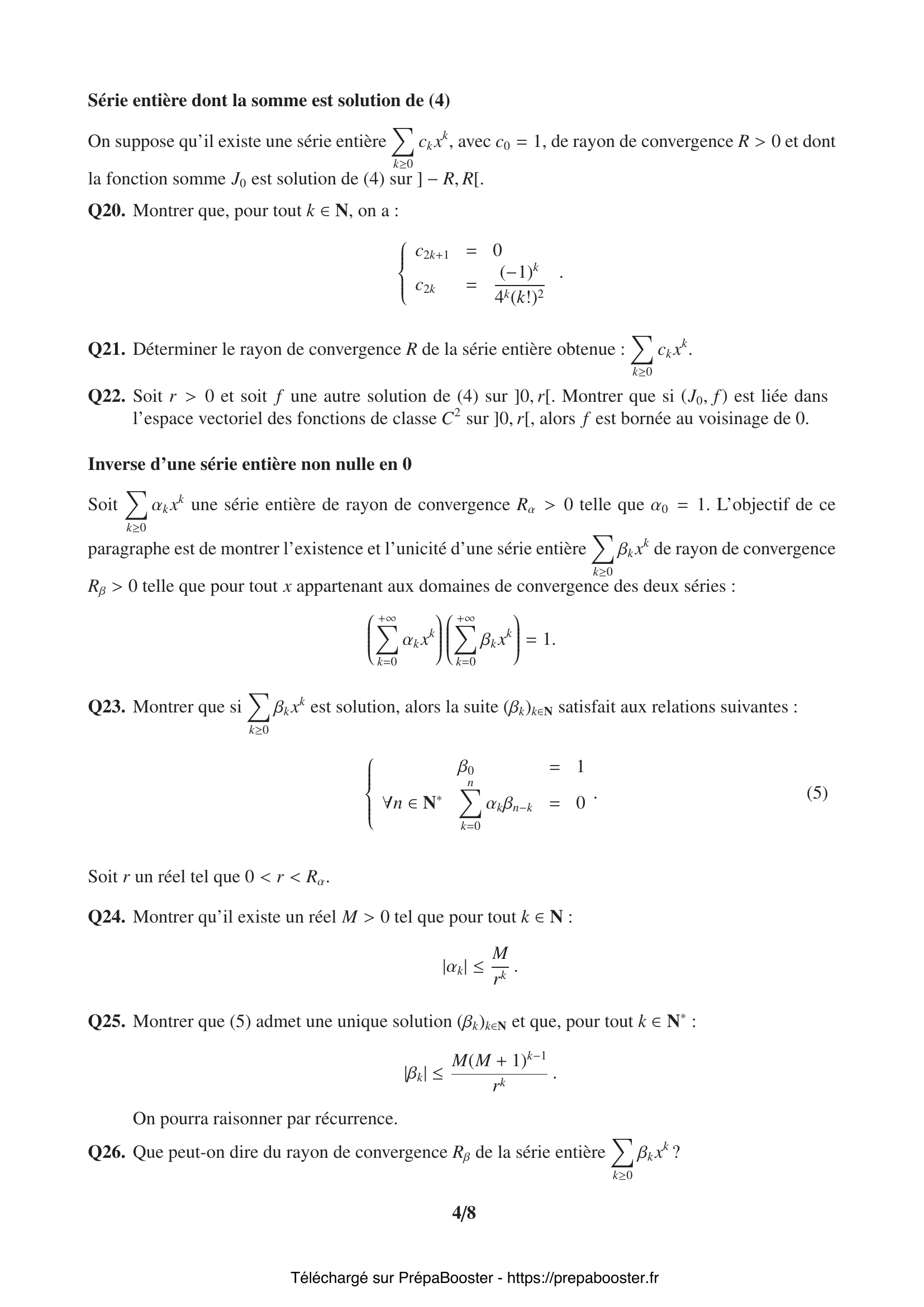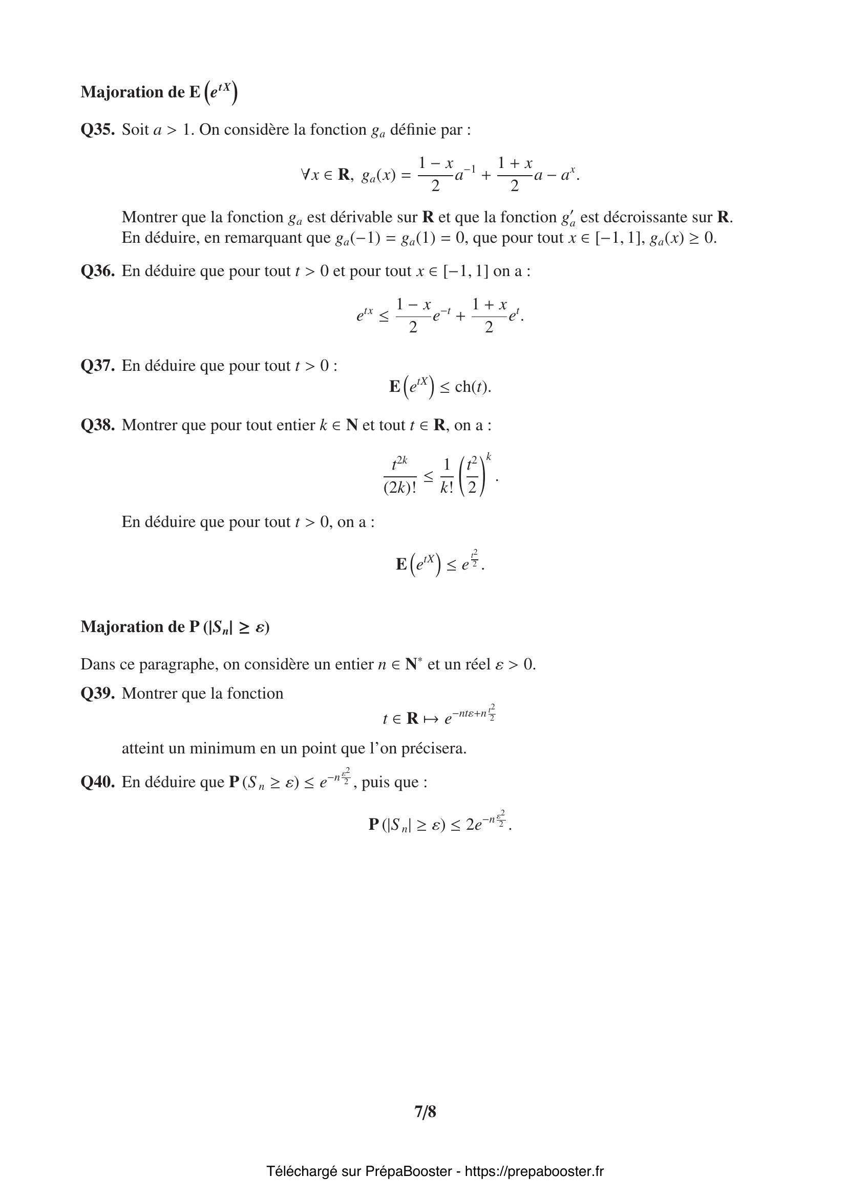 1. Q1. On note $\Delta$ l’endomorphisme de $\mathbb{R}[X]$ défini par :\\ $\forall P \in \mathbb{R}[X], \Delta(P) = XP”$.\\ Calculer, pour tout $k \in \llbracket 0, n\rrbracket$, $\Delta(X^k)$. 2. Q2. Montrer que pour tout $P \in \mathbb{R}[X]$, $X^2P” = \Delta \circ (\Delta – \mathrm{Id}) (P)$, où $\mathrm{Id}$ désigne l’endomorphisme identité sur $\mathbb{R}[X]$. 3. Q3. Montrer que si $P \in \mathbb{R}_n[X]$, $\Delta(P) \in \mathbb{R}_n[X]$.\\ On notera $\Delta_n$ l’endomorphisme de $\mathbb{R}_n[X]$ induit par $\Delta$. 4. Q4. Déterminer la matrice de $\Delta_n$ dans la base canonique $(1, X, \cdots, X^n)$ de $\mathbb{R}_n[X]$. 5. Q5. On définit l’application $\Phi$ par :\\ $\forall P \in \mathbb{R}[X], \Phi(P) = X^2P” + aXP’$.\\ Montrer que $\Phi=\Delta^2 + (a – 1)\Delta$ et en déduire que $\Phi$ définit un endomorphisme de $\mathbb{R}[X]$.} 6. Q6. Montrer que $\Phi$ induit un endomorphisme $\Phi_n$ de $\mathbb{R}_n[X]$. 7. Q7. Montrer que $\Phi_n$ est diagonalisable.\\ On considère l’endomorphisme $\varphi$ de $\mathbb{R}[X]$ défini par :\\ $\forall P \in \mathbb{R}[X], \varphi(P) = X^2P” + aXP’ + bP$. 8. Q8. Montrer que $\varphi$ induit un endomorphisme de $\mathbb{R}_n[X]$, endomorphisme que l’on notera $\varphi_n$.\\ Exprimer $\varphi_n$ en fonction de $\Delta_n$. 9. Q9. Exprimer la matrice de $\varphi_n$ dans la base canonique de $\mathbb{R}_n[X]$.\\ On considère l’équation :\\ $s^2 + (a – 1)s + b = 0.$ 10. Q10. Expliciter le noyau de $\varphi_n$ lorsque l’équation admet deux racines entières $m_1, m_2 \in \llbracket 0, n\rrbracket$.} 11. Q11. Expliciter le noyau de $\varphi_n$ lorsque l’équation admet une unique racine entière $m \in \llbracket 0, n\rrbracket$. 12. Q12. Déterminer le noyau de $\varphi$. En déduire qu’il est de dimension finie et déterminer sa dimension. 13. Q13. Que déduit-on du théorème de Cauchy quant à la structure de l’ensemble des solutions de l’équation (2) sur $I =]0, +\infty[$ ? Et sur $J =] -\infty, 0[$ ? 14. Q14. Montrer que si $y$ est une solution de (2) sur $I$, alors $g = y \circ \exp$ est une solution sur $\mathbb{R}$ de l’équation différentielle linéaire à coefficients constants :\\ $u” + (a – 1)u’ + bu = 0$. 15. Q15. Réciproquement, soit $t \mapsto g(t)$ une solution de (3) sur $\mathbb{R}$. Montrer que la fonction $g \circ \ln$ est solution de (2) sur $I$.} 16. Q16. Donner les solutions à valeurs réelles de l’équation (3) dans le cas où $a = 3$ et $b = 1$ et dans le cas où $a = 1$ et $b = 4$. En déduire, dans chacun des cas, les solutions à valeurs réelles de l’équation (2) sur l’intervalle $I$. 17. Q17. Montrer que si $y$ est solution de (2) sur $J$, alors $h = y \circ (-\exp)$ est solution de (3) sur $\mathbb{R}$. 18. Q18. Déduire de ce qui précède l’ensemble des solutions de (2) de classe $\mathcal{C}^2$ sur $\mathbb{R}$. 19. Q19. Rappeler la définition du rayon de convergence d’une série entière. 20. Q20. Montrer que, pour tout $k \in \mathbb{N}$, on a :\\ $\begin{cases} c_{2k+1} = 0 \\ c_{2k} = \dfrac{(-1)^k}{4^k (k!)^2} \end{cases}$} 21. Q21. Déterminer le rayon de convergence $R$ de la série entière obtenue : $\sum\limits_{k \geq 0} c_k x^k$. 22. Q22. Soit $r > 0$ et soit $f$ une autre solution de (4) sur $]0,r[$. Montrer que si $(J_0, f)$ est liée dans l’espace vectoriel des fonctions de classe $\mathcal{C}^2$ sur $]0,r[$, alors $f$ est bornée au voisinage de 0. 23. Q23. Montrer que si $\sum\limits_{k \geq 0} \beta_k x^k$ est solution, alors la suite $(\beta_k)_{k \in \mathbb{N}}$ satisfait aux relations suivantes :\\ $\begin{cases} \beta_0 = 1 \\ \forall n \in \mathbb{N}^*, \sum\limits_{k=0}^n \alpha_k \beta_{n-k} = 0 \end{cases}$ 24. Q24. Montrer qu’il existe un réel $M > 0$ tel que pour tout $k \in \mathbb{N}$ :\\ $|\alpha_k| \leq \dfrac{M}{r^k}$. 25. Q25. Montrer que (5) admet une unique solution $(\beta_k)_{k \in \mathbb{N}}$ et que, pour tout $k \in \mathbb{N}^*$ :\\ $|\beta_k| \leq \dfrac{M(M+1)^{k-1}}{r^k}$.\\ On pourra raisonner par récurrence.} 26. Q26. Que peut-on dire du rayon de convergence $R_\beta$ de la série entière $\sum\limits_{k \geq 0} \beta_k x^k$ ? 27. Q27. Soit $r > 0$ et soit $\lambda$ une fonction de classe $\mathcal{C}^2$ sur $]0, r[$.\\ Montrer que la fonction $y: x \mapsto \lambda(x)J_0(x)$ est solution de (4) sur $]0, r[$ si et seulement si la fonction $x \mapsto x J_0^2(x) \lambda'(x)$ est de dérivée nulle sur $]0, r[$. 28. Q28. Montrer que $J_0^2$ est somme d’une série entière dont on donnera le rayon de convergence. Que vaut $J_0^2(0)$ ? 29. Q29. En déduire l’existence d’une fonction $\eta$ somme d’une série entière de rayon de convergence $R_\eta > 0$ telle que\\ $x \mapsto \eta(x) + J_0(x) \ln(x)$\\ soit solution de (4) sur un intervalle $]0, R_\eta[$. 30. Q30. En déduire l’ensemble des solutions de (4) sur $]0, R_\eta[$.} 31. Q31. On ne suppose pas $X$ centrée dans cette question. Montrer que $X$ admet une espérance. 32. Q32. Énoncer et démontrer l’inégalité de Markov pour une variable aléatoire finie $Y$ sur $(\Omega, \mathcal{A}, \mathbb{P})$.\\ Montrer que ce résultat est encore vrai lorsque $Y$ est une variable aléatoire discrète non nécessairement finie. 33. Q33. En déduire que pour tout $\alpha > 0$ :\\ $\mathbb{P}(|X| \geq \alpha) \leq \dfrac{\mathbb{E}(|X|)}{\alpha}$. 34. Q34. Montrer que pour tout $t > 0$, pour tout $\varepsilon > 0$ et pour tout $n \in \mathbb{N}^*$, on a :\\ $\mathbb{P}(S_n \geq \varepsilon) = \mathbb{P}\left(e^{t n S_n} \geq e^{t n \varepsilon}\right) \leq \dfrac{\mathbb{E}(e^{t X})^n}{e^{t n \varepsilon}}$. 35. Q35. Soit $a > 1$. On considère la fonction $g_a$ définie par :\\ $\forall x \in \mathbb{R},\quad g_a(x) = \frac{1 – x}{2}a^{-1} + \frac{1 + x}{2}a – a x$.\\ Montrer que la fonction $g_a$ est dérivable sur $\mathbb{R}$ et que la fonction $g’_a$ est décroissante sur $\mathbb{R}$.\\ En déduire, en remarquant q