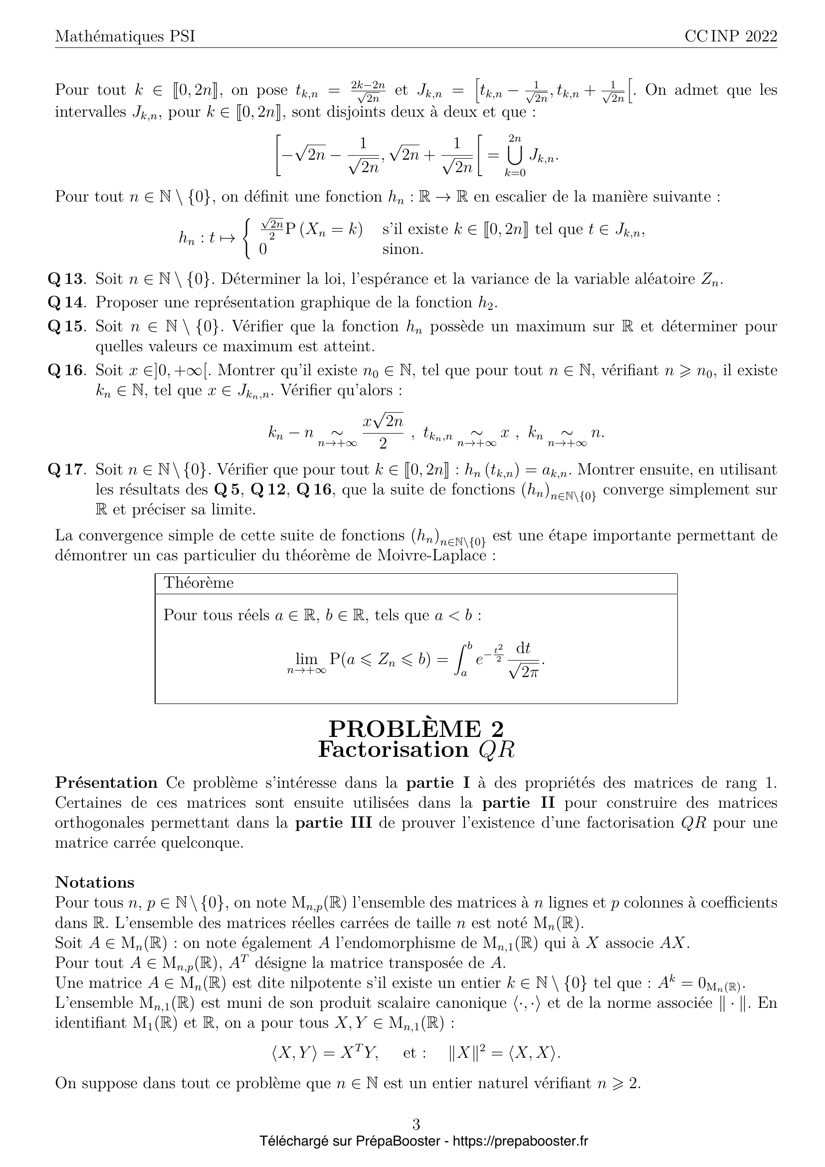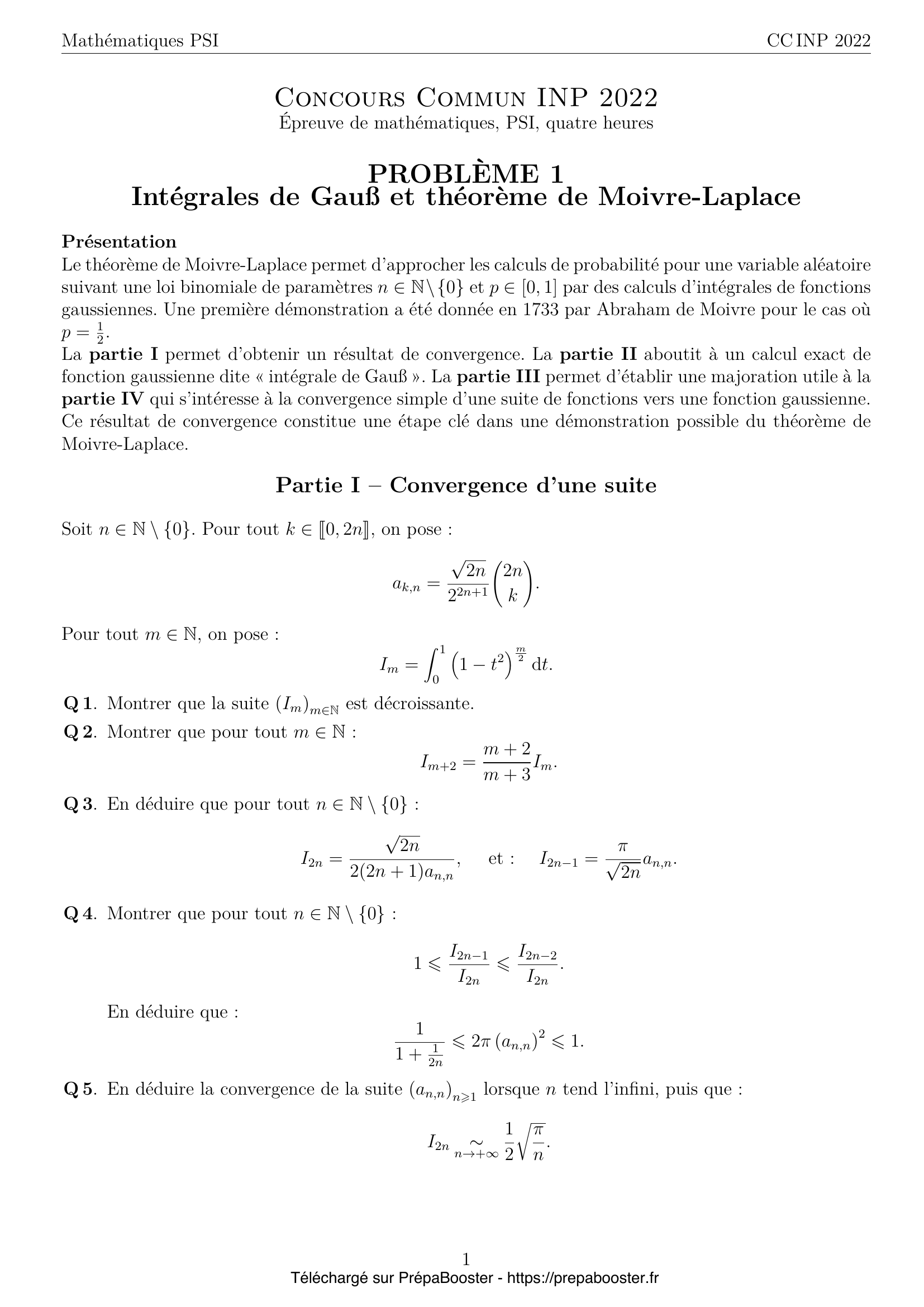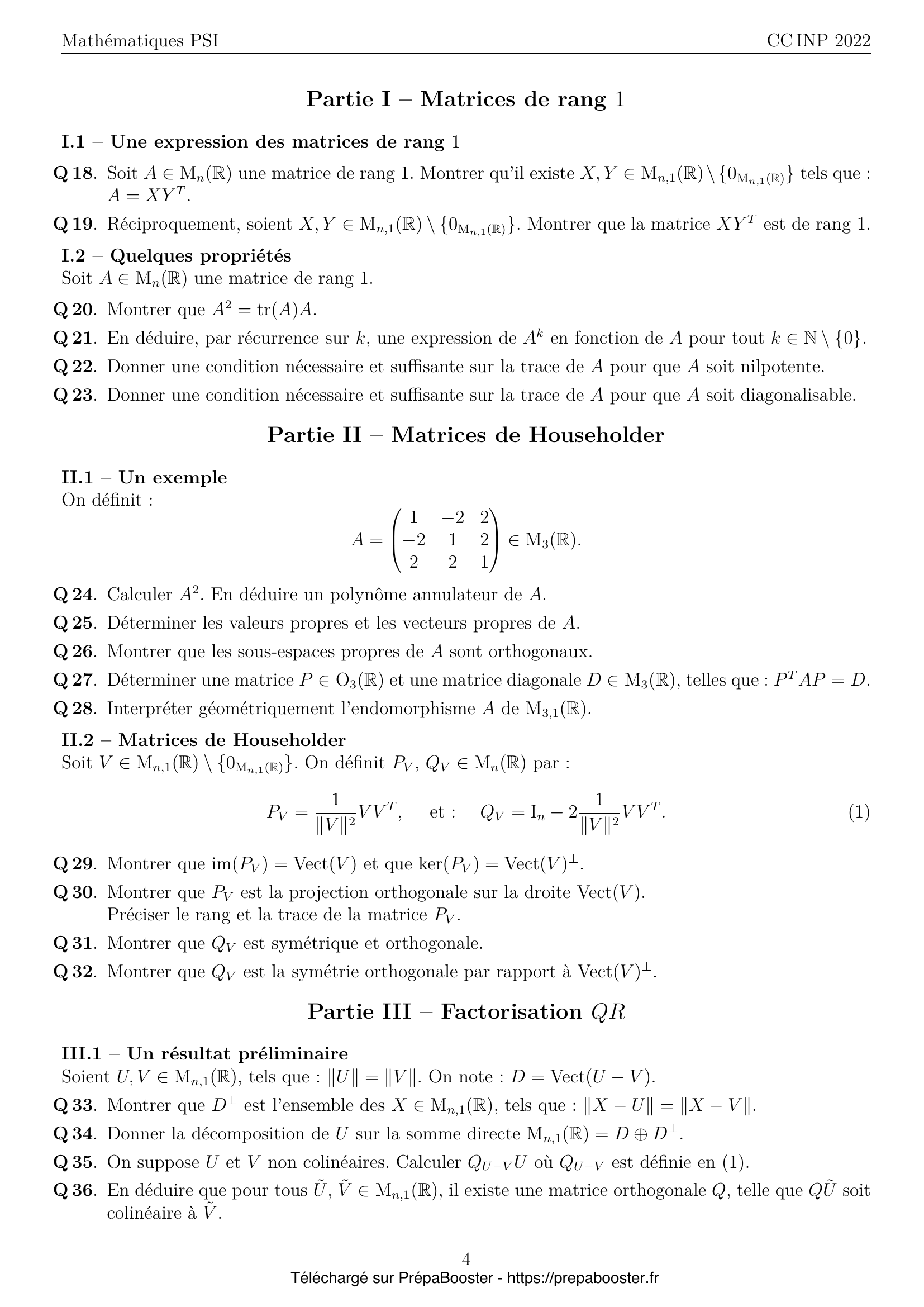 1. Montrer que la suite $(I_m)_{m\in\mathbb{N}}$ est décroissante. 2. Montrer que pour tout $m \in \mathbb{N}$ :\\ $$I_{m+2} = \frac{m+2}{m+3}I_m.$$ 3. En déduire que pour tout $n \in \mathbb{N} \setminus \{0\} :$\\ $$I_{2n} = \frac{\sqrt{2n}}{2(2n + 1)} a_{n,n}, \quad \text{et : } I_{2n-1} = \frac{\pi}{\sqrt{2n}} a_{n,n}.$$ 4. Montrer que pour tout $n \in \mathbb{N} \setminus \{0\} :$\\ $$1 \leq \frac{I_{2n-1}}{I_{2n}} \leq \frac{I_{2n-2}}{I_{2n}}.$$\\ En déduire que :\\ $$\frac{1}{1 + \frac{1}{2n}} \leq 2\pi (a_{n,n})^2 \leq 1.$$ 5. En déduire la convergence de la suite $(a_{n,n})_{n \geq 1}$ lorsque $n$ tend l’infini, puis que :\\[.5em] $$I_{2n} \underset{n \rightarrow +\infty}{\sim} \frac{1}{2} \sqrt{\frac{\pi}{n}}.$$} 6. À l’aide d’un changement de variable simple, déduire de la Q 5 que la suite $(J_n)_{n\in\mathbb{N} \setminus \{0\}}$ converge et donner sa limite. 7. Montrer que la suite de fonctions $(u_n)_{n\in\mathbb{N} \setminus \{0\}}$ converge simplement sur $\mathbb{R}^+$ et donner sa limite. 8. Montrer que pour tout $x \in \mathbb{R}$, on a : $1 + x \leq e^x$, et en déduire que pour tout $n \in \mathbb{N}\setminus\{0\}$ :\\ $\forall t \in \mathbb{R}^+, 0 \leq u_n(t) \leq e^{-t^2}$. 9. Montrer que l’intégrale $K$ est convergente, puis déduire des questions précédentes une valeur exacte de $K$. 10. Montrer qu’il existe une fonction $g : \left[0, \frac{1}{2}\right] \to \mathbb{R}$ et un réel $M \geq 0$, tels que :\\ $\forall x \in \left[0, \frac{1}{2}\right]$,\\ $$\frac{1 – x}{1 + x} = e^{-2x + g(x)}, \quad \text{et : } |g(x)| \leq M x^3.$$} 11. Soit $n \in \mathbb{N} \setminus \{0\}$. Montrer que pour tout $k \in \llbracket n+1, 2n \rrbracket :$\\ $$\frac{a_{k,n}}{a_{n,n}} = \frac{\prod_{i=1}^{k-n-1} \left(1 – \frac{i}{n}\right)}{\prod_{i=1}^{k-n-1} \left(1 + \frac{i}{n}\right)} \times \frac{n}{k}.$$ 12. En déduire que pour tout $k \in \mathbb{N}$ tel que $n+1 \leq k \leq \frac{3n}{2} + 1$, il existe $b_{k,n} \in \mathbb{R}$ tel que :\\ $|b_{k,n}| \leq \frac{M}{n^3} (k-n-1)^4$, et :\\ $$\frac{a_{k,n}}{a_{n,n}} = \frac{n}{k} e^{b_{k,n}} e^{- \frac{1}{n}(k-n-1)(k-n)}.$$ 13. Soit $n \in \mathbb{N} \setminus \{0\}$. Déterminer la loi, l’espérance et la variance de la variable aléatoire $Z_n$. 14. Proposer une représentation graphique de la fonction $h_2$. 15. Soit $n \in \mathbb{N} \setminus \{0\}$. Vérifier que la fonction $h_n$ possède un maximum sur $\mathbb{R}$ et déterminer pour quelles valeurs ce maximum est atteint.} 16. Soit $x \in ]0, +\infty[$. Montrer qu’il existe $n_0 \in \mathbb{N}$, tel que pour tout $n \in \mathbb{N}$, vérifiant $n \geq n_0$, il existe $k_n \in \mathbb{N}$, tel que $x \in J_{k_n,n}$. Vérifier qu’alors :\\ $k_n – n \underset{n\to +\infty}{\sim} \frac{x}{\sqrt{2n}}$, $t_{k_n, n} \underset{n\to+\infty}{\sim} x$, $k_n \underset{n\to+\infty}{\sim} n$. 17. Soit $n \in \mathbb{N}\setminus\{0\}$. Vérifier que pour tout $k\in\llbracket 0, 2n\rrbracket : h_n(t_{k,n}) = a_{k,n}$. Montrer ensuite, en utilisant les résultats des Q 5, Q 12, Q 16, que la suite de fonctions $(h_n)_{n\in \mathbb{N}\setminus\{0\}}$ converge simplement sur $\mathbb{R}$ et préciser sa limite. 18. Soit $A \in \mathcal{M}_n(\mathbb{R})$ une matrice de rang $1$. Montrer qu’il existe $X,Y \in \mathcal{M}_{n,1}(\mathbb{R}) \setminus \{0_{\mathcal{M}_{n,1}(\mathbb{R})}\}$ tels que : $A = X Y^T$. 19. Réciproquement, soient $X, Y \in \mathcal{M}_{n,1}(\mathbb{R}) \setminus \{0_{\mathcal{M}_{n,1}(\mathbb{R})}\}$. Montrer que la matrice $X Y^T$ est de rang $1$. 20. Montrer que $A^2 = \mathrm{tr}(A)A$.} 21. En déduire, par récurrence sur $k$, une expression de $A^k$ en fonction de $A$ pour tout $k \in \mathbb{N} \setminus \{0\}$. 22. Donner une condition nécessaire et suffisante sur la trace de $A$ pour que $A$ soit nilpotente. 23. Donner une condition nécessaire et suffisante sur la trace de $A$ pour que $A$ soit diagonalisable. 24. Calculer $A^2$. En déduire un polynôme annulateur de $A$. 25. Déterminer les valeurs propres et les vecteurs propres de $A$.} 26. Montrer que les sous-espaces propres de $A$ sont orthogonaux. 27. Déterminer une matrice $P\in O_3(\mathbb{R})$ et une matrice diagonale $D\in M_3(\mathbb{R})$, telles que : $P^T A P = D$. 28. Interpréter géométriquement l’endomorphisme $A$ de $M_{3,1}(\mathbb{R})$. 29. Montrer que $\mathrm{im}(P_V) = \mathrm{Vect}(V)$ et que $\ker(P_V) = \mathrm{Vect}(V)^\perp$. 30. Montrer que $P_V$ est la projection orthogonale sur la droite $\mathrm{Vect}(V)$.\\ Préciser le rang et la trace de la matrice $P_V$.} 31. Montrer que $Q_V$ est symétrique et orthogonale. 32. Montrer que $Q_V$ est la symétrie orthogonale par rapport à $\mathrm{Vect}(V)^\perp$. 33. Montrer que $D^\perp$ est l’ensemble des $X \in \mathcal{M}_{n,1}(\mathbb{R})$, tels que : $\|X-U\| = \|X-V\|$. 34. Donner la décomposition de $U$ sur la somme directe $\mathcal{M}_{n,1}(\mathbb{R}) = D \oplus D^\perp$. 35. On suppose $U$ et $V$ non colinéaires. Calculer $Q_{U-V} U$ où $Q_{U-V}$ est définie en (1).} 36. En déduire que pour tous $\tilde{U}, \tilde{V} \in \mathcal{M}_{n,1}(\mathbb{R})$, il existe une matrice orthogonale $Q$, telle que $Q\tilde{U}$ soit colinéaire à $\tilde{V}$. 37. Soit $A \in \mathcal{M}_n(\mathbb{R})$. Montrer qu’il existe une matrice orthogonale $Q_1$, telle que $Q_1 A$ soit de la forme :\\ $$ Q_1A = \begin{pmatrix} \alpha & * & \cdots & * \\ 0 & & & \\ \vdots & & C_1 & \\ 0 & & & \\ \end{pmatrix} $$ où $\alpha \in \mathbb{R}$ et $C_1 \in \mathcal{M}_{n-1}(\mathbb{R})$. 38. En raisonnant par récurrence sur $n$, montrer que pour tout $A \in \mathcal{M}_n(\mathbb{R})$, il existe une matrice $Q$ orthogonale, telle que $Q A$ soit triangulaire supérieure.}FAQ