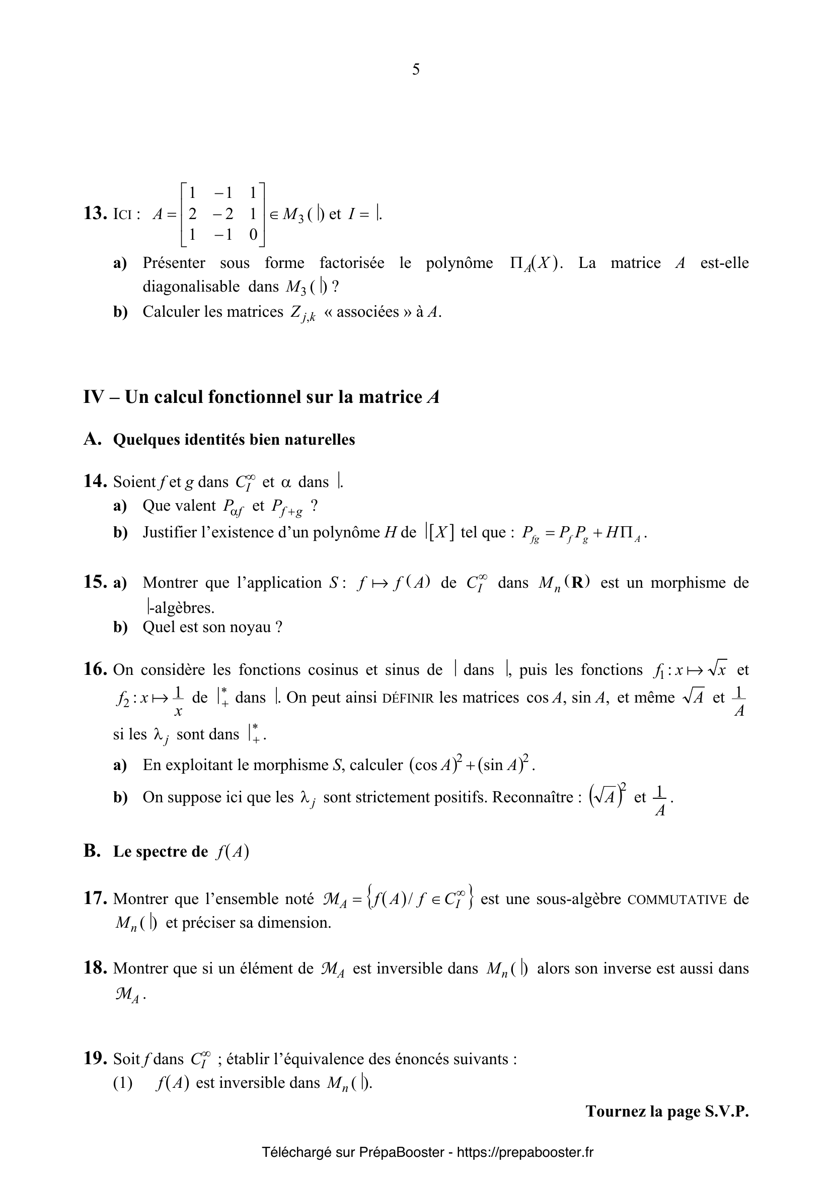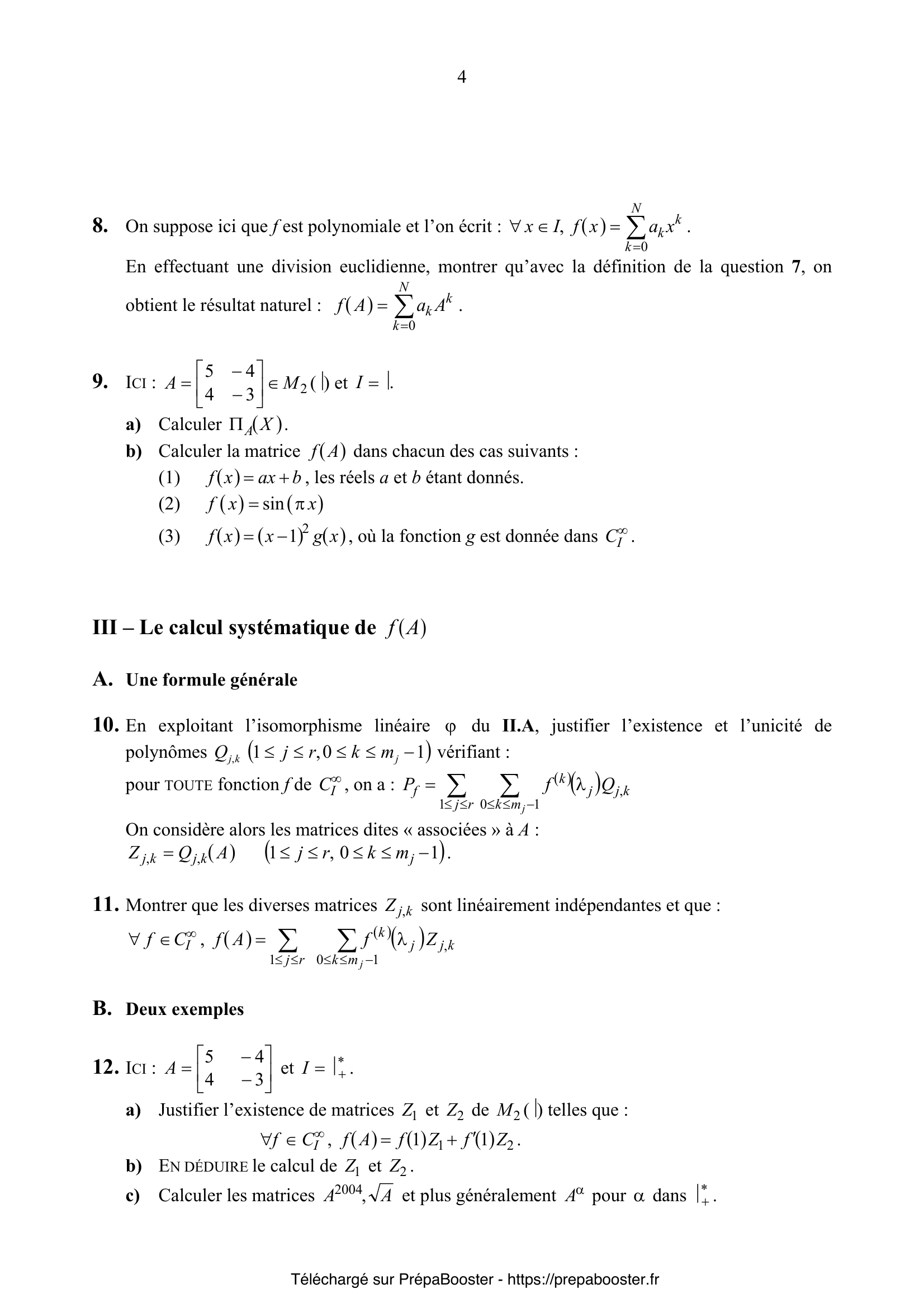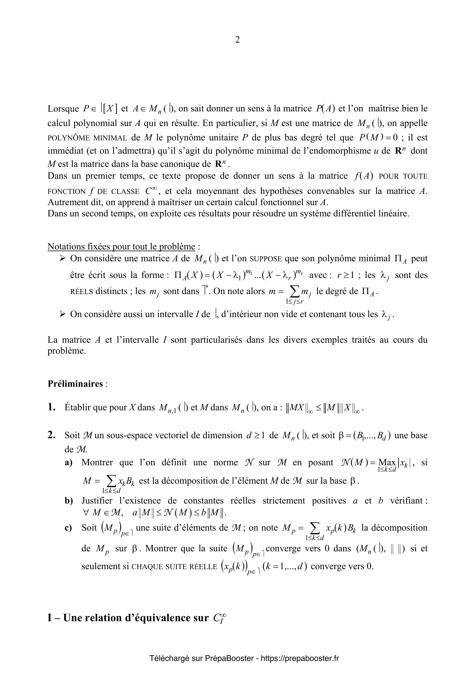 1. Établir que pour $X$ dans $M_{n,1}(\mathbb{R})$ et $M$ dans $M_n(\mathbb{R})$, on a : $\|MX\|_\infty \leq \|M\|_\infty \|X\|_\infty$. 2. Soit $M$ un sous-espace vectoriel de dimension $d \geq 1$ de $M_n(\mathbb{R})$, et soit $\mathcal{B} = (\beta_1, …, \beta_d)$ une base de $M$. \begin{enumerate} \item[a)] Montrer que l’on définit une norme $N$ sur $M$ en posant $N(M) = \max_{1 \leq k \leq d} |x_k|$ si $M = \sum_{k=1}^d x_k \beta_k$ est la décomposition de l’élément $M$ de $M$ sur la base $\mathcal{B}$. \item[b)] Justifier l’existence de constantes réelles strictement positives $a$ et $b$ vérifiant : $\forall M \in M, \; a\|M\| \leq N(M) \leq b\|M\|$. \item[c)] Soit $(M_p)_{p \in \mathbb{N}}$ une suite d’éléments de $M$ ; on note $M_p = \sum_{k=1}^d x_{k,p} \beta_k$ la décomposition de $M_p$ sur $\mathcal{B}$. Montrer que la suite $(M_p)_{p \in \mathbb{N}}$ converge vers $0$ dans $(M_n(\mathbb{R}), \| \cdot \|)$ si et seulement si chaque suite réelle $(x_{k,p})_{p \in \mathbb{N}}$ $(k=1,…,d)$ converge vers $0$. \end{enumerate} 3. Soient $l \in \mathbb{N}^*$, $\lambda \in I$ et $f \in C^\infty(I)$ vérifiant : $f^{(k)}(\lambda) = 0$ pour $k = 0,1,2,…,l-1$. \begin{enumerate} \item[a)] Établir l’identité : \[ f(x) = \frac{1}{(l-1)!} \int_\lambda^x (x-u)^{l-1} f^{(l)}(u) \, du, \; \forall x \in I. \] \item[b)] En déduire à l’aide d’un changement de variable, l’existence d’une fonction $h$ vérifiant : \\ (1) $\forall x \in I, \; f(x) = (x-\lambda)^l h(x)$ \\ (2) $h \in C^\infty(I)$ \end{enumerate} 4. Soient $f$ et $g$ dans $C^\infty(I)$. \begin{enumerate} \item[a)] On suppose $ \exists h \in C^\infty(I),\; f = g + h \Pi_A$. En considérant les dérivées successives de $f-g$, établir que $f \equiv_A g$. \item[b)] On suppose $f \equiv_A g$ ; en exploitant le 3., justifier l’existence de $h$ dans $C^\infty(I)$ vérifiant : $f = g + h \Pi_A$. \end{enumerate} 5. Soient $P$ et $Q$ dans $\mathbb{R}[X]$ ; prouver que les conditions suivantes sont équivalentes : \begin{enumerate} \item[(1)] $P \equiv_A Q$ ; \item[(2)] $\exists H \in \mathbb{R}[X],\; P = Q + H\Pi_A$. \end{enumerate}} 6. Établir le caractère bijectif de $\varphi$, application de $\mathbb{R}^{m-1}[X]$ vers $\mathbb{R}^m$ qui associe à un polynôme $P$ le $m$-uplet : $\varphi(P) = (P^{(k)}(\lambda_j))_{1 \leq j \leq r, 0 \leq k \leq m_j-1}$. 7. Soit $f \in C^\infty(I)$ ; justifier l’existence d’un et d’un seul polynôme $P_f$ de $\mathbb{R}[X]$, de degré inférieur ou égal à $(m-1)$ et tel que $f \equiv_A P_f$. On convient alors de DÉFINIR la matrice $f(A)$ en posant : $f(A) = P_f(A)$. 8. On suppose ici que $f$ est polynomiale et l’on écrit : $f(x) = \sum_{k=0}^N a_k x^k, \forall x \in I$. En effectuant une division euclidienne, montrer qu’avec la définition de la question 7, on obtient le résultat naturel : $f(A) = \sum_{k=0}^N a_k A^k$. 9. ICI : $A = \begin{pmatrix} 2 & 4 \\ 3 & 5 \end{pmatrix} \in M_2(\mathbb{R})$ et $I = \mathbb{R}$. \begin{enumerate} \item[a)] Calculer $\Pi_A(X)$. \item[b)] Calculer la matrice $f(A)$ dans chacun des cas suivants : \begin{enumerate} \item[(1)] $f(x) = a x + b$, les réels $a$ et $b$ étant donnés. \item[(2)] $f(x) = \sin(\pi x)$. \item[(3)] $f(x) = (x^2-1)g(x)$, où la fonction $g$ est donnée dans $C^\infty(I)$. \end{enumerate} \end{enumerate} 10. En exploitant l’isomorphisme linéaire $\varphi$ du II.A, justifier l’existence et l’unicité de polynômes $Q_{j,k}$ $(1\leq j\leq r, 0\leq k\leq m_j-1)$ vérifiant : pour TOUTE fonction $f$ de $C^\infty(I)$, on a : $P_f(X) = \sum_{j=1}^r \sum_{k=0}^{m_j-1} f^{(k)}(\lambda_j) Q_{j,k}(X)$.} 11. On considère alors les matrices dites « associées » à $A$ : $Z_{j,k} = Q_{j,k}(A)$ $(1\leq j\leq r, 0\leq k\leq m_j-1)$. Montrer que les diverses matrices $Z_{j,k}$ sont linéairement indépendantes et que : $\forall f \in C^\infty(I),\quad f(A) = \sum_{j=1}^r \sum_{k=0}^{m_j-1} f^{(k)}(\lambda_j) Z_{j,k}$. 12. ICI : $A = \begin{pmatrix} 4 & 3 \\ -5 & -4 \end{pmatrix} \in M_2(\mathbb{R})$ et $I = \mathbb{R}_+^*$. \begin{enumerate} \item[a)] Justifier l’existence de matrices $Z_1$ et $Z_2$ de $M_2(\mathbb{R})$ telles que : $\forall f \in C^\infty(I),\ f(A) = f(1) Z_1 + f'(1) Z_2$. \item[b)] EN DÉDUIRE le calcul de $Z_1$ et $Z_2$. \item[c)] Calculer les matrices $A$, $A^{2004}$ et plus généralement $A^\alpha$ pour $\alpha \in \mathbb{R}_+^*$. \end{enumerate} 13. ICI : $A = \begin{pmatrix} 1 & 1 & 0 \\ 2 & 2 & 1 \\ 1 & 1 & 1 \end{pmatrix} \in M_3(\mathbb{R})$ et $I = \mathbb{R}$. \begin{enumerate} \item[a)] Présenter sous forme factorisée le polynôme $\Pi_A(X)$. La matrice $A$ est-elle diagonalisable dans $M_3(\mathbb{R})$? \item[b)] Calculer les matrices $Z_{j,k}$ « associées » à $A$. \end{enumerate} 14. Soient $f$ et $g$ dans $C^\infty(I)$ et $\alpha$ dans $\mathbb{R}$. \begin{enumerate} \item[a)] Que valent $P_{\alpha f}$ et $P_{f+g}$ ? \item[b)] Justifier l’existence d’un polynôme $H$ de $\mathbb{R}[X]$ tel que : $P_{fg} = P_f P_g + H\Pi_A$. \end{enumerate} 15. \begin{enumerate} \item[a)] Montrer que l’application $S : f \mapsto f(A)$ de $C^\infty(I)$ dans $M_n(\mathbb{R})$ est un morphisme de $\mathbb{R}$-algèbres. \item[b)] Quel est son noyau ? \end{enumerate}} 16. On considère les fonctions cosinus et sinus de $\mathbb{R}$ dans $\mathbb{R}$, puis les fonctions $f : x \mapsto x$ et $f_1 : x \mapsto \sqrt{x}$ de $\mathbb{R}_+^*$ dans $\mathbb{R}$. On peut ainsi DÉFINIR les matrices $\cos A$, $\sin A$ et même $A^{1/2}$ et $A^{-1}$ si les $\lambda_j$ sont dans $\mathbb{R}_+^*$. \begin{enumerate} \item[a)] En exploitant le morphisme $S$, calculer $\cos^2(A) + \sin^2(A)$. \item[b)] On suppose ici que les $\lambda_j$ sont strictement positifs. Reconnaître $A^{1/2}$ et $A^{-1}$. \end{enumerate} 17. Montrer que l’ensemble noté $M_A = \{f(A) \mid f \in C^\infty(I)\}$ est une sous-algèbre COMMUTATIVE de $M_n(\mathbb{R})$ et préciser sa dimension. 18. Montrer que si u