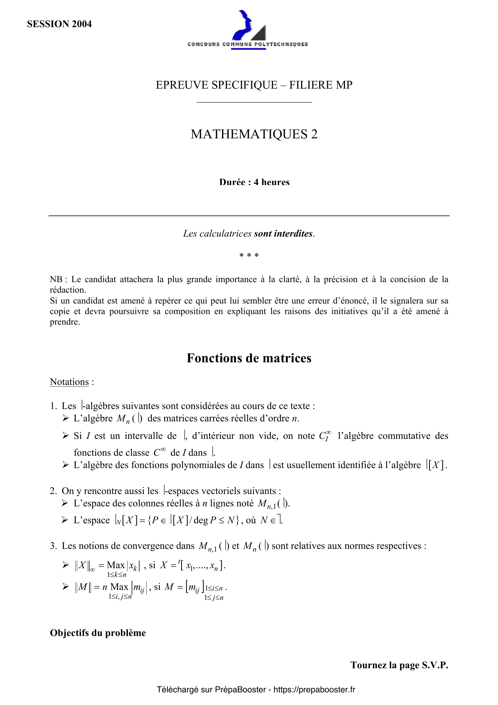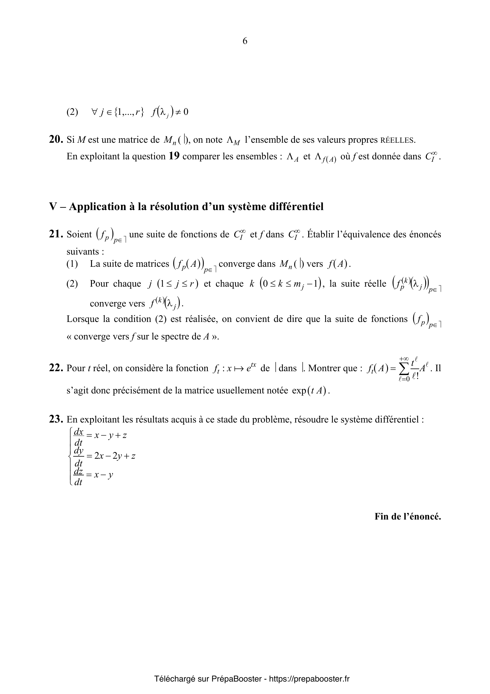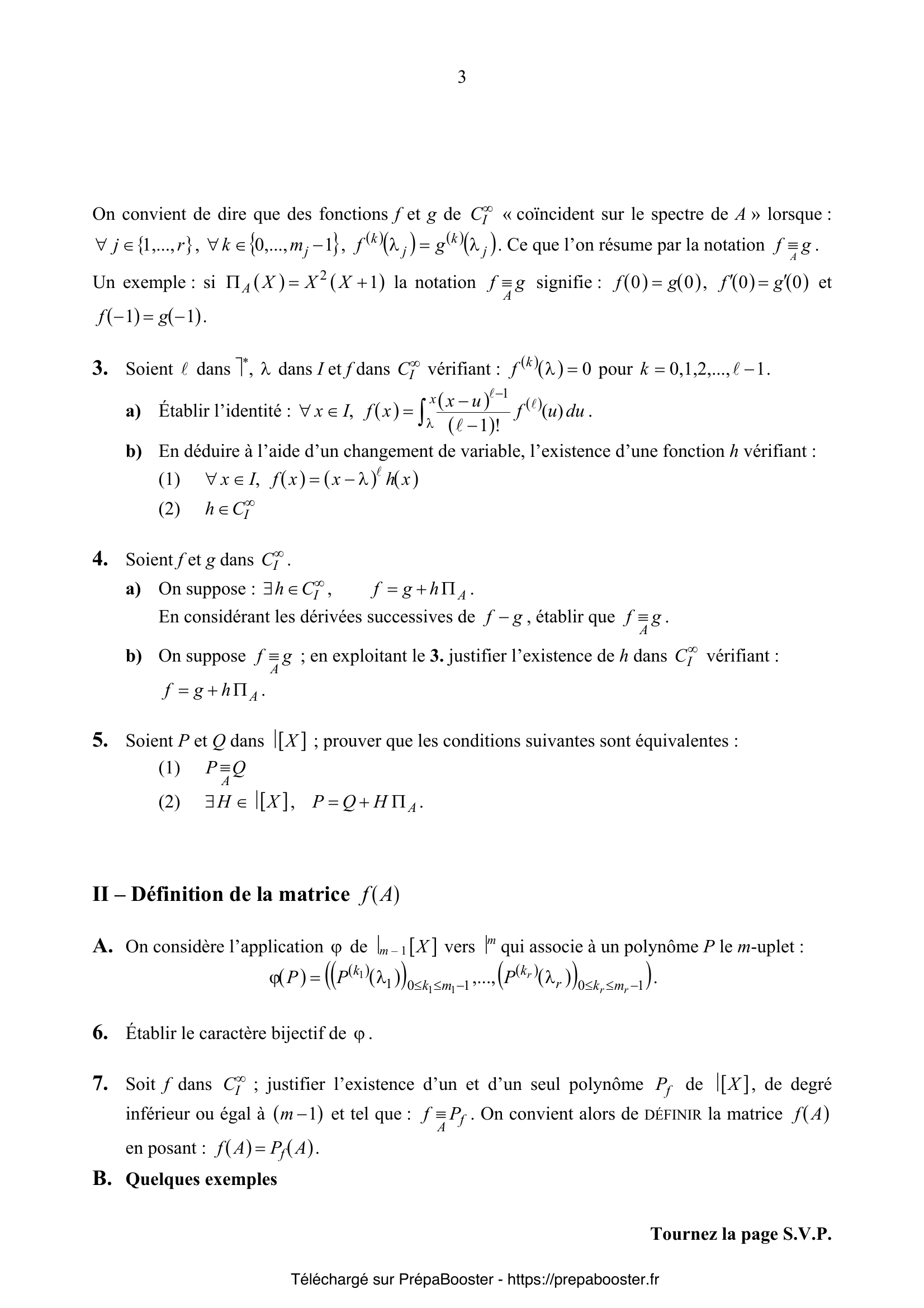 1. Établir que pour $X$ dans $M_{n,1}(\mathbb{R})$ et $M$ dans $M_n(\mathbb{R})$, on a : $\|MX\|_\infty \leq \|M\|_\infty \|X\|_\infty$. 2. Soit $M$ un sous-espace vectoriel de dimension $d \geq 1$ de $M_n(\mathbb{R})$, et soit $\mathcal{B} = (\beta_1, …, \beta_d)$ une base de $M$. \begin{enumerate} \item[a)] Montrer que l’on définit une norme $N$ sur $M$ en posant $N(M) = \max_{1 \leq k \leq d} |x_k|$ si $M = \sum_{k=1}^d x_k \beta_k$ est la décomposition de l’élément $M$ de $M$ sur la base $\mathcal{B}$. \item[b)] Justifier l’existence de constantes réelles strictement positives $a$ et $b$ vérifiant : $\forall M \in M, \; a\|M\| \leq N(M) \leq b\|M\|$. \item[c)] Soit $(M_p)_{p \in \mathbb{N}}$ une suite d’éléments de $M$ ; on note $M_p = \sum_{k=1}^d x_{k,p} \beta_k$ la décomposition de $M_p$ sur $\mathcal{B}$. Montrer que la suite $(M_p)_{p \in \mathbb{N}}$ converge vers $0$ dans $(M_n(\mathbb{R}), \| \cdot \|)$ si et seulement si chaque suite réelle $(x_{k,p})_{p \in \mathbb{N}}$ $(k=1,…,d)$ converge vers $0$. \end{enumerate} 3. Soient $l \in \mathbb{N}^*$, $\lambda \in I$ et $f \in C^\infty(I)$ vérifiant : $f^{(k)}(\lambda) = 0$ pour $k = 0,1,2,…,l-1$. \begin{enumerate} \item[a)] Établir l’identité : \[ f(x) = \frac{1}{(l-1)!} \int_\lambda^x (x-u)^{l-1} f^{(l)}(u) \, du, \; \forall x \in I. \] \item[b)] En déduire à l’aide d’un changement de variable, l’existence d’une fonction $h$ vérifiant : \\ (1) $\forall x \in I, \; f(x) = (x-\lambda)^l h(x)$ \\ (2) $h \in C^\infty(I)$ \end{enumerate} 4. Soient $f$ et $g$ dans $C^\infty(I)$. \begin{enumerate} \item[a)] On suppose $ \exists h \in C^\infty(I),\; f = g + h \Pi_A$. En considérant les dérivées successives de $f-g$, établir que $f \equiv_A g$. \item[b)] On suppose $f \equiv_A g$ ; en exploitant le 3., justifier l’existence de $h$ dans $C^\infty(I)$ vérifiant : $f = g + h \Pi_A$. \end{enumerate} 5. Soient $P$ et $Q$ dans $\mathbb{R}[X]$ ; prouver que les conditions suivantes sont équivalentes : \begin{enumerate} \item[(1)] $P \equiv_A Q$ ; \item[(2)] $\exists H \in \mathbb{R}[X],\; P = Q + H\Pi_A$. \end{enumerate}} 6. Établir le caractère bijectif de $\varphi$, application de $\mathbb{R}^{m-1}[X]$ vers $\mathbb{R}^m$ qui associe à un polynôme $P$ le $m$-uplet : $\varphi(P) = (P^{(k)}(\lambda_j))_{1 \leq j \leq r, 0 \leq k \leq m_j-1}$. 7. Soit $f \in C^\infty(I)$ ; justifier l’existence d’un et d’un seul polynôme $P_f$ de $\mathbb{R}[X]$, de degré inférieur ou égal à $(m-1)$ et tel que $f \equiv_A P_f$. On convient alors de DÉFINIR la matrice $f(A)$ en posant : $f(A) = P_f(A)$. 8. On suppose ici que $f$ est polynomiale et l’on écrit : $f(x) = \sum_{k=0}^N a_k x^k, \forall x \in I$. En effectuant une division euclidienne, montrer qu’avec la définition de la question 7, on obtient le résultat naturel : $f(A) = \sum_{k=0}^N a_k A^k$. 9. ICI : $A = \begin{pmatrix} 2 & 4 \\ 3 & 5 \end{pmatrix} \in M_2(\mathbb{R})$ et $I = \mathbb{R}$. \begin{enumerate} \item[a)] Calculer $\Pi_A(X)$. \item[b)] Calculer la matrice $f(A)$ dans chacun des cas suivants : \begin{enumerate} \item[(1)] $f(x) = a x + b$, les réels $a$ et $b$ étant donnés. \item[(2)] $f(x) = \sin(\pi x)$. \item[(3)] $f(x) = (x^2-1)g(x)$, où la fonction $g$ est donnée dans $C^\infty(I)$. \end{enumerate} \end{enumerate} 10. En exploitant l’isomorphisme linéaire $\varphi$ du II.A, justifier l’existence et l’unicité de polynômes $Q_{j,k}$ $(1\leq j\leq r, 0\leq k\leq m_j-1)$ vérifiant : pour TOUTE fonction $f$ de $C^\infty(I)$, on a : $P_f(X) = \sum_{j=1}^r \sum_{k=0}^{m_j-1} f^{(k)}(\lambda_j) Q_{j,k}(X)$.} 11. On considère alors les matrices dites « associées » à $A$ : $Z_{j,k} = Q_{j,k}(A)$ $(1\leq j\leq r, 0\leq k\leq m_j-1)$. Montrer que les diverses matrices $Z_{j,k}$ sont linéairement indépendantes et que : $\forall f \in C^\infty(I),\quad f(A) = \sum_{j=1}^r \sum_{k=0}^{m_j-1} f^{(k)}(\lambda_j) Z_{j,k}$. 12. ICI : $A = \begin{pmatrix} 4 & 3 \\ -5 & -4 \end{pmatrix} \in M_2(\mathbb{R})$ et $I = \mathbb{R}_+^*$. \begin{enumerate} \item[a)] Justifier l’existence de matrices $Z_1$ et $Z_2$ de $M_2(\mathbb{R})$ telles que : $\forall f \in C^\infty(I),\ f(A) = f(1) Z_1 + f'(1) Z_2$. \item[b)] EN DÉDUIRE le calcul de $Z_1$ et $Z_2$. \item[c)] Calculer les matrices $A$, $A^{2004}$ et plus généralement $A^\alpha$ pour $\alpha \in \mathbb{R}_+^*$. \end{enumerate} 13. ICI : $A = \begin{pmatrix} 1 & 1 & 0 \\ 2 & 2 & 1 \\ 1 & 1 & 1 \end{pmatrix} \in M_3(\mathbb{R})$ et $I = \mathbb{R}$. \begin{enumerate} \item[a)] Présenter sous forme factorisée le polynôme $\Pi_A(X)$. La matrice $A$ est-elle diagonalisable dans $M_3(\mathbb{R})$? \item[b)] Calculer les matrices $Z_{j,k}$ « associées » à $A$. \end{enumerate} 14. Soient $f$ et $g$ dans $C^\infty(I)$ et $\alpha$ dans $\mathbb{R}$. \begin{enumerate} \item[a)] Que valent $P_{\alpha f}$ et $P_{f+g}$ ? \item[b)] Justifier l’existence d’un polynôme $H$ de $\mathbb{R}[X]$ tel que : $P_{fg} = P_f P_g + H\Pi_A$. \end{enumerate} 15. \begin{enumerate} \item[a)] Montrer que l’application $S : f \mapsto f(A)$ de $C^\infty(I)$ dans $M_n(\mathbb{R})$ est un morphisme de $\mathbb{R}$-algèbres. \item[b)] Quel est son noyau ? \end{enumerate}} 16. On considère les fonctions cosinus et sinus de $\mathbb{R}$ dans $\mathbb{R}$, puis les fonctions $f : x \mapsto x$ et $f_1 : x \mapsto \sqrt{x}$ de $\mathbb{R}_+^*$ dans $\mathbb{R}$. On peut ainsi DÉFINIR les matrices $\cos A$, $\sin A$ et même $A^{1/2}$ et $A^{-1}$ si les $\lambda_j$ sont dans $\mathbb{R}_+^*$. \begin{enumerate} \item[a)] En exploitant le morphisme $S$, calculer $\cos^2(A) + \sin^2(A)$. \item[b)] On suppose ici que les $\lambda_j$ sont strictement positifs. Reconnaître $A^{1/2}$ et $A^{-1}$. \end{enumerate} 17. Montrer que l’ensemble noté $M_A = \{f(A) \mid f \in C^\infty(I)\}$ est une sous-algèbre COMMUTATIVE de $M_n(\mathbb{R})$ et préciser sa dimension. 18. Montrer que si u