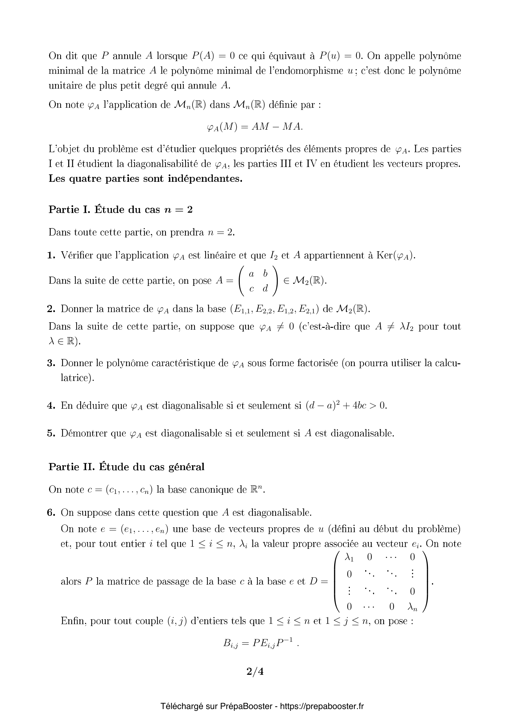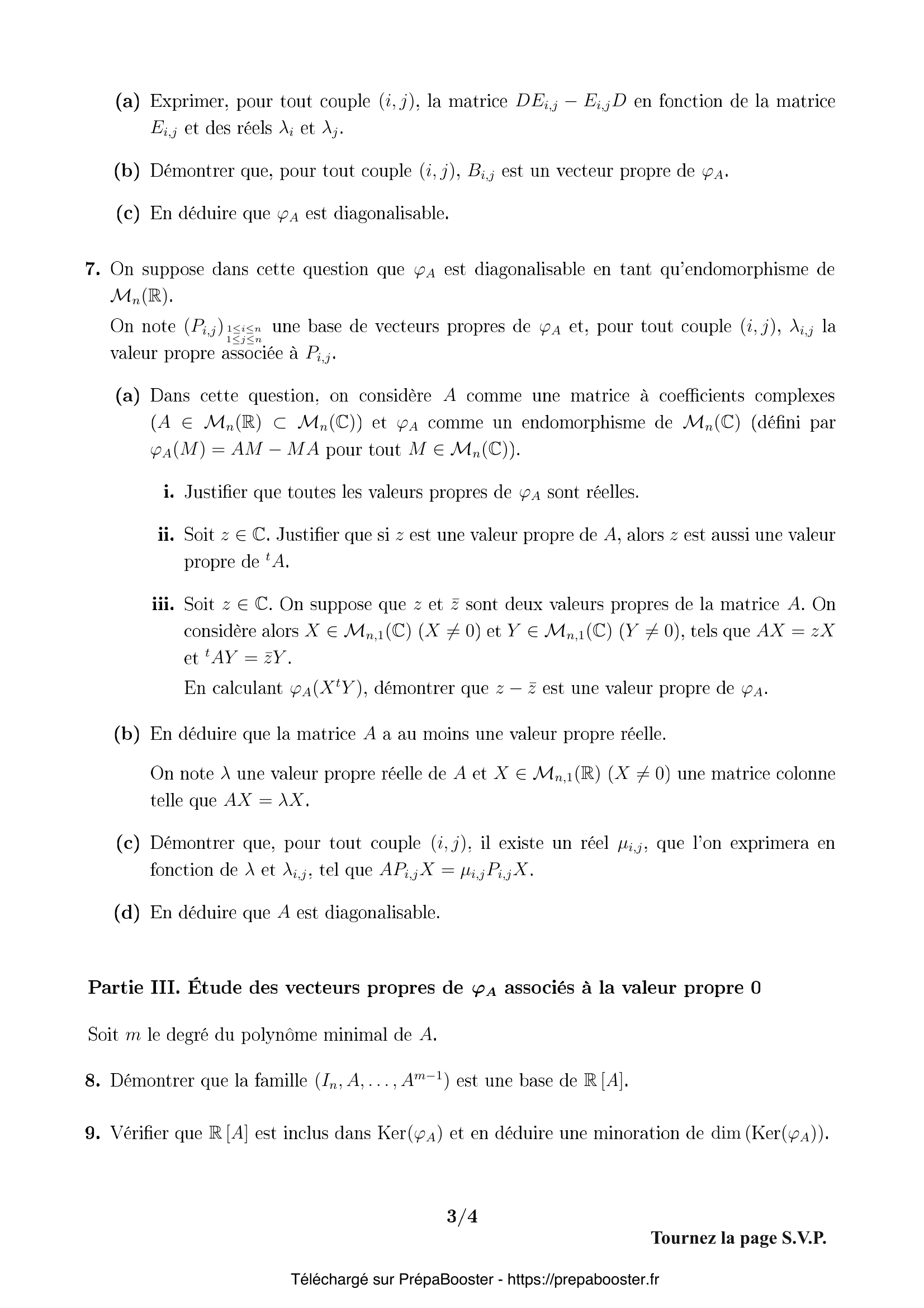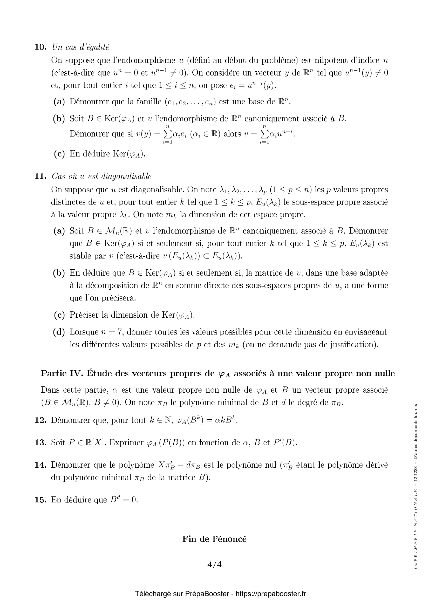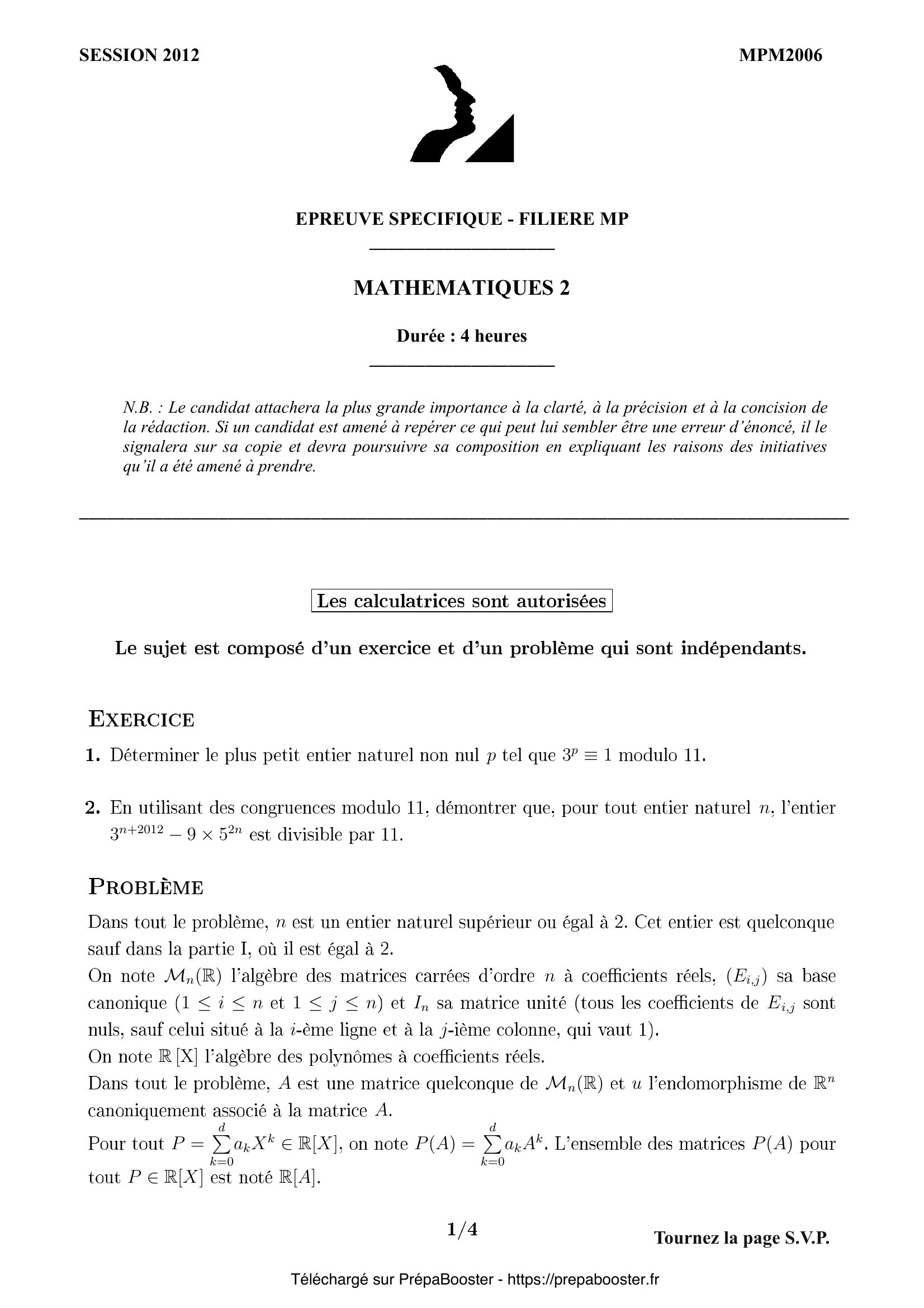 1. Déterminer le plus petit entier naturel non nul $p$ tel que $3^p \equiv 1$ modulo $11$. 2. En utilisant des congruences modulo $11$, démontrer que, pour tout entier naturel $n$, l’entier $3^{n+2012} – 9 \times 5^{2n}$ est divisible par $11$. 3. Vérifier que l’application $\varphi_A$ est linéaire et que $I_2$ et $A$ appartiennent à $\ker(\varphi_A)$. 4. Dans la suite de cette partie, on pose $A = \begin{pmatrix} a & b \\ c & d \end{pmatrix} \in M_2(\mathbb{R})$. Donner la matrice de $\varphi_A$ dans la base $(E_{1,1}, E_{2,2}, E_{1,2}, E_{2,1})$ de $M_2(\mathbb{R})$. 5. Donner le polynôme caractéristique de $\varphi_A$ sous forme factorisée (on pourra utiliser la calculatrice).} 6. En déduire que $\varphi_A$ est diagonalisable si et seulement si $(d-a)^2 + 4bc > 0$. 7. Démontrer que $\varphi_A$ est diagonalisable si et seulement si $A$ est diagonalisable. 8. On suppose dans cette question que $A$ est diagonalisable. \\ On note $e = (e_1, \ldots, e_n)$ une base de vecteurs propres de $u$ (défini au début du problème) et, pour tout entier $i$ tel que $1 \leq i \leq n$, $\lambda_i$ la valeur propre associée au vecteur $e_i$. On note alors $P$ la matrice de passage de la base $c$ à la base $e$ et $D = \begin{pmatrix} \lambda_1 & 0 & \cdots & 0 \\ 0 & \ddots & \ddots & \vdots \\ \vdots & \ddots & \ddots & 0 \\ 0 & \cdots & 0 & \lambda_n \end{pmatrix}$. Enfin, pour tout couple $(i, j)$ d’entiers tels que $1 \leq i \leq n$ et $1 \leq j \leq n$, on pose~: $B_{i,j} = PE_{i,j}P^{-1}$. \begin{enumerate} \item[(a)] Exprimer, pour tout couple $(i, j)$, la matrice $DE_{i,j} – E_{i,j}D$ en fonction de la matrice $E_{i,j}$ et des réels $\lambda_i$ et $\lambda_j$. \item[(b)] Démontrer que, pour tout couple $(i, j)$, $B_{i,j}$ est un vecteur propre de $\varphi_A$. \item[(c)] En déduire que $\varphi_A$ est diagonalisable. \end{enumerate} 9. On suppose dans cette question que $\varphi_A$ est diagonalisable en tant qu’endomorphisme de $M_n(\mathbb{R})$. \\ On note $\left(P_{i,j}\right)_{1 \leq i \leq n, 1 \leq j \leq n}$ une base de vecteurs propres de $\varphi_A$ et, pour tout couple $(i, j)$, $\lambda_{i,j}$ la valeur propre associée à $P_{i,j}$. \begin{enumerate} \item[(a)] Dans cette question, on considère $A$ comme une matrice à coefficients complexes ($A \in M_n(\mathbb{R}) \subset M_n(\mathbb{C})$) et $\varphi_A$ comme un endomorphisme de $M_n(\mathbb{C})$ (défini par $\varphi_A(M) = AM – MA$ pour tout $M \in M_n(\mathbb{C})$). \begin{enumerate} \item[i.] Justifier que tous les vecteurs propres de $\varphi_A$ sont réels. \item[ii.] Soit $z \in \mathbb{C}$. Justifier que si $z$ est une valeur propre de $A$, alors $\bar{z}$ est aussi une valeur propre de $A$. \item[iii.] Soit $z \in \mathbb{C}$. On suppose que $z$ et $\bar{z}$ sont des valeurs propres de la matrice $A$. On considère alors $X \in M_{n,1}(\mathbb{C}) \setminus \{0\}$ et $Y \in M_{n,1}(\mathbb{C}) \setminus \{0\}$ tels que $AX = zX$ et $A^T Y = \bar{z} Y$. En calculant $\varphi_A(X^T Y)$, démontrer que $z – \bar{z}$ est une valeur propre de $\varphi_A$. \end{enumerate} \item[(b)] En déduire que la matrice $A$ a au moins une valeur propre réelle. \item[(c)] Démontrer que, pour tout couple $(i, j)$, il existe un réel $\mu_{i,j}$, que l’on exprimera en fonction de $\lambda$ et $\lambda_{i,j}$, tel que $AP_{i,j}X = \mu_{i,j} P_{i,j}X$. \item[(d)] En déduire que $A$ est diagonalisable. \end{enumerate} 10. Soit $m$ le degré du polynôme minimal de $A$. \begin{enumerate} \item Démontrer que la famille $(I_n, A, \ldots, A^{m-1})$ est une base de $\mathbb{R}[A]$. \item Vérifier que $\mathbb{R}[A]$ est inclus dans $\ker(\varphi_A)$ et en déduire une minoration de $\dim(\ker(\varphi_A))$. \end{enumerate} } 11. On suppose que l’endomorphisme $u$ (défini au début du problème) est nilpotent d’indice $n$ (c’est-à-dire que $u^n = 0$ et $u^{n-1} \neq 0$). On considère un vecteur $y$ de $\mathbb{R}^n$ tel que $u^{n-1}(y) \neq 0$ et, pour tout entier $i$ tel que $1 \leq i \leq n$, on pose $e_i = u^{n-i}(y)$. \begin{enumerate} \item[(a)] Démontrer que la famille $(e_1, e_2, \ldots, e_n)$ est une base de $\mathbb{R}^n$. \item[(b)] Soit $B \in \ker(\varphi_A)$ et $v$ l’endomorphisme de $\mathbb{R}^n$ canoniquement associé à $B$. Démontrer que si $v(y) = \sum_{i=1}^n \alpha_i e_i$ ($\alpha_i \in \mathbb{R}$) alors $v = \sum_{i=1}^n \alpha_i u^{n-i}$. \item[(c)] En déduire $\ker(\varphi_A)$. \end{enumerate} 12. On suppose que $u$ est diagonalisable. On note $\lambda_1, \lambda_2, \ldots, \lambda_p$ ($1 \leq p \leq n$) les $p$ valeurs propres distinctes de $u$ et, pour tout entier $k$ tel que $1 \leq k \leq p$, $E_u(\lambda_k)$ le sous-espace propre associé à la valeur propre $\lambda_k$. On note $m_k$ la dimension de ce sous-espace propre. \begin{enumerate} \item[(a)] Soit $B \in M_n(\mathbb{R})$ et $v$ l’endomorphisme de $\mathbb{R}^n$ canoniquement associé à $B$. Démontrer que si $B \in \ker(\varphi_A)$ alors, pour tout entier $k$ tel que $1 \leq k \leq p$, $E_u(\lambda_k)$ est stable par $v$ (c’est-à-dire $v(E_u(\lambda_k)) \subset E_u(\lambda_k)$). \item[(b)] En déduire que $B \in \ker(\varphi_A)$ si et seulement si, la matrice de $v$, dans une base adaptée formée de vecteurs propres de $u$, est formée de blocs sous-espaces propres. \item[(c)] Préciser la dimension de $\ker(\varphi_A)$. \item[(d)] Lorsque $n = 7$, donner toutes les valeurs possibles pour cette dimension en envisageant les différentes valeurs possibles de $p$ et des $m_k$ (on ne demande pas de justification). \end{enumerate} 13. Dans cette partie, $\alpha$ est une valeur propre non nulle de $\varphi_A$ et $B$ un vecteur propre associé ($B \in M_n(\mathbb{R})$, $B \neq 0$). On note $\pi_B$ le polynôme minimal de $B$ et $d$ le degré de $\pi_B$. \begin{enumerate} \item Démontrer que, pour tout $k \in \mathbb{N}$, $\varphi_A(B^k) = \alpha k B^k$. \item Soit $P \in \mathbb{R}[X]$. Exprimer $\varphi_A(P(B))$
