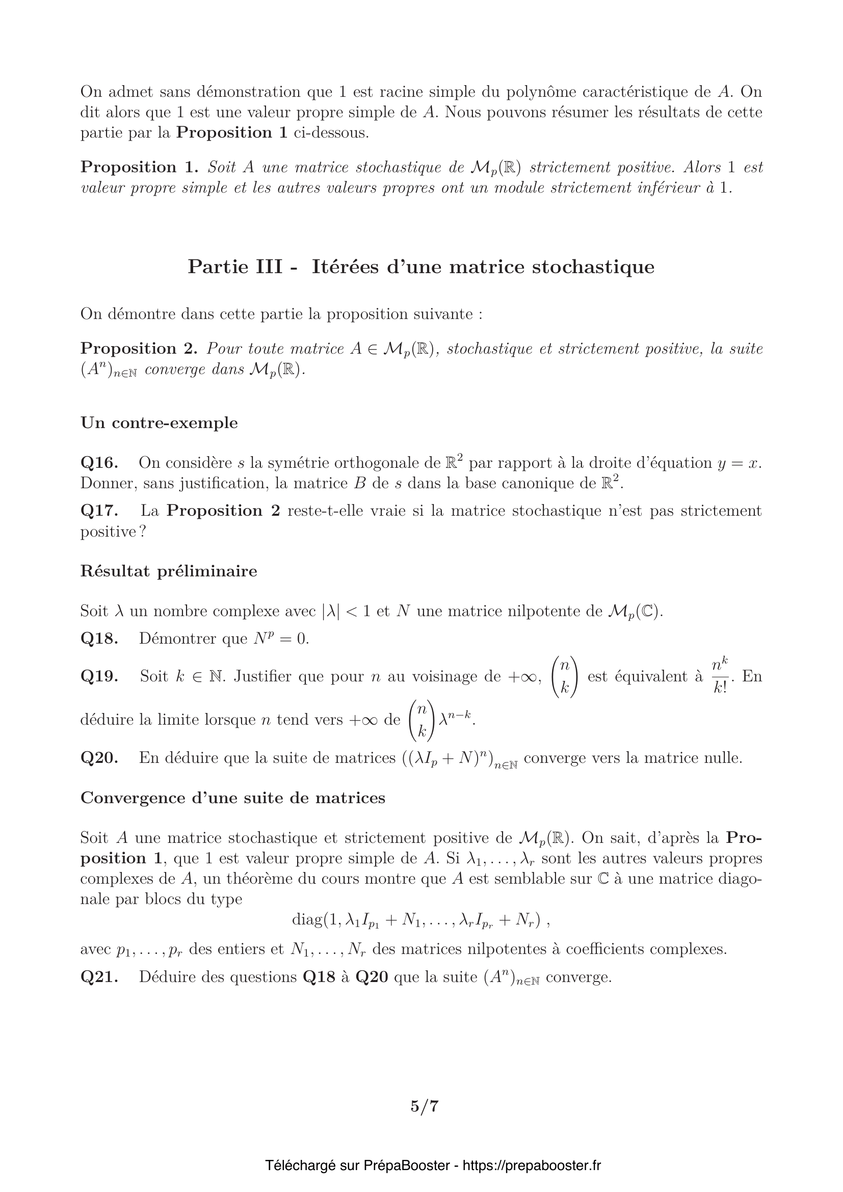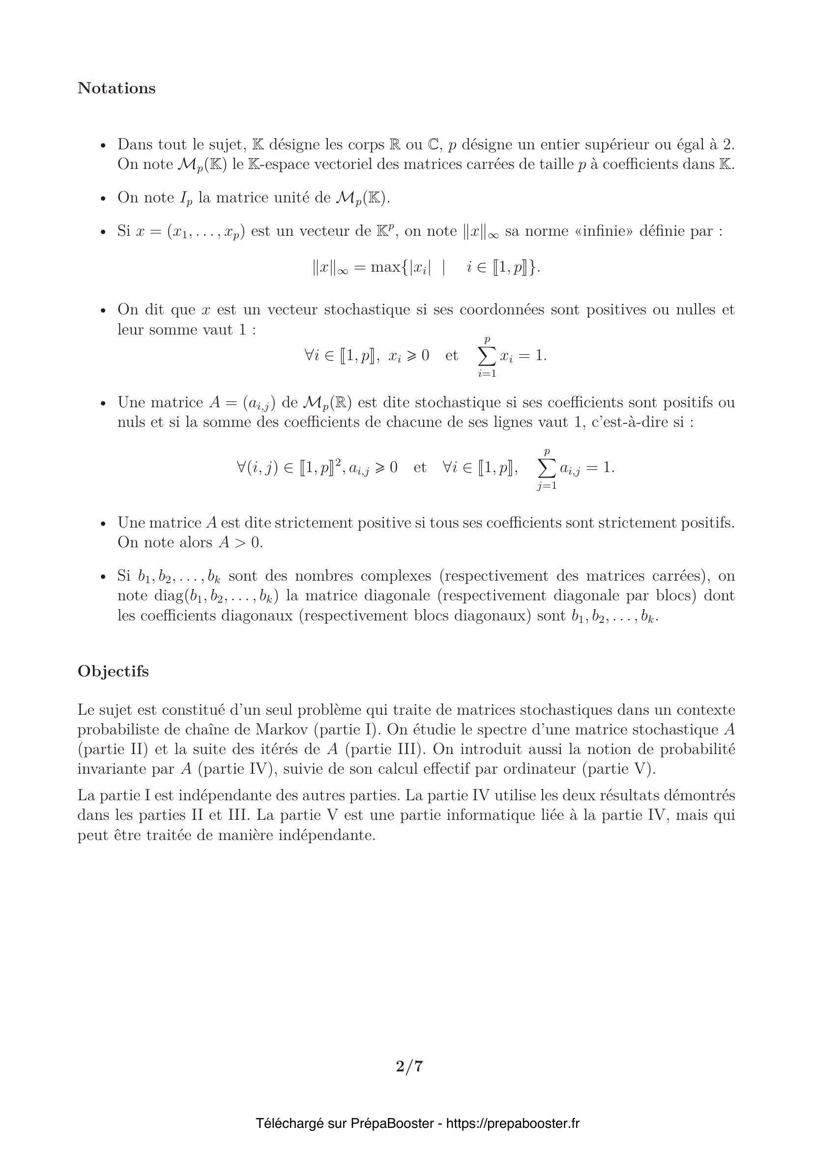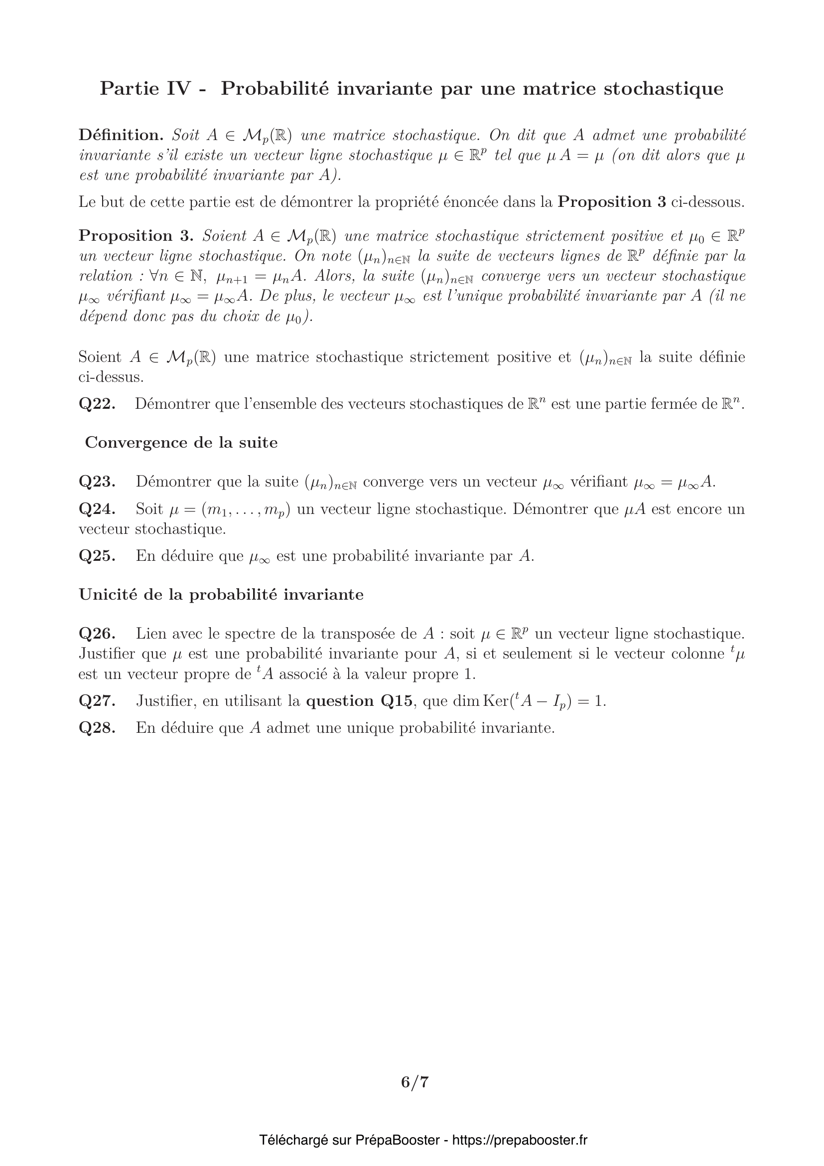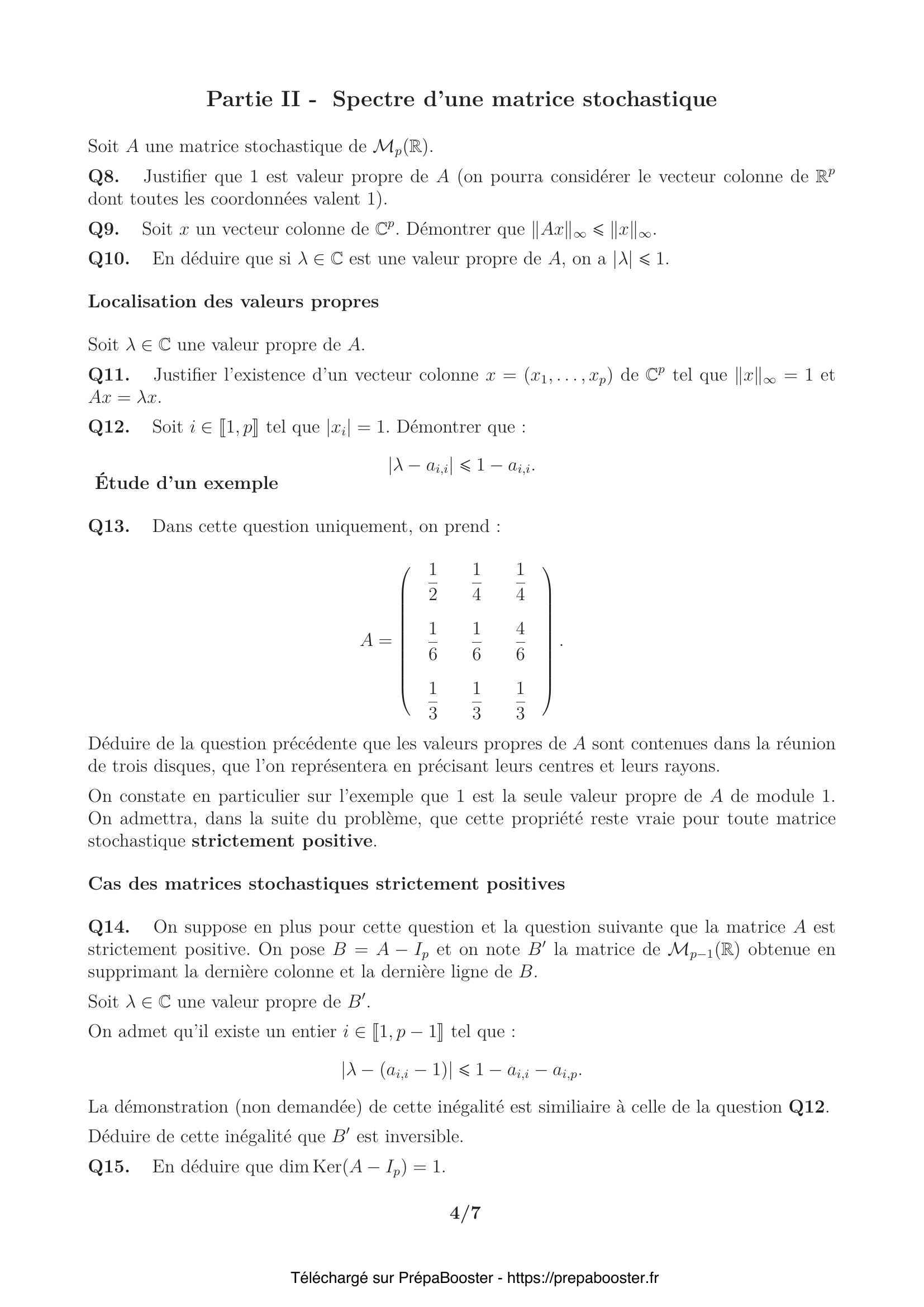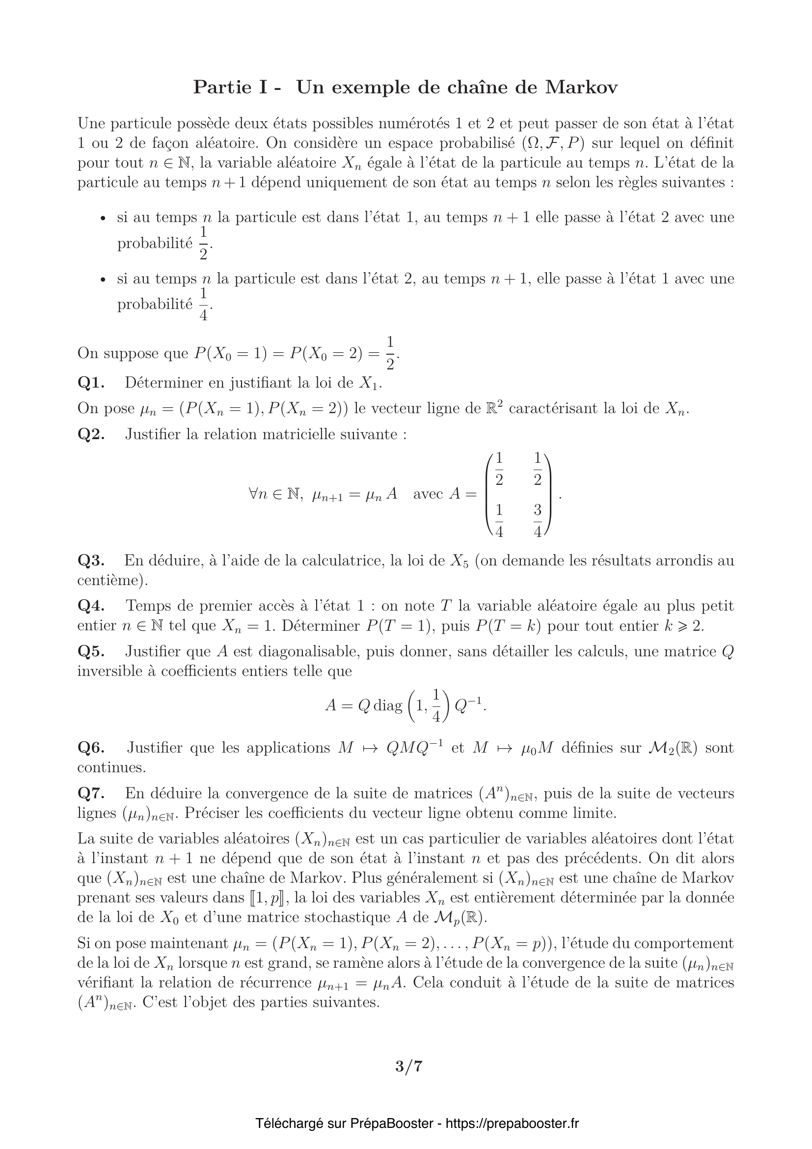 1. Déterminer en justifiant la loi de $X_1$. 2. Justifier la relation matricielle suivante : \[\forall n \in \mathbb{N}, \mu_{n+1} = \mu_n A \text{ avec } A = \begin{pmatrix} \frac{1}{2} & \frac{1}{2} \\ \frac{1}{4} & \frac{3}{4} \end{pmatrix}.\] 3. En déduire, à l’aide de la calculatrice, la loi de $X_5$ (on demande les résultats arrondis au centième). 4. Temps de premier accès à l’état $1$ : on note $T$ la variable aléatoire égale au plus petit entier $n \in \mathbb{N}$ tel que $X_n = 1$. Déterminer $\mathbb{P}(T = 1)$, puis $\mathbb{P}(T = k)$ pour tout entier $k \ge 2$. 5. Justifier que $A$ est diagonalisable, puis donner, sans détailler les calculs, une matrice $Q$ inversible à coefficients entiers telle que \[ A = Q \ \mathrm{diag}\left( 1,\ \frac{1}{4} \right) Q^{-1}. \]} 6. Justifier que les applications $M \mapsto QMQ^{-1}$ et $M \mapsto \mu_0 M$ définies sur $M_2(\mathbb{R})$ sont continues. 7. En déduire la convergence de la suite de matrices $(A^n)_{n \in \mathbb{N}}$, puis de la suite de vecteurs lignes $(\mu_n)_{n \in \mathbb{N}}$. Préciser les coefficients du vecteur ligne obtenu comme limite. 8. Justifier que $1$ est valeur propre de $A$ (on pourra considérer le vecteur colonne de $\mathbb{R}^p$ dont toutes les coordonnées valent $1$). 9. Soit $x$ un vecteur colonne de $\mathbb{C}^p$. Démontrer que $\|Ax\|_\infty \le \|x\|_\infty$. 10. En déduire que si $\lambda \in \mathbb{C}$ est une valeur propre de $A$, on a $|\lambda| \le 1$.} 11. Justifier l’existence d’un vecteur colonne $x = (x_1,…,x_p)$ de $\mathbb{C}^p$ tel que $\|x\|_\infty = 1$ et $Ax = \lambda x$. 12. Soit $i \in \{1, …, p\}$ tel que $|x_i| = 1$. Démontrer que : \[ |\lambda – a_{i,i}| \le 1 – a_{i,i}. \] 13. Dans cette question uniquement, on prend : \[A = \begin{pmatrix} \frac{1}{2} & \frac{1}{4} & \frac{1}{4} \\ \frac{1}{6} & \frac{4}{6} & \frac{1}{3} \\ \frac{1}{3} & \frac{1}{3} & \frac{1}{3} \end{pmatrix}.\] Déduire de la question précédente que les valeurs propres de $A$ sont contenues dans la réunion de trois disques, que l’on représentera en précisant leurs centres et leurs rayons. 14. On suppose en plus pour cette question et la question suivante que la matrice $A$ est strictement positive. On pose $B = A – I_p$ et on note $B’$ la matrice de $M_{p-1}(\mathbb{R})$ obtenue en supprimant la dernière colonne et la dernière ligne de $B$. Soit $\lambda \in \mathbb{C}$ une valeur propre de $B’$. On admet qu’il existe un entier $i \in \{1,\ldots,p-1\}$ tel que : \[|\lambda – (a_{i,i} – 1)| \le 1 – a_{i,i} – a_{i,p}.\] La démonstration (non demandée) de cette inégalité est similaire à celle de la question Q12. Déduire de cette inégalité que $B’$ est inversible. 15. En déduire que $\dim \ker(A – I_p)=1$.} 16. On considère $s$ la symétrie orthogonale de $\mathbb{R}^2$ par rapport à la droite d’équation $y = x$. Donner, sans justification, la matrice $B$ de $s$ dans la base canonique de $\mathbb{R}^2$. 17. La Proposition 2 reste-t-elle vraie si la matrice stochastique n’est pas strictement positive ? 18. Soit $\lambda$ un nombre complexe avec $|\lambda| < 1$ et $N$ une matrice nilpotente de $M_p(\mathbb{C})$. Démontrer que $N^p = 0$. 19. Soit $k \in \mathbb{N}$. Justifier que pour $n$ au voisinage de $+\infty$, $\binom{n}{k}$ est équivalent à $\dfrac{n^k}{k!}$. En déduire la limite lorsque $n$ tend vers $+\infty$ de $\binom{n}{k}\lambda^{n-k}$. 20. En déduire que la suite de matrices $((\lambda I_p + N)^n)_{n \in \mathbb{N}}$ converge vers la matrice nulle.} 21. Déduire des questions Q18 à Q20 que la suite $(A^n)_{n \in \mathbb{N}}$ converge. 22. Démontrer que l’ensemble des vecteurs stochastiques de $\mathbb{R}^n$ est une partie fermée de $\mathbb{R}^n$. 23. Démontrer que la suite $(\mu_n)_{n\in\mathbb{N}}$ converge vers un vecteur $\mu_\infty$ vérifiant $\mu_\infty = \mu_\infty A$. 24. Soit $\mu = (m_1,...,m_p)$ un vecteur ligne stochastique. Démontrer que $\mu A$ est encore un vecteur stochastique. 25. En déduire que $\mu_\infty$ est une probabilité invariante par $A$.} 26. Lien avec le spectre de la transposée de $A$ : soit $\mu \in \mathbb{R}^p$ un vecteur ligne stochastique. Justifier que $\mu$ est une probabilité invariante pour $A$, si et seulement si le vecteur colonne $^t\mu$ est un vecteur propre de $^tA$ associé à la valeur propre $1$. 27. Justifier, en utilisant la question Q15, que $\dim \ker({}^tA - I_p) = 1$. 28. En déduire que $A$ admet une unique probabilité invariante. 29. On exécute le script suivant \\texttt{A = [ [1,2,3], [4,5,6], [7,8,9], [10,11,12] ]} qui représente la matrice \[A = \begin{pmatrix} 1 & 2 & 3 \\ 4 & 5 & 6 \\ 7 & 8 & 9 \\ 10 & 11 & 12 \end{pmatrix}\]. Donner les valeurs renvoyées lorsque l’on exécute len(A), A[1] et A[2][1]. 30. Écrire une fonction \texttt{difference} qui prend en arguments deux vecteurs $x$ et $y$ de même taille et renvoie le vecteur $x - y$. Par exemple si $x = (5, 2)$ et $y = (3, 7)$, \texttt{difference(x,y)} renverra \texttt{[2,-5]}.} 31. Écrire une fonction \texttt{norme} qui prend en arguments un vecteur $x = (x_1,...,x_p)$ et renvoie sa norme infinie $\|x\|_\infty = \max\{|x_i| \mid i \in \{1, ..., p\}\}$ (on pourra utiliser librement la fonction \texttt{abs} qui renvoie la valeur absolue d’un nombre, mais on s’interdit l’utilisation de la fonction \texttt{max} déjà implémentée dans Python). 32. Écrire une fonction \texttt{itere} qui prend en arguments un vecteur ligne $x$ et une matrice $A$ carrée de même taille que $x$ et qui renvoie le vecteur $xA$. Par exemple si $x = (1, 1)$ et $A = \begin{pmatrix} 1 & 2 \\ 4 & 5 \end{pmatrix}$, on a $xA = (5, 7)$ et donc \texttt{itere(x,A)} renverra \texttt{[5,7]}. 33. On a vu, dans la Partie IV, que si $A$ est une matrice strictement positive, la suite de vecteurs lignes de $\mathbb{R}^p$ associée $(\mu_n)_{n\in\mathbb{N}}$ définie par la relation : $\forall n \in \mathbb{N}, \mu_{n+