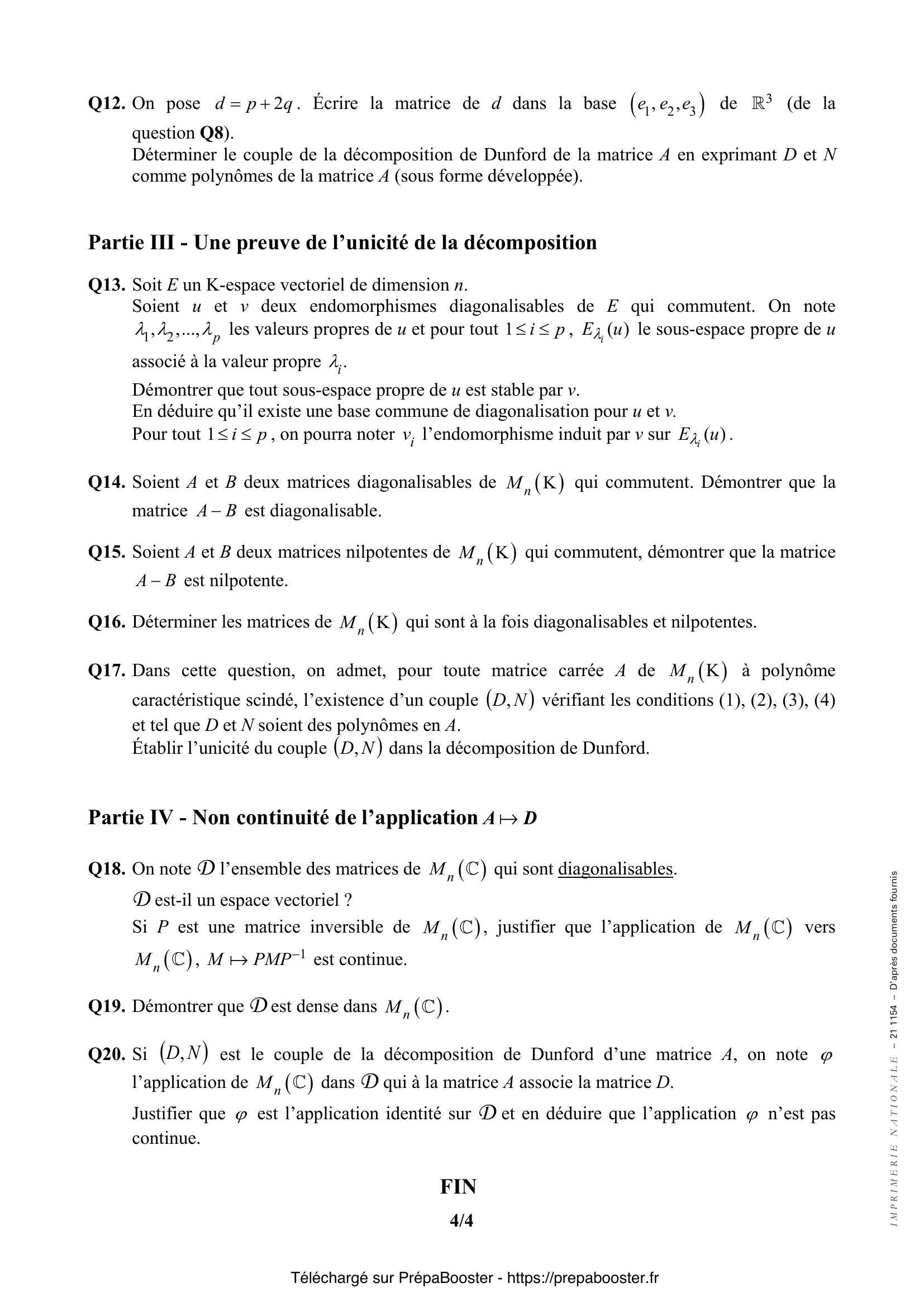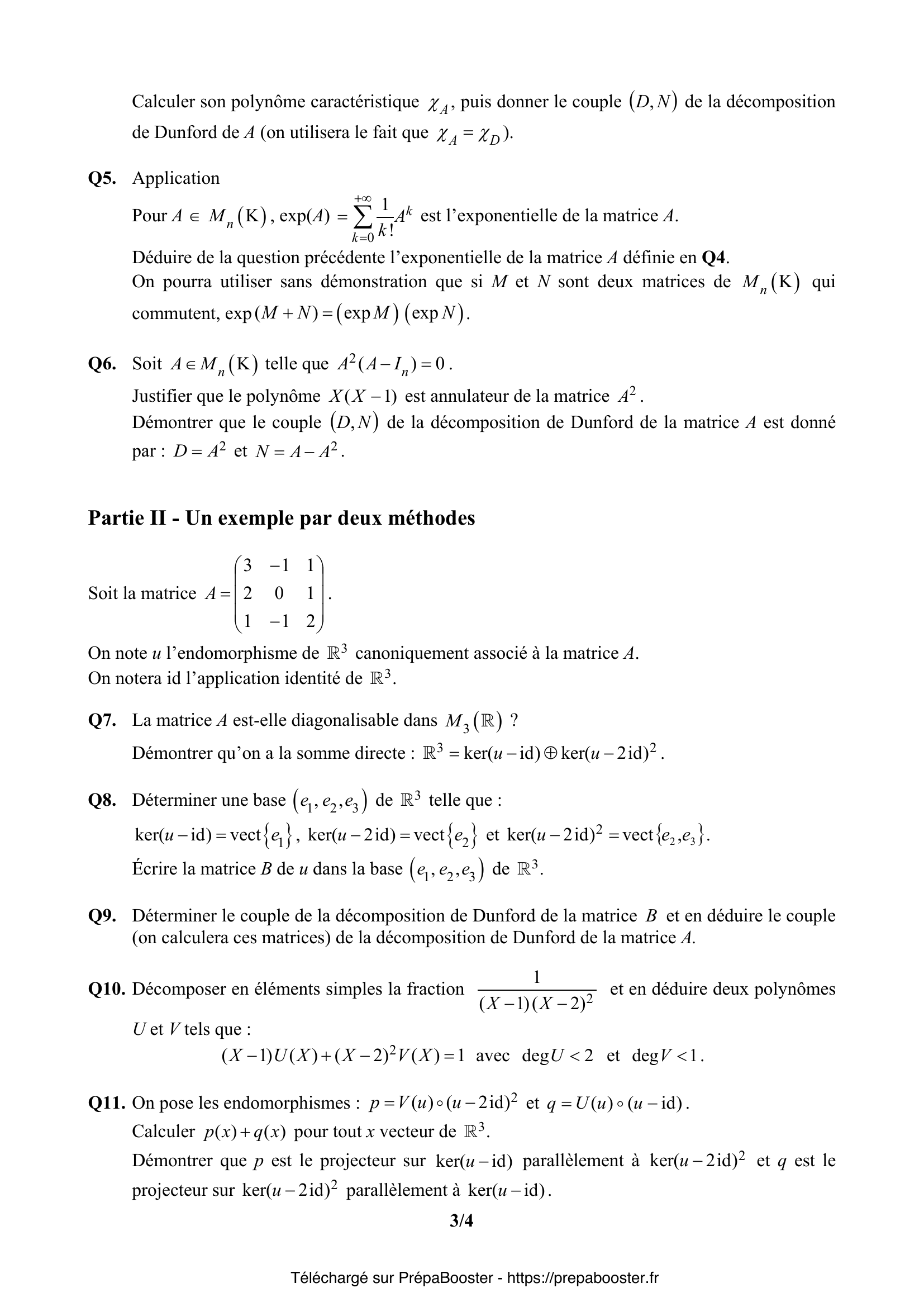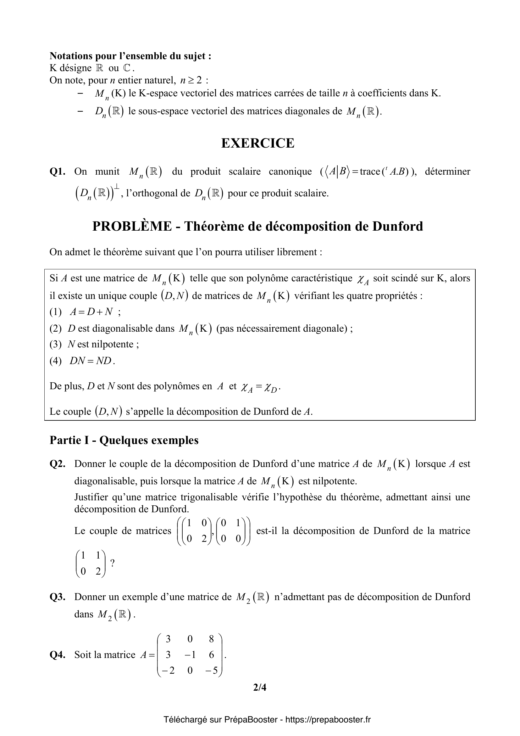 1. On munit $M_n(\mathbb{R})$ du produit scalaire canonique $(A|B) = \mathrm{trace}(A^tB)$, déterminer $D_n(\mathbb{R})^{\perp}$, l’orthogonal de $D_n(\mathbb{R})$ pour ce produit scalaire. 2. Donner le couple de la décomposition de Dunford d’une matrice $A$ de $M_n(K)$ lorsque $A$ est diagonalisable, puis lorsque la matrice $A$ de $M_n(K)$ est nilpotente.\\ Justifier qu’une matrice trigonalisable vérifie l’hypothèse du théorème, admettant ainsi une décomposition de Dunford.\\ Le couple de matrices $\left(\begin{pmatrix}0 & 0\\0 & 1\end{pmatrix}, \begin{pmatrix}0 & 2\\0 & 0\end{pmatrix}\right)$ est-il la décomposition de Dunford de la matrice $\begin{pmatrix}0 & 2\\1 & 1\end{pmatrix}$ ? 3. Donner un exemple d’une matrice de $M_2(\mathbb{R})$ n’admettant pas de décomposition de Dunford dans $M_2(\mathbb{R})$. 4. Soit la matrice $A = \begin{pmatrix}8 & 0 & 3 \\ 6 & 1 & 3 \\ 5 & 0 & 2\end{pmatrix}$. 5. Pour $A \in M_n(K)$, $\exp(A) = \sum_{k = 0}^{+ \infty} \frac{A^k}{k!}$ est l’exponentielle de la matrice $A$.\\ Déduire de la question précédente l’exponentielle de la matrice $A$ définie en Q4.\\ On pourra utiliser sans démonstration que si $M$ et $N$ sont deux matrices de $M_n(K)$ qui commutent, $\exp(M+N) = \exp(M)\exp(N)$.} 6. Soit $A \in M_n(K)$ telle que $A^2 – A = 0$.\\ Justifier que le polynôme $X(X-1)$ est annulateur de la matrice $A$.\\ Démontrer que le couple $(D,N)$ de la décomposition de Dunford de la matrice $A$ est donné par : $D = A^2$ et $N = A – A^2$. 7. Soit la matrice $A = \begin{pmatrix}1 & 1 & -1 \\ 2 & 0 & -1 \\ 1 & 1 & 2\end{pmatrix}$.\\ On note $u$ l’endomorphisme de $\mathbb{R}^3$ canoniquement associé à la matrice $A$.\\ On notera $\mathrm{id}$ l’application identité de $\mathbb{R}^3$.\\ La matrice $A$ est-elle diagonalisable dans $M_3(\mathbb{R})$ ?\\ Démontrer qu’on a la somme directe : $\mathbb{R}^3 = \ker(u-\mathrm{id}) \oplus \ker((u-2\mathrm{id})^2)$. 8. Déterminer une base $(e_1,e_2,e_3)$ de $\mathbb{R}^3$ telle que:\\ $\ker(u-\mathrm{id}) = \mathrm{vect}\{e_1\}$, $\ker(u-2\mathrm{id}) = \mathrm{vect}\{e_2\}$ et $\ker((u-2\mathrm{id})^2) = \mathrm{vect}\{e_2,e_3\}$.\\ Écrire la matrice $B$ de $u$ dans la base $(e_1,e_2,e_3)$ de $\mathbb{R}^3$. 9. Déterminer le couple de la décomposition de Dunford de la matrice $B$ et en déduire le couple (on calculera ces matrices) de la décomposition de Dunford de la matrice $A$. 10. Décomposer en éléments simples la fraction $\dfrac{1}{(X-1)(X-2)}$ et en déduire deux polynômes $U$ et $V$ tels que :\\ $U(X)(X-1) + V(X)(X-2) = 1$ avec $\deg U < 2$ et $\deg V < 1$.} 11. On pose les endomorphismes : $p = V(u) \circ (u-2\mathrm{id})$ et $q = U(u) \circ (u-\mathrm{id})$.\\ Calculer $p(x) + q(x)$ pour tout $x$ vecteur de $\mathbb{R}^3$.\\ Démontrer que $p$ est le projecteur sur $\ker(u-\mathrm{id})$ parallèlement à $\ker((u-2\mathrm{id})^2)$ et $q$ est le projecteur sur $\ker((u-2\mathrm{id})^2)$ parallèlement à $\ker(u-\mathrm{id})$. 12. On pose $d = p + 2q$. Écrire la matrice de $d$ dans la base $(e_1,e_2,e_3)$ de $\mathbb{R}^3$ (de la question Q8).\\ Déterminer le couple de la décomposition de Dunford de la matrice $A$ en exprimant $D$ et $N$ comme polynômes de la matrice $A$ (sous forme développée). 13. Soit $E$ un $K$-espace vectoriel de dimension $n$.\\ Soient $u$ et $v$ deux endomorphismes diagonalisables de $E$ qui commutent. On note $\lambda_1, \lambda_2, ..., \lambda_p$ les valeurs propres de $u$ et pour tout $1 \leq i \leq p$, $E_u(\lambda_i)$ le sous-espace propre de $u$ associé à la valeur propre $\lambda_i$.\\ Démontrer que tout sous-espace propre de $u$ est stable par $v$.\\ En déduire qu’il existe une base commune de diagonalisation pour $u$ et $v$.\\ Pour tout $1 \leq i \leq p$, on pourra noter $v_i$ l’endomorphisme induit par $v$ sur $E_u(\lambda_i)$. 14. Soient $A$ et $B$ deux matrices diagonalisables de $M_n(K)$ qui commutent. Démontrer que la matrice $A - B$ est diagonalisable. 15. Soient $A$ et $B$ deux matrices nilpotentes de $M_n(K)$ qui commutent, démontrer que la matrice $A - B$ est nilpotente.} 16. Déterminer les matrices de $M_n(K)$ qui sont à la fois diagonalisables et nilpotentes. 17. Dans cette question, on admet, pour toute matrice carrée $A$ de $M_n(K)$ à polynôme caractéristique scindé, l’existence d’un couple $(D,N)$ vérifiant les conditions (1), (2), (3), (4) et tel que $D$ et $N$ soient des polynômes en $A$.\\ Établir l’unicité du couple $(D,N)$ dans la décomposition de Dunford. 18. On note $D$ l’ensemble des matrices de $M_n(\mathbb{C})$ qui sont diagonalisables.\\ $D$ est-il un espace vectoriel ?\\ Si $P$ est une matrice inversible de $M_n(\mathbb{C})$, justifier que l’application de $M_n(\mathbb{C})$ vers $M_n(\mathbb{C})$, $M \mapsto PMP^{-1}$ est continue. 19. Démontrer que $D$ est dense dans $M_n(\mathbb{C})$. 20. Si $(D, N)$ est le couple de la décomposition de Dunford d’une matrice $A$, on note $\varphi$ l’application de $M_n(\mathbb{C})$ dans $D$ qui à la matrice $A$ associe la matrice $D$.\\ Justifier que $\varphi$ est l’application identité sur $D$ et en déduire que l’application $\varphi$ n’est pas continue.}FAQ