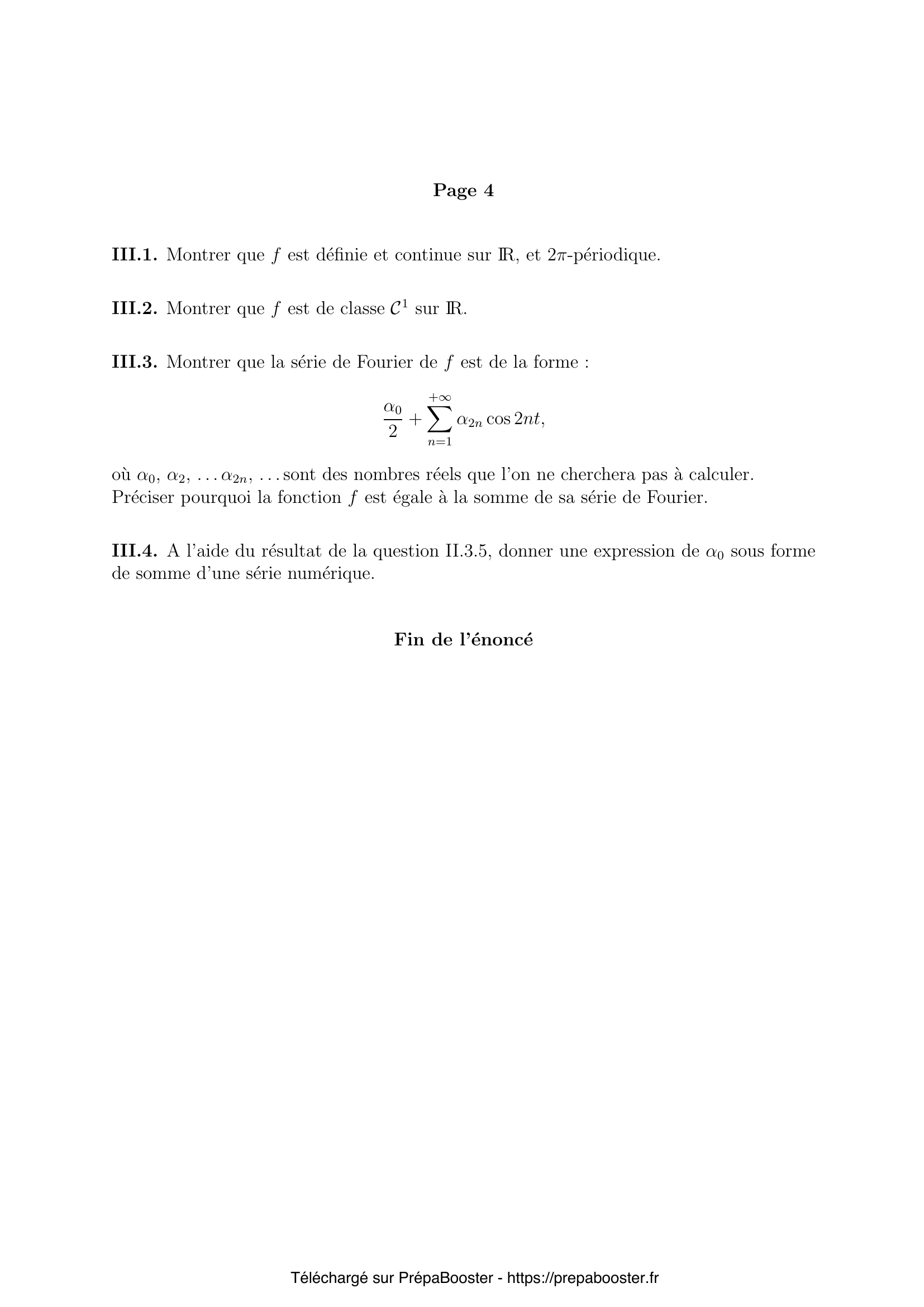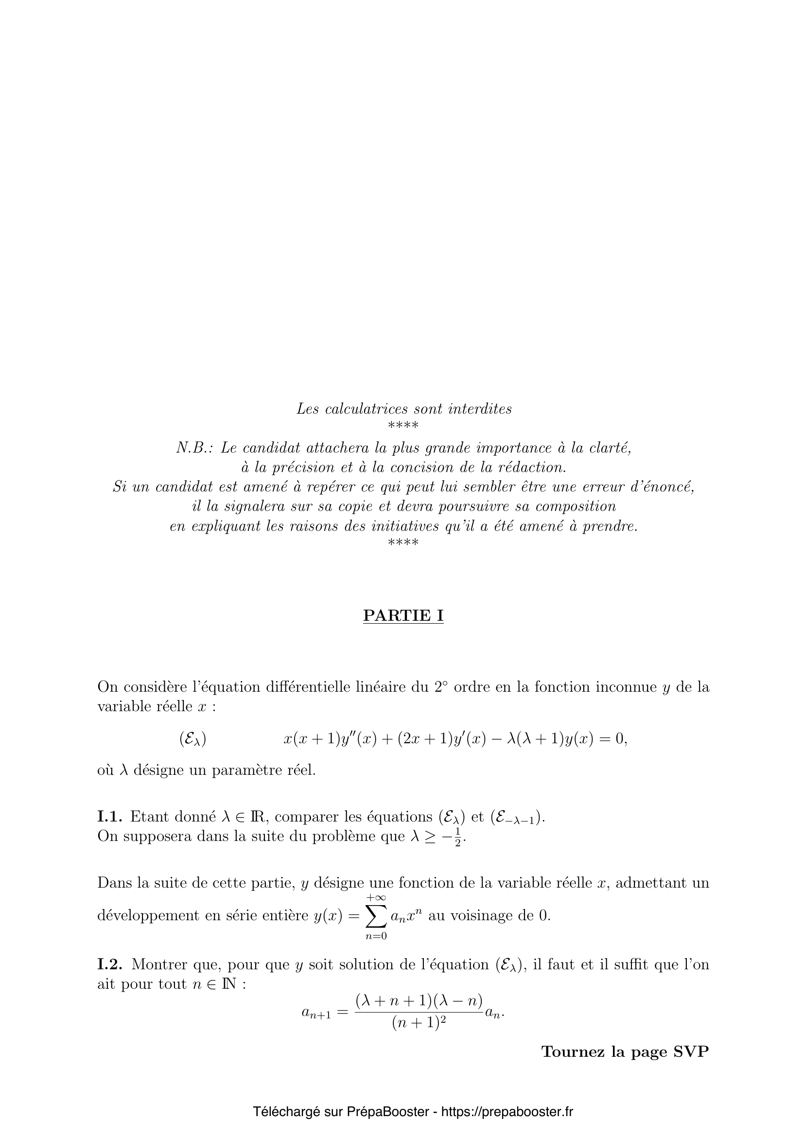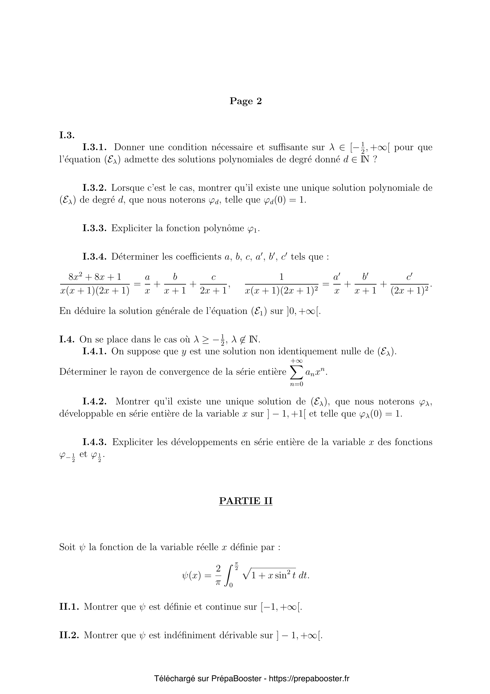 1. Étant donné $\lambda \in \mathbb{R}$, comparer les équations $(E_\lambda)$ et $(E_{-\lambda-1})$. 2. Montrer que, pour que $y$ soit solution de l’équation $(E_\lambda)$, il faut et il suffit que l’on ait pour tout $n \in \mathbb{N}$ : $$ a_{n+1} = \frac{(\lambda + n + 1)(\lambda – n)}{(n + 1)^2} a_n. $$ 3. Donner une condition nécessaire et suffisante sur $\lambda \in \left[-\frac{1}{2}, +\infty\right[$ pour que l’équation $(E_\lambda)$ admette des solutions polynomiales de degré donné $d \in \mathbb{N}$ ? 4. Lorsque c’est le cas, montrer qu’il existe une unique solution polynomiale de $(E_\lambda)$ de degré $d$, que nous noterons $\varphi_d,$ telle que $\varphi_d(0) = 1$. 5. Expliciter la fonction polynôme $\varphi_1$.} 6. Déterminer les coefficients $a, b, c, a’, b’, c’$ tels que : $$ \frac{8x^2 + 8x + 1}{x(x + 1)(2x + 1)} = \frac{a}{x} + \frac{b}{x + 1} + \frac{c}{2x + 1}, $$ $$ \frac{1}{x(x + 1)(2x + 1)^2} = \frac{a’}{x} + \frac{b’}{x + 1} + \frac{c’}{(2x + 1)^2}. $$ En déduire la solution générale de l’équation $(E_1)$ sur $]0, +\infty[$. 7. On se place dans le cas où $\lambda \geq -\frac{1}{2}$, $\lambda \notin \mathbb{N}$. \begin{enumerate} \item[1.] On suppose que $y$ est une solution non identiquement nulle de $(E_\lambda)$. Déterminer le rayon de convergence de la série entière $\sum_{n=0}^{+\infty} a_n x^n$. \item[2.] Montrer qu’il existe une unique solution de $(E_\lambda)$, que nous noterons $\varphi_\lambda$, développable en série entière de la variable $x$ sur $]-1, +1[$ et telle que $\varphi_\lambda(0) = 1$. \item[3.] Expliciter les développements en série entière de la variable $x$ des fonctions $\varphi_{-\frac{1}{2}}$ et $\varphi_{\frac{1}{2}}$. \end{enumerate} 8. Montrer que $\psi$ est définie et continue sur $[-1, +\infty[$, où $$ \psi(x) = \frac{2}{\pi} \int_0^{\frac{\pi}{2}} \sqrt{1 + x \sin^2 t}\; dt. $$ 9. Montrer que $\psi$ est indéfiniment dérivable sur $]-1, +\infty[$.} 10. \begin{enumerate} \item[1.] Montrer que pour tout $u \in ]-1, +1[$ on a $$ \sqrt{1+u} = \sum_{n=0}^{+\infty} \frac{(-1)^{n-1}}{2n-1} \frac{(2n)!}{2^{2n} (n!)^2} u^n. $$ \item[2.] Montrer que $\psi$ est développable en série entière de la variable $x$ sur $]-1, +1[$ et que l’on a : $$ \forall x \in ]-1, +1[, \quad \psi(x) = \sum_{n=0}^{+\infty} \frac{(-1)^{n-1}}{2n-1} \frac{(2n)!}{2^{2n} (n!)^2} \left( \frac{2}{\pi} \int_0^{\frac{\pi}{2}} \sin^{2n} t \; dt \right) x^n. $$ \item[3.] Pour tout $n \in \mathbb{N}$ on pose $I_n = \int_0^{\frac{\pi}{2}} \sin^{2n} t \; dt.$ Montrer que pour tout $n \geq 1$ on a $I_n = \frac{2n-1}{2n}I_{n-1}$. Calculer $I_0$. En déduire $I_n$ pour tout $n \in \mathbb{N}$, ainsi que le développement de $\psi$ en série entière de la variable $x$ sur $]-1, +1[$. \item[4.] Montrer que pour tout $n \in \mathbb{N}$, on a $$ \frac{(2n)!}{2^{2n} (n!)^2} \leq 1. $$ \item[5.] Montrer que le développement de $\psi$ en série entière est intégrable terme à terme sur $]-1, +1[$, et en déduire que $$ \int_{-1}^{+1} \psi(x)\; dx = -2 \sum_{p=0}^{+\infty} \frac{1}{(4p-1)(2p+1)} \left( \frac{(4p)!}{2^{4p}\; ((2p)!)^2} \right)^2. $$ \end{enumerate} 11. Déduire du développement de $\psi$ en série entière une expression de $\psi(x)$ en fonction de $\varphi_{\frac{1}{2}}(x)$ et $\varphi_{-\frac{1}{2}}(x)$ pour tout $x \in ]-1, +1[$. 12. Dans le plan affine euclidien rapporté à un repère orthonormé $(O,\vec{i},\vec{j})$, on considère l’ellipse $\mathcal{C}$ paramétrée par $t \in [0, 2\pi] \mapsto b\cos t\, \vec{i} + a\sin t\, \vec{j}$, où $a$ et $b$ sont des nombres réels donnés tels que $a \geq b > 0$. On note $\ell$ sa longueur et $e$ son excentricité. Montrer que $$ \ell = \pi a \left[ \varphi_{\frac{1}{2}}(-e^2) + \varphi_{-\frac{1}{2}}(-e^2) \right]. $$} 13. Soit $f$ la fonction de la variable réelle $t$ définie par : $$ f(t) = \frac{1}{2} \int_{-1}^{+1} \sqrt{1 + x \sin^2 t} \; dx. $$ \begin{enumerate} \item[1.] Montrer que $f$ est définie et continue sur $\mathbb{R}$, et $2\pi$-périodique. \item[2.] Montrer que $f$ est de classe $\mathcal{C}^1$ sur $\mathbb{R}$. \item[3.] Montrer que la série de Fourier de $f$ est de la forme : $$ \frac{\alpha_0}{2} + \sum_{n=1}^{+\infty} \alpha_{2n} \cos 2nt, $$ où $\alpha_0, \alpha_2, \ldots, \alpha_{2n}, \ldots$ sont des nombres réels que l’on ne cherchera pas à calculer. Préciser pourquoi la fonction $f$ est égale à la somme de sa série de Fourier. \item[4.] À l’aide du résultat de la question II.3.5, donner une expression de $\alpha_0$ sous forme de somme d’une série numérique. \end{enumerate} }FAQ