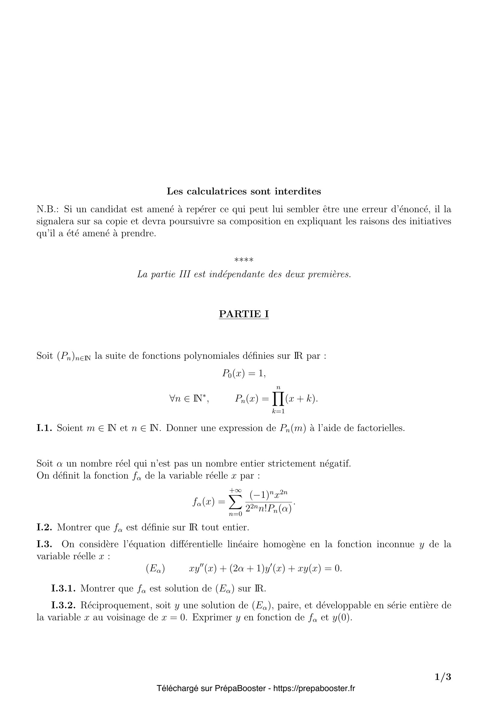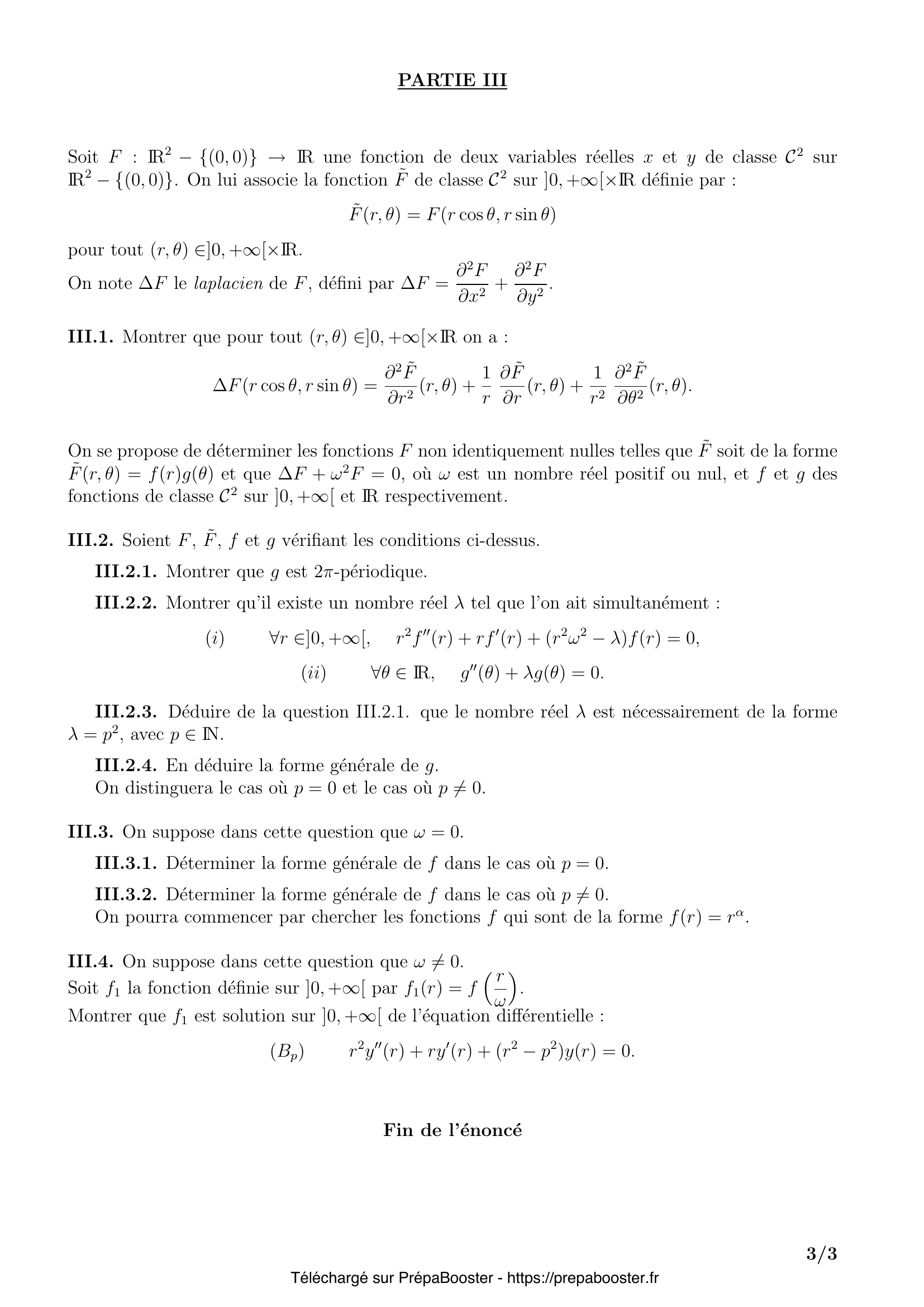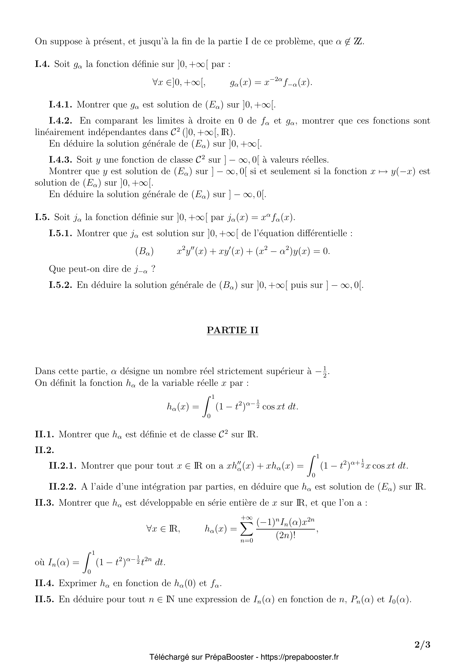 1. I.1. Soient $m \in \mathbb{N}$ et $n \in \mathbb{N}$. Donner une expression de $P_n(m)$ à l’aide de factorielles. 2. I.2. Montrer que $f_\alpha$ est définie sur $\mathbb{R}$ tout entier. 3. I.3.1. Montrer que $f_\alpha$ est solution de $(E_\alpha)$ sur $\mathbb{R}$. 4. I.3.2. Réciproquement, soit $y$ une solution de $(E_\alpha)$, paire, et développable en série entière de la variable $x$ au voisinage de $x=0$. Exprimer $y$ en fonction de $f_\alpha$ et $y(0)$. 5. I.4.1. Montrer que $g_\alpha$ est solution de $(E_\alpha)$ sur $]0, +\infty[$.} 6. I.4.2. En comparant les limites à droite en $0$ de $f_\alpha$ et $g_\alpha$, montrer que ces fonctions sont linéairement indépendantes dans $\mathcal{C}^2(]0, +\infty[,\mathbb{R})$.\\ En déduire la solution générale de $(E_\alpha)$ sur $]0, +\infty[$. 7. I.4.3. Soit $y$ une fonction de classe $\mathcal{C}^2$ sur $]-\infty, 0[$ à valeurs réelles.\\ Montrer que $y$ est solution de $(E_\alpha)$ sur $]-\infty, 0[$ si et seulement si la fonction $x\mapsto y(-x)$ est solution de $(E_\alpha)$ sur $]0, +\infty[$.\\ En déduire la solution générale de $(E_\alpha)$ sur $]-\infty, 0[$. 8. I.5.1. Montrer que $j_\alpha$ est solution sur $]0, +\infty[$ de l’équation différentielle :\\ $(B_\alpha)\quad x^2y”(x) + x y'(x) + (x^2 – \alpha^2) y(x) = 0$.\\ Que peut-on dire de $j_{-\alpha}$ ? 9. I.5.2. En déduire la solution générale de $(B_\alpha)$ sur $]0, +\infty[$ puis sur $]-\infty, 0[$. 10. II.1. Montrer que $h_\alpha$ est définie et de classe $\mathcal{C}^2$ sur $\mathbb{R}$.} 11. II.2.1. Montrer que pour tout $x \in \mathbb{R}$ on a\\ $x h_\alpha”(x) + x h_\alpha(x) = \int_0^1 (1 – t^2)^{\alpha + \frac{1}{2}} x \cos x t \, dt$. 12. II.2.2. À l’aide d’une intégration par parties, en déduire que $h_\alpha$ est solution de $(E_\alpha)$ sur $\mathbb{R}$. 13. II.3. Montrer que $h_\alpha$ est développable en série entière de $x$ sur $\mathbb{R}$, et que l’on a :\\ $\forall x \in \mathbb{R}, \; h_\alpha(x) = \sum_{n = 0}^{+\infty} \frac{(-1)^n I_n(\alpha)x^{2n}}{(2n)!}$,\\ où $I_n(\alpha) = \int_0^1 (1-t^2)^{\alpha-\frac{1}{2}} t^{2n} dt$. 14. II.4. Exprimer $h_\alpha$ en fonction de $h_\alpha(0)$ et $f_\alpha$. 15. II.5. En déduire pour tout $n \in \mathbb{N}$ une expression de $I_n(\alpha)$ en fonction de $n$, $P_n(\alpha)$ et $I_0(\alpha)$.} 16. III.1. Montrer que pour tout $(r, \theta) \in ]0, +\infty[ \times \mathbb{R}$ on a :\\ $\Delta F(r\cos\theta, r\sin\theta) = \frac{\partial^2 \widetilde{F}}{\partial r^2}(r, \theta) + \frac{1}{r} \frac{\partial \widetilde{F}}{\partial r}(r,\theta) + \frac{1}{r^2} \frac{\partial^2 \widetilde{F}}{\partial \theta^2}(r,\theta)$. 17. III.2.1. Montrer que $g$ est $2\pi$-périodique. 18. III.2.2. Montrer qu’il existe un nombre réel $\lambda$ tel que l’on ait simultanément :\\ (i) $\forall r \in ]0, +\infty[, \; r^2 f”(r) + r f'(r) + (r^2 \omega^2 – \lambda) f(r) = 0$,\\ (ii) $\forall \theta \in \mathbb{R}, \; g”(\theta) + \lambda g(\theta) = 0$. 19. III.2.3. Déduire de la question III.2.1. que le nombre réel $\lambda$ est nécessairement de la forme $\lambda = p^2$, avec $p \in \mathbb{N}$. 20. III.2.4. En déduire la forme générale de $g$.\\ On distinguera le cas où $p = 0$ et le cas où $p \neq 0$.} 21. III.3.1. Déterminer la forme générale de $f$ dans le cas où $p = 0$ (on suppose dans cette question que $\omega = 0$). 22. III.3.2. Déterminer la forme générale de $f$ dans le cas où $p \neq 0$ (on suppose dans cette question que $\omega = 0$).\\ On pourra commencer par chercher les fonctions $f$ qui sont de la forme $f(r) = r^\alpha$. 23. III.4. On suppose dans cette question que $\omega \neq 0$.\\ Soit $f_1$ la fonction définie sur $]0, +\infty[$ par $f_1(r) = f \left( \frac{r}{\omega} \right )$.\\ Montrer que $f_1$ est solution sur $]0, +\infty[$ de l’équation différentielle\\ $(B_p)\quad r^2 y”(r) + r y'(r) + (r^2 – p^2)y(r) = 0$.}FAQ