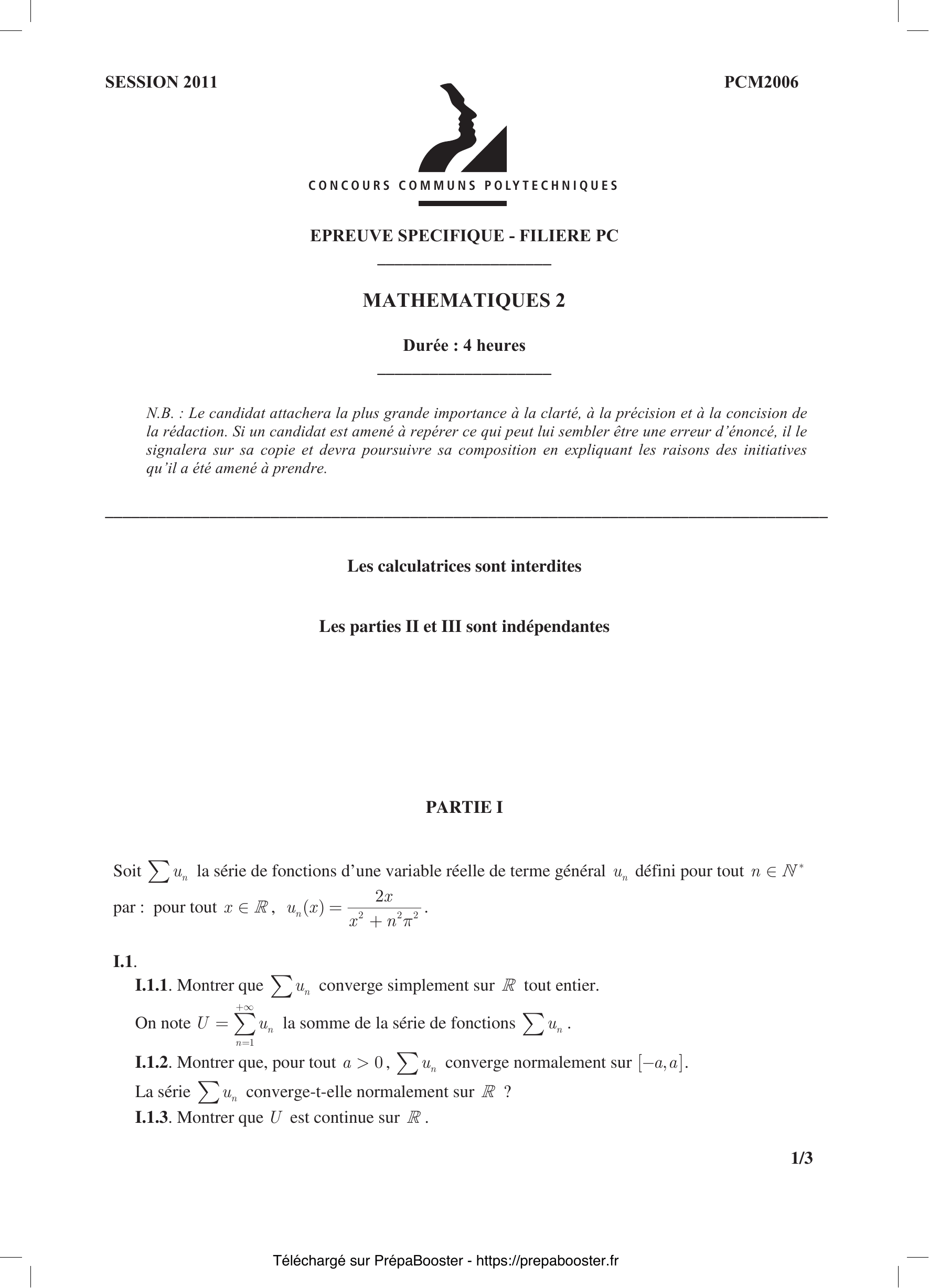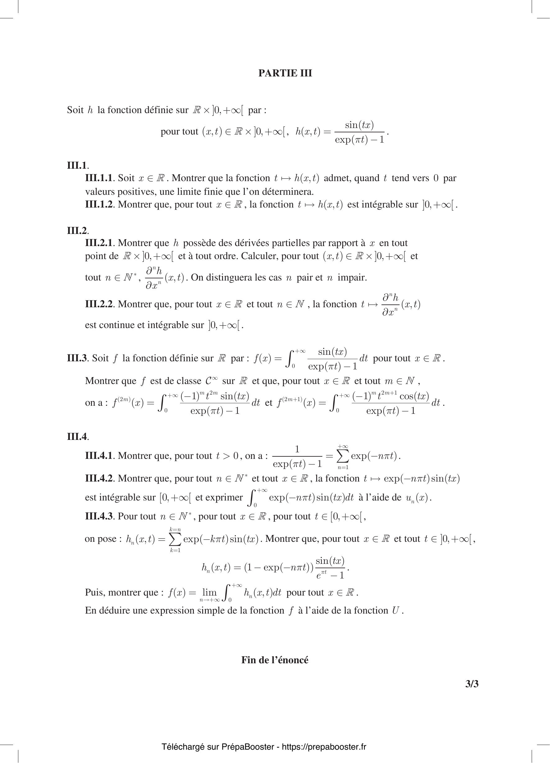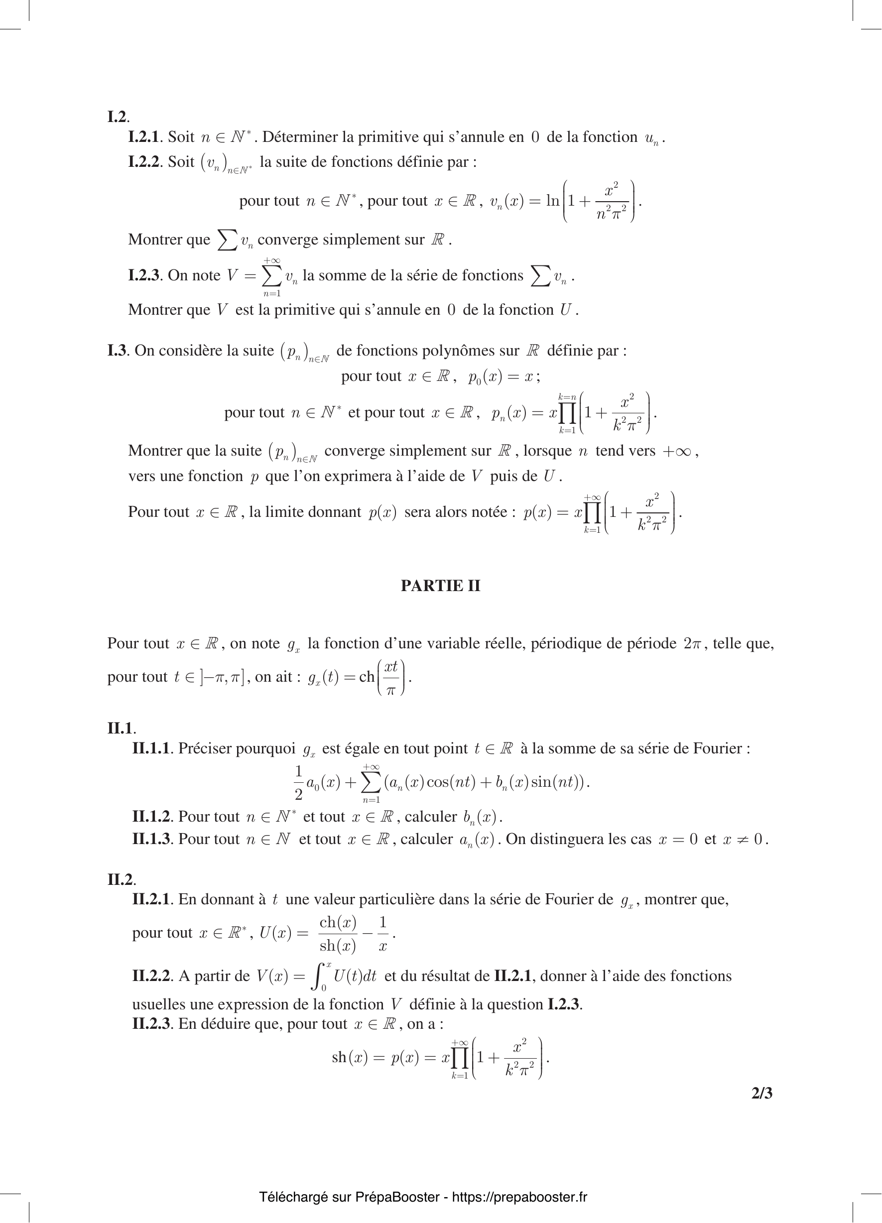 1. I.1.1. Montrer que $\sum u_n$ converge simplement sur $\mathbb{R}$ tout entier. 2. I.1.2. Montrer que, pour tout $a > 0$, $\sum u_n$ converge normalement sur $[-a,a]$.\\ La série $\sum u_n$ converge-t-elle normalement sur $\mathbb{R}$ ? 3. I.1.3. Montrer que $S$ est continue sur $\mathbb{R}$. 4. I.2.1. Soit $n \in \mathbb{N}$. Déterminer la primitive qui s’annule en $0$ de la fonction $u_n$. 5. I.2.2. Soit $(v_n)_{n \in \mathbb{N}}$ la suite de fonctions définie par~:\\ pour tout $n \in \mathbb{N}$, pour tout $x \in \mathbb{R}$, \\ \[ v_n(x) = \int_0^x u_n(t)\,dt. \] Montrer que $\sum v_n$ converge simplement sur $\mathbb{R}$.} 6. I.2.3. On note $V(x) = \sum_{n=0}^{+\infty} v_n(x)$ la somme de la série de fonctions $\sum v_n$.\\ Montrer que $V$ est la primitive qui s’annule en $0$ de la fonction $S$. 7. I.3. On considère la suite $(P_N)_{N \in \mathbb{N}}$ de fonctions polynômes sur $\mathbb{R}$ définie par~:\\ pour tout $x \in \mathbb{R}$, $P_0(x) = x$ ;\\ pour tout $N \geq 1$ et pour tout $x \in \mathbb{R}$,\\ \[ P_N(x) = x \prod_{k=1}^N \left(1 + \frac{x^2}{k^2 \pi^2}\right). \] Montrer que la suite $(P_N)_{N \in \mathbb{N}}$ converge simplement sur $\mathbb{R}$, lorsque $N$ tend vers $+\infty$, vers une fonction $P$ que l’on exprimera à l’aide de $V$ puis de $S$.\\ Pour tout $x \in \mathbb{R}$, la limite donnant $P(x)$ sera alors notée : \[ P(x) = \lim_{N \to +\infty} x \prod_{k=1}^N \left(1+\frac{x^2}{k^2\pi^2}\right). \] 8. II.1.1. Préciser pourquoi $f_x$ est égale en tout point $t \in \mathbb{R}$ à la somme de sa série de Fourier : \[ \frac{a_0(x)}{2} + \sum_{n=1}^{+\infty} \left( a_n(x) \cos nt + b_n(x) \sin nt \right). \] 9. II.1.2. Pour tout $n \geq 1$ et tout $x \in \mathbb{R}$, calculer $a_n(x)$. 10. II.1.3. Pour tout $n \in \mathbb{N}$ et tout $x \in \mathbb{R}$, calculer $b_n(x)$. On distinguera les cas $x = 0$ et $x \neq 0$.} 11. II.2.1. En donnant à $t$ une valeur particulière dans la série de Fourier de $f_x$, montrer que, pour tout $x \neq 0$, \[ S(x) = \frac{\sinh x}{x}. \] 12. II.2.2. À partir de \[ V(x) = \int_0^x S(t) \, dt \] et du résultat de II.2.1, donner à l’aide des fonctions usuelles une expression de la fonction $V$ définie à la question I.2.3. 13. II.2.3. En déduire que, pour tout $x \in \mathbb{R}$, on a : \[ x\,\frac{\sinh x}{x} = \lim_{N\to+\infty} x\prod_{k=1}^{N}\left(1+\frac{x^2}{k^2\pi^2}\right). \] 14. III.1.1. Soit $x \in \mathbb{R}$. Montrer que la fonction $y \mapsto F(x, y)$ admet, quand $y$ tend vers $0$ par valeurs positives, une limite finie que l’on déterminera. 15. III.1.2. Montrer que, pour tout $x \in \mathbb{R}$, la fonction $y \mapsto F(x, y)$ est intégrable sur $]0,+\infty[$.} 16. III.2.1. Montrer que $F$ possède des dérivées partielles par rapport à $x$ en tout point de $\mathbb{R} \times\ ]0,+\infty[$ et à tout ordre. Calculer, pour tout $(x, y) \in \mathbb{R} \times ]0,+\infty[$ et tout $n \geq 0$, $\frac{\partial^n F}{\partial x^n}(x, y)$. On distinguera les cas $n$ pair et $n$ impair. 17. III.2.2. Montrer que, pour tout $x \in \mathbb{R}$ et tout $n \in \mathbb{N}$, la fonction $y \mapsto \frac{\partial^n F}{\partial x^n}(x, y)$ est continue et intégrable sur $]0,+\infty[$. 18. III.3. Soit $\Phi$ la fonction définie sur $\mathbb{R}$ par : \[ \Phi(x) = \int_0^{+\infty} F(x, y)\,dy \] pour tout $x \in \mathbb{R}$. Montrer que $\Phi$ est de classe $C^\infty$ sur $\mathbb{R}$ et que, pour tout $x \in \mathbb{R}$ et tout $n \in \mathbb{N}$, \[ \Phi^{(n)}(x) = \int_0^{+\infty} \frac{\partial^n F}{\partial x^n}(x, y)\,dy \] et \[ \Phi^{(n+2)}(x) + \Phi(x) = – \int_0^{+\infty} y^2 \frac{\partial^n F}{\partial x^n}(x, y)\,dy. \] 19. III.4.1. Montrer que, pour tout $y > 0$, on a : \[ F(x, y) = \sum_{n=0}^{+\infty} [f_n(x) – e^{-ny}] – \frac{1}{y}. \] 20. III.4.2. Montrer que, pour tout $n \geq 0$ et tout $x \in \mathbb{R}$, la fonction $y \mapsto (f_n(x) – e^{-ny} – \frac{1}{y})$ est intégrable sur $[0,+\infty[$, et exprimer \[ \int_0^{+\infty} (f_n(x) – e^{-ny} – \frac{1}{y})\,dy \] à l’aide de $a_n(x)$.} 21. III.4.3. Pour tout $n \geq 0$, pour tout $x \in \mathbb{R}$, pour tout $y \in [0, +\infty[$, on pose : \[ S(x, y) = \sum_{k=1}^{n} F(x, ky), \] Montrer que, pour tout $x \in \mathbb{R}$ et tout $y \in ]0, +\infty[$, \[ F(x, y) = F(x, y) – y\sum_{k=1}^{n} e^{-k\pi y} + G(y), \] Puis, montrer que : \[ \lim_{y \rightarrow +\infty} \int_0^{+\infty} F(x, y)\,dy = \Phi(x) \] pour tout $x \in \mathbb{R}$.\\ En déduire une expression simple de la fonction $\Phi$ à l’aide de la fonction $S$.}FAQ