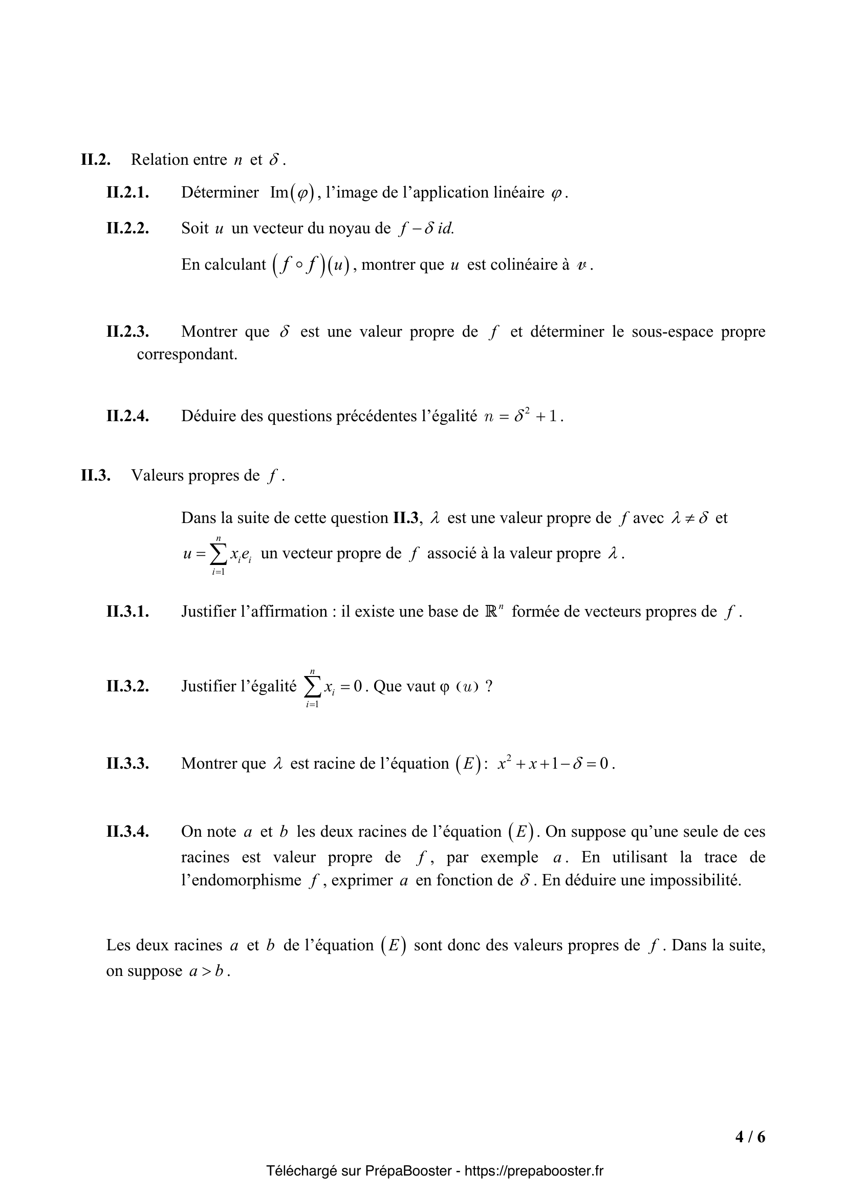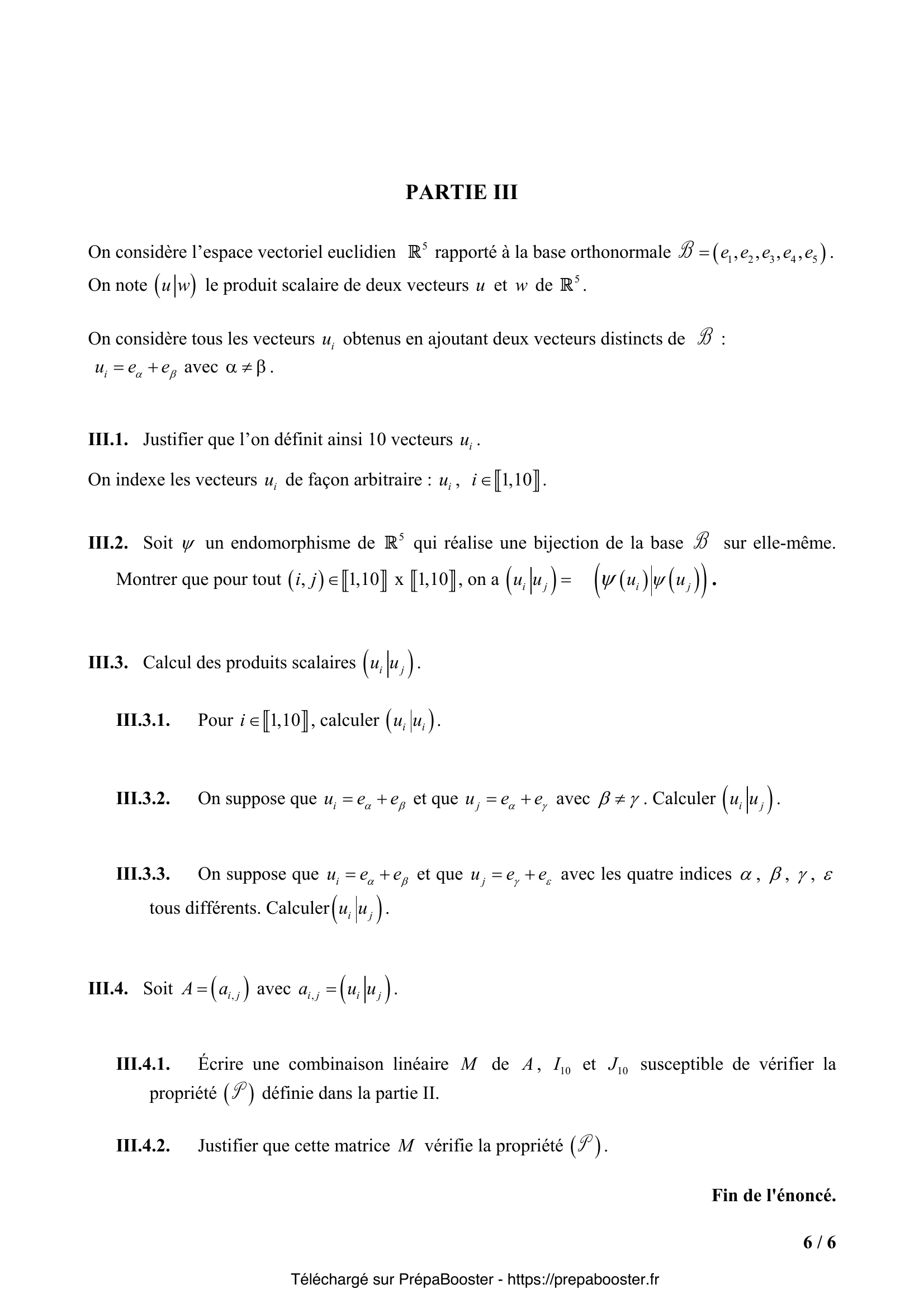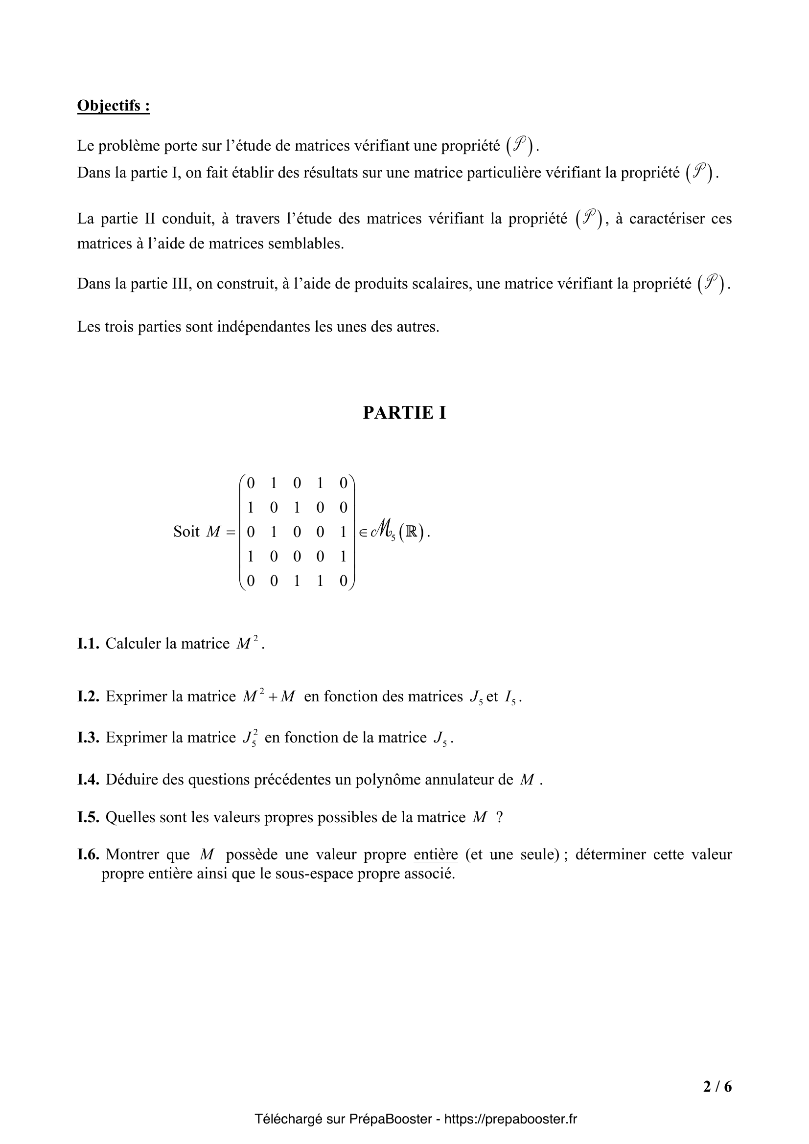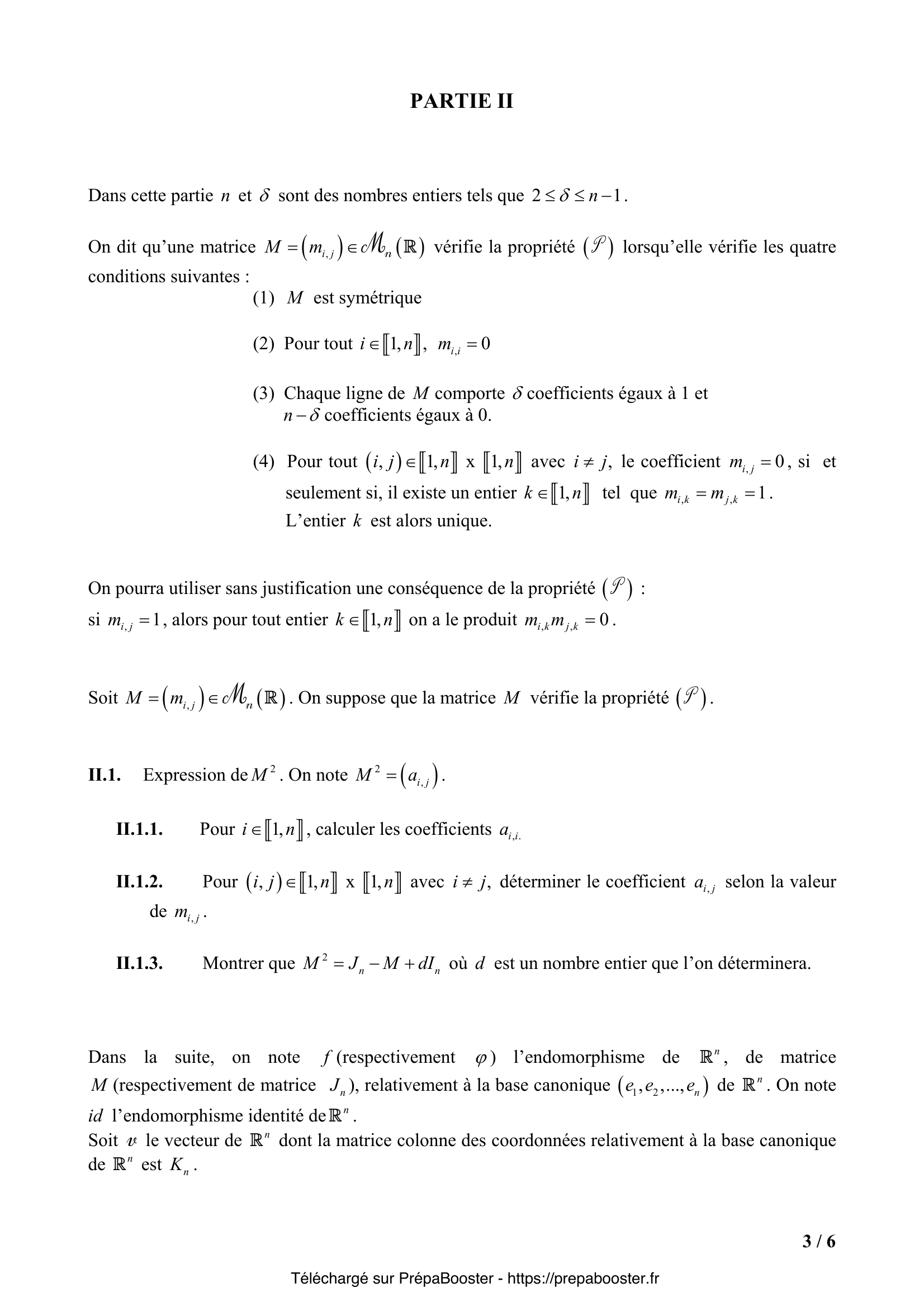 1. I.1. Calculer la matrice $M^2$. 2. I.2. Exprimer la matrice $M^2 + M$ en fonction des matrices $J_5$ et $I_5$. 3. I.3. Exprimer la matrice $J_5^2$ en fonction de la matrice $J_5$. 4. I.4. Déduire des questions précédentes un polynôme annulateur de $M$. 5. I.5. Quelles sont les valeurs propres possibles de la matrice $M$ ?} 6. I.6. Montrer que $M$ possède une valeur propre entière (et une seule) ; déterminer cette valeur propre entière ainsi que le sous-espace propre associé. 7. II.1.1. Pour $i \in \llbracket 1, n \rrbracket$, calculer les coefficients $a_{i,i}$. 8. II.1.2. Pour $(i,j)\in \llbracket 1,n \rrbracket^2$ avec $i\neq j$, déterminer le coefficient $a_{i,j}$ selon la valeur de $m_{i,j}$. 9. II.1.3. Montrer que $M^2 = nJ_n – dI_n + M$ où $d$ est un nombre entier que l’on déterminera. 10. II.2.1. Déterminer $\operatorname{Im}(\varphi)$, l’image de l’application linéaire $\varphi$.} 11. II.2.2. Soit $u$ un vecteur du noyau de $f – \delta\,\mathrm{id}$. En calculant $f(f(u))$, montrer que $u$ est colinéaire à $v$. 12. II.2.3. Montrer que $\delta$ est une valeur propre de $f$ et déterminer le sous-espace propre correspondant. 13. II.2.4. Déduire des questions précédentes l’égalité $\delta^2 = n+1$. 14. II.3.1. Justifier l’affirmation : il existe une base de $\mathbb{R}^n$ formée de vecteurs propres de $f$. 15. II.3.2. Justifier l’égalité $\sum_{i=1}^n x_i = 0$. Que vaut $\varphi(u)$ ?} 16. II.3.3. Montrer que $\lambda$ est racine de l’équation $(E): x^2 + \delta x -1 = 0$. 17. II.3.4. On note $a$ et $b$ les deux racines de l’équation (E). On suppose qu’une seule de ces racines est valeur propre de $f$, par exemple $a$. En utilisant la trace de l’endomorphisme $f$, exprimer $a$ en fonction de $\delta$. En déduire une impossibilité. 18. II.4.1. Exprimer $(a-b)^2$ en fonction de $\delta$. 19. II.4.2. Exprimer le produit matriciel $\begin{pmatrix} r \\ s \end{pmatrix} = \begin{pmatrix} 1 & 1 \\ a & b \end{pmatrix}^{-1} \begin{pmatrix} 1 \\ \delta \end{pmatrix}$ en fonction de $\delta$. 20. II.4.3. En déduire $(r s)(a-b)$ en fonction de $\delta$.} 21. II.4.4. Pour quelle valeur de $\delta$ a-t-on $r=s$ ? Que valent alors $r$ et $s$ ? 22. II.5.1. Montrer que $r=s$. En déduire $\delta$ et $n$. 23. II.5.2. Déterminer $a$ et $b$ et donner une matrice diagonale semblable à $M$. 24. II.6.1. On écrit $a-b = \frac{m}{q}$ avec $m$ et $q$ dans $\mathbb{N}^*$. Montrer que tout nombre premier qui divise $q$ divise $m$. En déduire que $a-b \in \mathbb{N}$. 25. II.6.2. Montrer que $a-b$ est un entier impair supérieur ou égal à 3. En notant $a-b=2p+1$ avec $p\in\mathbb{N}^*$, exprimer $\delta$ en fonction de $p$. En déduire $a$ et $b$ en fonction de $p$.} 26. II.6.3. On note $c= a-b$. Montrer que $c$ divise $(c^2+3c-5)$. En déduire que $c\in\{3,5,15\}$. 27. II.6.4. Pour les différentes valeurs de $c$, donner le tableau des valeurs de $a, b, r, s, \delta, n$. 28. III.1. Justifier que l’on définit ainsi 10 vecteurs $u_i$. 29. III.2. Soit $\psi$ un endomorphisme de $\mathbb{R}^5$ qui réalise une bijection de la base $B$ sur elle-même. Montrer que pour tout $(i,j) \in \llbracket 1,10\rrbracket^2$, on a $(u_i|u_j) = (\psi(u_i)|\psi(u_j))$. 30. III.3.1. Pour $i \in \llbracket 1,10\rrbracket$, calculer $(u_i|u_i)$.} 31. III.3.2. On suppose que $u_i = e_\alpha + e_\beta$ et que $u_j = e_\alpha + e_\gamma$ avec $\beta \neq \gamma$. Calculer $(u_i|u_j)$. 32. III.3.3. On suppose que $u_i = e_\alpha + e_\beta$ et que $u_j = e_\gamma + e_\epsilon$ avec les quatre indices $\alpha, \beta, \gamma, \epsilon$ tous différents. Calculer $(u_i|u_j)$. 33. III.4.1. Écrire une combinaison linéaire $M$ de $A$, $I_{10}$ et $J_{10}$ susceptible de vérifier la propriété $(P)$ définie dans la partie II. 34. III.4.2. Justifier que cette matrice $M$ vérifie la propriété $(P)$.}FAQ
