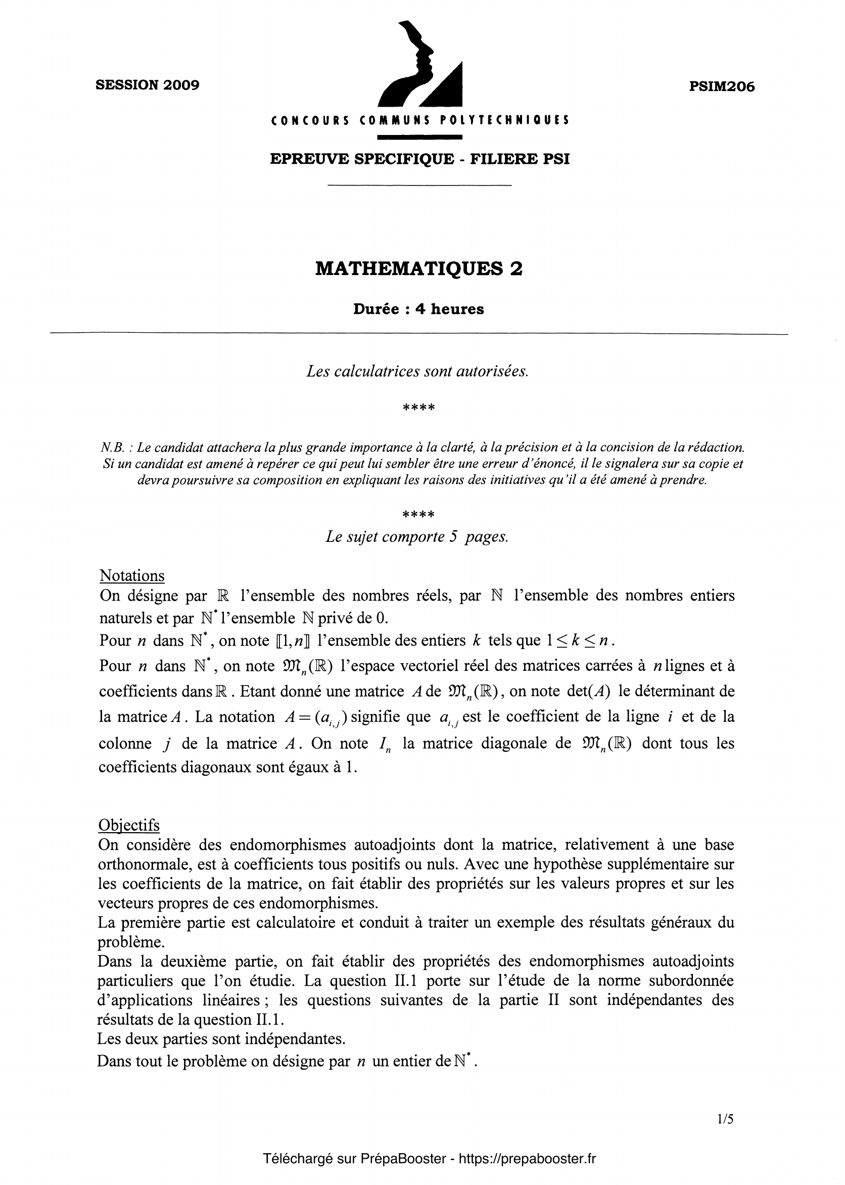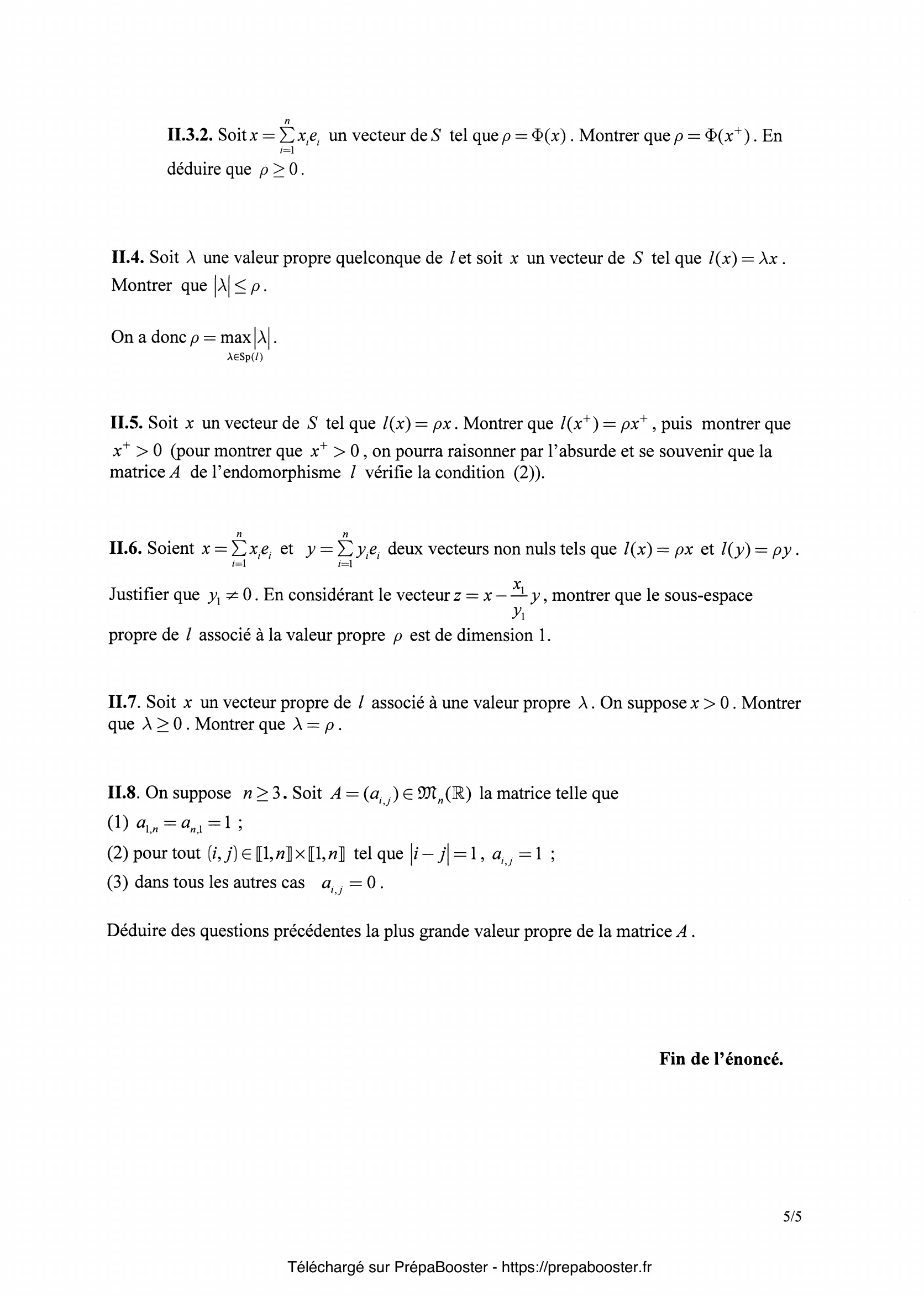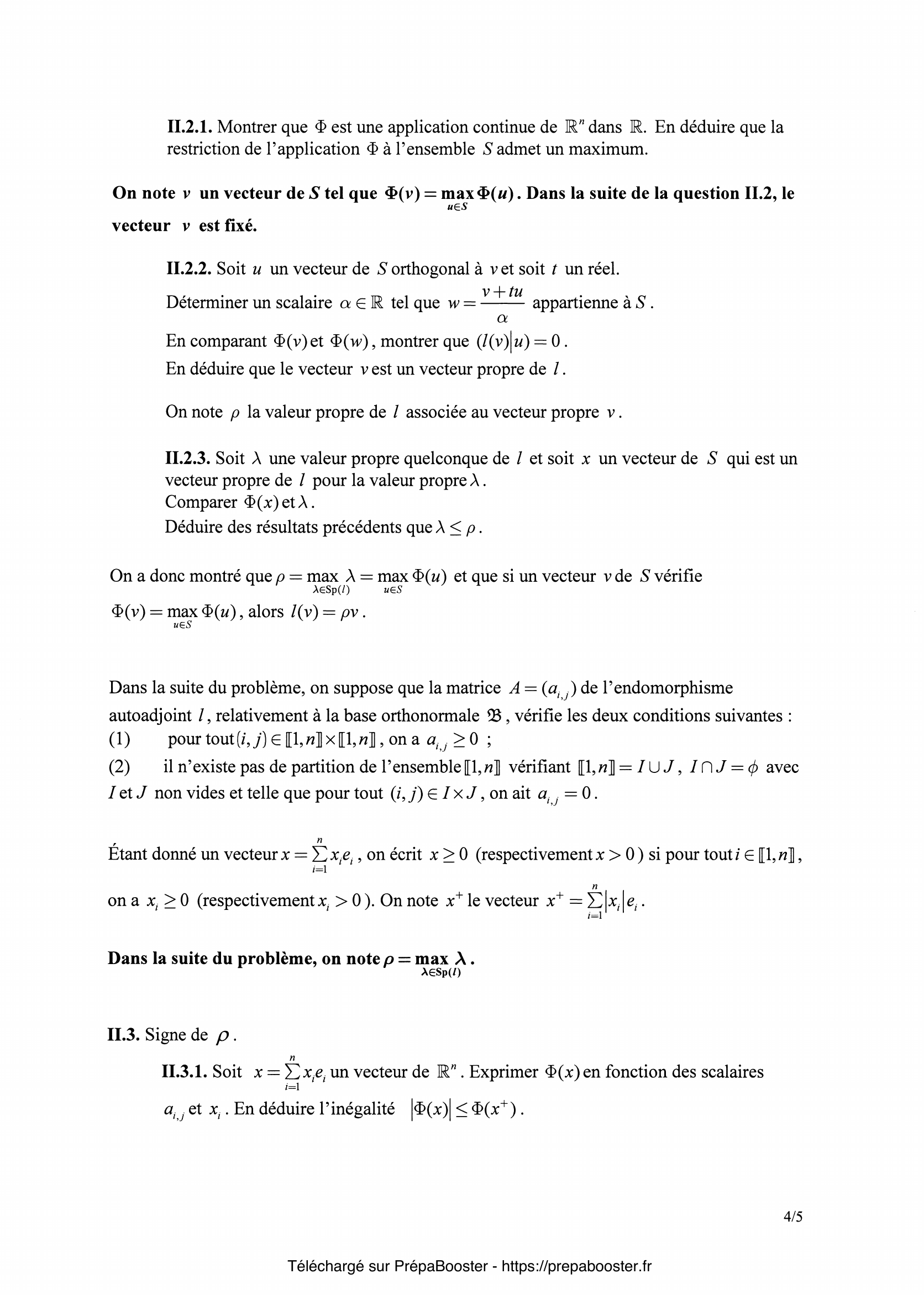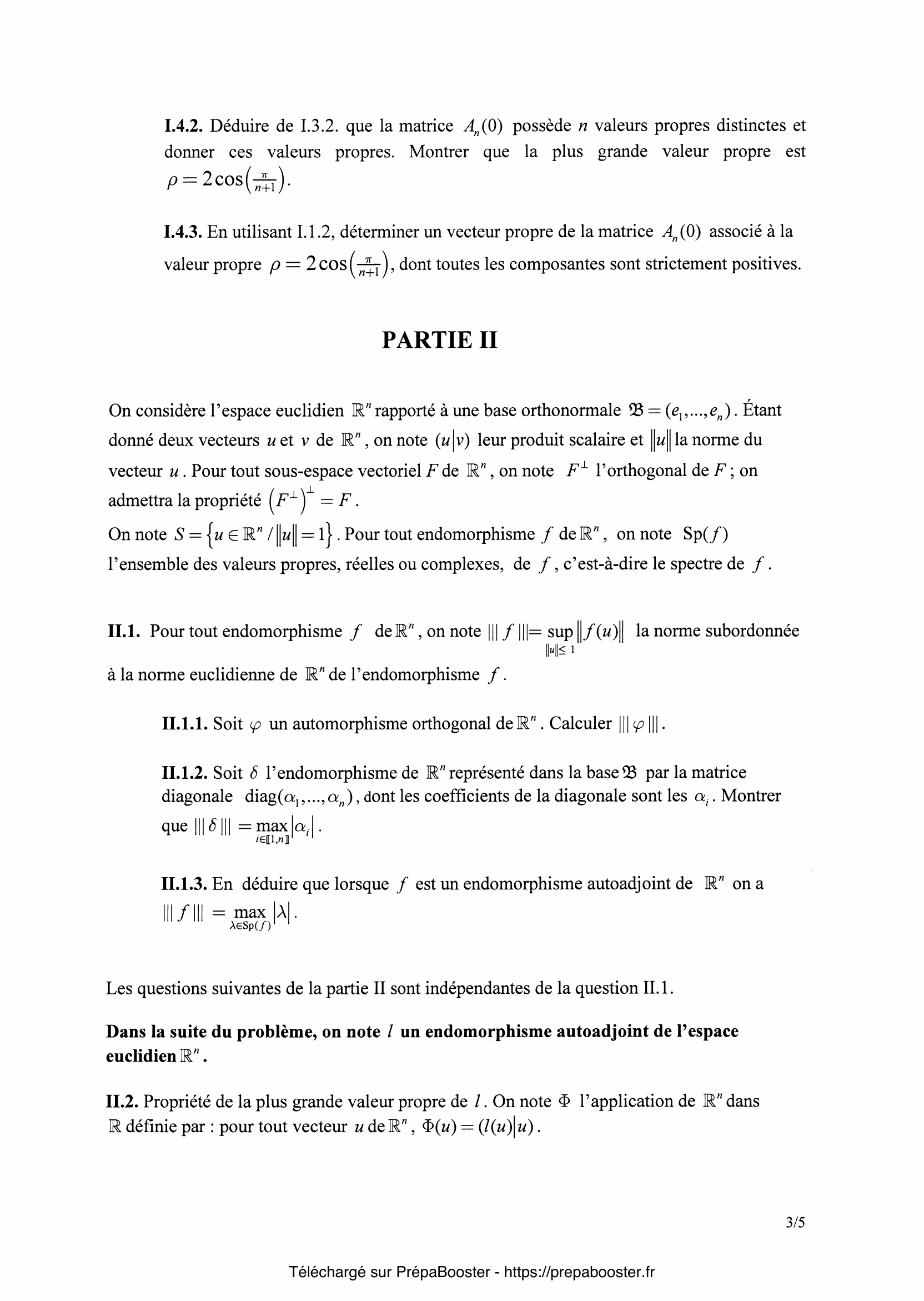 1. I.1.1. Déterminer $x_2$. Pour tout $p$ dans $\mathbb{N}^\ast$ expliciter $x_p$ en fonction de $p$ et de $\theta$. 2. I.1.2. Soit $n$ dans $\mathbb{N}^\ast$, à quelle condition sur $\theta$ a-t-on $x_{n+1} = 0$ ? 3. I.2.1. Calculer $d_1(t)$, $d_2(t)$, $d_3(t)$, $d_4(t)$. 4. I.2.2. Pour $n \geq 3$, établir une relation entre $d_n(t)$, $d_{n-1}(t)$ et $d_{n-2}(t)$. En déduire que $d_n$ est un polynôme en $t$, déterminer son degré ainsi que le coefficient du terme de plus haut degré. 5. I.3.1. Montrer que $d_n(\cos(\theta)) = \dfrac{\sin((n+1)\theta)}{\sin(\theta)}$.} 6. I.3.2. Déterminer les valeurs de $\theta$ pour lesquelles $d_n(\cos(\theta)) = 0$. 7. I.4.1. Exprimer $\chi_n(\lambda)$ en fonction de $d_n$ et de $\lambda$. 8. I.4.2. Déduire de I.3.2. que la matrice $A_n(0)$ possède $n$ valeurs propres distinctes et donner ces valeurs propres. Montrer que la plus grande valeur propre est $\rho = 2\cos \left(\frac{\pi}{n+1}\right)$. 9. I.4.3. En utilisant I.1.2, déterminer un vecteur propre de la matrice $A_n(0)$ associé à la valeur propre $\rho = 2\cos\left(\frac{\pi}{n+1}\right)$, dont toutes les composantes sont strictement positives. 10. II.1.1. Soit $\varphi$ un automorphisme orthogonal de $\mathbb{R}^n$. Calculer $\|\!\|\!\|\varphi\|\!\|\!\|$.} 11. II.1.2. Soit $\delta$ l’endomorphisme de $\mathbb{R}^n$ représenté dans la base $\mathcal{B}$ par la matrice diagonale $\operatorname{diag}(\alpha_1, …, \alpha_n)$, dont les coefficients de la diagonale sont les $\alpha_i$. Montrer que $\|\!\|\!\|\delta\|\!\|\!\| = \max_{i\in\{1,…,n\}} |\alpha_i|$. 12. II.1.3. En déduire que lorsque $f$ est un endomorphisme autoadjoint de $\mathbb{R}^n$ on a $\|\!\|\!\| f \|\!\|\!\| = \max_{\lambda\in\operatorname{Sp}(f)} |\lambda|$. 13. II.2.1. Montrer que $\Phi$ est une application continue de $\mathbb{R}^n$ dans $\mathbb{R}$. En déduire que la restriction de l’application $\Phi$ à l’ensemble $S$ admet un maximum. 14. II.2.2. Soit $u$ un vecteur de $S$ orthogonal à $v$ et soit $t$ un réel. Déterminer un scalaire $\alpha \in \mathbb{R}$ tel que $w = \frac{v + tu}{\alpha}$ appartienne à $S$. \newline En comparant $\Phi(v)$ et $\Phi(w)$, montrer que $(l(v)|u) = 0$.\newline En déduire que le vecteur $v$ est un vecteur propre de $l$. 15. II.2.3. Soit $\lambda$ une valeur propre quelconque de $l$ et soit $x$ un vecteur de $S$ qui est un vecteur propre de $l$ pour la valeur propre $\lambda$.\newline Comparer $\Phi(x)$ et $\lambda$.\newline Déduire des résultats précédents que $\lambda\leq\rho$.} 16. II.3.1. Soit $x = \sum\limits_{i=1}^n x_i e_i$ un vecteur de $\mathbb{R}^n$. Exprimer $\Phi(x)$ en fonction des scalaires $a_{i,j}$ et $x_i$. En déduire l’inégalité $|\Phi(x)|\leq \Phi(x^+)$. 17. II.3.2. Soit $x = \sum\limits_{i=1}^n x_i e_i$ un vecteur de $S$ tel que $\rho = \Phi(x)$. Montrer que $\rho = \Phi(x^+)$. En déduire que $\rho\geq 0$. 18. II.4. Soit $\lambda$ une valeur propre quelconque de $l$ et soit $x$ un vecteur de $S$ tel que $l(x) = \lambda x$. Montrer que $|\lambda|\leq\rho$. 19. II.5. Soit $x$ un vecteur de $S$ tel que $l(x) = \rho x$. Montrer que $l(x^+) = \rho x^+$, puis montrer que $x^+ > 0$ (pour montrer que $x^+ > 0$, on pourra raisonner par l’absurde et se souvenir que la matrice $A$ de l’endomorphisme $l$ vérifie la condition (2)). 20. II.6. Soient $x = \sum\limits_{i=1}^n x_i e_i$ et $y = \sum\limits_{i=1}^n y_i e_i$, deux vecteurs non nuls tels que $l(x) = \rho x$ et $l(y) = \rho y$. \newline Justifier que $y \neq 0$. En considérant le vecteur $z = x – \frac{x_1}{y_1} y$, montrer que le sous-espace $D$ est associé à la valeur propre $\rho$ et est de dimension $1$.} 21. II.7. Soit $x$ un vecteur propre de $l$ associé à une valeur propre $\lambda$. On suppose $x > 0$. Montrer que $\lambda \geq 0$. Montrer que $\lambda = \rho$. 22. II.8. On suppose $n\geq 3$. Soit $A = (a_{i,j}) \in \mathcal{M}_n(\mathbb{R})$ la matrice telle que : \begin{itemize} \item[(1)] $a_{1,n} = a_{n,1} = 1$ ; \item[(2)] pour tout $(i,j)\in [\![1,n]\!] \times [\![1,n]\!]$ tel que $|i – j| = 1$ , $a_{i,j} = 1$ ; \item[(3)] dans tous les autres cas $a_{i,j} = 0$. \end{itemize} Déduire des questions précédentes la plus grande valeur propre de la matrice $A$.}FAQ