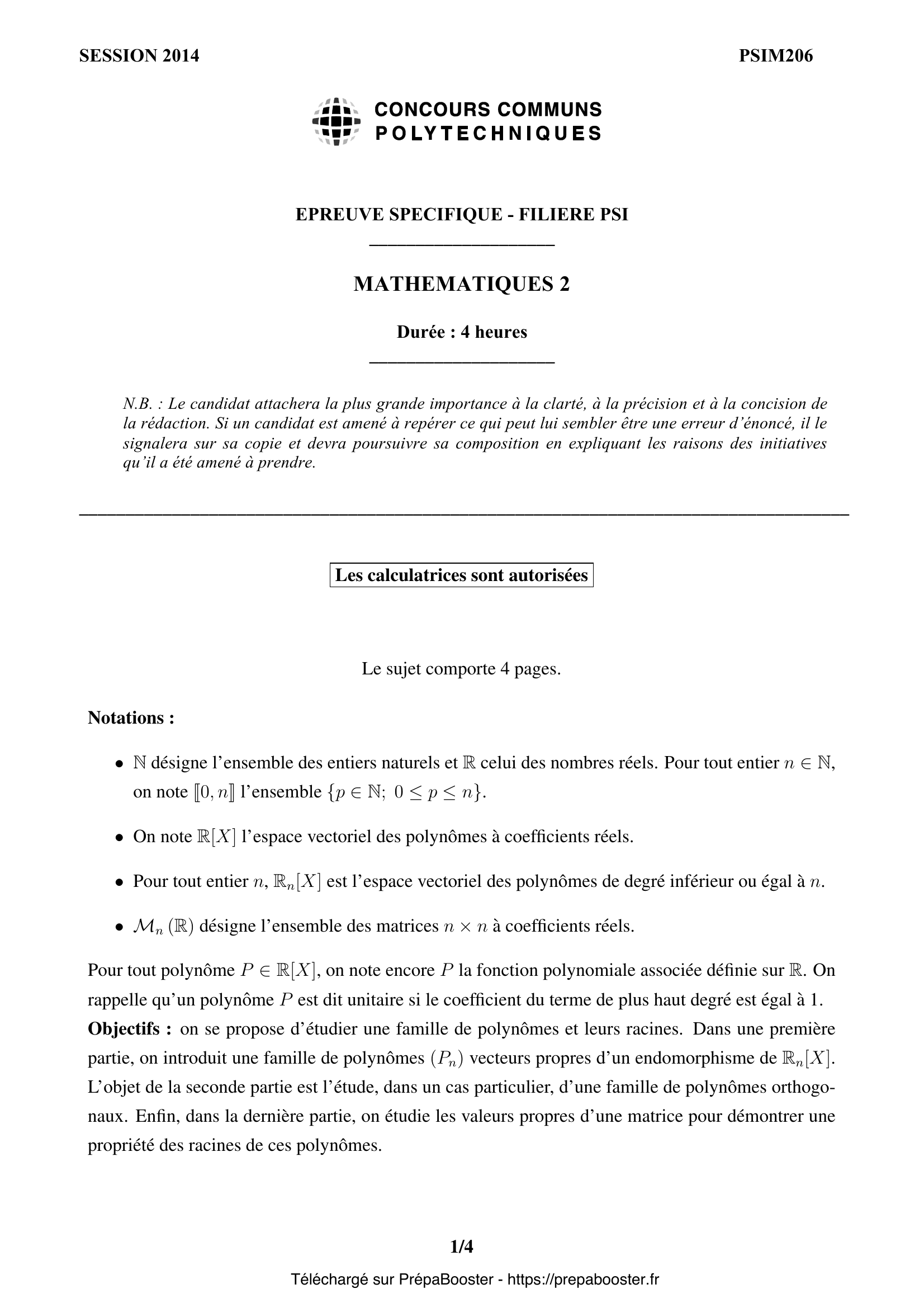 Le sujet de maths CCINP PSI 2014 tourne autour des notions d’algèbre linéaire (endomorphismes, auto-adjoint, matrices, valeurs propres), de polynômes orthogonaux, de produits scalaires définis sur des espaces de polynômes, d’études des racines, ainsi que de la théorie spectrale des matrices. Ce sont des sujets classiques et fondamentaux qui peuvent tomber à tout moment aux concours, donc bien les maîtriser, c’est vraiment maximiser tes chances de réussite.