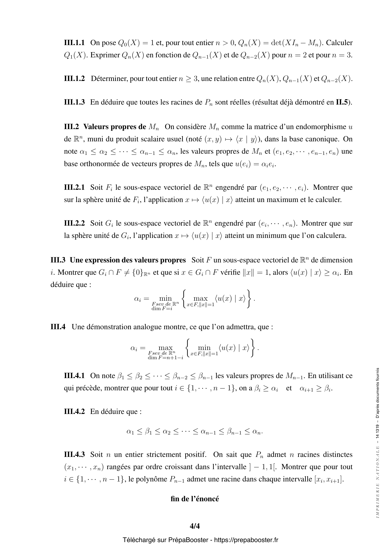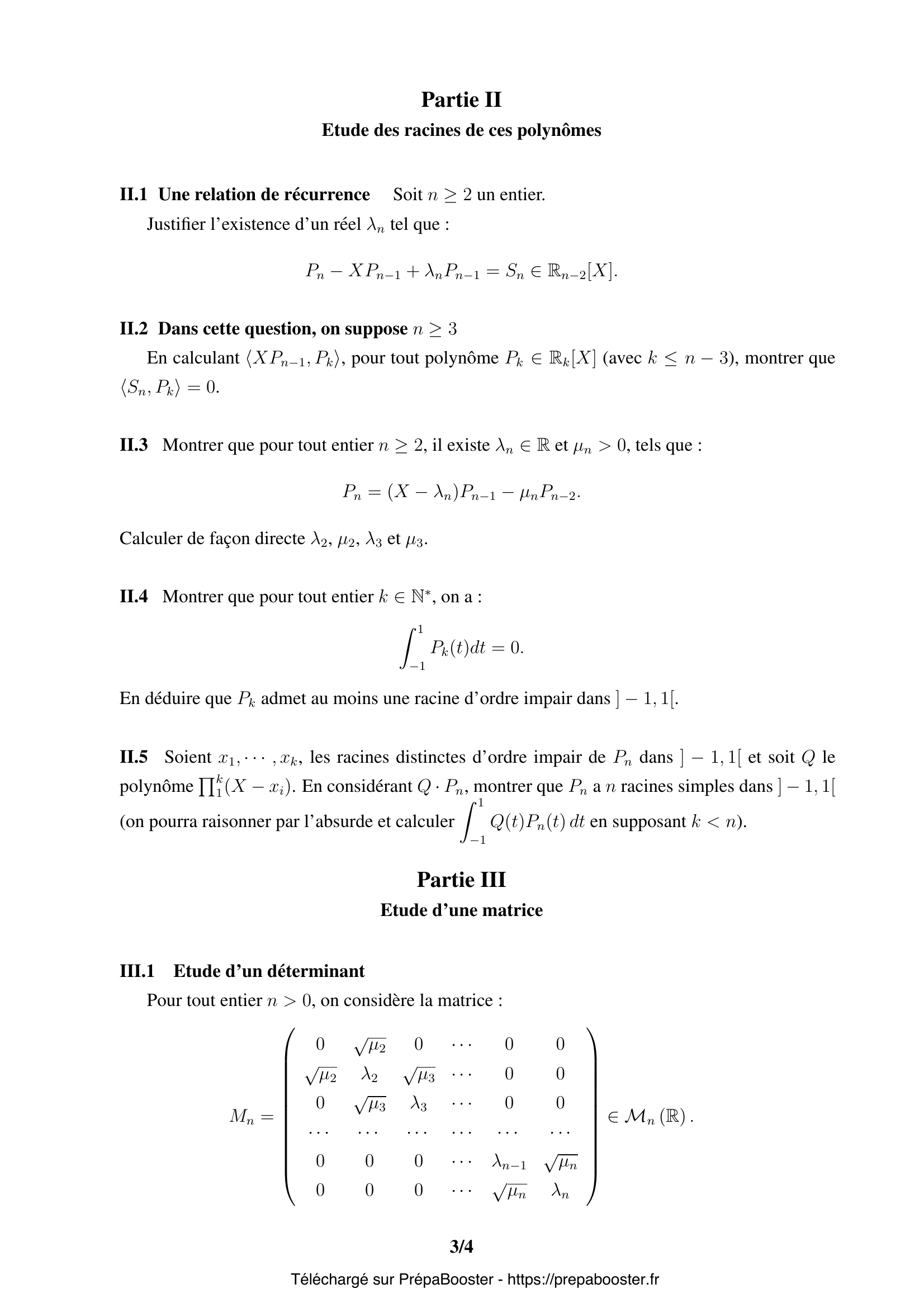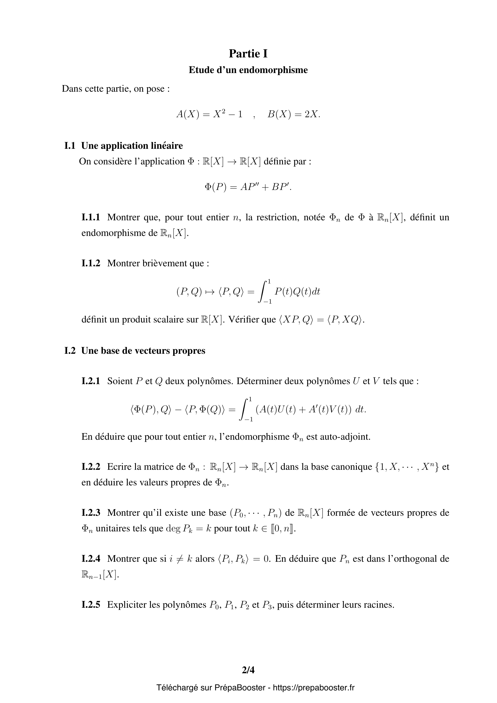 1. I.1.1 Montrer que, pour tout entier $n$, la restriction, notée $\Phi_n$ de $\Phi$ à $\mathbb{R}_n[X]$, définit un endomorphisme de $\mathbb{R}_n[X]$. 2. I.1.2 Montrer brièvement que : $(P, Q) \mapsto \langle P, Q\rangle = \int_{-1}^{1} P(t)Q(t)dt$ définit un produit scalaire sur $\mathbb{R}[X]$. Vérifier que $\langle XP, Q \rangle = \langle P, XQ\rangle$. 3. I.2.1 Soient $P$ et $Q$ deux polynômes. Déterminer deux polynômes $U$ et $V$ tels que : $$ \langle \Phi(P), Q\rangle – \langle P, \Phi(Q)\rangle = \int_{-1}^{1} (A(t)U(t) + A'(t)V(t)) dt. $$ En déduire que pour tout entier $n$, l’endomorphisme $\Phi_n$ est auto-adjoint. 4. I.2.2 Écrire la matrice de $\Phi_n : \mathbb{R}_n[X] \rightarrow \mathbb{R}_n[X]$ dans la base canonique $\{1, X, \cdots, X^n\}$ et en déduire les valeurs propres de $\Phi_n$. 5. I.2.3 Montrer qu’il existe une base $(P_0, \cdots, P_n)$ de $\mathbb{R}_n[X]$ formée de vecteurs propres de $\Phi_n$ unitaires tels que $\deg P_k = k$ pour tout $k \in \{0, n\}$.} 6. I.2.4 Montrer que si $i \ne k$ alors $\langle P_i, P_k\rangle = 0$. En déduire que $P_n$ est dans l’orthogonal de $\mathbb{R}_{n-1}[X]$. 7. I.2.5 Expliciter les polynômes $P_0, P_1, P_2$ et $P_3$, puis déterminer leurs racines. 8. II.1 Une relation de récurrence — Soit $n \geq 2$ un entier. Justifier l’existence d’un réel $\lambda_n$ tel que : $$ P_n – X P_{n-1} + \lambda_n P_{n-1} = S_n \in \mathbb{R}_{n-2}[X]. $$ 9. II.2 Dans cette question, on suppose $n \geq 3$.\\ En calculant $\langle X P_{n-1}, P_k\rangle$, pour tout polynôme $P_k \in \mathbb{R}_k[X]$ (avec $k \leq n-3$), montrer que $$ \langle S_n, P_k\rangle = 0. $$ 10. II.3 Montrer que pour tout entier $n \geq 2$, il existe $\lambda_n \in \mathbb{R}$ et $\mu_n > 0$, tels que : $$ P_n = (X – \lambda_n)P_{n-1} – \mu_n P_{n-2}. $$ Calculer de façon directe $\lambda_2, \mu_2, \lambda_3$ et $\mu_3$.} 11. II.4 Montrer que pour tout entier $k \in \mathbb{N}^*$, on a : $$ \int_{-1}^1 P_k(t)dt = 0. $$ En déduire que $P_k$ admet au moins une racine d’ordre impair dans $]-1, 1[$. 12. II.5 Soient $x_1, \cdots, x_k$, les racines distinctes d’ordre impair de $P_n$ dans $]-1, 1[$ et soit $Q$ le polynôme $\prod_1^k (X – x_i)$. En considérant $Q \cdot P_n$, montrer que $P_n$ a $n$ racines simples dans $]-1, 1[$ (on pourra raisonner par l’absurde et calculer $\int_{-1}^{1} Q(t)P_n(t)\,dt$ en supposant $kFAQ