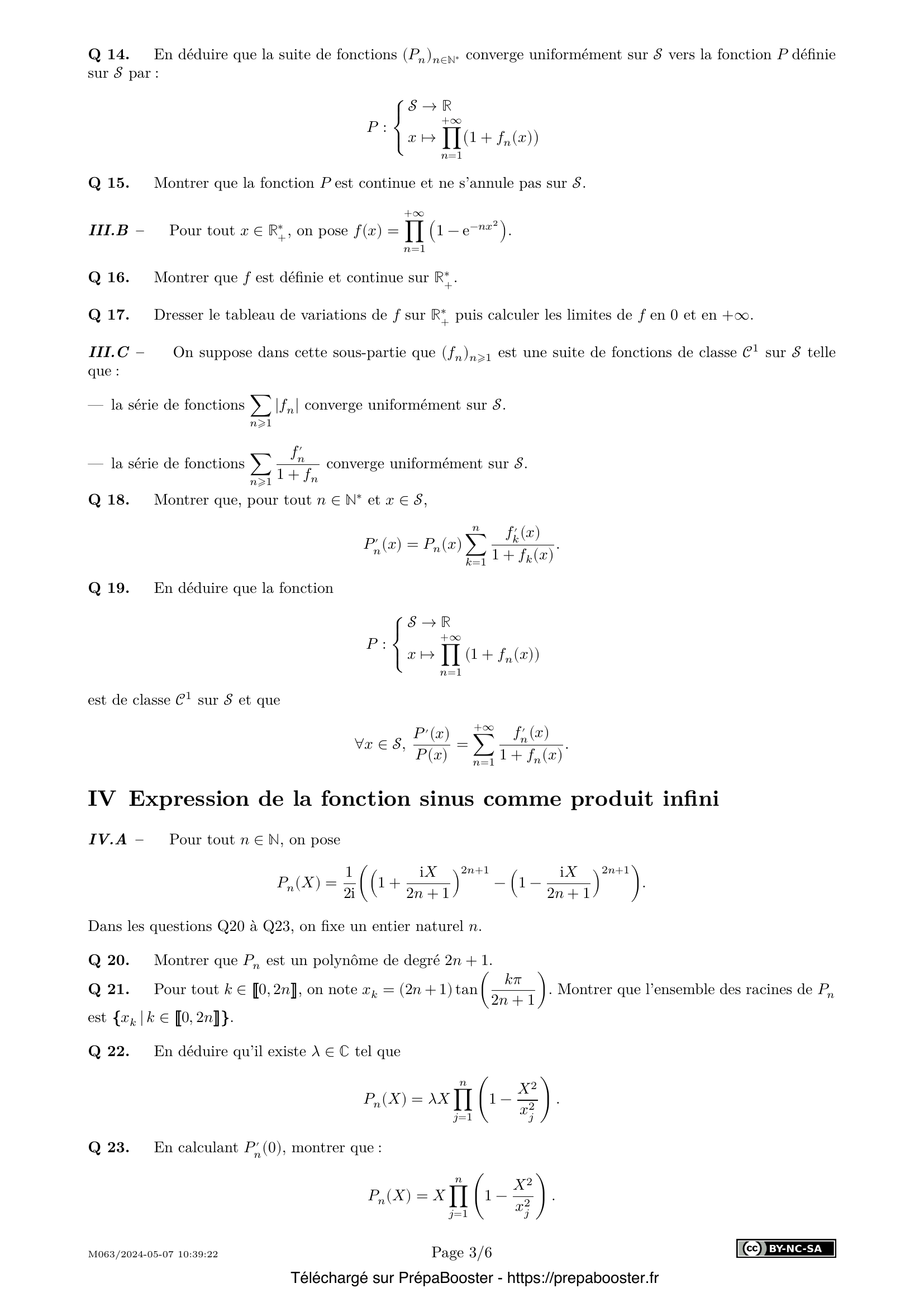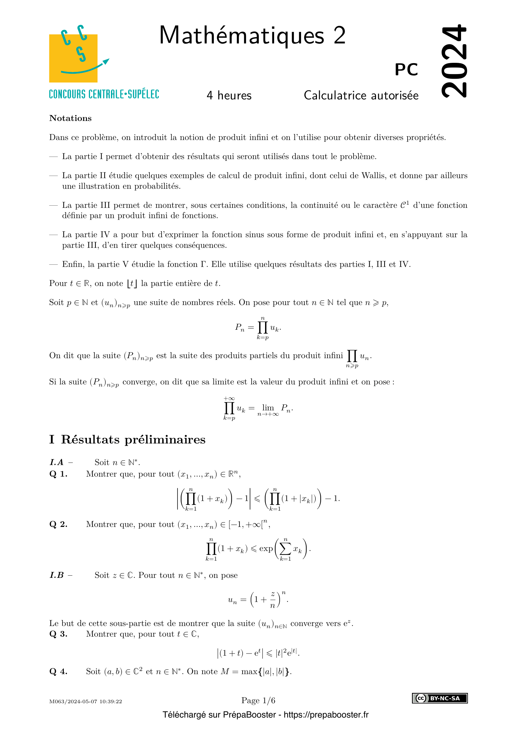 Ce sujet de Mathématiques du concours Centrale PC 2024 correspond aux épreuves disponibles sur le site officiel du concours Centrale. Retrouve sur Prépa Booster toutes les ressources nécessaires pour ta préparation, y compris les corrigés détaillés.