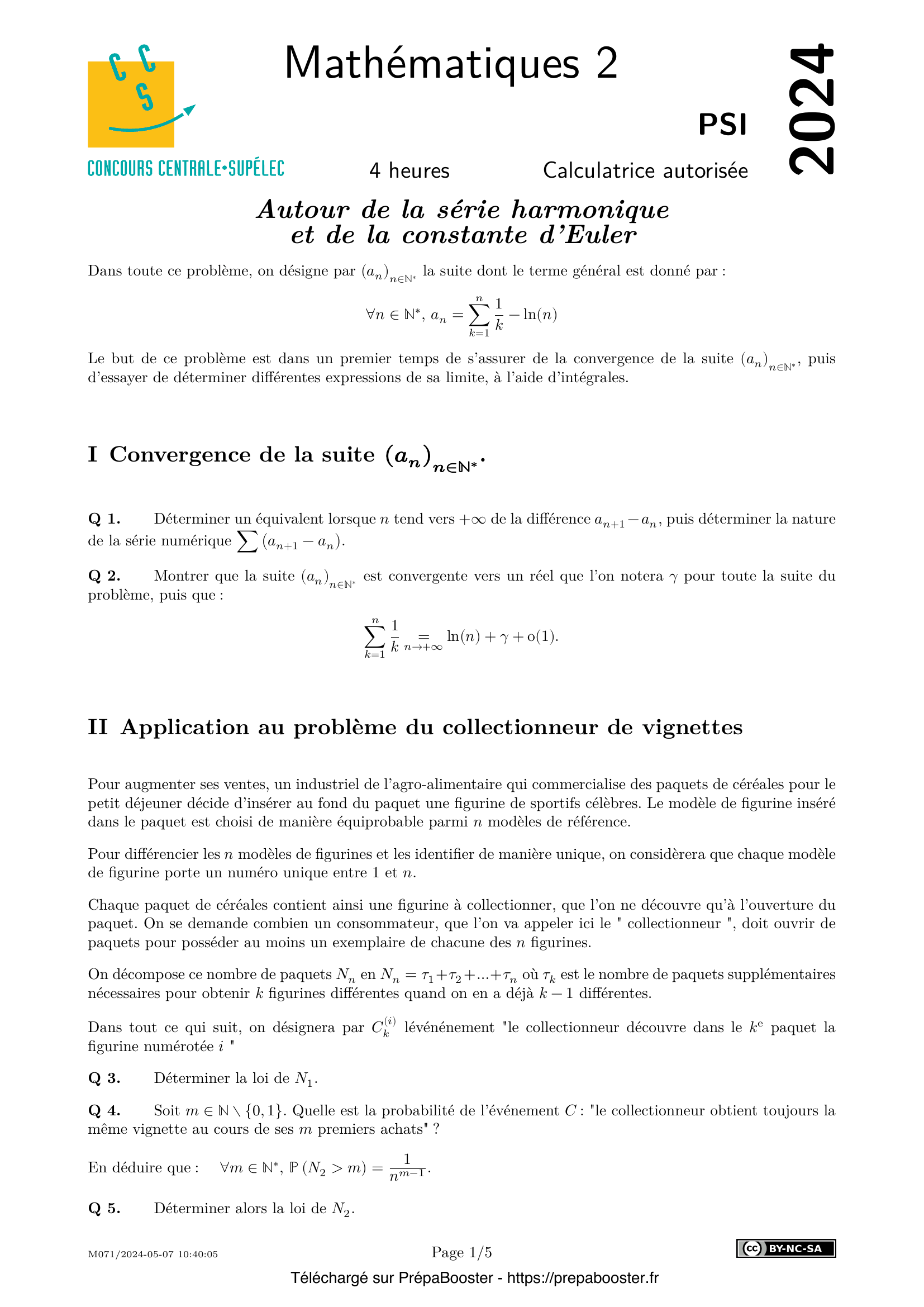 Ce sujet de Mathématiques du concours Centrale PSI 2024 correspond aux épreuves disponibles sur le site officiel du concours Centrale. Retrouve sur Prépa Booster toutes les ressources nécessaires pour ta préparation, y compris les corrigés détaillés.