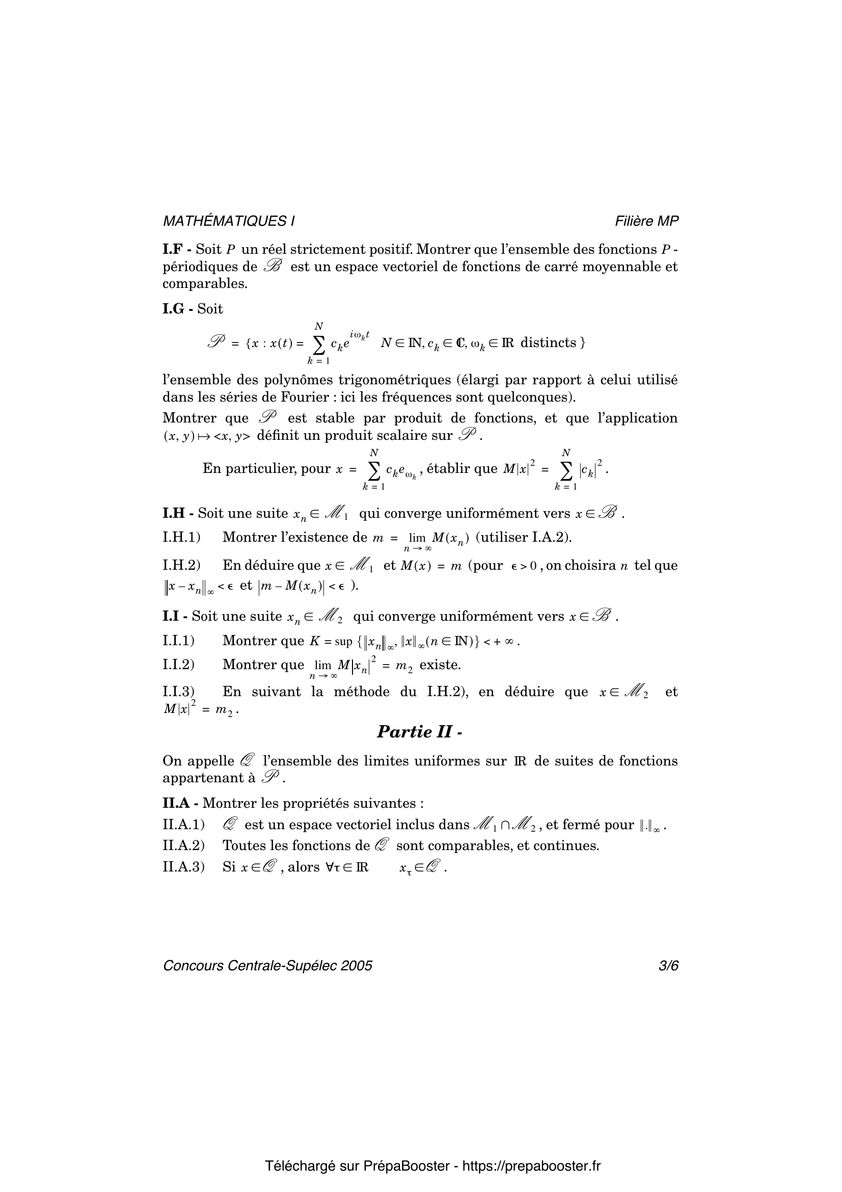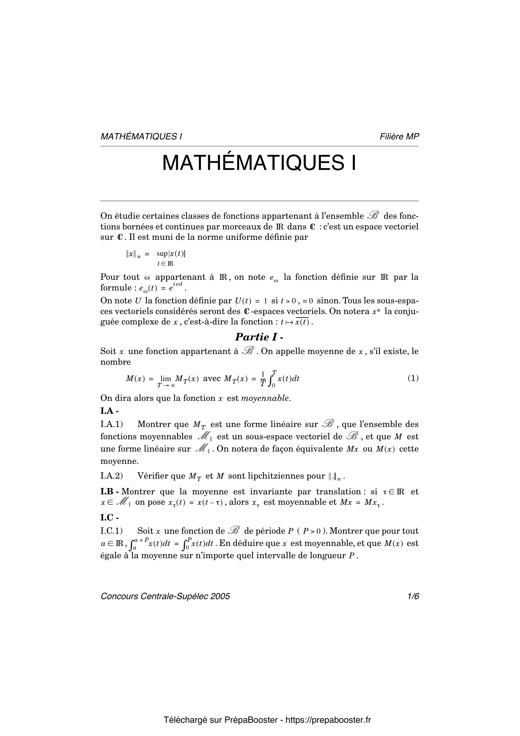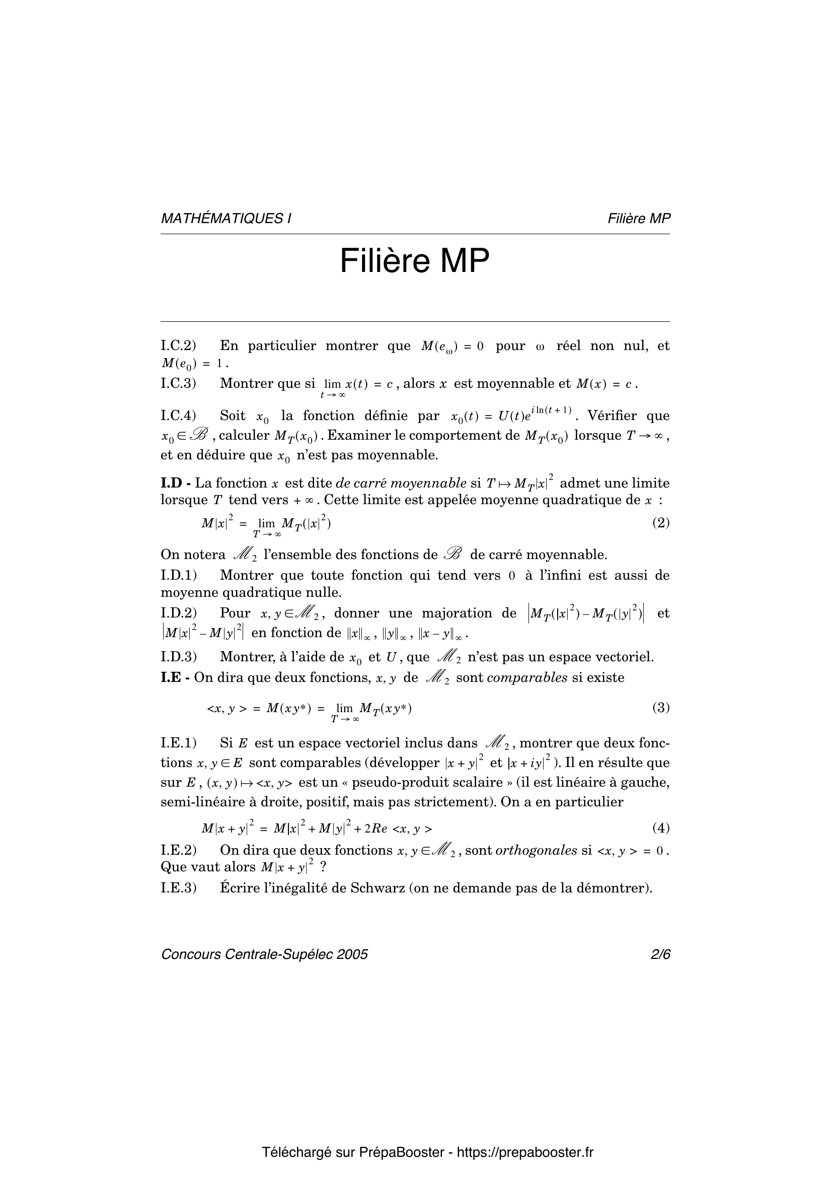 1. I.A.1) Montrer que $M$ est une forme linéaire sur $B$, que l’ensemble des fonctions moyennables est un sous-espace vectoriel de $B$, et que $M$ est une forme linéaire sur cet espace. On notera de façon équivalente $M$ ou cette moyenne.} 2. I.A.2) Vérifier que $M$ et $M_1$ sont lipchitziennes pour $\|\cdot\|_\infty$.} 3. I.B – Montrer que la moyenne $M$ est invariante par translation : si $x \in M_1$ et $\tau \in \mathbb{R}$ on pose $x_\tau(t) = x(t-\tau)$, alors $x_\tau$ est moyennable et $M x_\tau = M x$.} 4. I.C.1) Soit $x$ une fonction de $B$ de période $P$ ($P > 0$). Montrer que pour tout $a \in \mathbb{R}$, $\int_a^{a+P} x(t)\,dt = \int_0^P x(t)\,dt$. En déduire que $x$ est moyennable, et que $M x$ est égale à la moyenne sur n’importe quel intervalle de longueur $P$.} 5. I.C.2) En particulier montrer que pour $\omega$ réel non nul, $M(e_\omega) = 0$ et $M(e_0) = 1$.} 6. I.C.3) Montrer que si $x(t)\to c$ lorsque $t \to +\infty$, alors $x$ est moyennable et $M x = c$.} 7. I.C.4) Soit la fonction $x_0$ définie par $x_0(t)=U(t)e^{i t \ln t + 1}$. Vérifier que $x_0 \in B$, calculer $M_T(x_0)$. Examiner le comportement de $M_T(x_0)$ lorsque $T \to +\infty$, et en déduire que $x_0$ n’est pas moyennable.} 8. I.D.1) Montrer que toute fonction $x$ qui tend vers $0$ à l’infini est aussi de moyenne quadratique nulle.} 9. I.D.2) Pour $x,y \in M_2$, donner une majoration de $|M_T(x^2) – M_T(y^2)|$ et $|M_T(xy) – M_T(y^2)|$ en fonction de $\|x\|_\infty$, $\|y\|_\infty$, $\|x-y\|_\infty$.} 10. I.D.3) Montrer, à l’aide de $x_0$ et $U$, que $M_2$ n’est pas un espace vectoriel.} 11. I.E.1) Si $E$ est un espace vectoriel inclus dans $M_2$, montrer que deux fonctions $x, y \in M_2$ sont comparables (développer $M_T((x+iy)^2)$ et $M_T((x-iy)^2)$). Il en résulte que sur $E$, $FAQ
