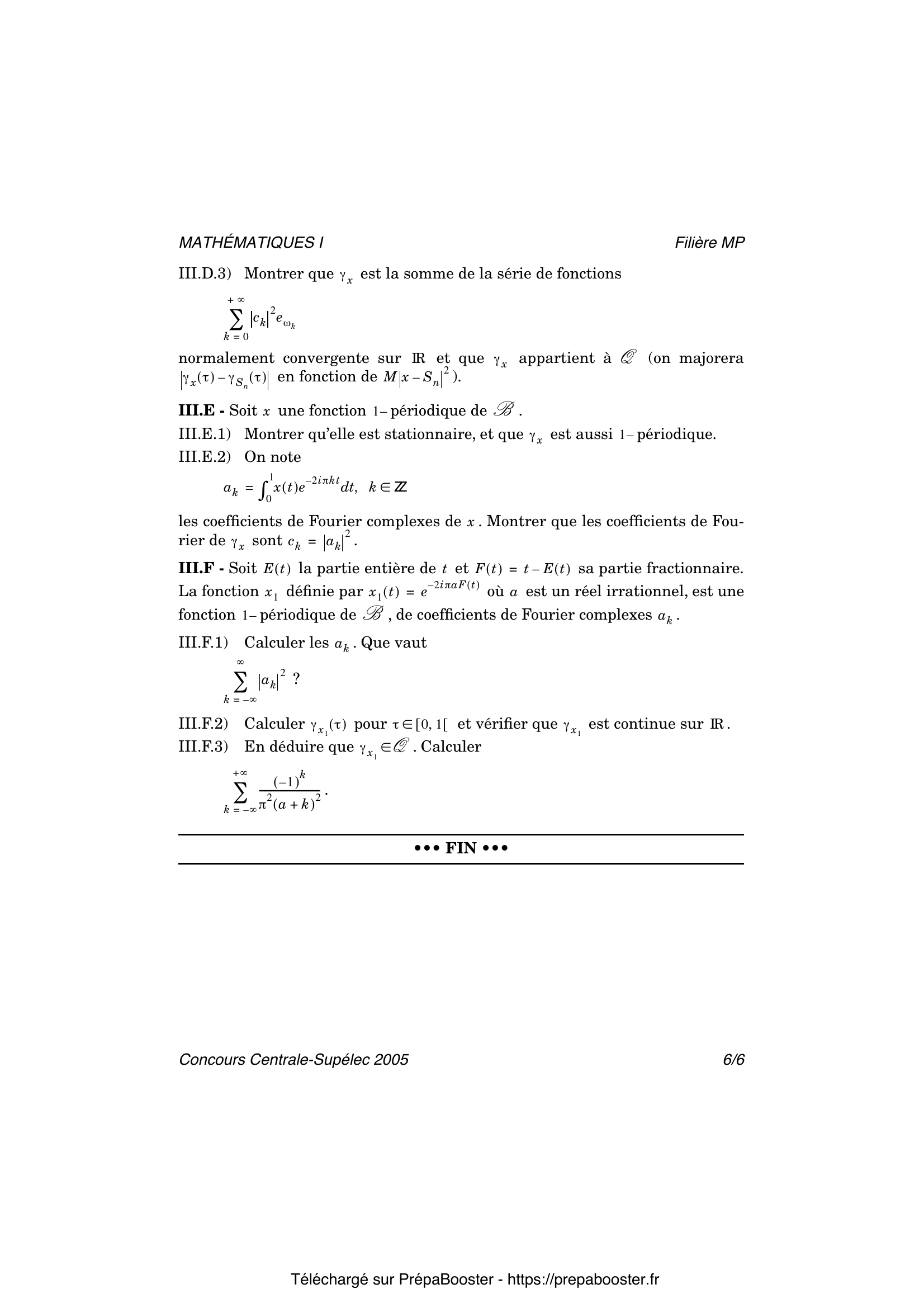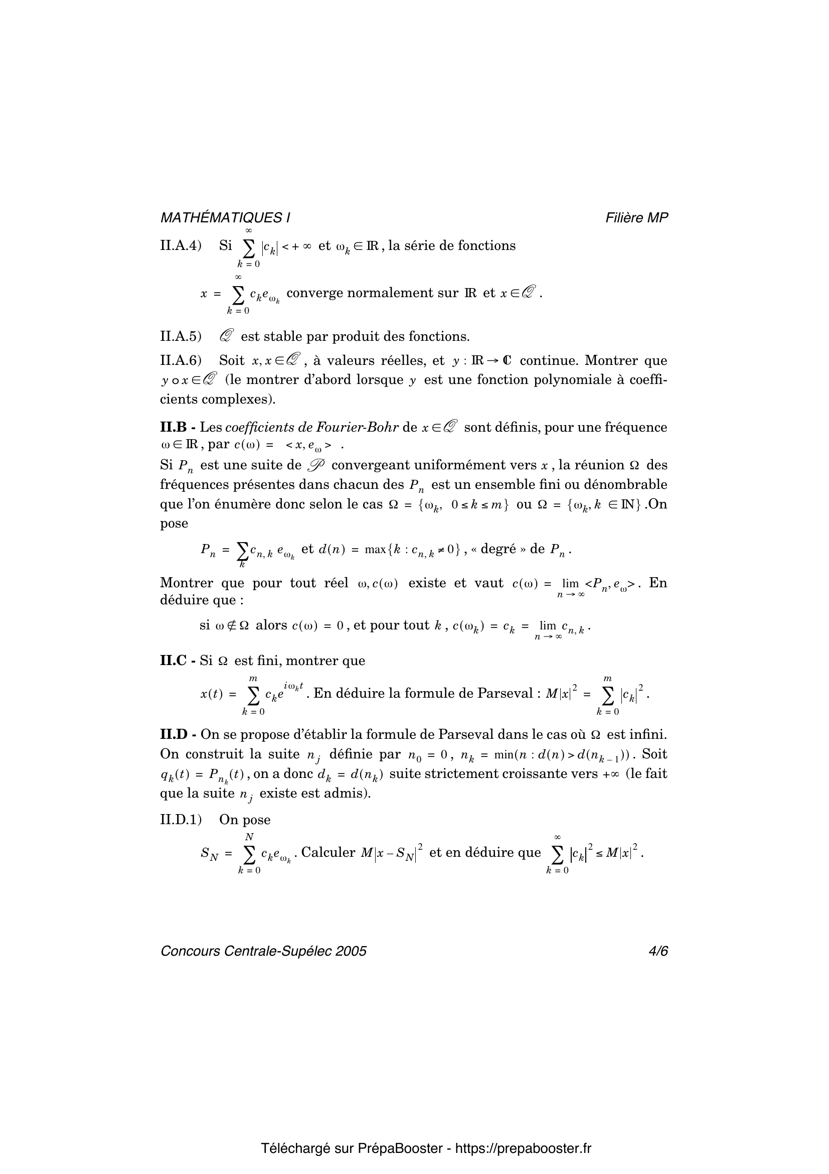 Les polynômes trigonométriques servent de base à la représentation et à l’approximation de toute fonction suffisamment régulière via la série de Fourier ou la série de Fourier-Bohr. Les exercices du concours, comme celui de 2005, te demandent de maîtriser la construction, la convergence et les utilisations de ces séries, notamment en relation avec les notions de moyenne, d’orthogonalité et de décomposition spectrale.