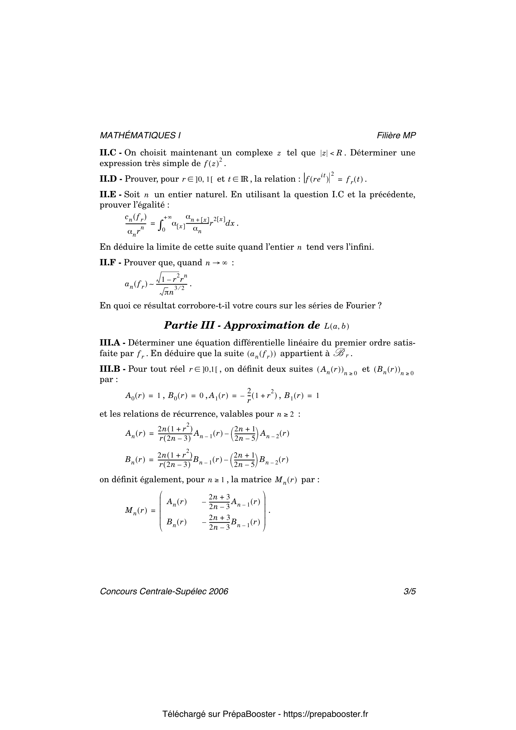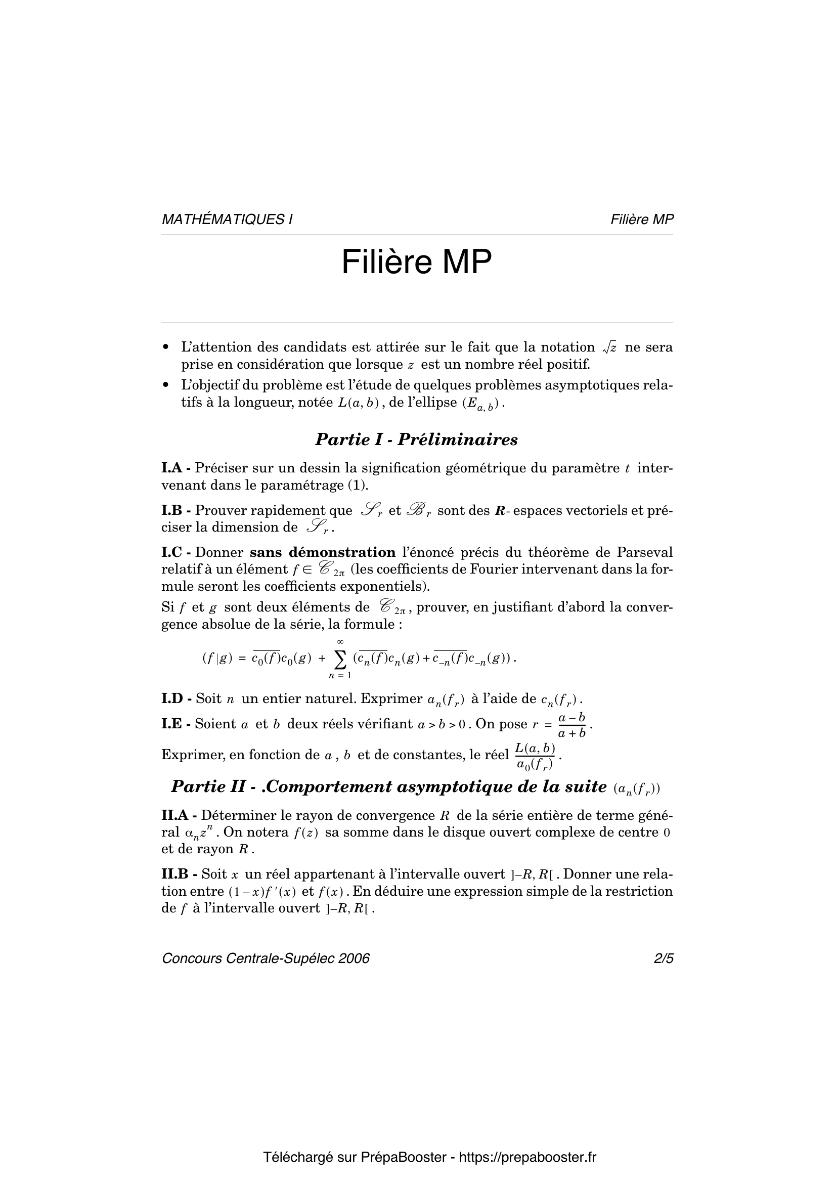 1. I.A – Préciser sur un dessin la signification géométrique du paramètre intervenant dans le paramétrage (1). 2. I.B – Prouver rapidement que $S_r$ et $B_r$ sont des espaces vectoriels et préciser la dimension de $S_r$. 3. I.C – Donner sans démonstration l’énoncé précis du théorème de Parseval relatif à un élément $f \in C_{2\pi}$ (les coefficients de Fourier intervenant dans la formule seront les coefficients exponentiels).\\ Si $f$ et $g$ sont deux éléments de $C_{2\pi}$, prouver, en justifiant d’abord la convergence absolue de la série, la formule :\\ $(f|g) = c_0(f)c_0(g) + \sum_{n=1}^{\infty} [c_n(f)c_{-n}(g) + c_{-n}(f)c_n(g)]$. 4. I.D – Soit $n$ un entier naturel. Exprimer $a_n(f_r)$ à l’aide de $\alpha_n$. 5. I.E – Soient $a$ et $b$ deux réels vérifiant $a > b > 0$. On pose $r = \frac{a-b}{a+b}$.\\ Exprimer, en fonction de $a$, $b$ et de constantes, le réel $L_{a,b}$.} 6. II.A – Déterminer le rayon de convergence de la série entière de terme général $\alpha_n z^n$. On notera $f(z)$ sa somme dans le disque ouvert complexe de centre $0$ et de rayon $R$. 7. II.B – Soit $r$ un réel appartenant à l’intervalle ouvert $]0,1[$. Donner une relation entre $f(r)$ et $L_{a,b}$. En déduire une expression simple de la restriction de $f$ à l’intervalle ouvert $]0,R[$. 8. II.C – On choisit maintenant un complexe $z$ tel que $|z|FAQ