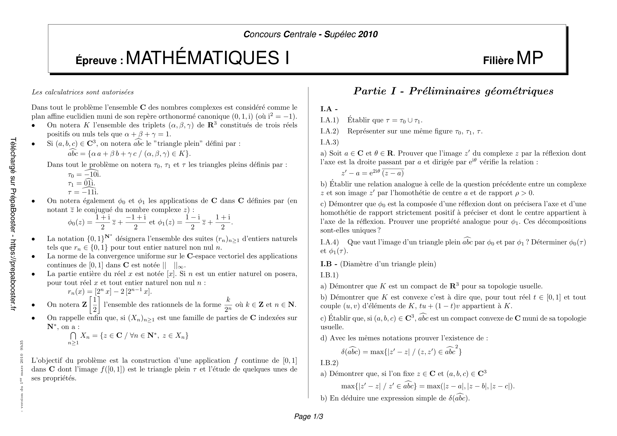 Le sujet de maths Centrale MP 2010 aborde principalement l’analyse du plan complexe avec applications affines (reflexion, homothétie), les ensembles compacts et convexes, la construction de fonctions par récurrence (suite d’applications contractantes), la topologie de l’ensemble image, la convergence uniforme, ainsi que la construction et l’étude d’une fonction continue mais non dérivable, typiquement une fonction de type « courbe de Koch », en lien avec les fractals. Tu rencontreras également la notion de codage binaire d’un réel (développements dyadiques) et l’analyse d’applications définies par récurrence (équations fonctionnelles).