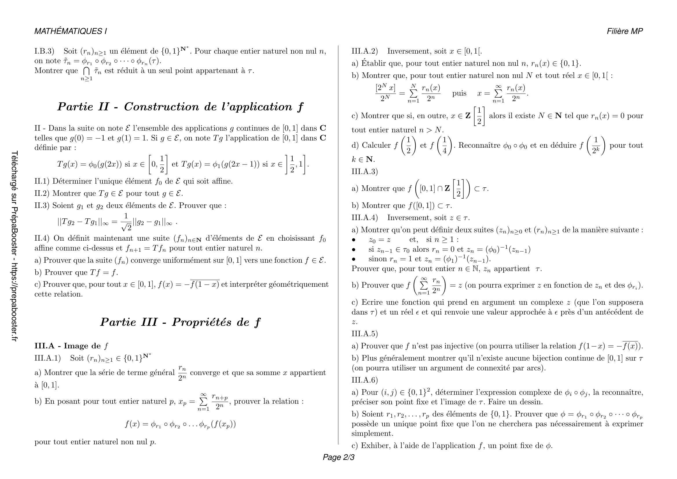 1. I.A.1) Etablir que $\tau = \tau_0 \cup \tau_1$. 2. I.A.2) Représenter sur une même figure $\tau_0$, $\tau_1$, $\tau$. 3. I.A.3) \begin{enumerate} \item[a)] Soit $a \in \mathbb{C}$ et $\theta \in \mathbb{R}$. Prouver que l’image $z_0$ du complexe $z$ par la réflexion dont l’axe est la droite passant par $a$ et dirigée par $e^{i \theta}$ vérifie la relation : \[ z_0 – a = e^{2i\theta}(z-a) \] \item[b)] Etablir une relation analogue à celle de la question précédente entre un complexe $z$ et son image $z_0$ par l’homothétie de centre $a$ et de rapport $\rho > 0$. \item[c)] Démontrer que $\varphi_0$ est la composée d’une réflexion dont on précisera l’axe et d’une homothétie de rapport strictement positif à préciser et dont le centre appartient à l’axe de la réflexion. Prouver une propriété analogue pour $\varphi_1$. Ces décompositions sont-elles uniques ? \end{enumerate} 4. I.A.4) Que vaut l’image d’un triangle plein $abc$ par $\varphi_0$ et par $\varphi_1$ ? Déterminer $\varphi_0(\tau)$ et $\varphi_1(\tau)$. 5. I.B.1) \begin{enumerate} \item[a)] Démontrer que $K$ est un compact de $\mathbb{R}^3$ pour sa topologie usuelle. \item[b)] Démontrer que $K$ est convexe c’est à dire que, pour tout réel $t \in [0,1]$ et tout couple $(u,v)$ d’éléments de $K$, $tu + (1-t)v$ appartient à $K$. \item[c)] Etablir que, si $(a,b,c) \in \mathbb{C}^3, abcc$ est un compact convexe de $\mathbb{C}$ muni de sa topologie usuelle. \item[d)] Avec les mêmes notations prouver l’existence de : \[ \delta(abcc) = \max \{ |z_0 – z| \mid (z,z_0) \in abcc^2 \} \] \end{enumerate}} 6. I.B.2) \begin{enumerate} \item[a)] Démontrer que, si l’on fixe $z \in \mathbb{C}$ et $(a,b,c) \in \mathbb{C}^3$ \[ \max \left\{ |z_0 – z| \mid z_0 \in abcc \right\} = \max(|z-a|,|z-b|,|z-c|). \] \item[b)] En déduire une expression simple de $\delta(abcc)$. \end{enumerate} 7. II.1) Déterminer l’unique élément $f_0$ de $E$ qui soit affine. 8. II.2) Montrer que $Tg \in E$ pour tout $g \in E$. 9. II.3) Soient $g_1$ et $g_2$ deux éléments de $E$. Prouver que : \[ \| T g_2 – T g_1 \|_{\infty} = \frac{1}{\sqrt{2}} \| g_2 – g_1 \|_{\infty} \] 10. II.4) On définit maintenant une suite $(f_n)_{n \in \mathbb{N}}$ d’éléments de $E$ en choisissant $f_0$ affine comme ci-dessus et $f_{n+1} = T f_n$ pour tout entier naturel $n$. \begin{enumerate} \item[a)] Prouver que la suite $(f_n)$ converge uniformément sur $[0,1]$ vers une fonction $f \in E$. \item[b)] Prouver que $Tf = f$. \item[c)] Prouver que, pour tout $x \in [0,1]$, $f(x) = -f(1-x)$ et interpréter géométriquement cette relation. \end{enumerate} } 11. III.A.1) Soit $(r_n)_{n \geq 1} \in \{0,1\}^{\mathbb{N}^*}$ \begin{enumerate} \item[a)] Montrer que la série de terme général $\frac{r_n}{2^n}$ converge et que sa somme $x$ appartient à $[0,1]$. \item[b)] En posant pour tout entier naturel $p$, $x_p = \sum_{n=1}^{\infty} \frac{r_{n+p}}{2^n}$, prouver la relation : \[ f(x) = \varphi_{r_1} \circ \varphi_{r_2} \circ \cdots \varphi_{r_p}(f(x_p)) \] pour tout entier naturel non nul $p$. \end{enumerate} 12. III.A.2) Inversement, soit $x \in [0,1[$. \begin{enumerate} \item[a)] Etablir que, pour tout entier naturel non nul $n$, $r_n(x) \in \{0,1\}$. \item[b)] Montrer que, pour tout entier naturel non nul $N$ et tout réel $x \in [0,1[$ : \[ \left\lfloor 2^N x \right\rfloor / 2^N = \sum_{n=1}^N \frac{r_n(x)}{2^n} \qquad\text{puis}\qquad x = \sum_{n=1}^\infty \frac{r_n(x)}{2^n} \] \item[c)] Montrer que si, en outre, $x \in \mathbb{Z}\left[\frac{1}{2}\right]$ alors il existe $N \in \mathbb{N}$ tel que $r_n(x) = 0$ pour tout entier naturel $n > N$. \item[d)] Calculer $f\left(\frac{1}{2}\right)$ et $f\left(\frac{1}{4}\right)$. Reconnaître $\varphi_0 \circ \varphi_0$ et en déduire $f\left(\frac{1}{2^k}\right)$ pour tout $k \in \mathbb{N}$. \end{enumerate} 13. III.A.3) \begin{enumerate} \item[a)] Montrer que $f\left(\left[0,1\right] \cap \mathbb{Z}\left[\frac{1}{2}\right]\right) \subset \tau$. \item[b)] Montrer que $f([0,1]) \subset \tau$. \end{enumerate} 14. III.A.4) Inversement, soit $z \in \tau$. \begin{enumerate} \item[a)] Montrer qu’on peut définir deux suites $(z_n)_{n \geq 0}$ et $(r_n)_{n \geq 1}$ de la manière suivante : \begin{itemize} \item $z_0 = z$ et, si $n \geq 1$ : \item si $z_{n-1} \in \tau_0$ alors $r_n = 0$ et $z_n = (\varphi_0)^{-1}(z_{n-1})$ \item sinon $r_n = 1$ et $z_n = (\varphi_1)^{-1}(z_{n-1})$ \end{itemize} Prouver que, pour tout entier $n \in \mathbb{N}$, $z_n$ appartient à $\tau$. \item[b)] Prouver que $f\left(\sum_{n=1}^\infty \frac{r_n}{2^n}\right) = z$ (on pourra exprimer $z$ en fonction de $z_n$ et des $\varphi_{r_i}$). \item[c)] Écrire une fonction qui prend en argument un complexe $z$ (que l’on supposera dans $\tau$) et un réel $\epsilon$ et qui renvoie une valeur approchée à $\epsilon$ près d’un antécédent de $z$. \end{enumerate} 15. III.A.5) \begin{enumerate} \item[a)] Prouver que $f$ n’est pas injective (on pourra utiliser la relation $f(1-x) = -f(x)$). \item[b)] Plus généralement montrer qu’il n’existe aucune bijection continue de $[0,1]$ sur $\tau$ (on pourra utiliser un argument de connexité par arcs). \end{enumerate} } 16. III.A.6) \begin{enumerate} \item[a)] Pour $(i,j) \in \{0,1\}^2$, déterminer l’expression complexe de $\varphi_i \circ \varphi_j$, la reconnaître, préciser son point fixe et l’image de $\tau$. Faire un dessin. \item[b)] Soient $r_1, r_2, \ldots, r_p$ des éléments de $\{0,1\}$. Prouver que $\varphi = \varphi_{r_1} \circ \varphi_{r_2} \circ \cdots \circ \varphi_{r_p}$ possède un unique point fixe que l’on ne cherchera pas nécessairement à exprimer simplement. \item[c)] Exhiber, à l’aide de l’application $f$, un point fixe de $\varphi$. \end{enumerate} 17. I.B.3) Soit $(r_n)_{n \geq 1}$ un élément de $\{0,1\}^{\mathbb{N}^*}$. Pour chaque entier naturel non nul $n$, on note $\tilde{\tau}_n = \varphi_{r_1} \circ \varphi_{r_2} \circ 