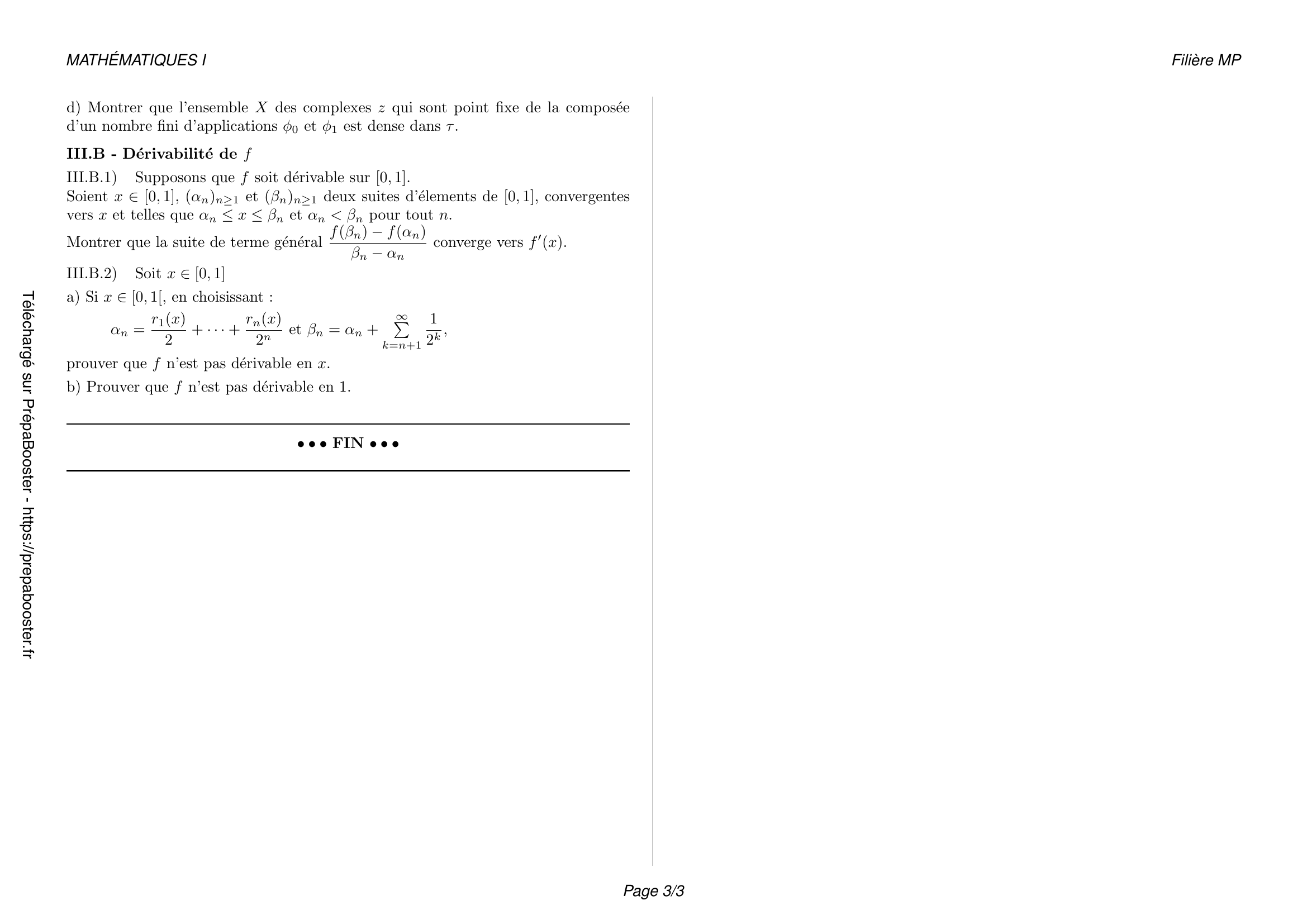 Le sujet t’invite à construire une fonction par une suite de fonctions continues contractantes, ce qui garantit la continuité de la limite — même si cette limite n’est pas dérivable en aucun point ! La clé est d’étudier les accroissements finis sur de petits intervalles et de montrer que ces accroissements ne convergent pas, en raison des discontinuités « de pente » à toutes les échelles introduites par la construction fractale. C’est une méthode fréquemment mobilisée dans la construction des courbes continues non dérivables. Pour bien t’entraîner avec ce type de preuves, pense à débloquer les corrigés complets sur Prépa Booster.