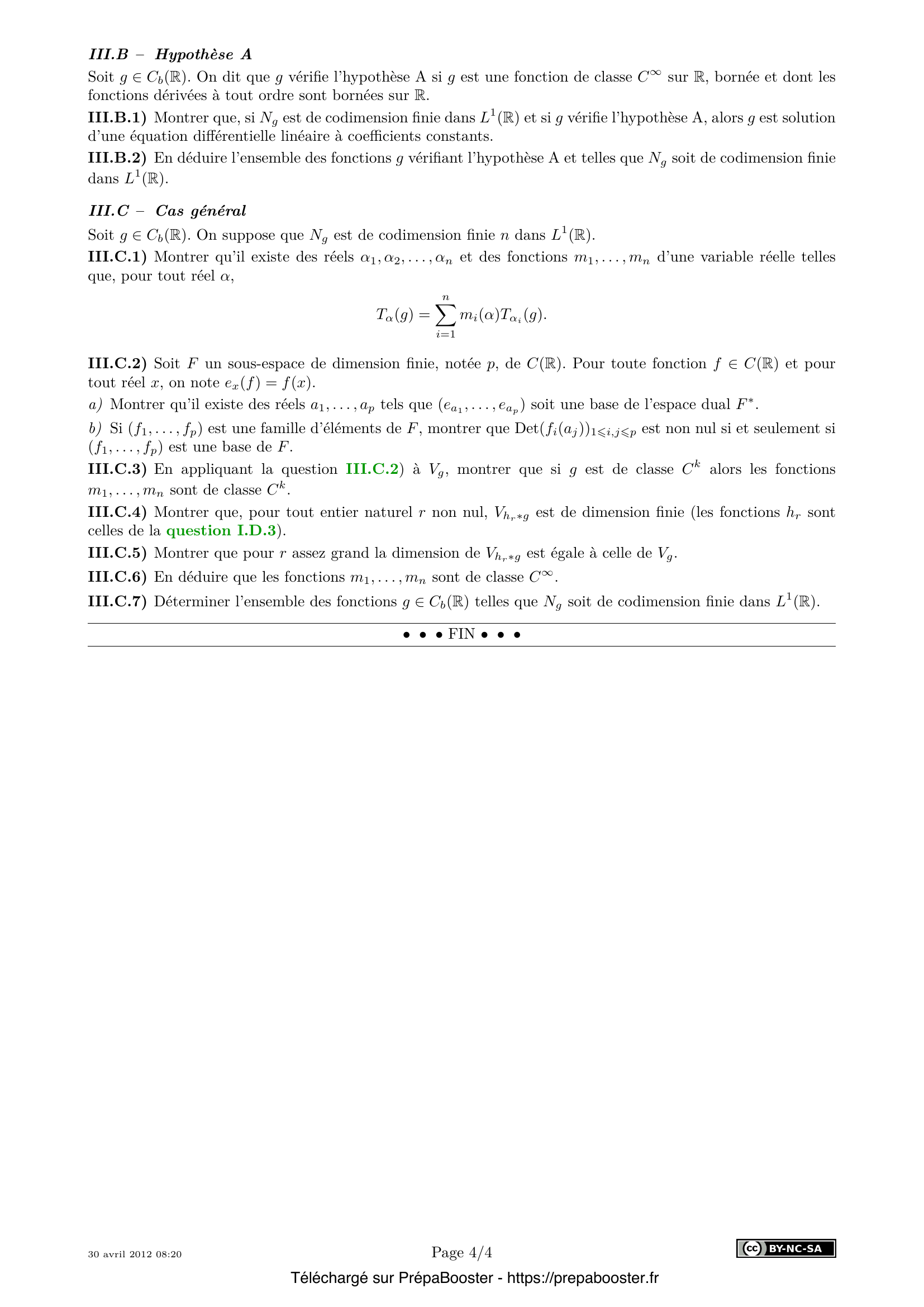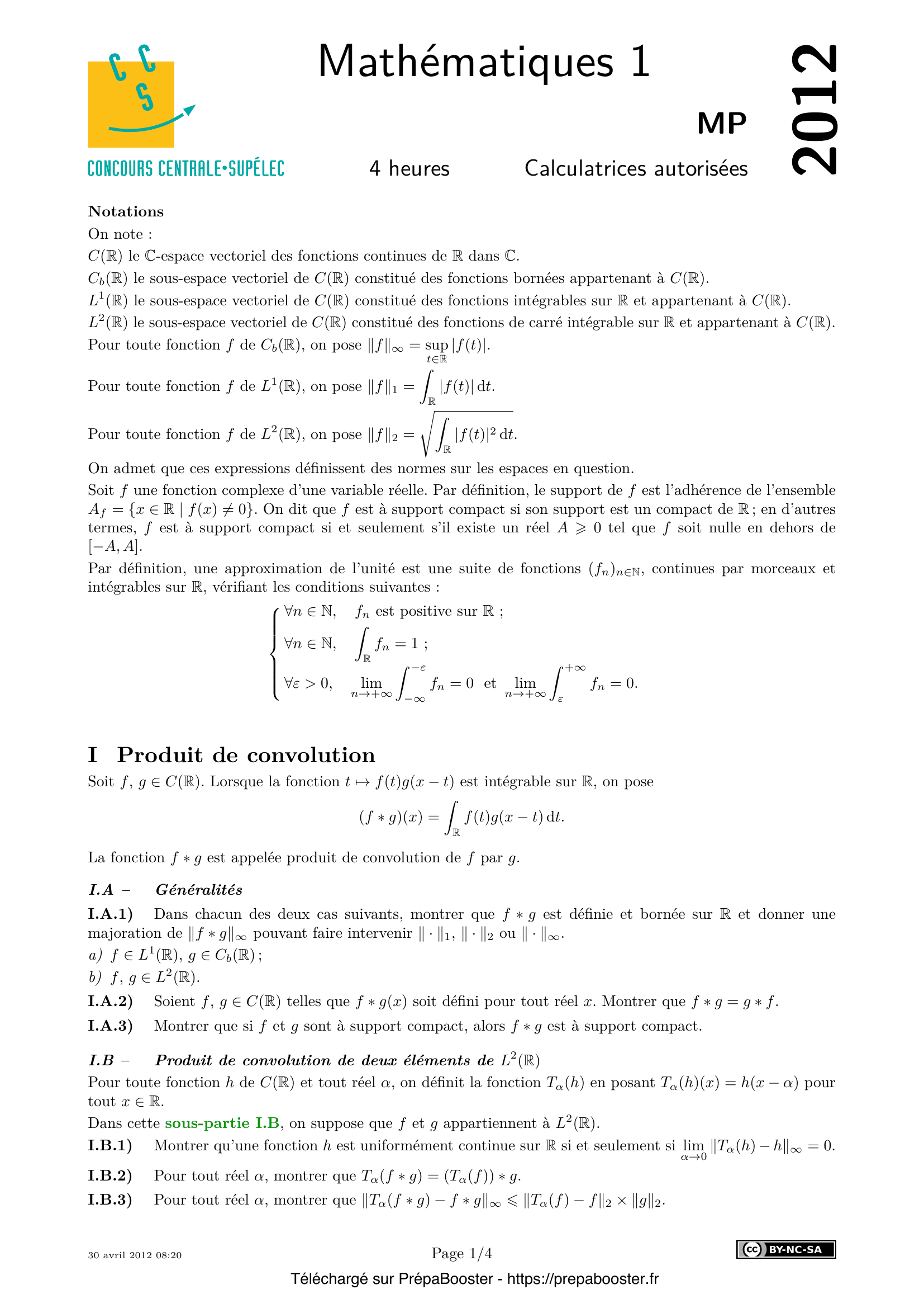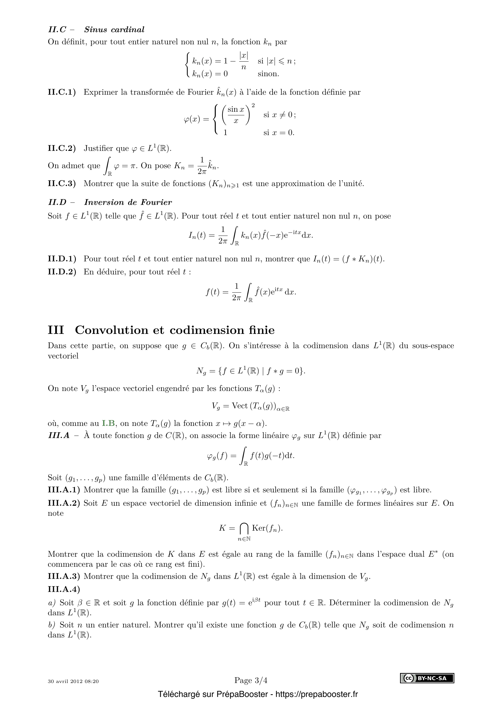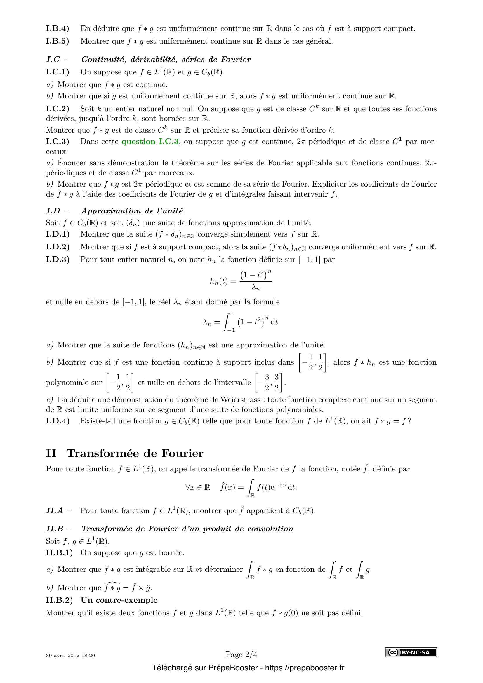 1. I.A.1) Dans chacun des deux cas suivants, montrer que f \ast g est définie et bornée sur \mathbb{R} et donner une majoration de \|f \ast g\|_\infty pouvant faire intervenir \|\cdot\|_1, \|\cdot\|_2 ou \|\cdot\|_\infty.\\ a) $f \in L^1(\mathbb{R})$, $g \in C_b(\mathbb{R})$;\\ b) $f,g \in L^2(\mathbb{R})$. 2. I.A.2) Soient $f, g \in C(\mathbb{R})$ telles que $f \ast g(x)$ soit défini pour tout réel $x$. Montrer que $f \ast g = g \ast f$. 3. I.A.3) Montrer que si $f$ et $g$ sont à support compact, alors $f \ast g$ est à support compact. 4. I.B.1) Montrer qu’une fonction $h$ est uniformément continue sur $\mathbb{R}$ si et seulement si $\lim_{\alpha \to 0} \|T_\alpha(h) – h\|_\infty = 0$. 5. I.B.2) Pour tout réel $\alpha$, montrer que $T_\alpha(f \ast g) = (T_\alpha(f)) \ast g$.} 6. I.B.3) Pour tout réel $\alpha$, montrer que $\|T_\alpha(f \ast g) – f \ast g\|_\infty \leq \|T_\alpha(f) – f\|_2 \times \|g\|_2$. 7. I.B.4) En déduire que $f \ast g$ est uniformément continue sur $\mathbb{R}$ dans le cas où $f$ est à support compact. 8. I.B.5) Montrer que $f \ast g$ est uniformément continue sur $\mathbb{R}$ dans le cas général. 9. I.C.1) On suppose que $f \in L^1(\mathbb{R})$ et $g \in C_b(\mathbb{R})$.\\ a) Montrer que $f \ast g$ est continue.\\ b) Montrer que si $g$ est uniformément continue sur $\mathbb{R}$, alors $f \ast g$ est uniformément continue sur $\mathbb{R}$. 10. I.C.2) Soit $k$ un entier naturel non nul. On suppose que $g$ est de classe $C^k$ sur $\mathbb{R}$ et que toutes ses fonctions dérivées, jusqu’à l’ordre $k$, sont bornées sur $\mathbb{R}$.\\ Montrer que $f \ast g$ est de classe $C^k$ sur $\mathbb{R}$ et préciser sa fonction dérivée d’ordre $k$.} 11. I.C.3) Dans cette question I.C.3, on suppose que $g$ est continue, $2\pi$-périodique et de classe $C^1$ par morceaux.\\ a) Énoncer sans démonstration le théorème sur les séries de Fourier applicable aux fonctions continues, $2\pi$-périodiques et de classe $C^1$ par morceaux.\\ b) Montrer que $f \ast g$ est $2\pi$-périodique et est somme de sa série de Fourier. Expliciter les coefficients de Fourier de $f \ast g$ à l’aide des coefficients de Fourier de $g$ et d’intégrales faisant intervenir $f$. 12. I.D.1) Montrer que la suite $(f \ast \delta_n)_{n \in \mathbb{N}}$ converge simplement vers $f$ sur $\mathbb{R}$. 13. I.D.2) Montrer que si $f$ est à support compact, alors la suite $(f \ast \delta_n)_{n \in \mathbb{N}}$ converge uniformément vers $f$ sur $\mathbb{R}$. 14. I.D.3) Pour tout entier naturel $n$, on note $h_n$ la fonction définie sur $[-1,1]$ par \[ h_n(t) = \frac{(1 – t^2)^n}{\lambda_n} \] et nulle en dehors de $[-1,1]$, le réel $\lambda_n$ étant donné par la formule \[ \lambda_n = \int_{-1}^1 (1 – t^2)^n dt. \] a) Montrer que la suite de fonctions $(h_n)_{n \in \mathbb{N}}$ est une approximation de l’unité.\\ b) Montrer que si $f$ est une fonction continue à support inclus dans $[-\frac{1}{2}, \frac{1}{2}]$, alors $f \ast h_n$ est une fonction polynomiale sur $[-\frac{1}{2}, \frac{1}{2}]$ et nulle en dehors de l’intervalle $[-\frac{3}{2}, \frac{3}{2}]$.\\ c) En déduire une démonstration du théorème de Weierstrass : toute fonction complexe continue sur un segment de $\mathbb{R}$ est limite uniforme sur ce segment d’une suite de fonctions polynomiales. 15. I.D.4) Existe-t-il une fonction $g \in C_b(\mathbb{R})$ telle que pour toute fonction $f$ de $L^1(\mathbb{R})$, on ait $f \ast g = f$ ?} 16. II.A – Pour toute fonction $f \in L^1(\mathbb{R})$, montrer que $\hat{f}$ appartient à $C_b(\mathbb{R})$. 17. II.B.1) On suppose que $g$ est bornée.\\ a) Montrer que $f \ast g$ est intégrable sur $\mathbb{R}$ et déterminer $\int_{\mathbb{R}} f \ast g$ en fonction de $\int_{\mathbb{R}} f$ et $\int_{\mathbb{R}} g$.\\ b) Montrer que $\widehat{f \ast g} = \hat{f} \times \hat{g}$. 18. II.B.2) Un contre-exemple\\ Montrer qu’il existe deux fonctions $f$ et $g$ dans $L^1(\mathbb{R})$ telle que $f \ast g(0)$ ne soit pas défini. 19. II.C.1) Exprimer la transformée de Fourier $\hat{k}_n(x)$ à l’aide de la fonction définie par \[ \varphi(x) = \begin{cases} \left(\frac{\sin x}{x}\right)^2 &\text{si } x \neq 0 \\ 1 &\text{si } x = 0 \end{cases} \] 20. II.C.2) Justifier que $\varphi \in L^1(\mathbb{R})$.} 21. II.C.3) Montrer que la suite de fonctions $(K_n)_{n>1}$ est une approximation de l’unité. 22. II.D.1) Pour tout réel $t$ et tout entier naturel non nul $n$, montrer que $I_n(t) = (f \ast K_n)(t)$. 23. II.D.2) En déduire, pour tout réel $t$ : \[ f(t) = \frac{1}{2\pi} \int_{\mathbb{R}} \hat{f}(x) e^{itx} dx. \] 24. III.A.1) Montrer que la famille $(g_1, \ldots, g_p)$ est libre si et seulement si la famille $(\varphi_{g_1}, \ldots, \varphi_{g_p})$ est libre. 25. III.A.2) Soit $E$ un espace vectoriel de dimension infinie et $(f_n)_{n \in \mathbb{N}}$ une famille de formes linéaires sur $E$. On note \[ K = \bigcap_{n\in\mathbb{N}} \ker(f_n). \] Montrer que la codimension de $K$ dans $E$ est égale au rang de la famille $(f_n)_{n\in\mathbb{N}}$ dans l’espace dual $E^*$ (on commencera par le cas où ce rang est fini).} 26. III.A.3) Montrer que la codimension de $N_g$ dans $L^1(\mathbb{R})$ est égale à la dimension de $V_g$. 27. III.A.4)\\ a) Soit $\beta \in \mathbb{R}$ et soit $g$ la fonction définie par $g(t) = e^{i\beta t}$ pour tout $t \in \mathbb{R}$. Déterminer la codimension de $N_g$ dans $L^1(\mathbb{R})$.\\ b) Soit $n$ un entier naturel. Montrer qu’il existe une fonction $g$ de $C_b(\mathbb{R})$ telle que $N_g$ soit de codimension $n$ dans $L^1(\mathbb{R})$. 28. III.B.1) Montrer que, si $N_g$ est de codimension finie dans $L^1(\mathbb{R})$ et si $g$ vérifie l’hypothèse A, alors $g$ est solution d’une équation différentielle linéaire à coefficients constants. 29. III.B.2) En déduire l’ensemble des fonctions $g$ vérifiant l’hypothèse A et telles que $N_g$ soit de codimension finie dans $L^1(\mathbb{R})$. 30. III.C.1) Mon