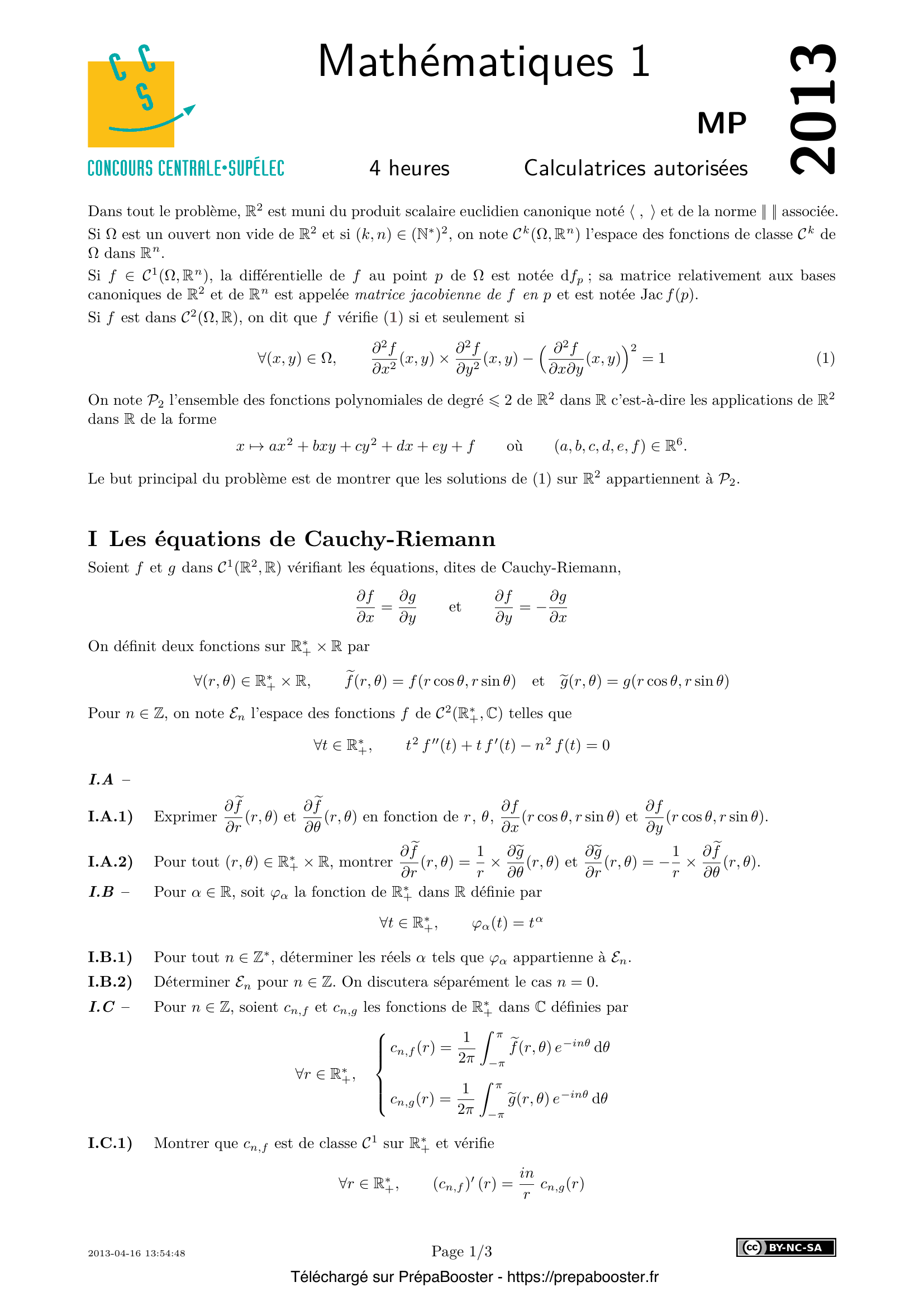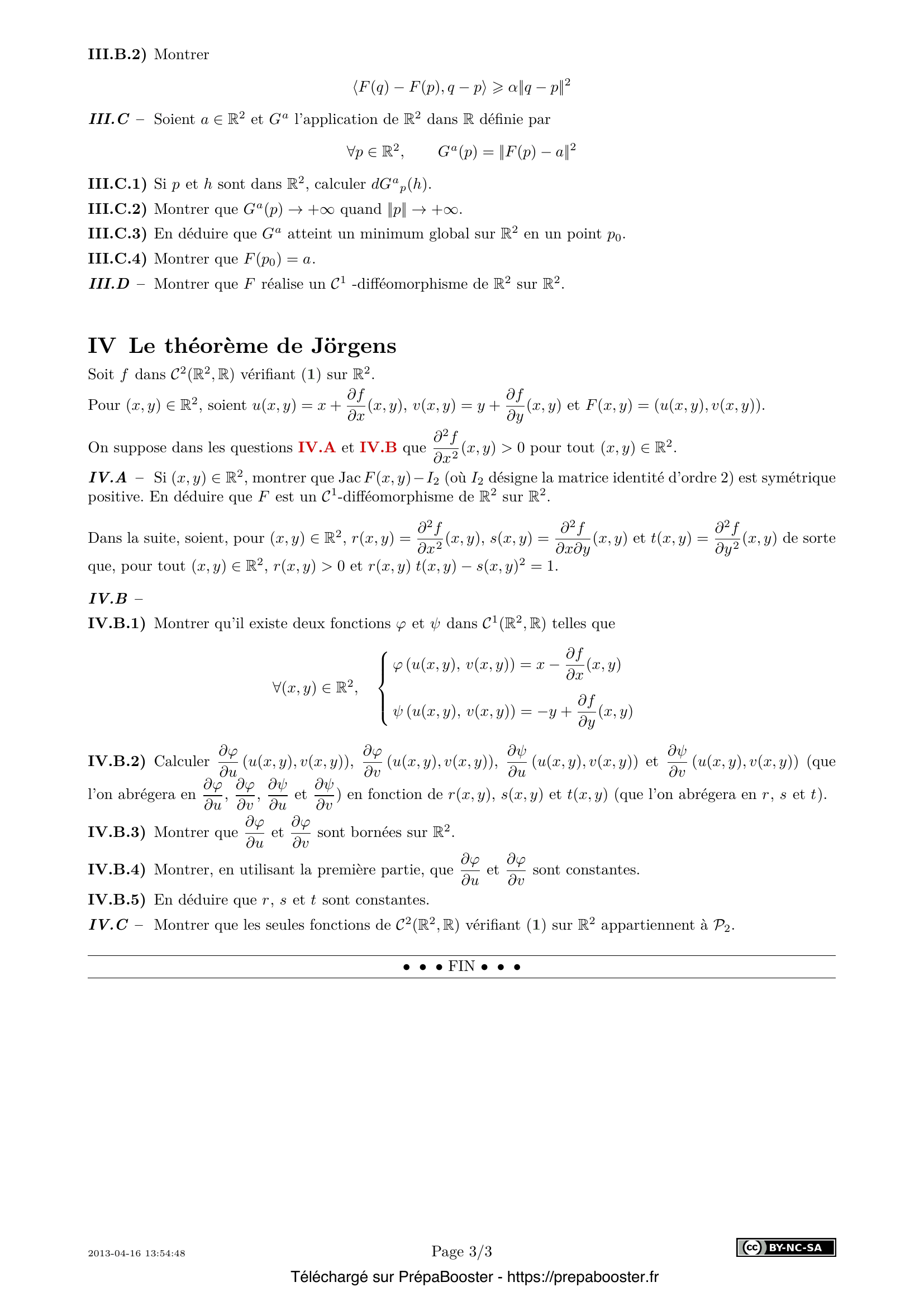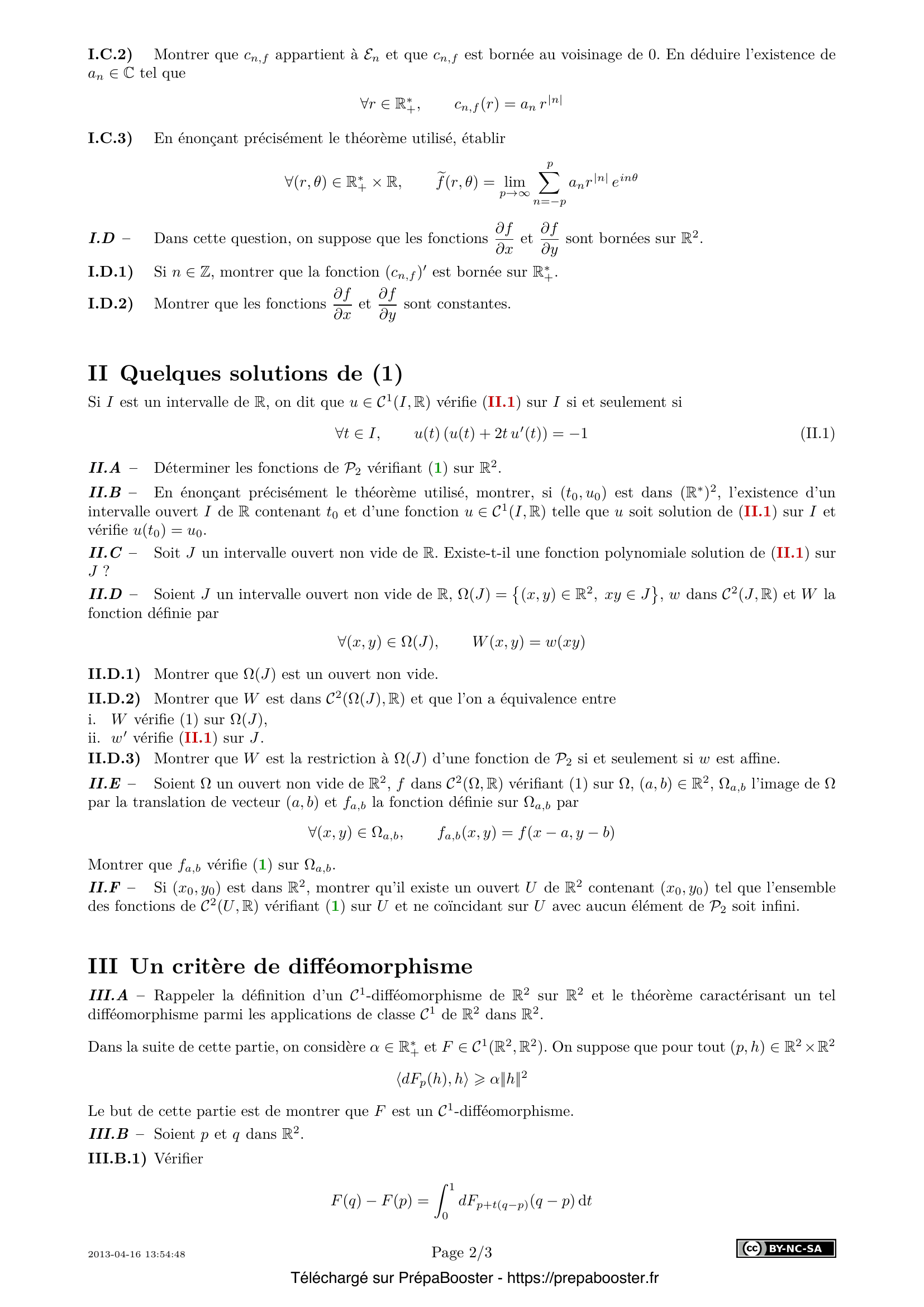 1. I.A.1) Exprimer $\frac{\partial \tilde{f}}{\partial r}(r,\theta)$ et $\frac{\partial \tilde{f}}{\partial \theta}(r,\theta)$ en fonction de $r$, $\theta$, $\frac{\partial f}{\partial x}(r\cos\theta, r\sin\theta)$ et $\frac{\partial f}{\partial y}(r\cos\theta, r\sin\theta)$. 2. I.A.2) Pour tout $(r,\theta) \in \R^*_+ \times \R$, montrer \[ \frac{\partial \tilde{f}}{\partial r}(r,\theta) = \frac{1}{r} \frac{\partial \tilde{g}}{\partial \theta}(r,\theta) \quad \text{et} \quad \frac{\partial \tilde{g}}{\partial r}(r,\theta) = -\frac{1}{r} \frac{\partial \tilde{f}}{\partial \theta}(r,\theta). \] 3. I.B.1) Pour tout $n \in \Z^*$, déterminer les réels $\alpha$ tels que $\varphi_\alpha$ appartienne à $E_n$. 4. I.B.2) Déterminer $E_n$ pour $n \in \Z$. On discutera séparément le cas $n=0$. 5. I.C.1) Montrer que $c_{n,f}$ est de classe $\mathcal{C}^1$ sur $\R^*_+$ et vérifie \[ \forall r \in \R^*_+,\quad \big(c_{n,f}\big)'(r) = \frac{in}{r}c_{n,g}(r) \]} 6. I.C.2) Montrer que $c_{n,f}$ appartient à $E_n$ et que $c_{n,f}$ est bornée au voisinage de $0$. En déduire l’existence de $a_n \in \C$ tel que \[ \forall r \in \R^*_+, \quad c_{n,f}(r) = a_n r^{|n|} \] 7. I.C.3) En énonçant précisément le théorème utilisé, établir \[ \forall (r, \theta) \in \R^*_+ \times \R, \quad \tilde{f}(r, \theta) = \lim_{p\to+\infty} \sum_{n=-p}^p a_n r^{|n|} e^{in\theta} \] 8. I.D.1) Si $n \in \Z$, montrer que la fonction $(c_{n,f})’$ est bornée sur $\R^*_+$. 9. I.D.2) Montrer que les fonctions $\frac{\partial f}{\partial x}$ et $\frac{\partial f}{\partial y}$ sont constantes. 10. II.A) Déterminer les fonctions de $\mathcal{P}_2$ vérifiant (1) sur $\R^2$.} 11. II.B) En énonçant précisément le théorème utilisé, montrer, si $(t_0,u_0)$ est dans $(\R^*)^2$, l’existence d’un intervalle ouvert $I$ de $\R$ contenant $t_0$ et d’une fonction $u \in \mathcal{C}^1(I, \R)$ telle que $u$ soit solution de (II.1) sur $I$ et vérifie $u(t_0) = u_0$. 12. II.C) Soit $J$ un intervalle ouvert non vide de $\R$. Existe-t-il une fonction polynomiale solution de (II.1) sur $J$ ? 13. II.D.1) Montrer que $\Omega(J)$ est un ouvert non vide. 14. II.D.2) Montrer que $W$ est dans $\mathcal{C}^2(\Omega(J),\R)$ et que l’on a équivalence entre\\ i. $W$ vérifie (1) sur $\Omega(J)$,\\ ii. $w’$ vérifie (II.1) sur $J$. 15. II.D.3) Montrer que $W$ est la restriction à $\Omega(J)$ d’une fonction de $\mathcal{P}_2$ si et seulement si $w$ est affine.} 16. II.E) Soient $\Omega$ un ouvert non vide de $\R^2$, $f$ dans $\mathcal{C}^2(\Omega, \R)$ vérifiant (1) sur $\Omega$, $(a,b) \in \R^2$, $\Omega_{a,b}$ l’image de $\Omega$ par la translation de vecteur $(a,b)$ et $f_{a,b}$ la fonction définie sur $\Omega_{a,b}$ par\\ $\forall(x,y)\in\Omega_{a,b},\ f_{a,b}(x,y) = f(x-a,y-b)$\\ Montrer que $f_{a,b}$ vérifie (1) sur $\Omega_{a,b}$. 17. II.F) Si $(x_0,y_0)$ est dans $\R^2$, montrer qu’il existe un ouvert $U$ de $\R^2$ contenant $(x_0,y_0)$ tel que l’ensemble des fonctions de $\mathcal{C}^2(U,\R)$ vérifiant (1) sur $U$ et ne coïncidant sur $U$ avec aucun élément de $\mathcal{P}_2$ soit infini. 18. III.A) Rappeler la définition d’un $\mathcal{C}^1$-difféomorphisme de $\R^2$ sur $\R^2$ et le théorème caractérisant un tel difféomorphisme parmi les applications de classe $\mathcal{C}^1$ de $\R^2$ dans $\R^2$. 19. III.B.1) Vérifier\\ $F(q) – F(p) = \int_0^1 dF_{p+t(q-p)}(q-p)\;dt$ 20. III.B.2) Montrer\\ $\langle F(q) – F(p), q-p \rangle > \alpha\|q-p\|^2$} 21. III.C.1) Si $p$ et $h$ sont dans $\R^2$, calculer $dG_a{}_p(h)$. 22. III.C.2) Montrer que $G_a(p)\to+\infty$ quand $\|p\|\to+\infty$. 23. III.C.3) En déduire que $G_a$ atteint un minimum global sur $\R^2$ en un point $p_0$. 24. III.C.4) Montrer que $F(p_0) = a$. 25. III.D) Montrer que $F$ réalise un $\mathcal{C}^1$-difféomorphisme de $\R^2$ sur $\R^2$.} 26. IV.A) Si $(x,y)\in\R^2$, montrer que $\operatorname{Jac} F(x,y) – I_2$ (où $I_2$ désigne la matrice identité d’ordre 2) est symétrique positive. En déduire que $F$ est un $\mathcal{C}^1$-difféomorphisme de $\R^2$ sur $\R^2$. 27. IV.B.1) Montrer qu’il existe deux fonctions $\varphi$ et $\psi$ dans $\mathcal{C}^1(\R^2, \R)$ telles que \[ \forall(x, y) \in \R^2, \left\{ \begin{array}{l} \varphi (u(x, y), v(x, y)) = x – \frac{\partial f}{\partial x}(x, y) \\ \psi (u(x, y), v(x, y)) = -y + \frac{\partial f}{\partial y}(x, y) \end{array} \right. \] 28. IV.B.2) Calculer $\frac{\partial \varphi}{\partial u}(u(x,y), v(x,y))$, $\frac{\partial \varphi}{\partial v}(u(x,y), v(x,y))$, $\frac{\partial \psi}{\partial u}(u(x,y), v(x,y))$ et $\frac{\partial \psi}{\partial v}(u(x,y), v(x,y))$ (que l’on abrégera en $\frac{\partial \varphi}{\partial u}$, $\frac{\partial \varphi}{\partial v}$, $\frac{\partial \psi}{\partial u}$ et $\frac{\partial \psi}{\partial v}$) en fonction de $r(x,y)$, $s(x,y)$ et $t(x,y)$ (que l’on abrégera en $r$, $s$ et $t$). 29. IV.B.3) Montrer que $\frac{\partial \varphi}{\partial u}$ et $\frac{\partial \varphi}{\partial v}$ sont bornées sur $\R^2$. 30. IV.B.4) Montrer, en utilisant la première partie, que $\frac{\partial \varphi}{\partial u}$ et $\frac{\partial \varphi}{\partial v}$ sont constantes.} 31. IV.B.5) En déduire que $r$, $s$ et $t$ sont constantes. 32. IV.C) Montrer que les seules fonctions de $\mathcal{C}^2(\R^2, \R)$ vérifiant (1) sur $\R^2$ appartiennent à $\mathcal{P}_2$.}FAQ