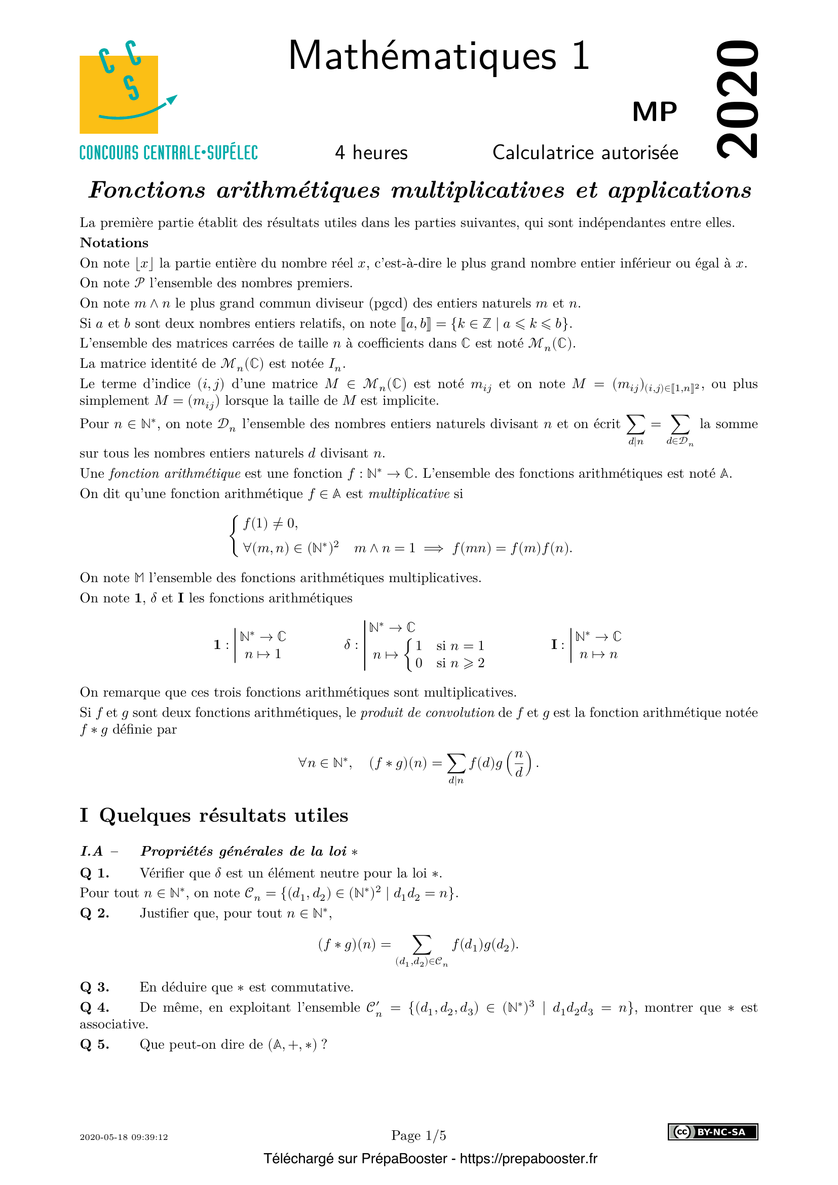 Le sujet de mathématiques MP du concours Centrale 2020 fait intervenir de nombreuses notions classiques d’arithmétique et d’algèbre : fonctions arithmétiques, produit de convolution (ou de Dirichlet), fonctions multiplicatives, matrices liées aux diviseurs, séries de Dirichlet, théorie élémentaire des groupes finis en particulier le groupe symétrique \\( \\mathfrak{S}_n \\) et les matrices de permutation. On y trouve également un important volet sur la diagonalisabilité, les polynômes caractéristiques, et le lien entre propriétés de matrices et structures arithmétiques. N’oublie pas que les corrigés détaillés ainsi que des exercices similaires sont accessibles en débloquant les corrections sur Prépa Booster.